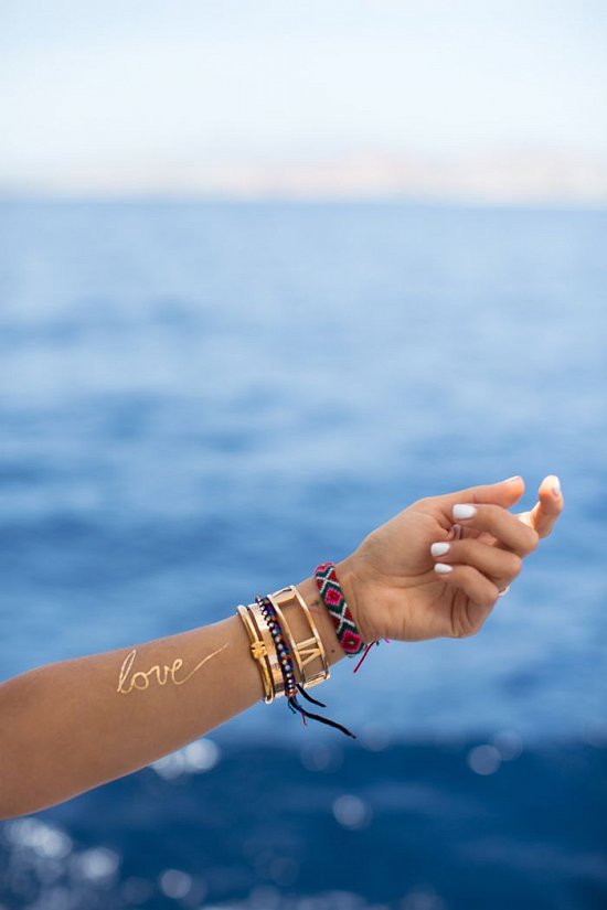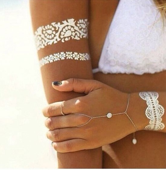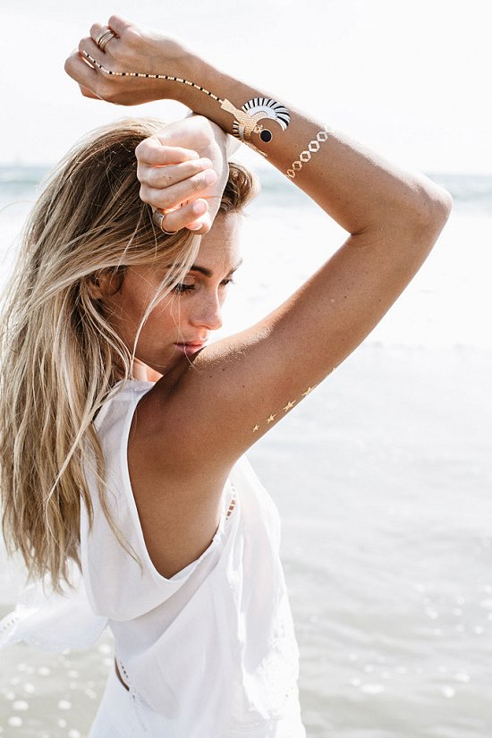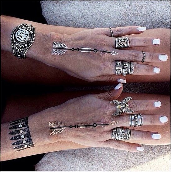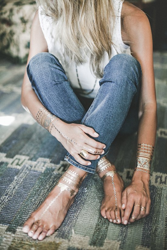 Лучше всего временные металлические татуировки смотрятся на загорелом теле в сочетании с нарядами в стиле хиппи.