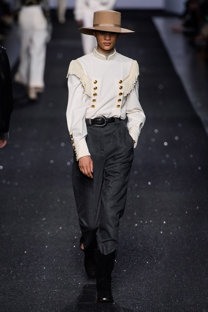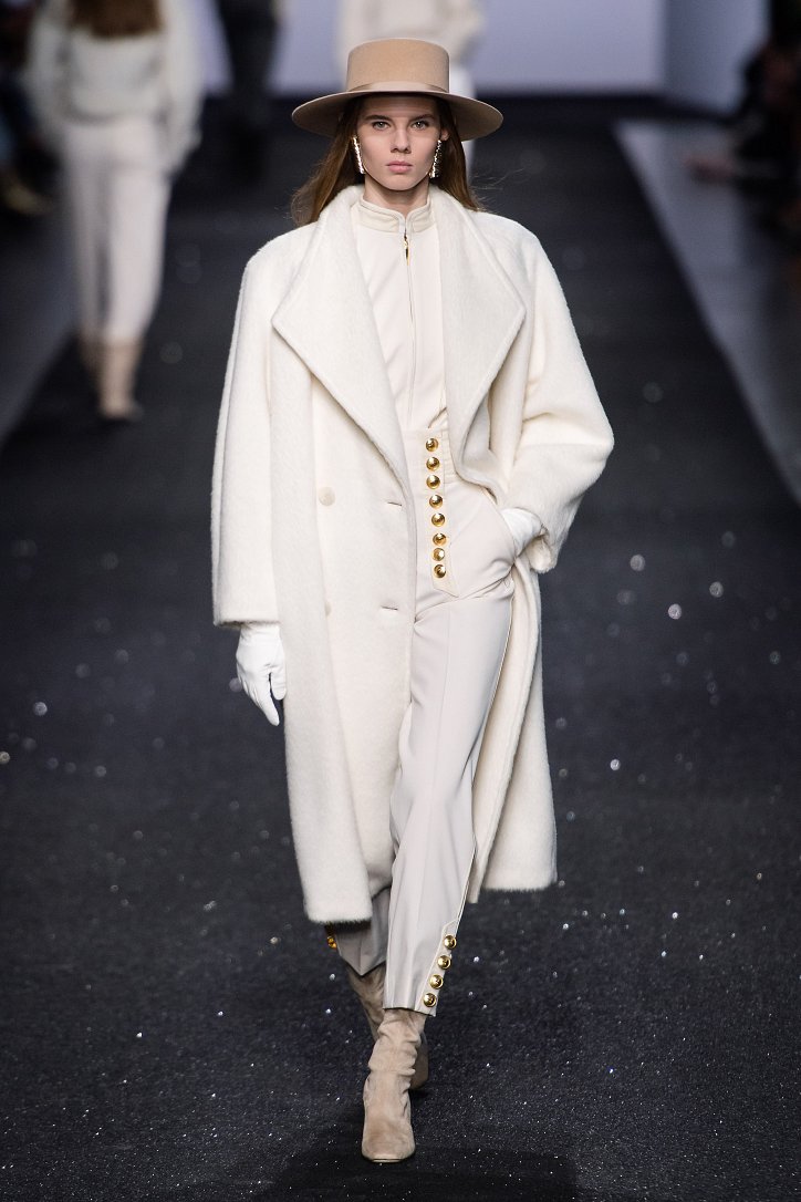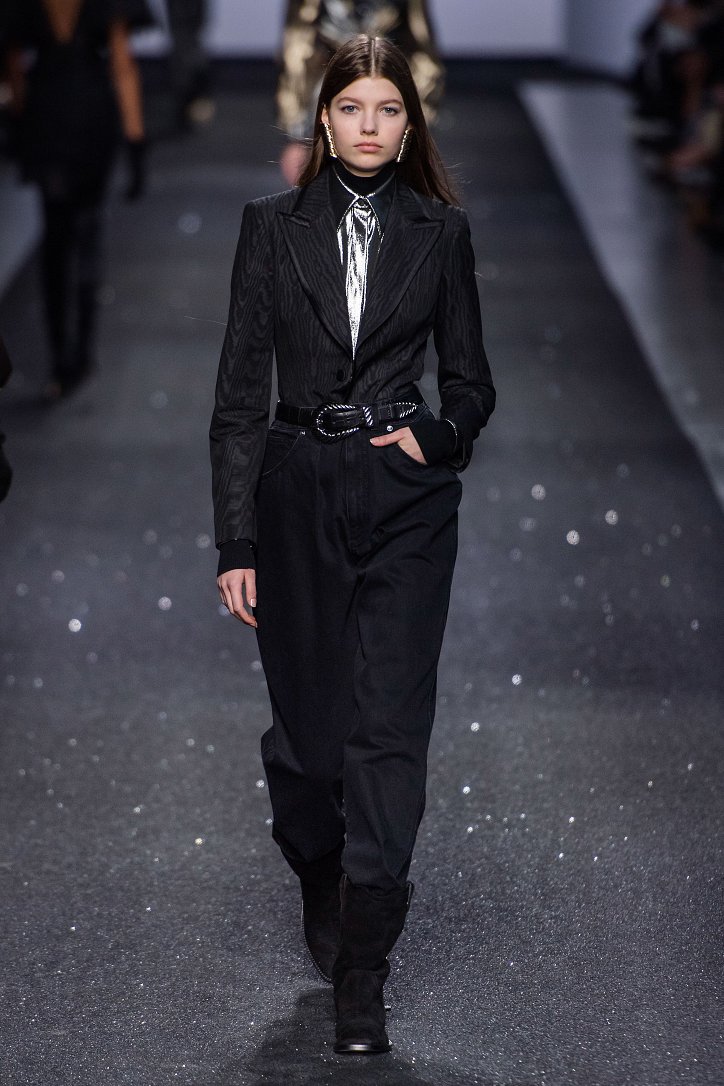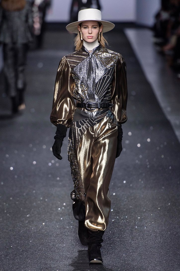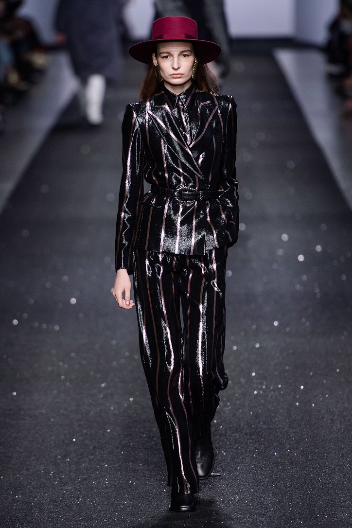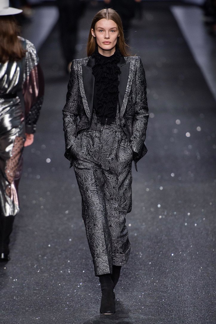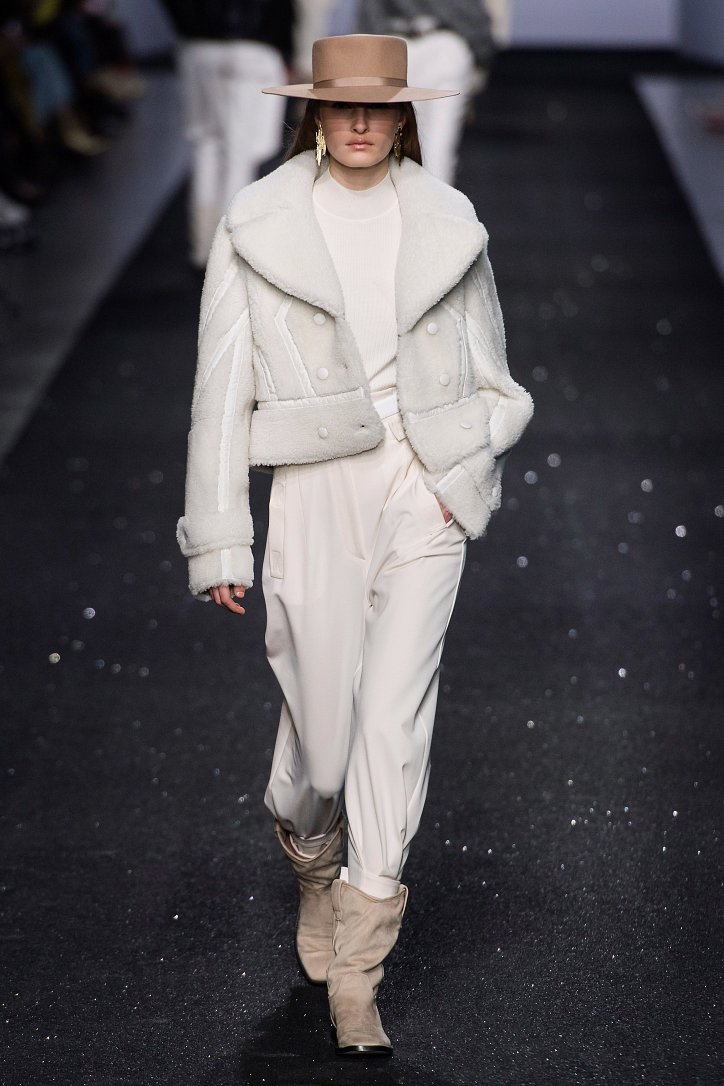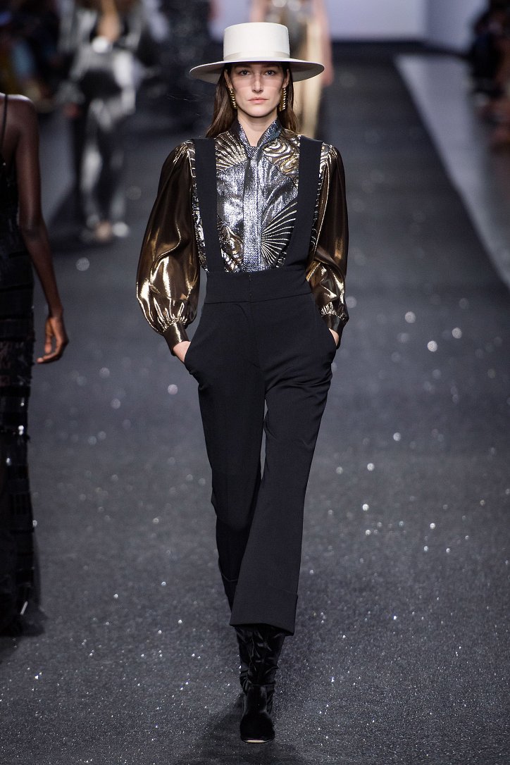 Взяв за основу стиль western и черно-белую палитру, Альберта Ферретти создала целую линейку образов, в которых объемные косухи и пальто миди соседствовали с брюками на высокой талии и уютными свитерами, а главными аксессуарами стали сапоги-казаки и фетровые шляпы. Вечерний блок был предсказуемо роскошен: переливы серебра и золота чередовались с блеском бисера и пайеток, кружевами и полупрозрачным шифоном.