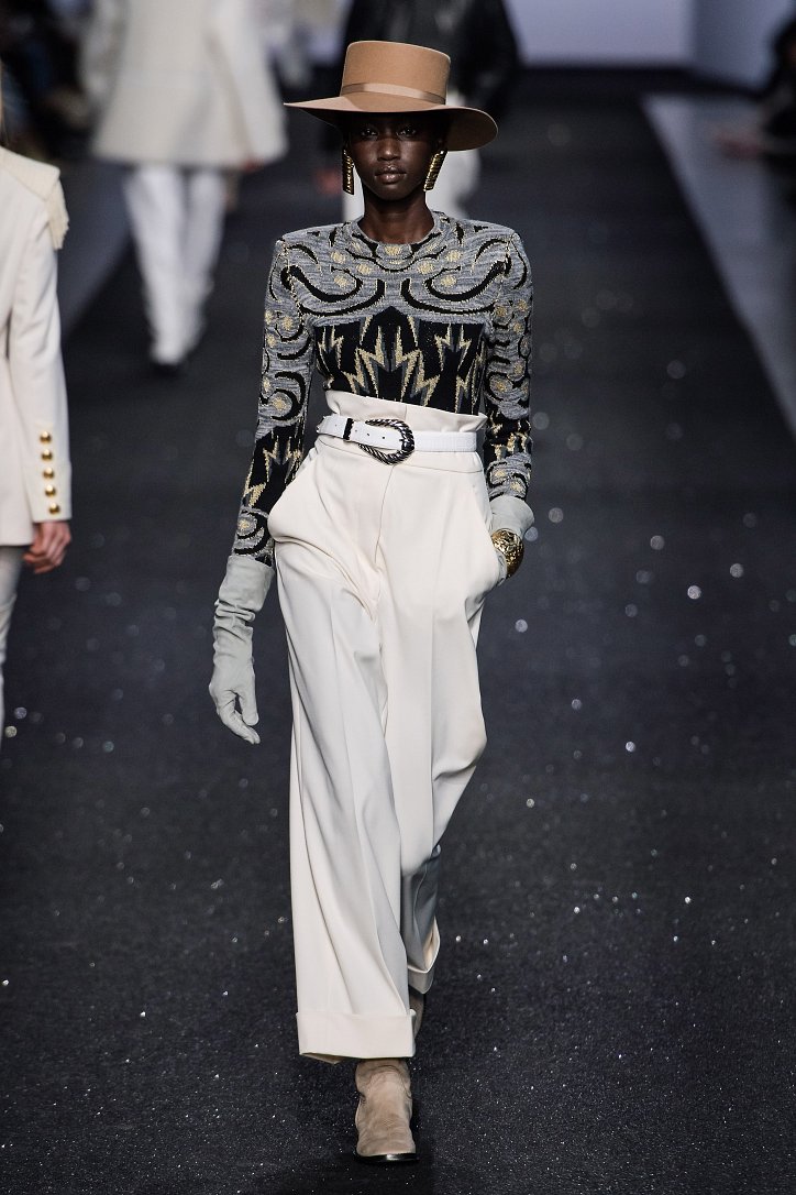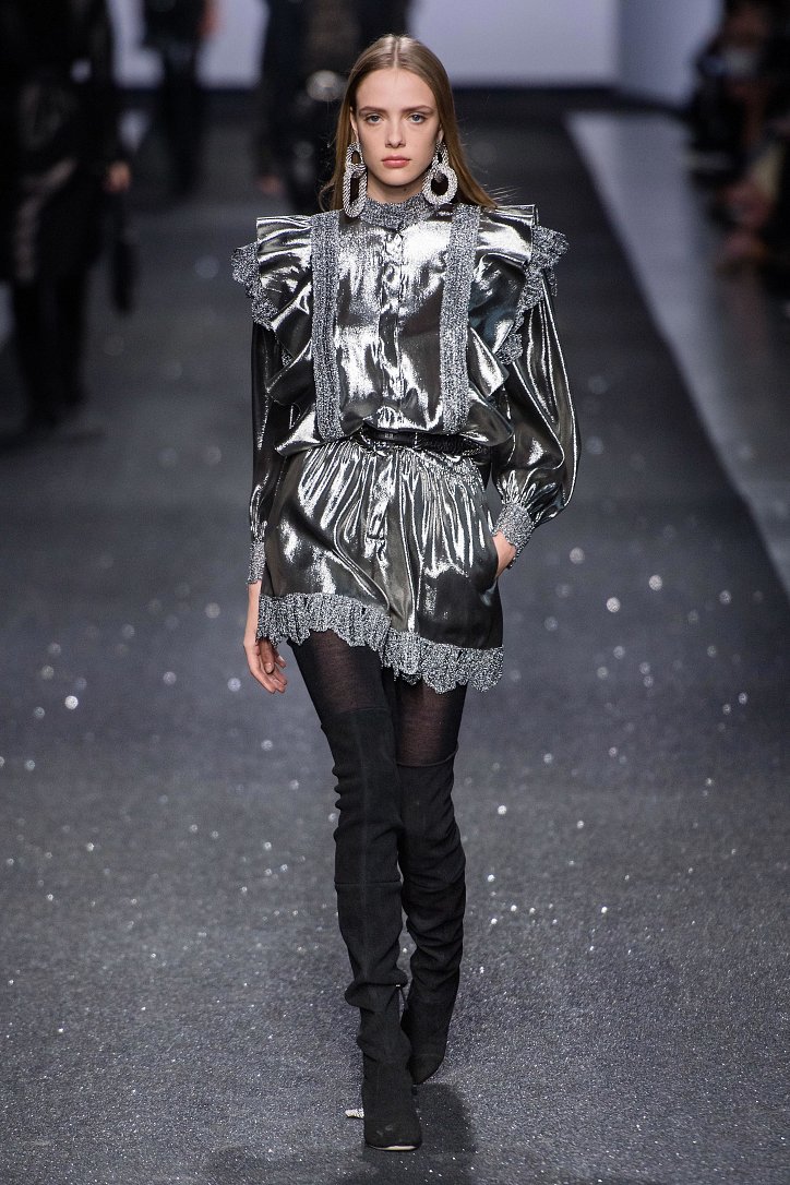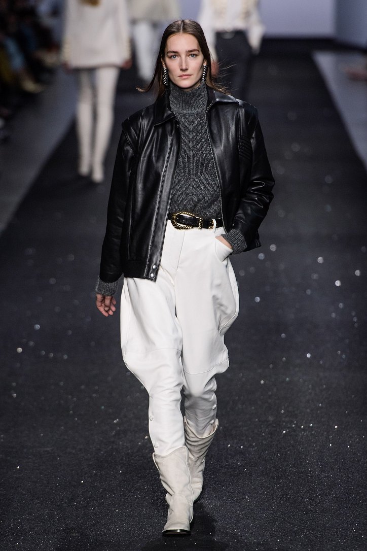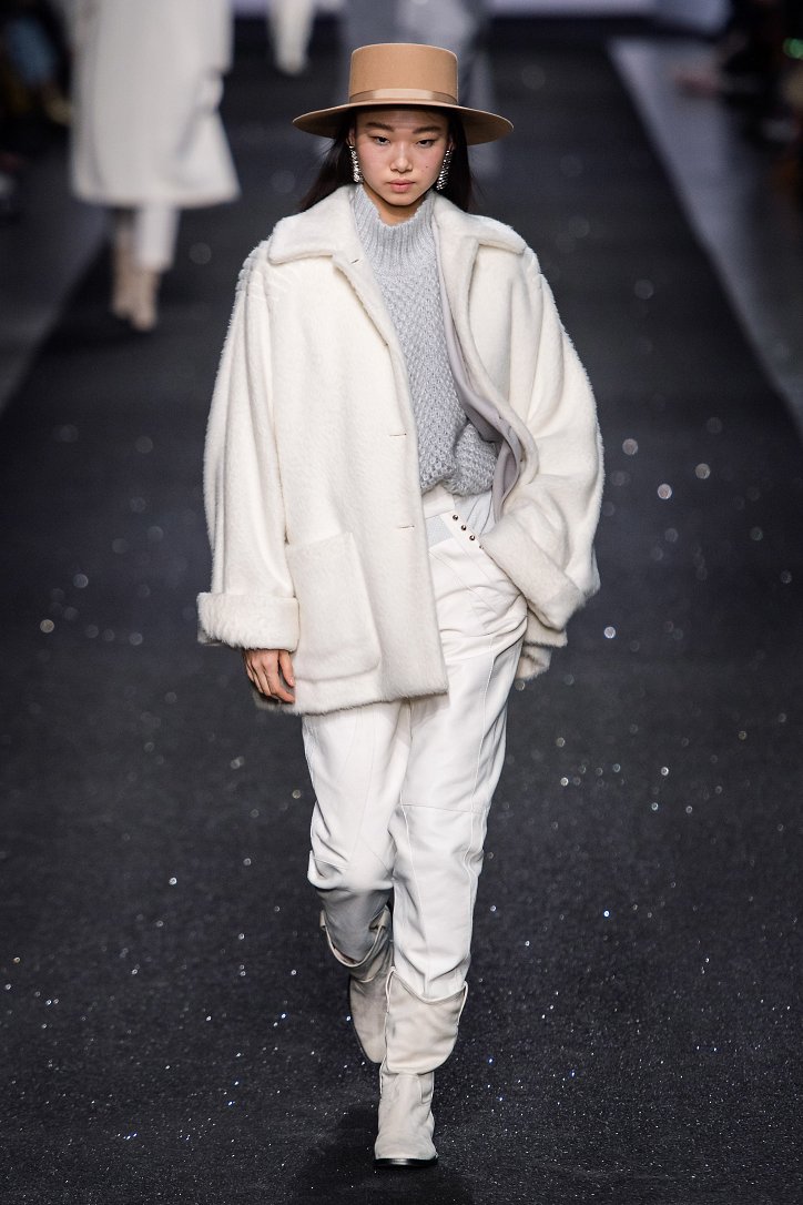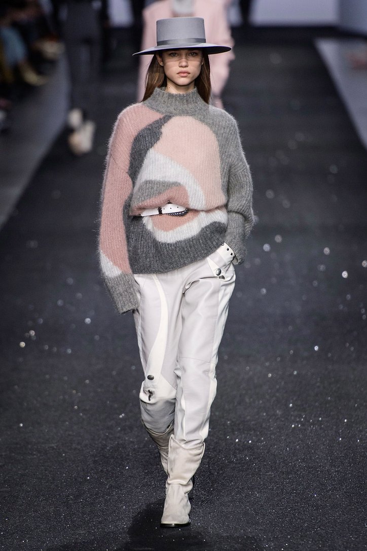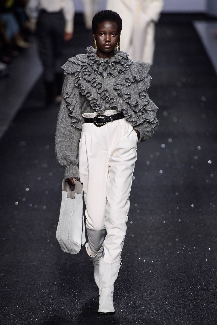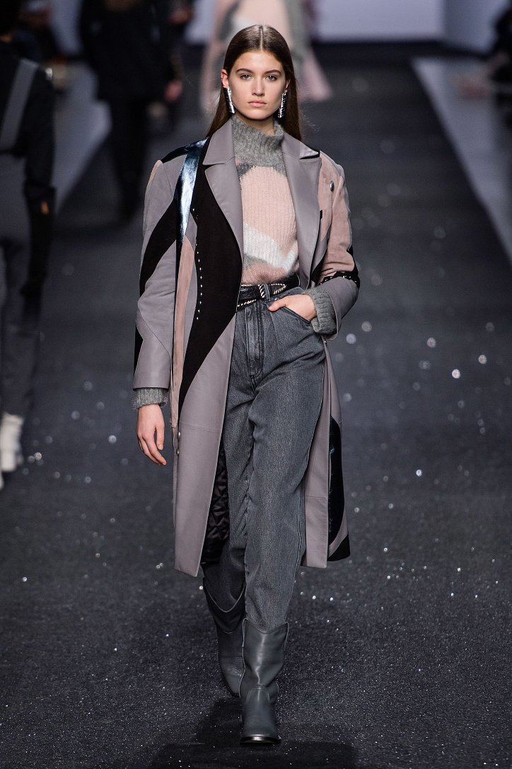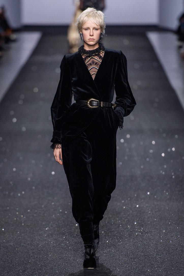 Взяв за основу стиль western и черно-белую палитру, Альберта Ферретти создала целую линейку образов, в которых объемные косухи и пальто миди соседствовали с брюками на высокой талии и уютными свитерами, а главными аксессуарами стали сапоги-казаки и фетровые шляпы. Вечерний блок был предсказуемо роскошен: переливы серебра и золота чередовались с блеском бисера и пайеток, кружевами и полупрозрачным шифоном.