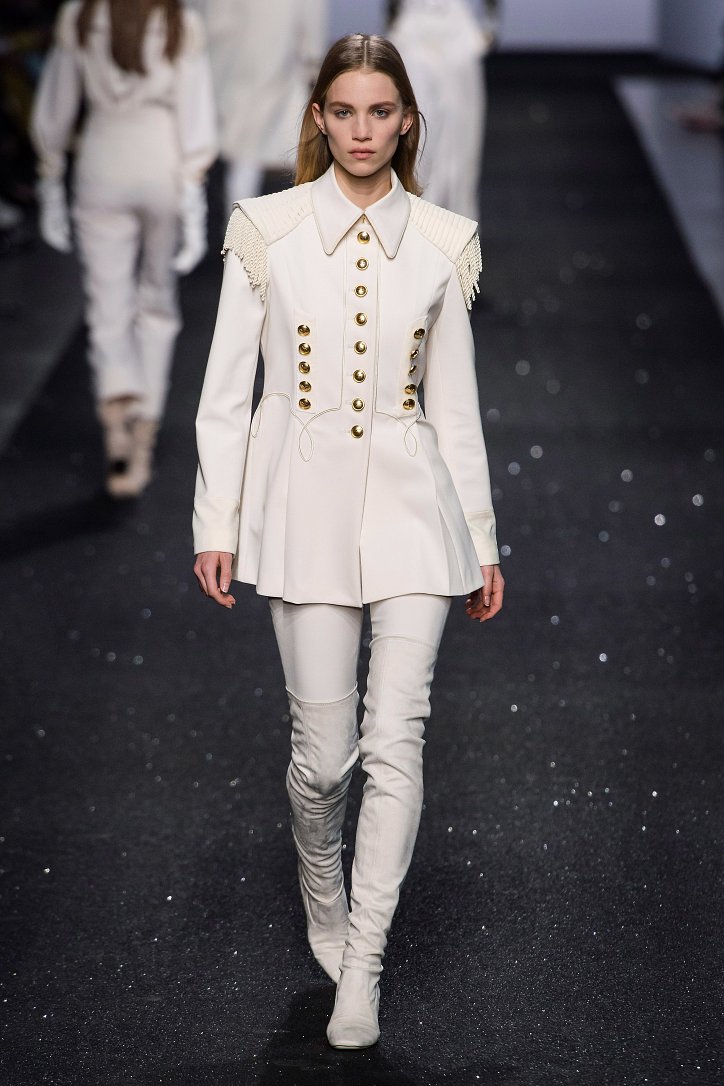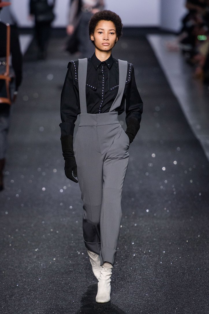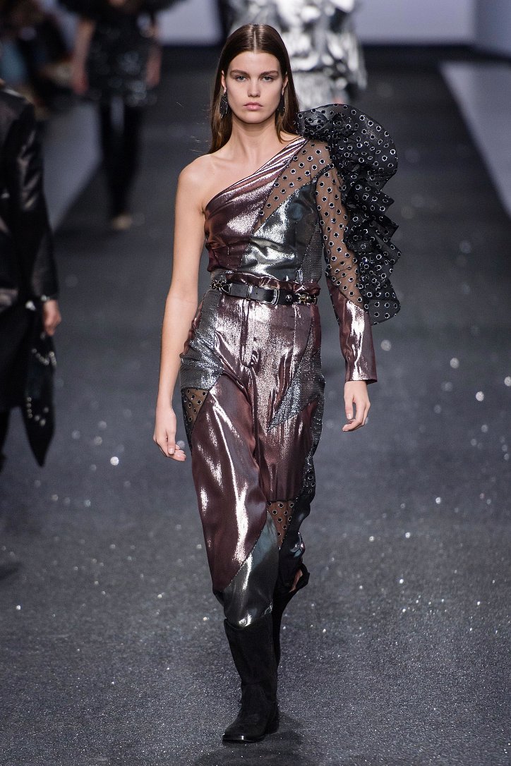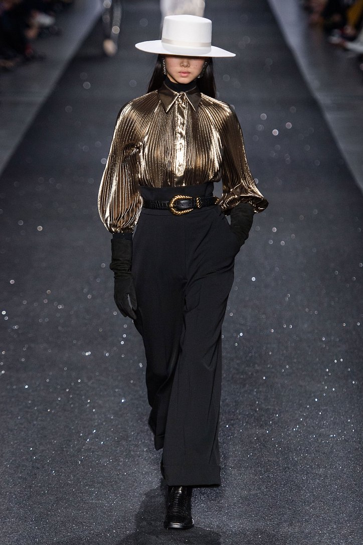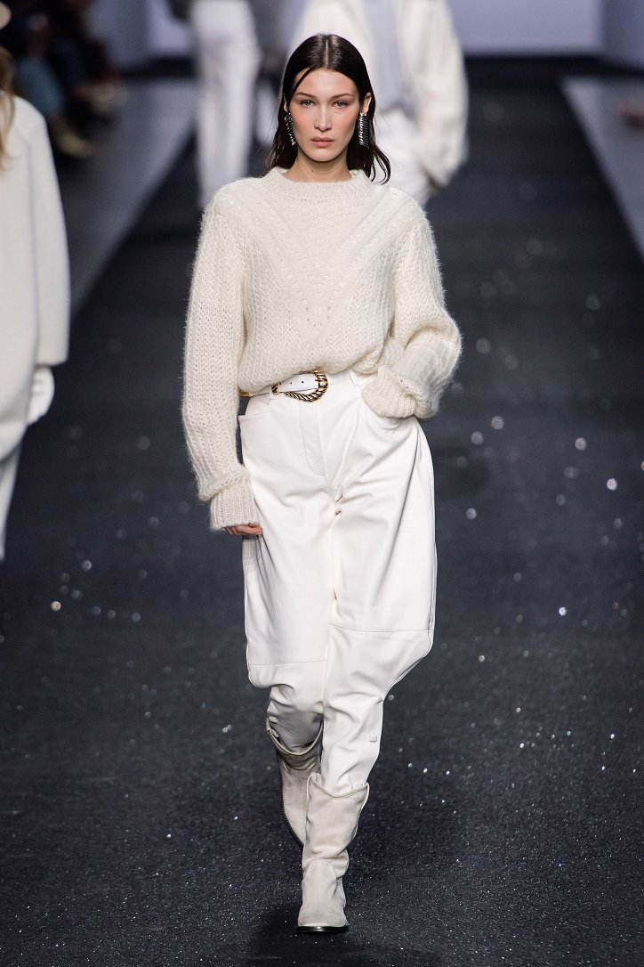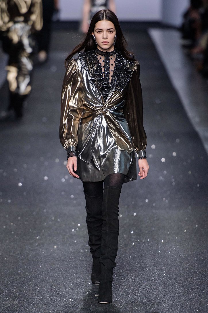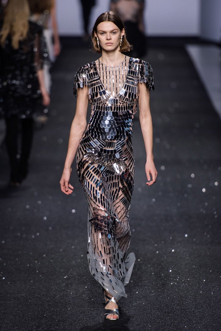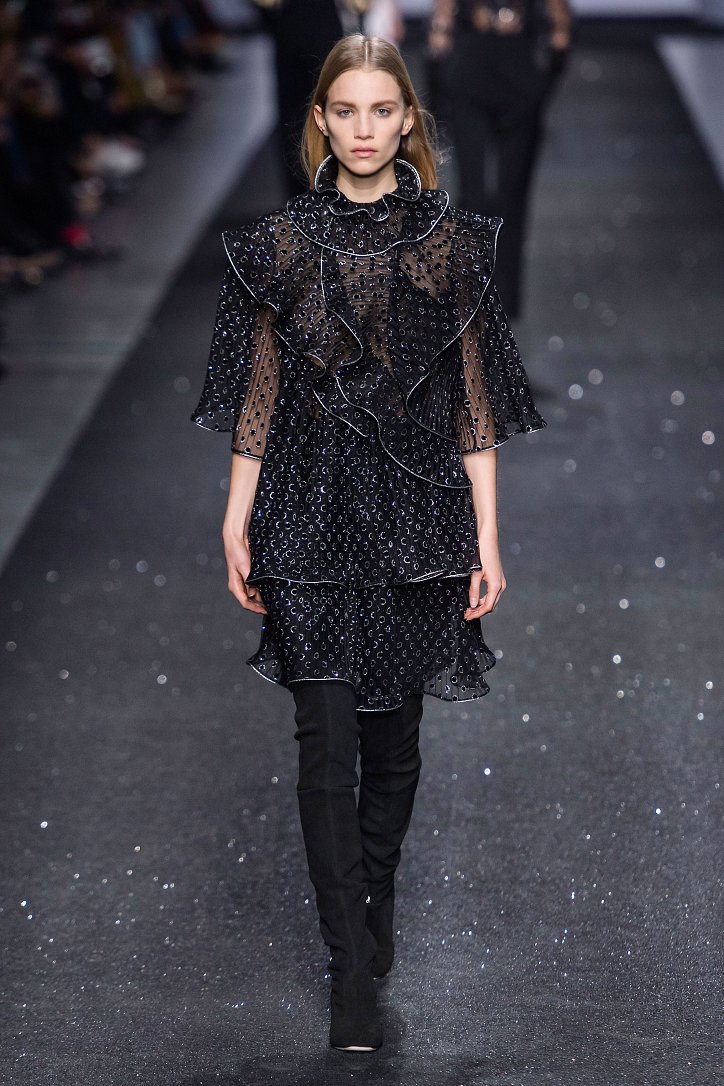 Взяв за основу стиль western и черно-белую палитру, Альберта Ферретти создала целую линейку образов, в которых объемные косухи и пальто миди соседствовали с брюками на высокой талии и уютными свитерами, а главными аксессуарами стали сапоги-казаки и фетровые шляпы. Вечерний блок был предсказуемо роскошен: переливы серебра и золота чередовались с блеском бисера и пайеток, кружевами и полупрозрачным шифоном.