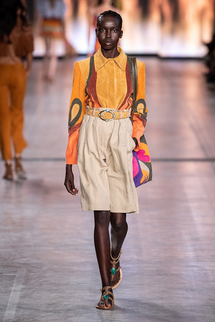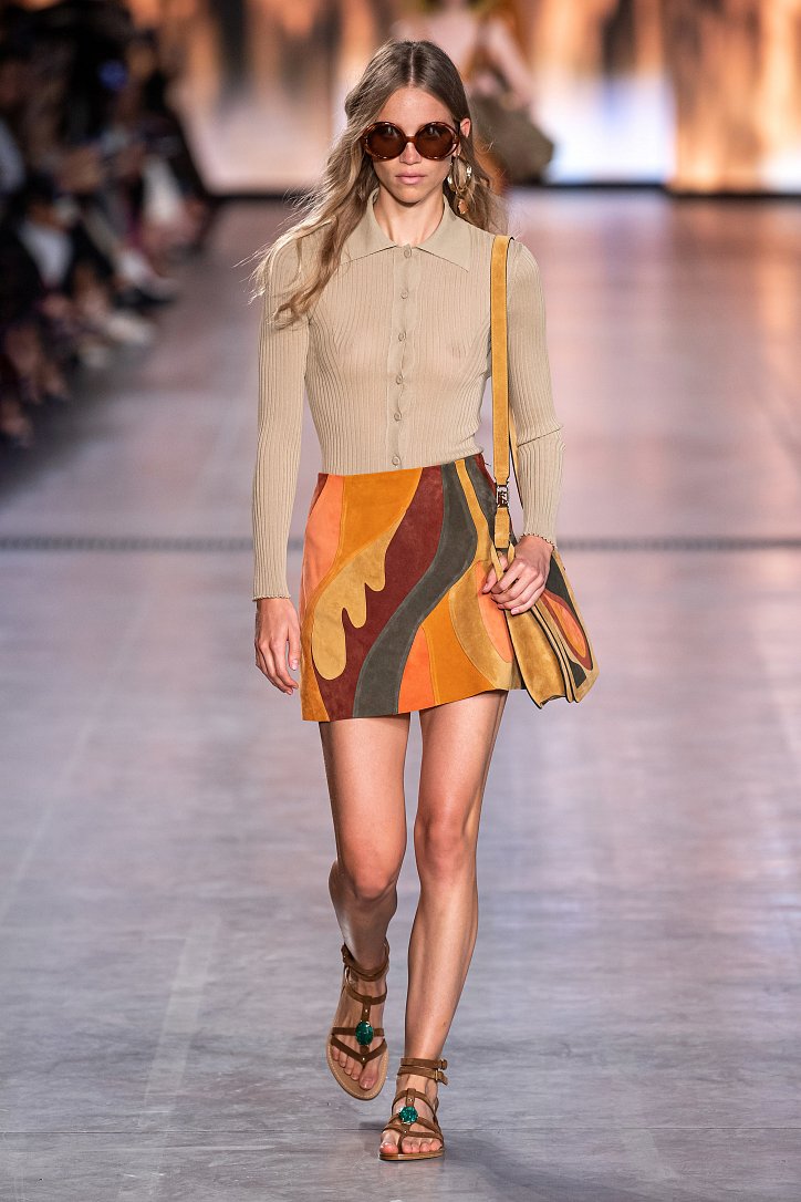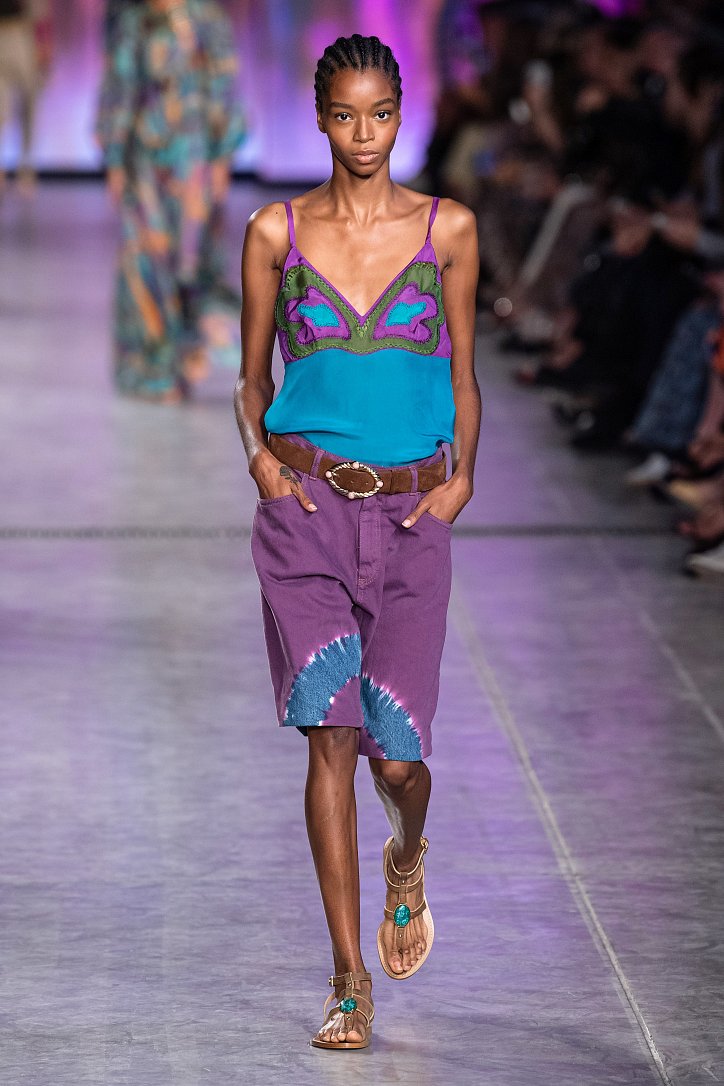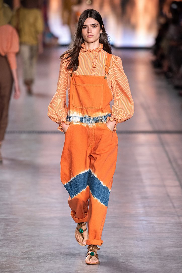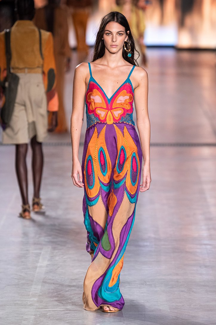 Будущей весной она предлагает взглянуть на моду сквозь призму семидесятых. Коллекция Alberta Ferretti полна цитат из гардероба той поры: в ней было много денима и замши, ярких красок и элементов бохо, брюк-бананов и пэчворка. Летящие платья чередовались с укороченными брюками клеш, шорты на высокой талии объединились с романтической белой блузой с пышными рукавами, а джинсовые комбинезоны демонстрировали оригинальное «исполнение» принта tie-dye.