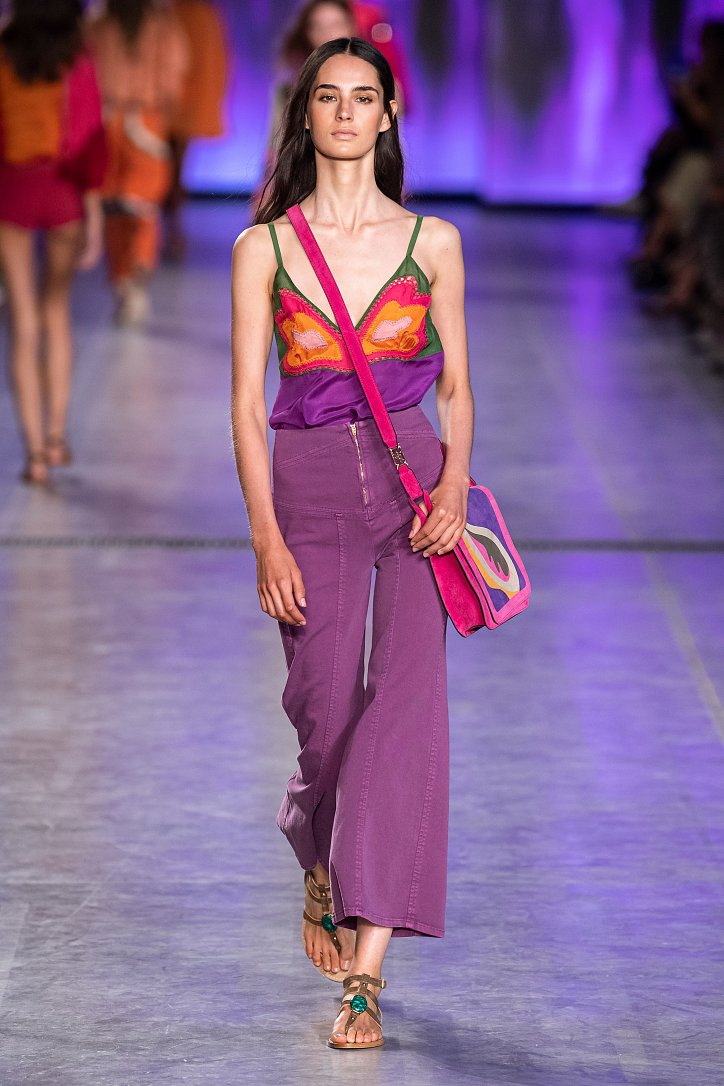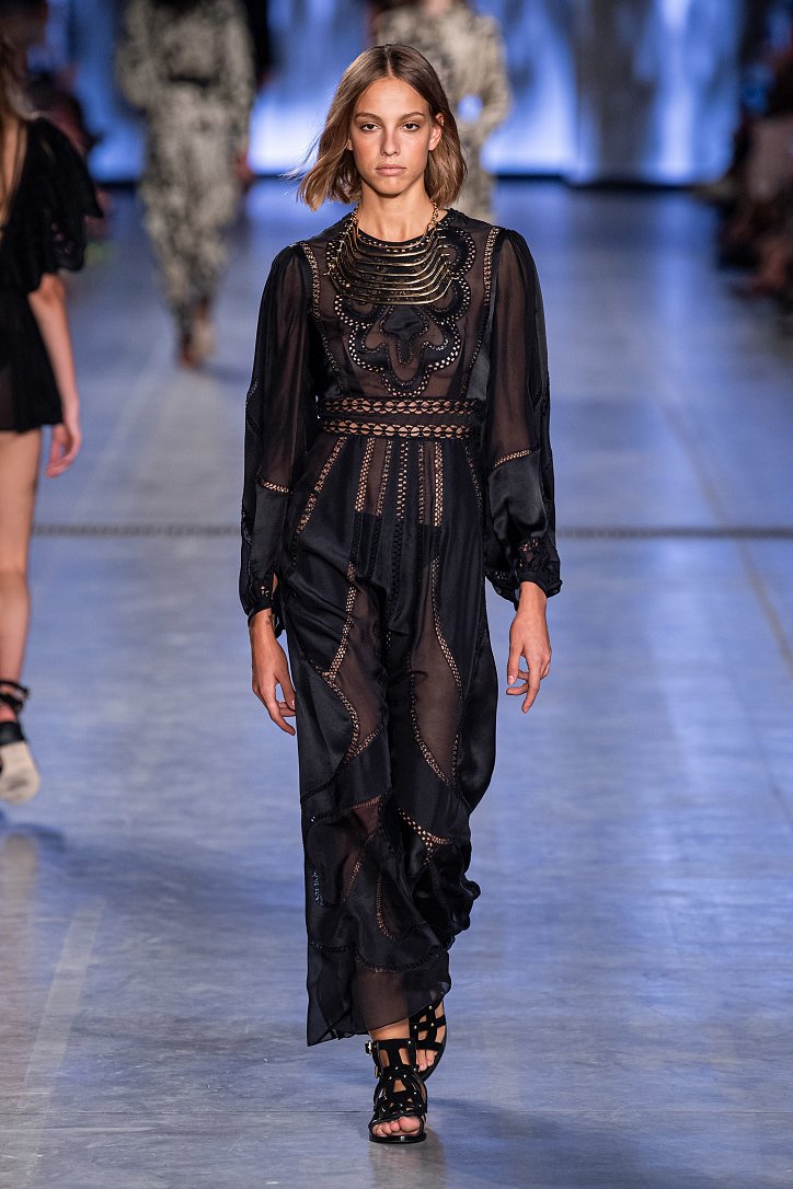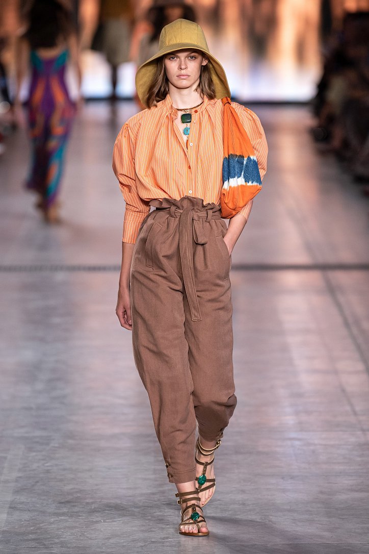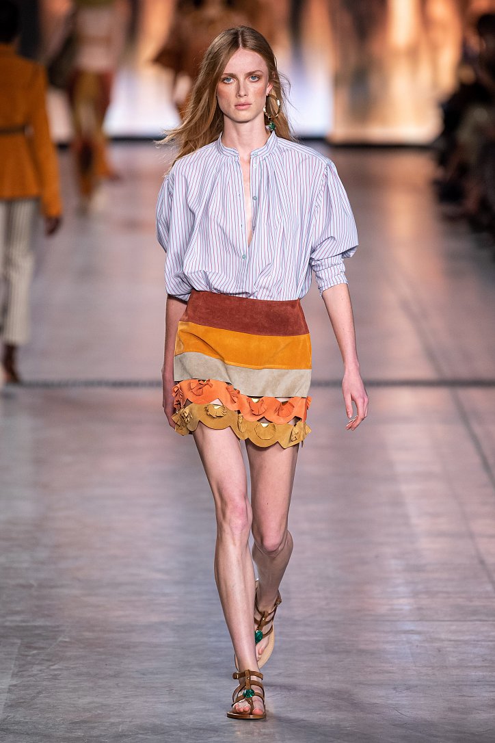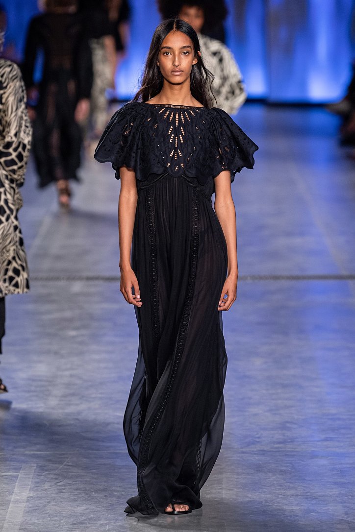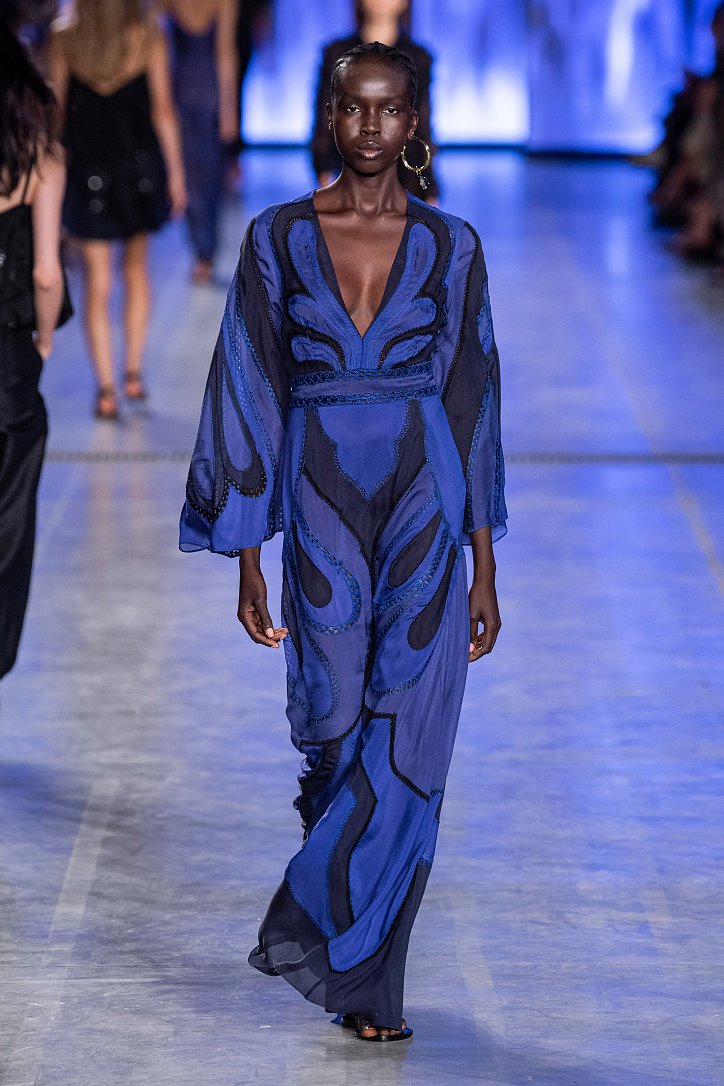 Будущей весной она предлагает взглянуть на моду сквозь призму семидесятых. Коллекция Alberta Ferretti полна цитат из гардероба той поры: в ней было много денима и замши, ярких красок и элементов бохо, брюк-бананов и пэчворка. Летящие платья чередовались с укороченными брюками клеш, шорты на высокой талии объединились с романтической белой блузой с пышными рукавами, а джинсовые комбинезоны демонстрировали оригинальное «исполнение» принта tie-dye.