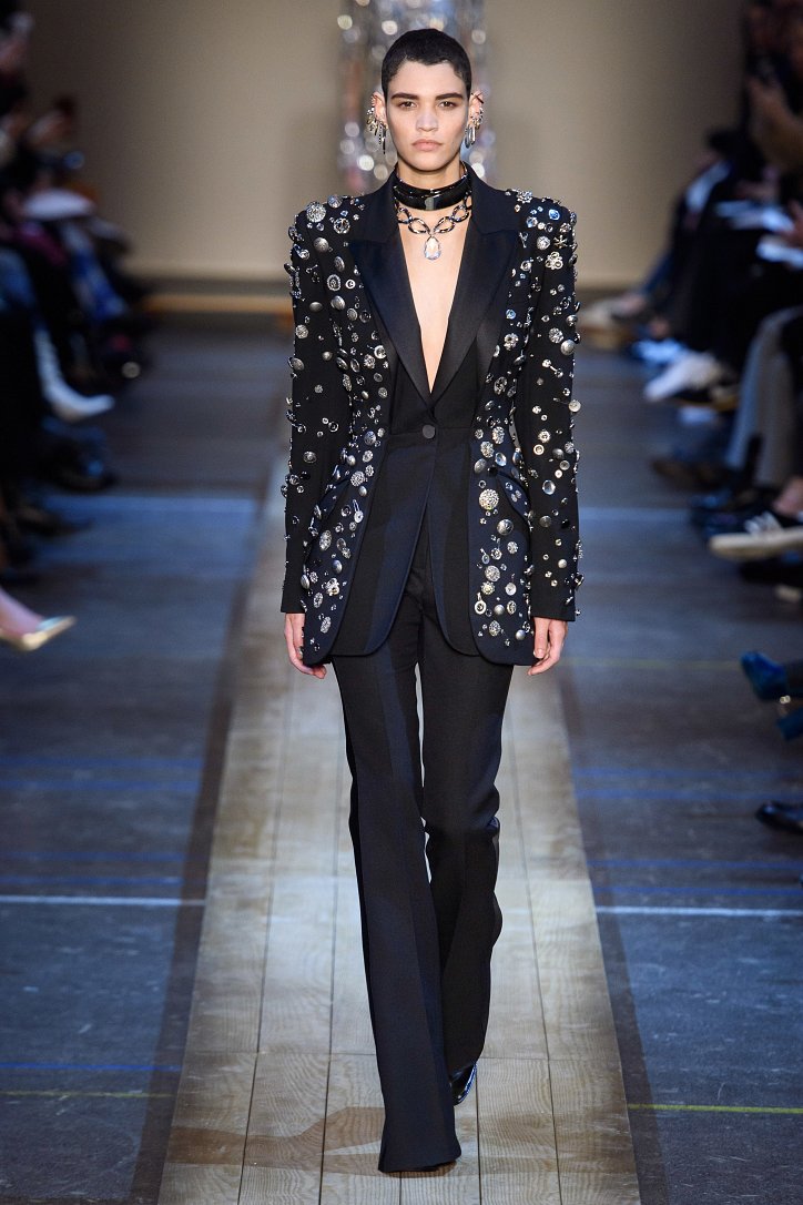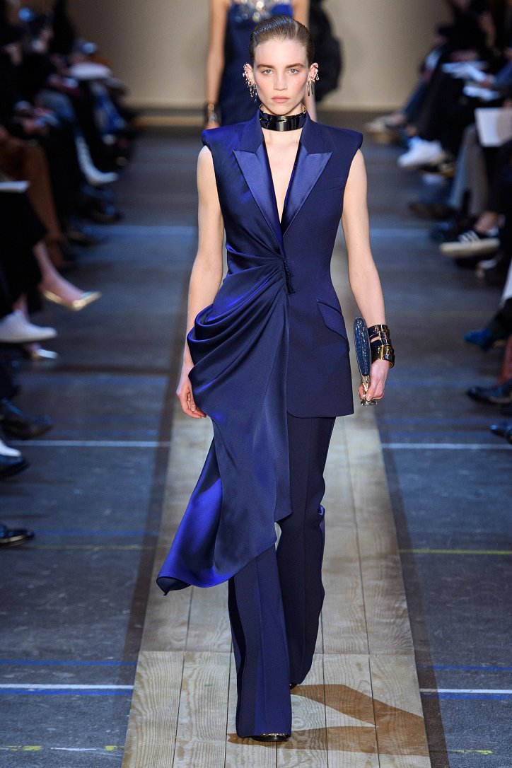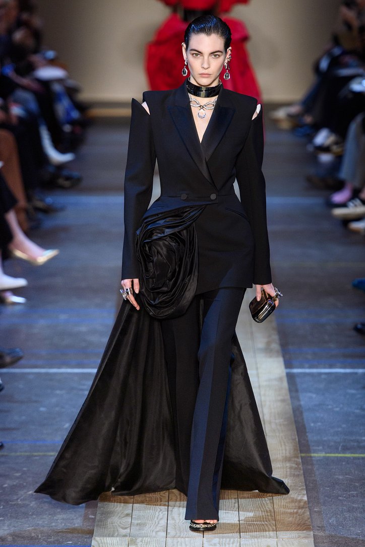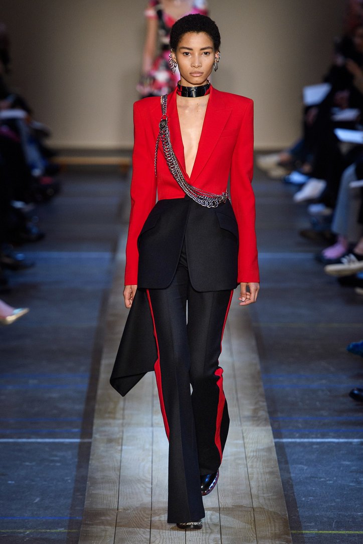 Коллекция Alexander McQueen выглядит одновременно «очень английской» и очень дерзкой, мрачной и романтичной – и, однозначно, экстраоригинальной и необычной. Дизайнер изобретательно подходит не только к крою и пошиву, но и к манипуляциям с материалами. Из атласа цвета фуксии она «свернула» рукава для черного смокинга, придав им сходство с розовыми бутонами, к строгому жакету с принтом «принц Уэльский» добавила юбку из роз, которые «вышиты» обрезками кромки, а одну из фалд пиджака дизайнер «вытянула», придав брючному костюму не только асимметричности, но и ноток романтизма.