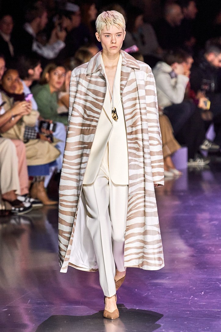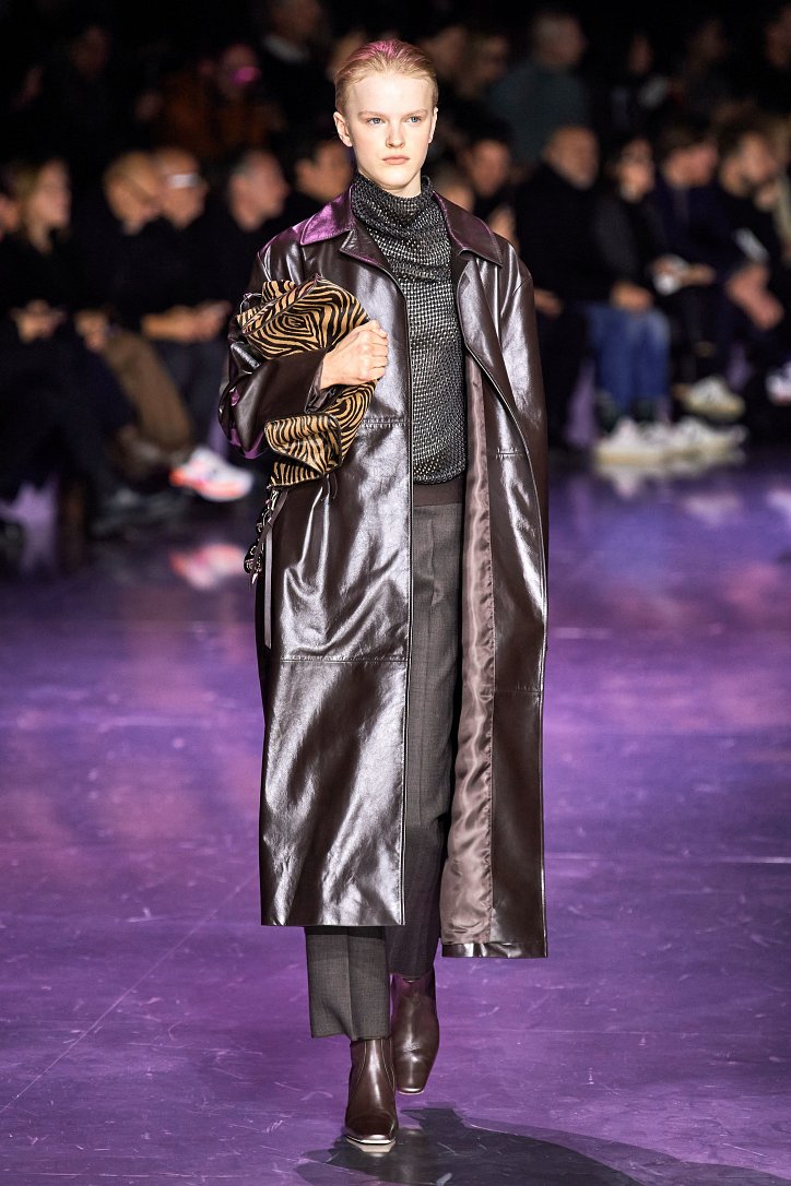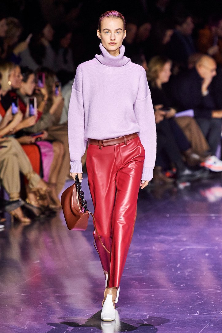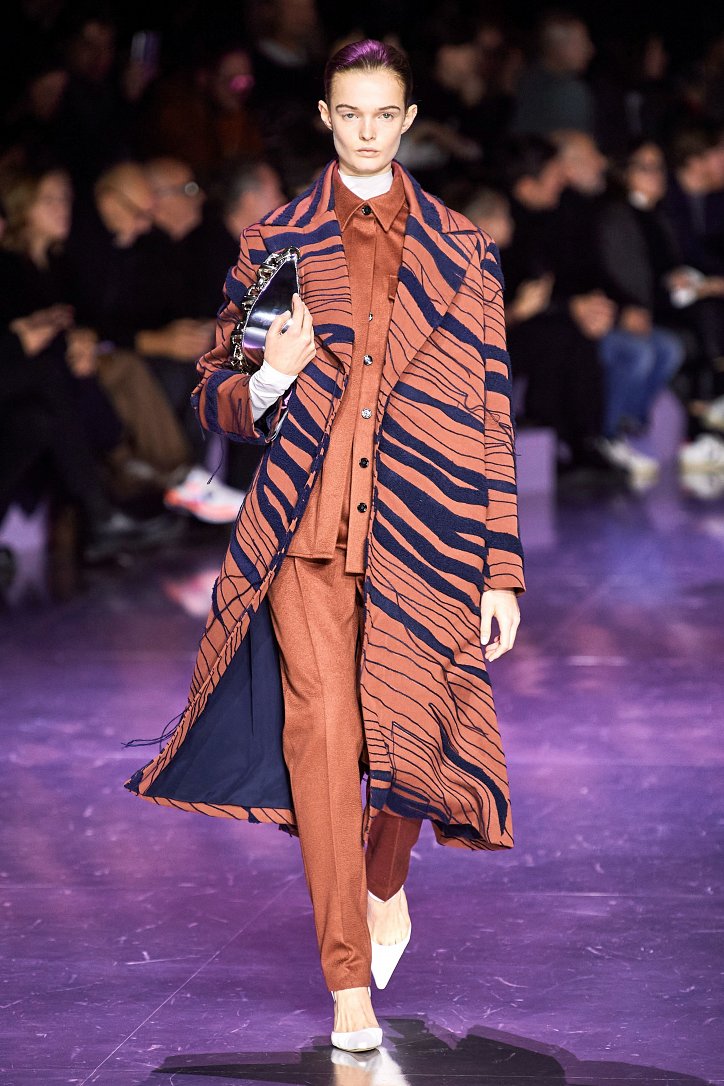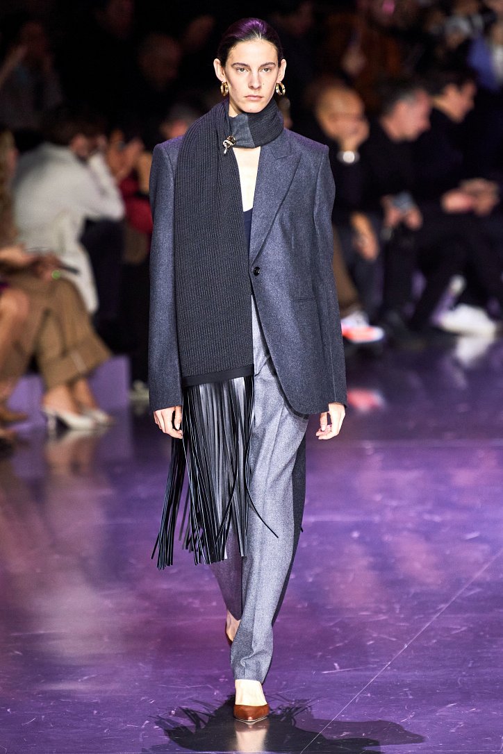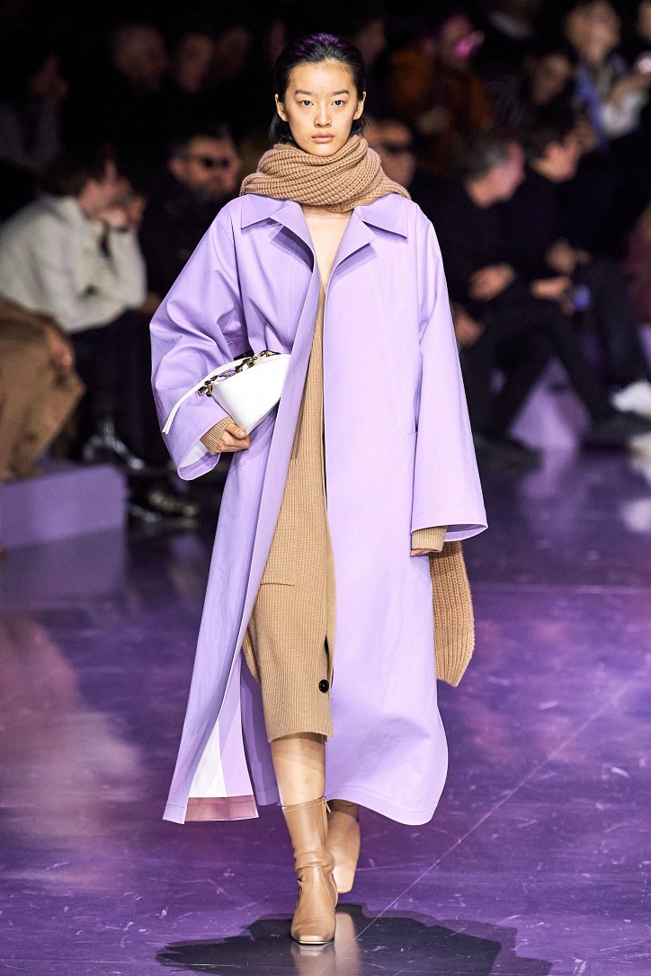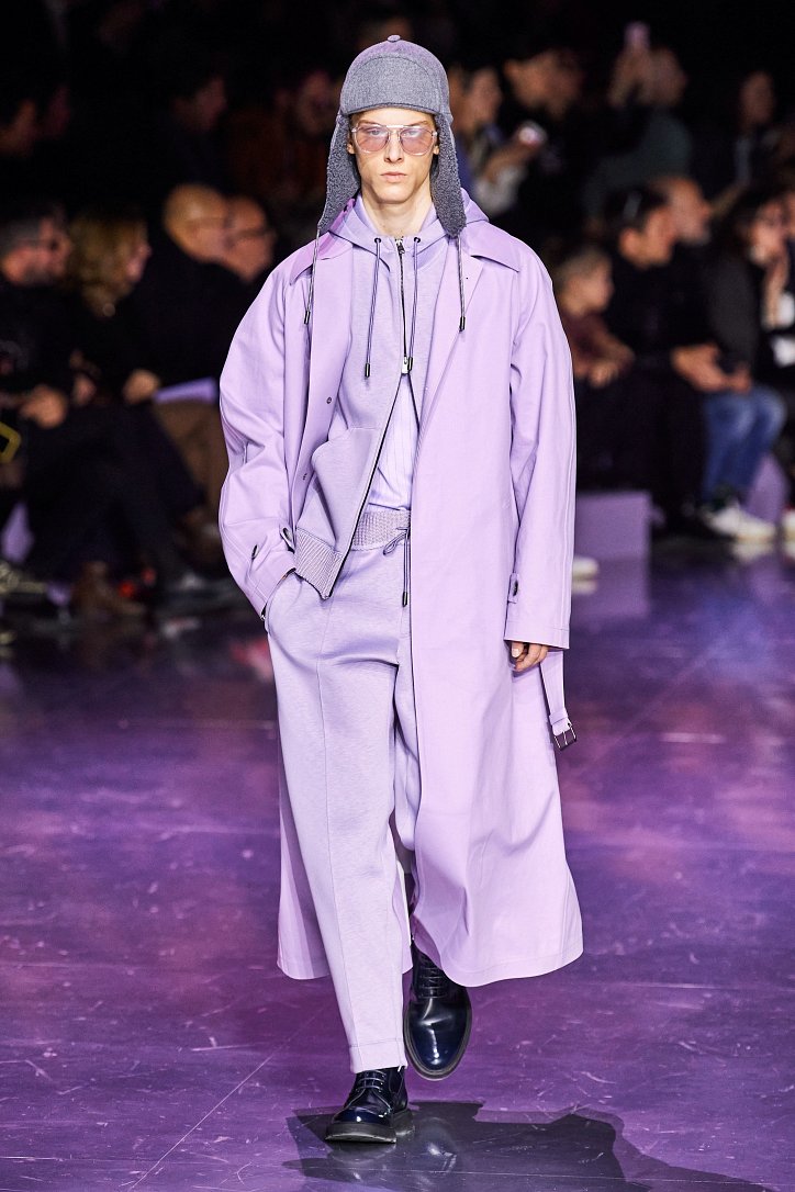 Тон был задан еще до начала дефиле: пол зала, где проходил показ, был застлан фиолетовым ковром, а гости в ожидании шоу потягивали лиловый смузи. Так что традиционные для бренда черный, серый, темно-синий (они, конечно, же тоже никуда не делись) стали фоном для моделей в бледно-фиолетовых тонах. Добавил дизайнер в коллекцию и теплых ноток – в виде оттенка ржавчины и вкраплений ярко-оранжевого, и текстуры – в виде изогнутых полос и необычного принта «под зебру».