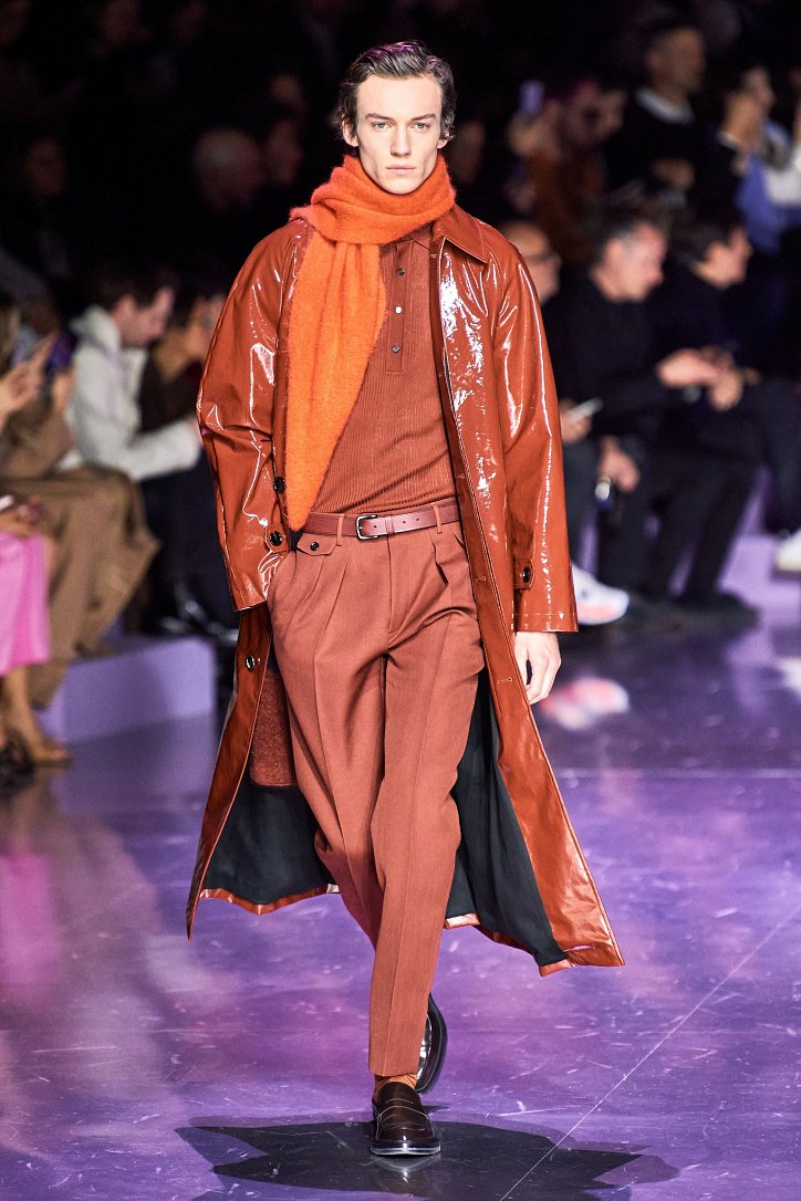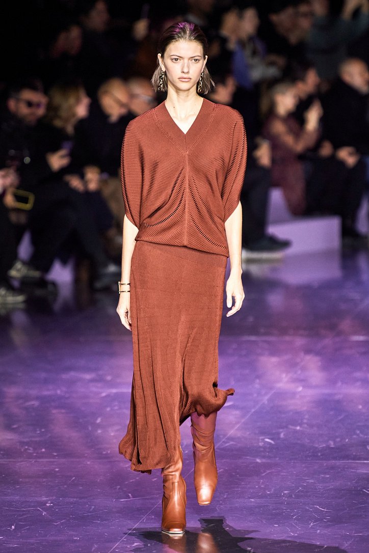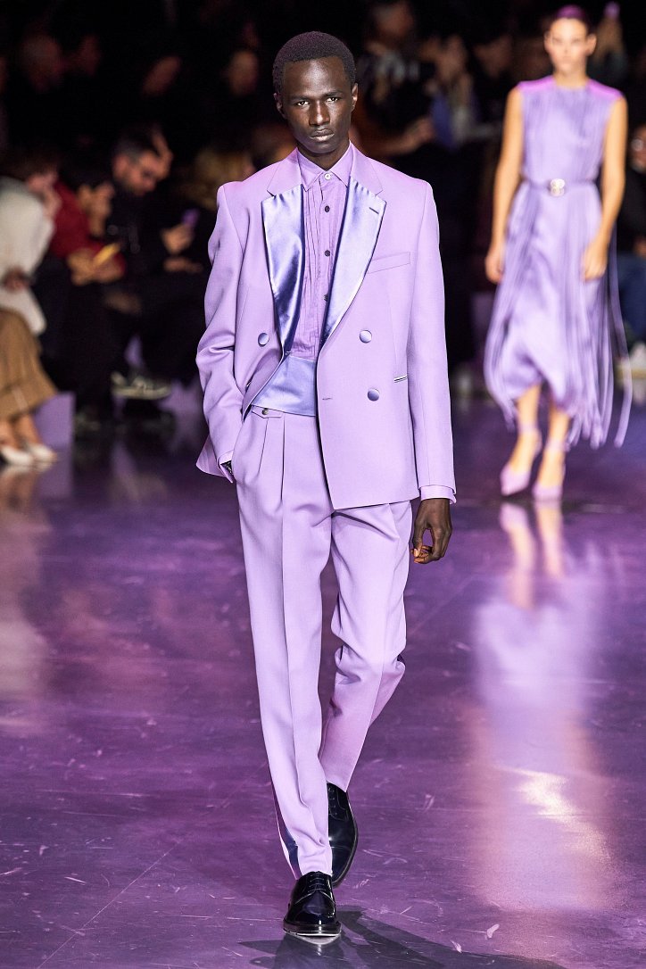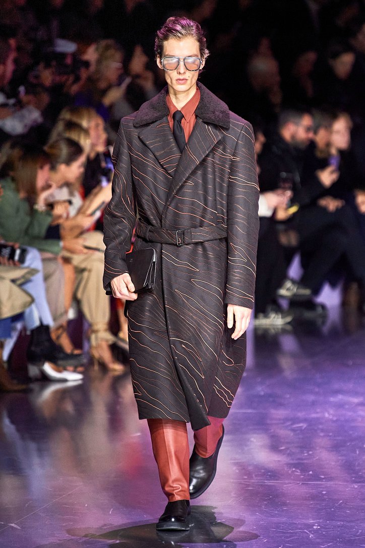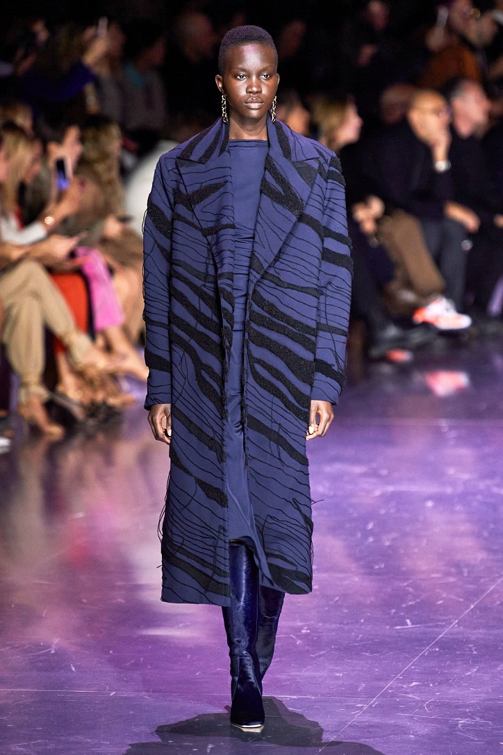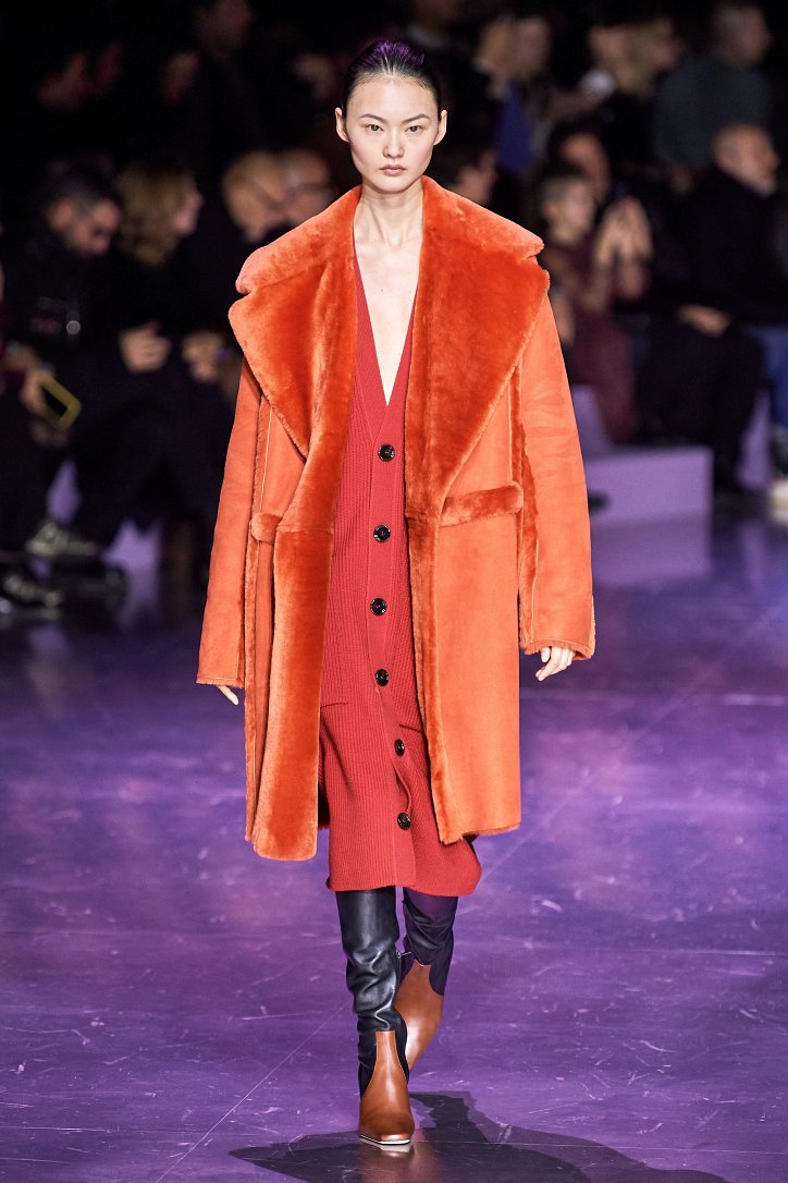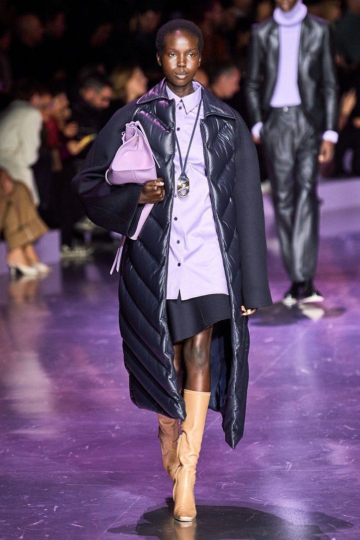 Тон был задан еще до начала дефиле: пол зала, где проходил показ, был застлан фиолетовым ковром, а гости в ожидании шоу потягивали лиловый смузи. Так что традиционные для бренда черный, серый, темно-синий (они, конечно, же тоже никуда не делись) стали фоном для моделей в бледно-фиолетовых тонах. Добавил дизайнер в коллекцию и теплых ноток – в виде оттенка ржавчины и вкраплений ярко-оранжевого, и текстуры – в виде изогнутых полос и необычного принта «под зебру».