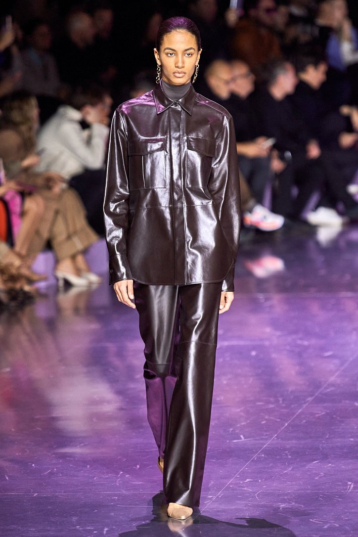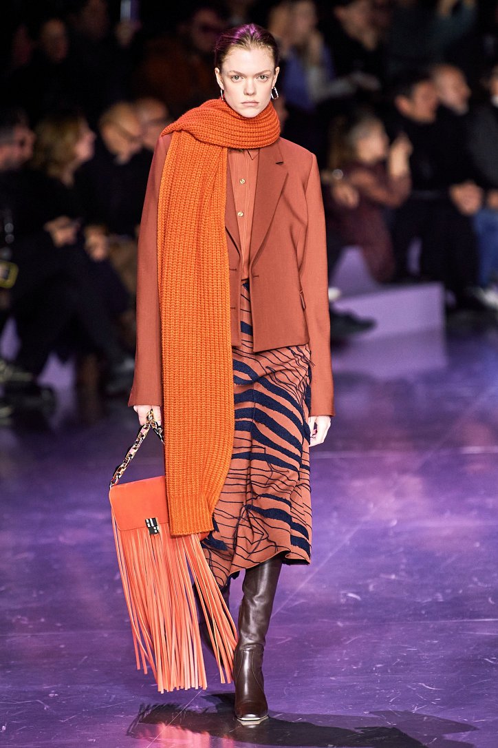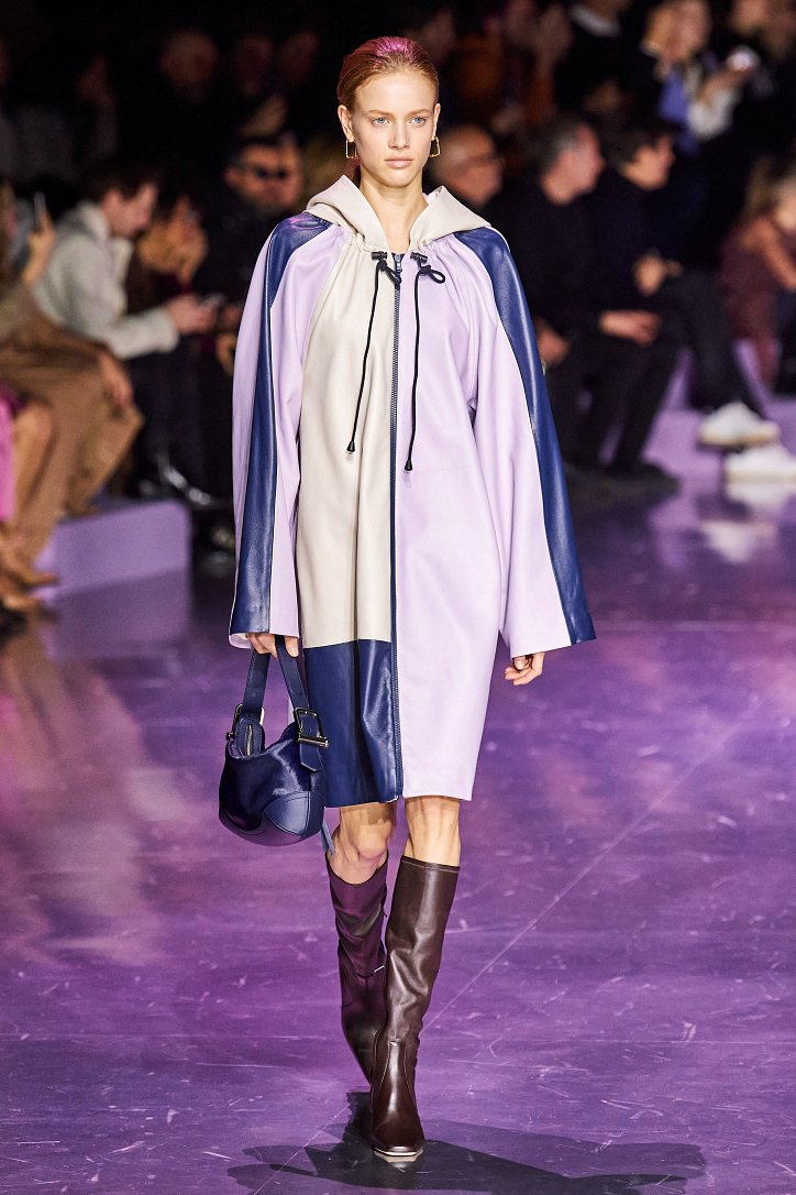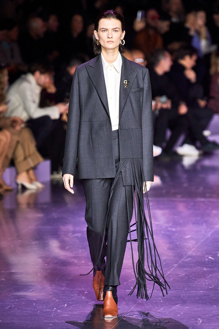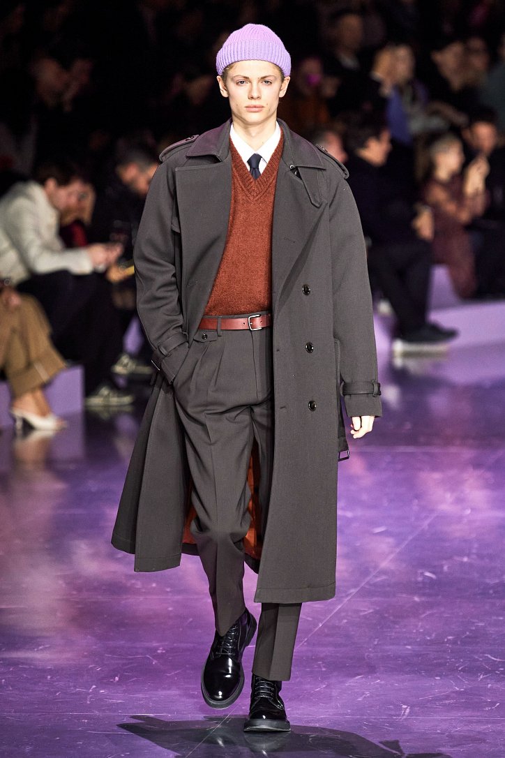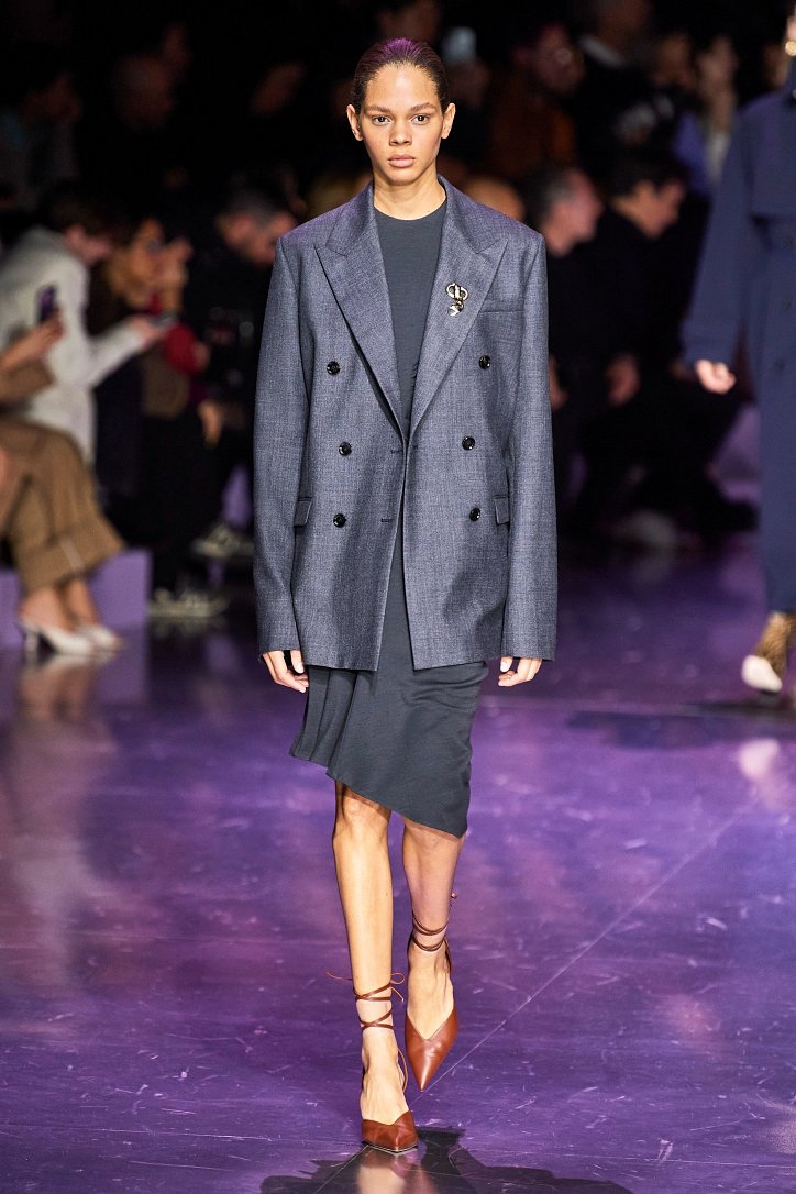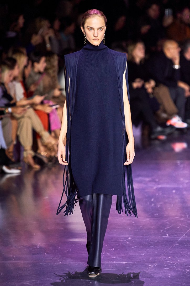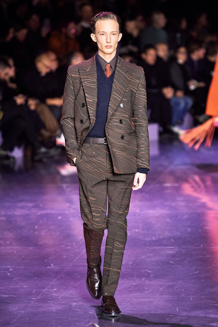 Тон был задан еще до начала дефиле: пол зала, где проходил показ, был застлан фиолетовым ковром, а гости в ожидании шоу потягивали лиловый смузи. Так что традиционные для бренда черный, серый, темно-синий (они, конечно, же тоже никуда не делись) стали фоном для моделей в бледно-фиолетовых тонах. Добавил дизайнер в коллекцию и теплых ноток – в виде оттенка ржавчины и вкраплений ярко-оранжевого, и текстуры – в виде изогнутых полос и необычного принта «под зебру».
