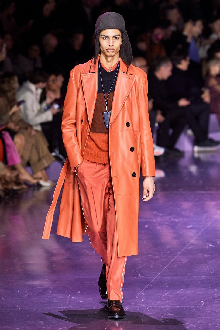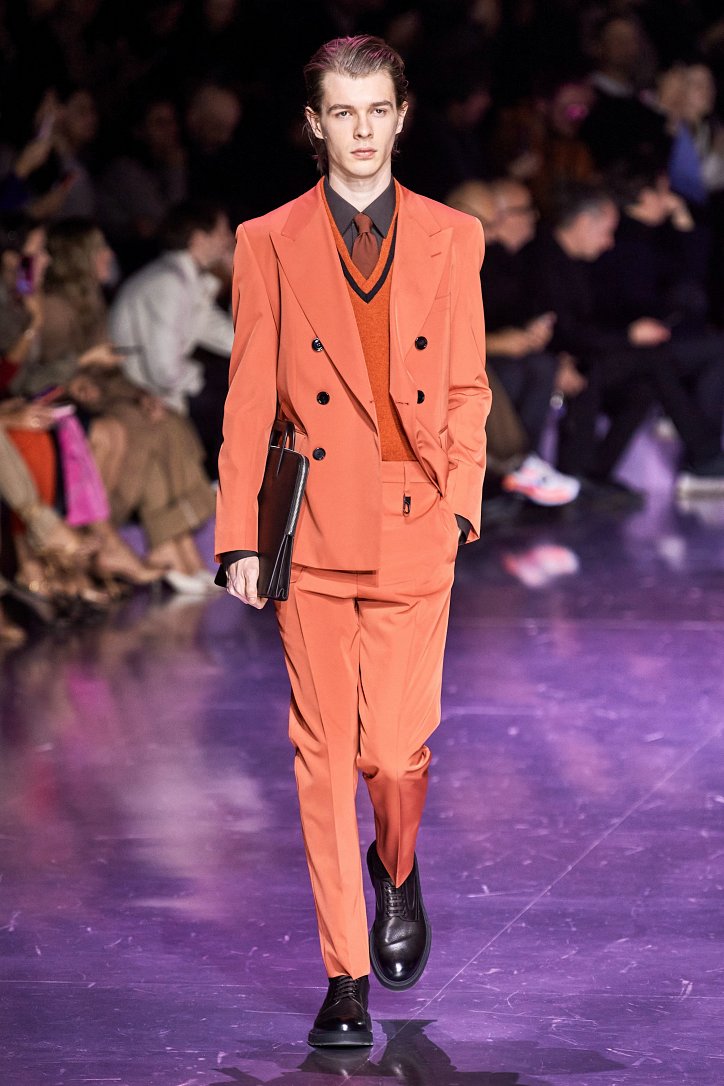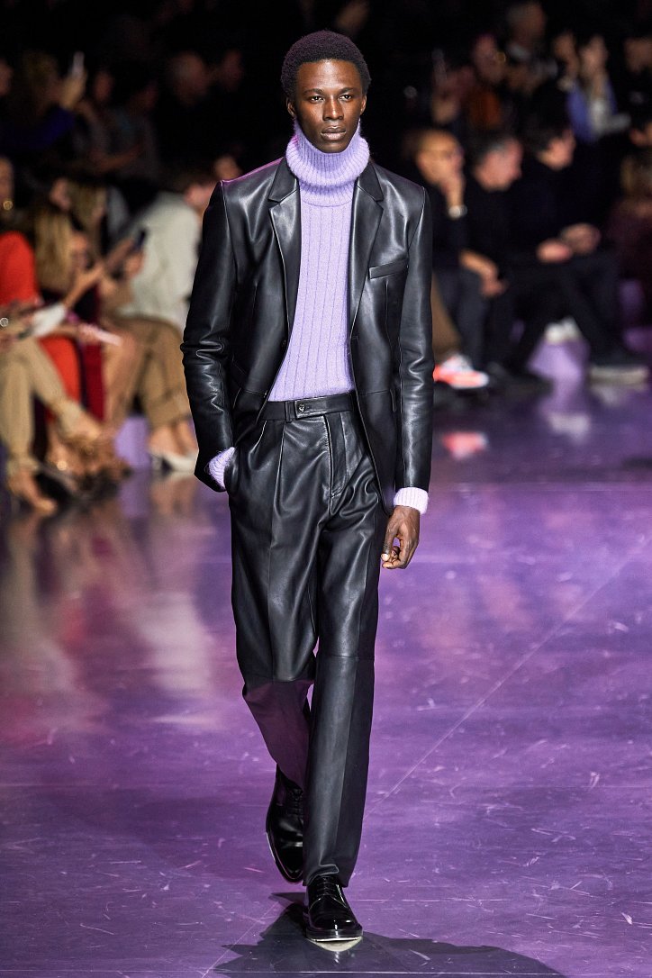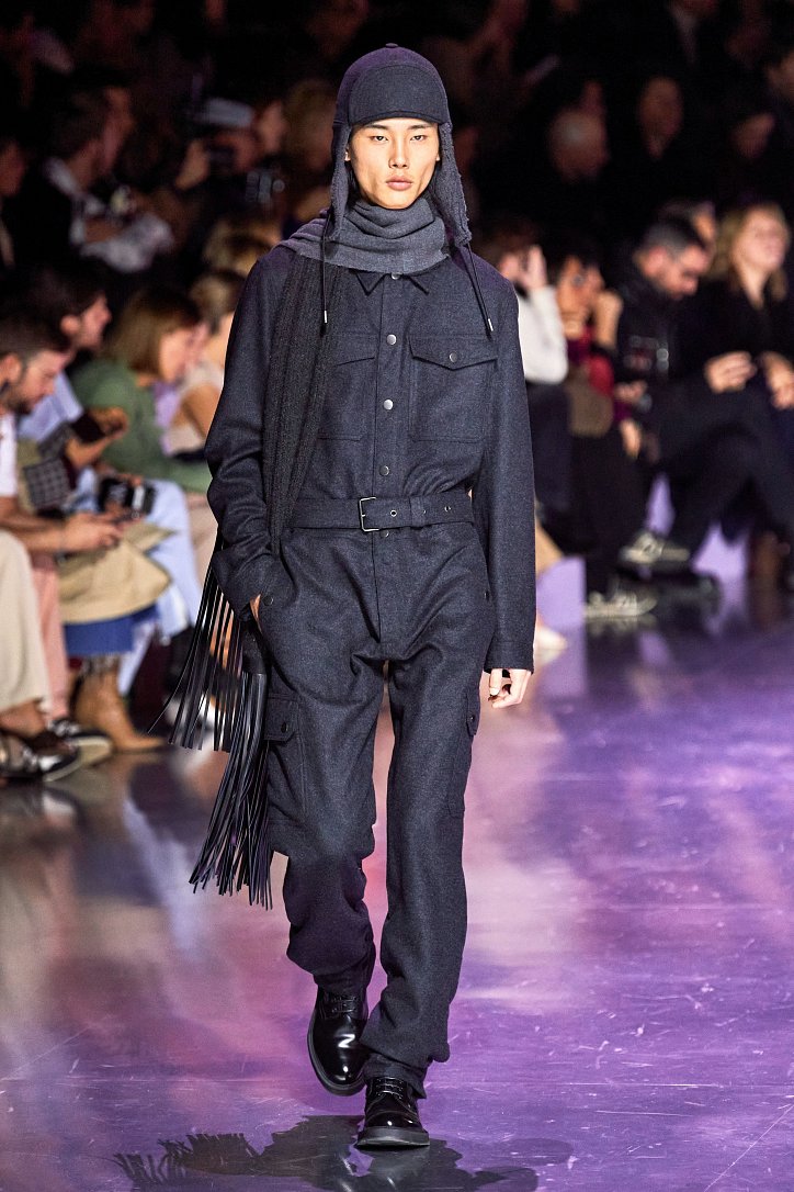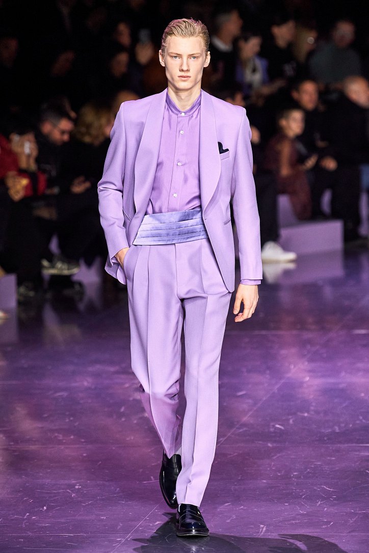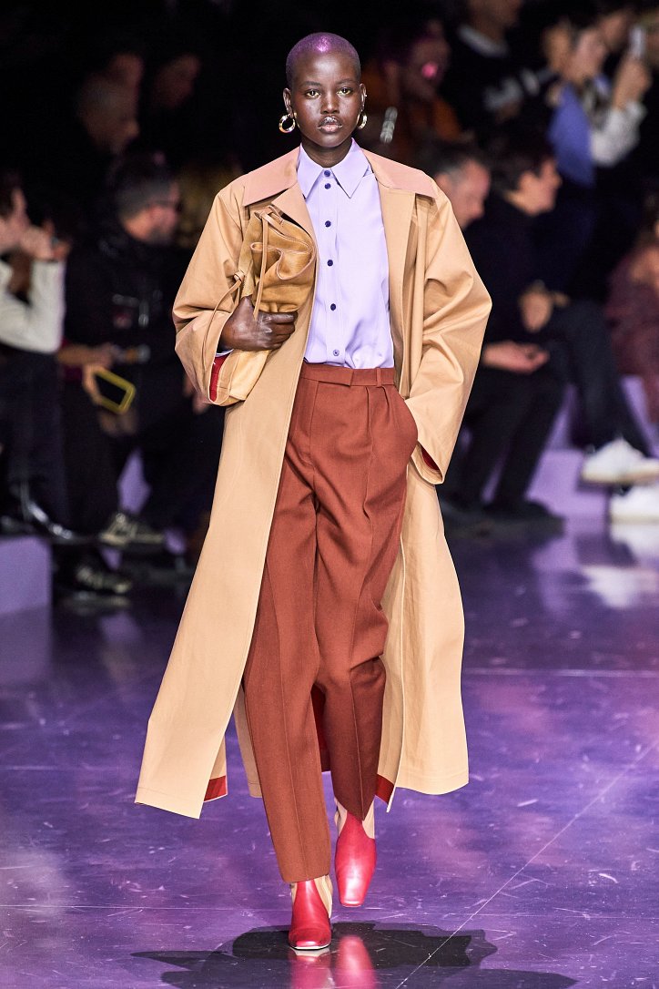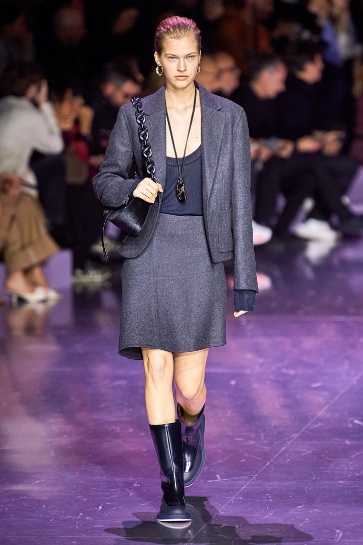 Тон был задан еще до начала дефиле: пол зала, где проходил показ, был застлан фиолетовым ковром, а гости в ожидании шоу потягивали лиловый смузи. Так что традиционные для бренда черный, серый, темно-синий (они, конечно, же тоже никуда не делись) стали фоном для моделей в бледно-фиолетовых тонах. Добавил дизайнер в коллекцию и теплых ноток – в виде оттенка ржавчины и вкраплений ярко-оранжевого, и текстуры – в виде изогнутых полос и необычного принта «под зебру».