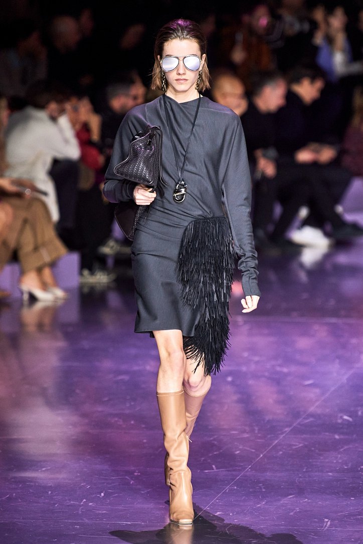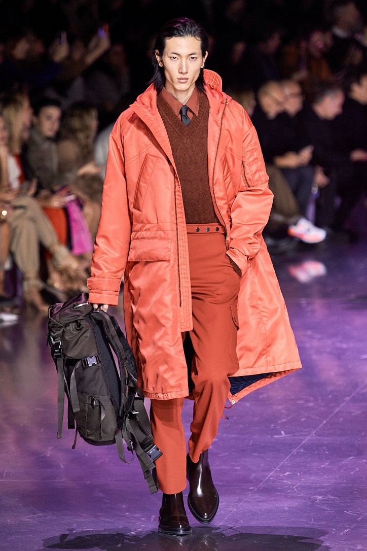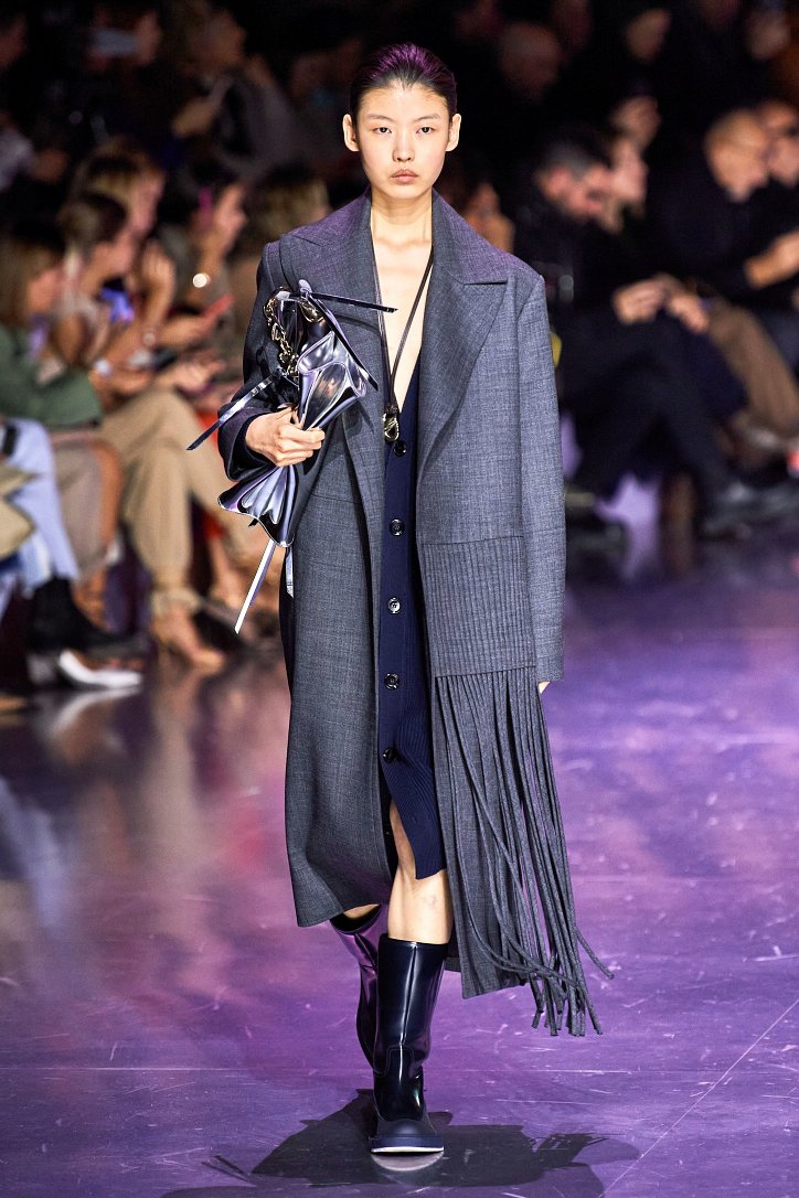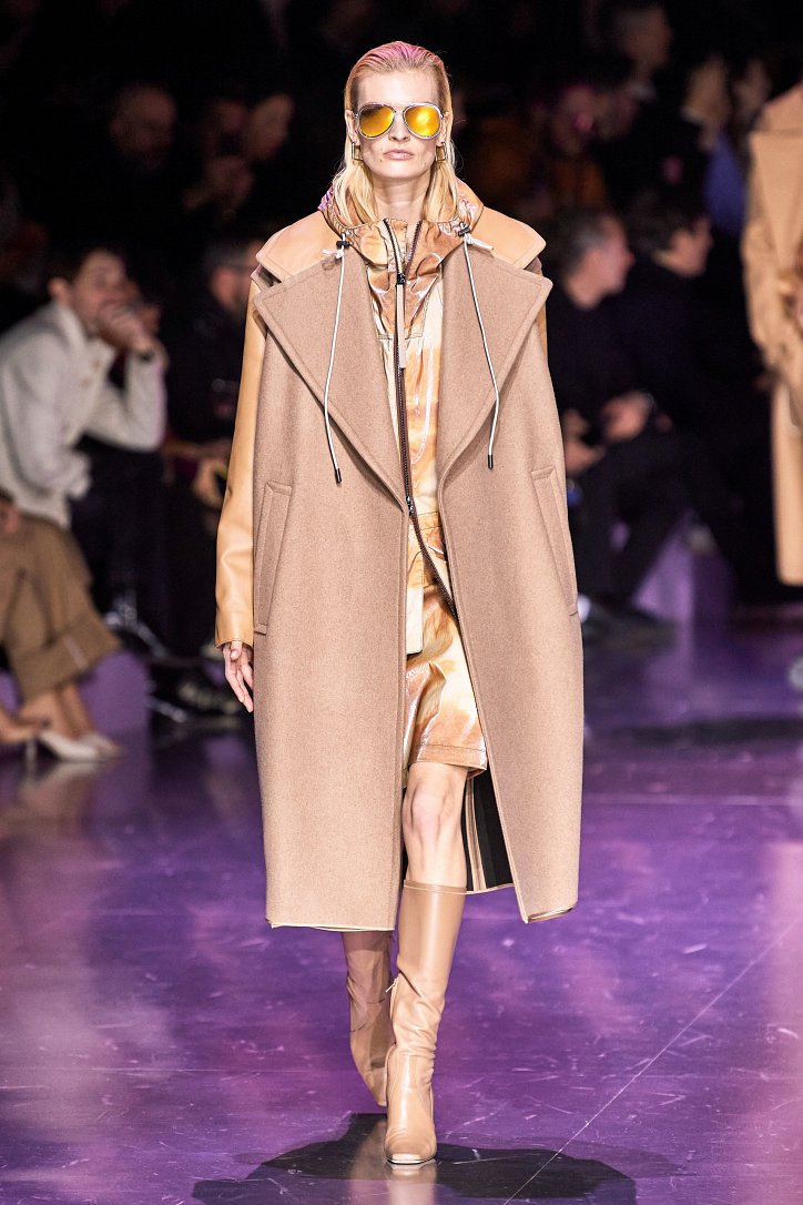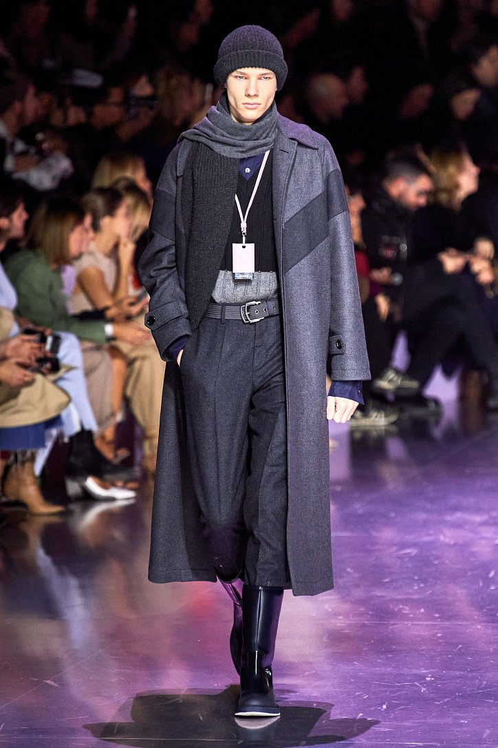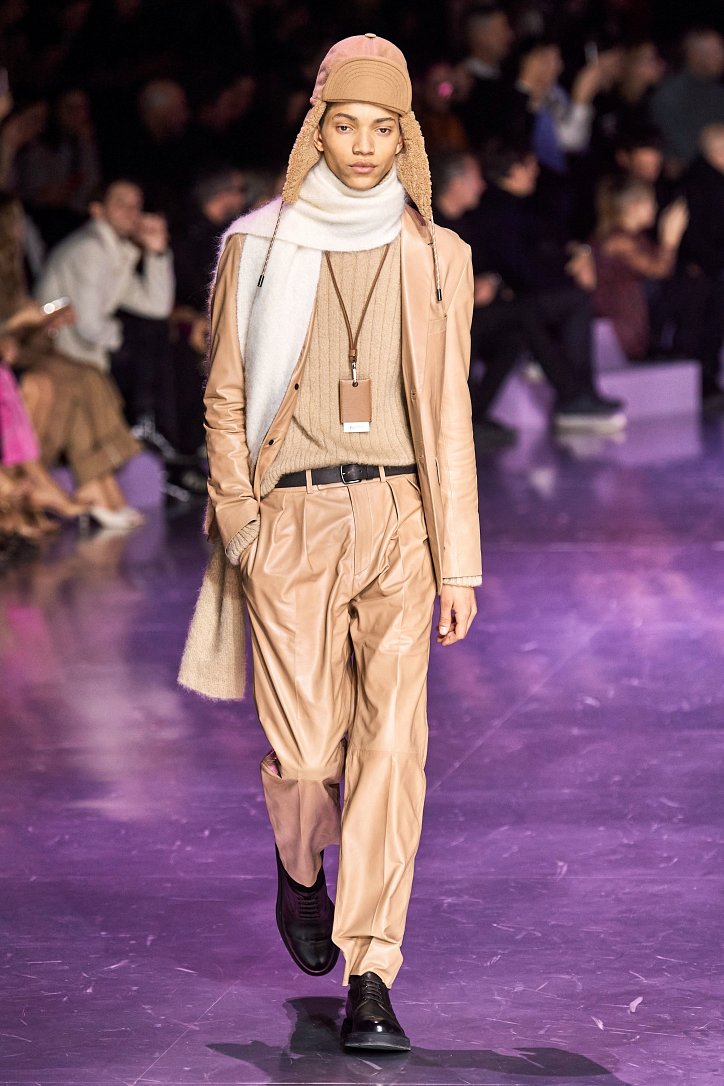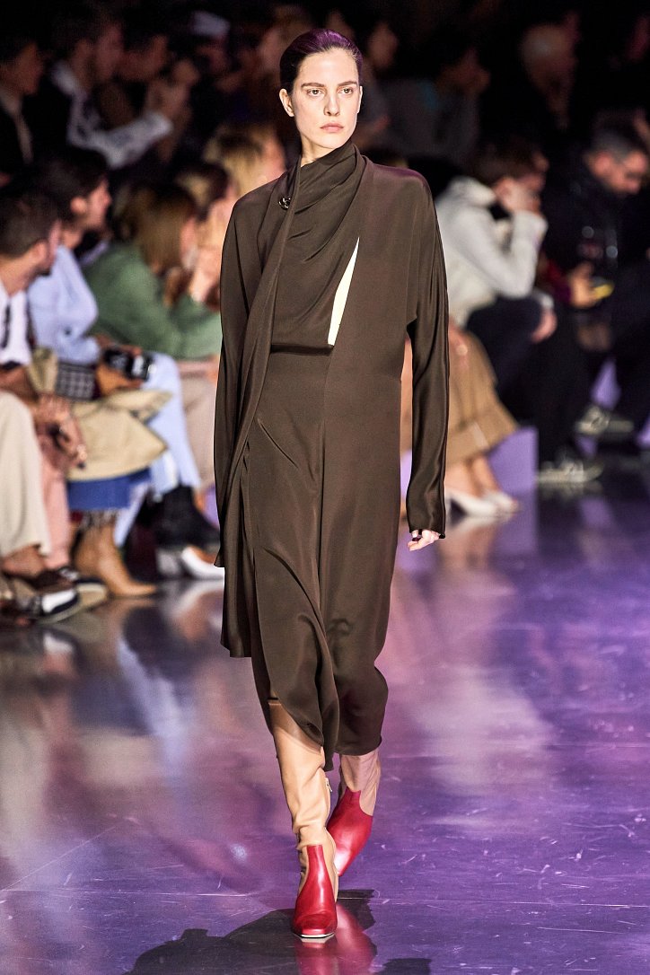 Тон был задан еще до начала дефиле: пол зала, где проходил показ, был застлан фиолетовым ковром, а гости в ожидании шоу потягивали лиловый смузи. Так что традиционные для бренда черный, серый, темно-синий (они, конечно, же тоже никуда не делись) стали фоном для моделей в бледно-фиолетовых тонах. Добавил дизайнер в коллекцию и теплых ноток – в виде оттенка ржавчины и вкраплений ярко-оранжевого, и текстуры – в виде изогнутых полос и необычного принта «под зебру».