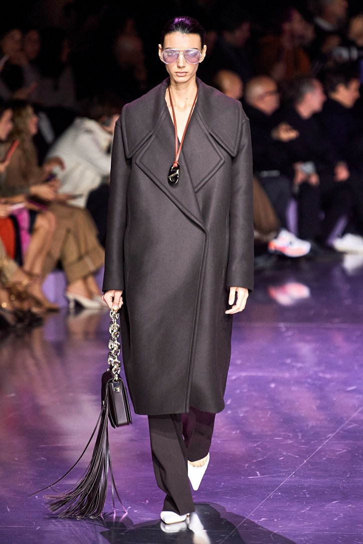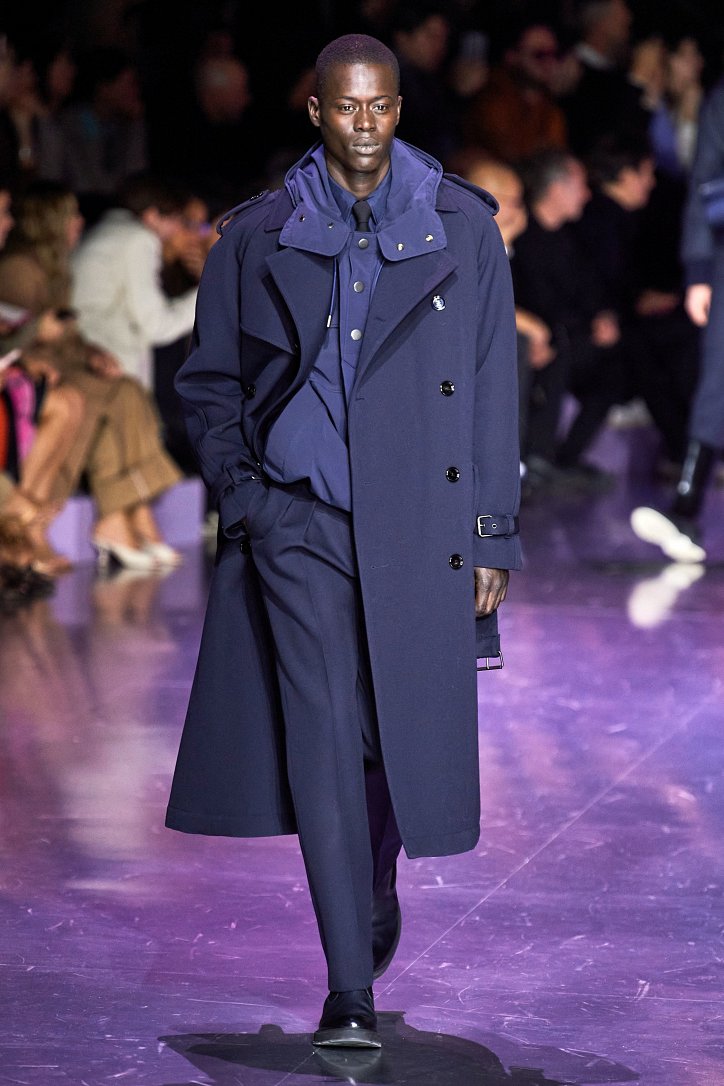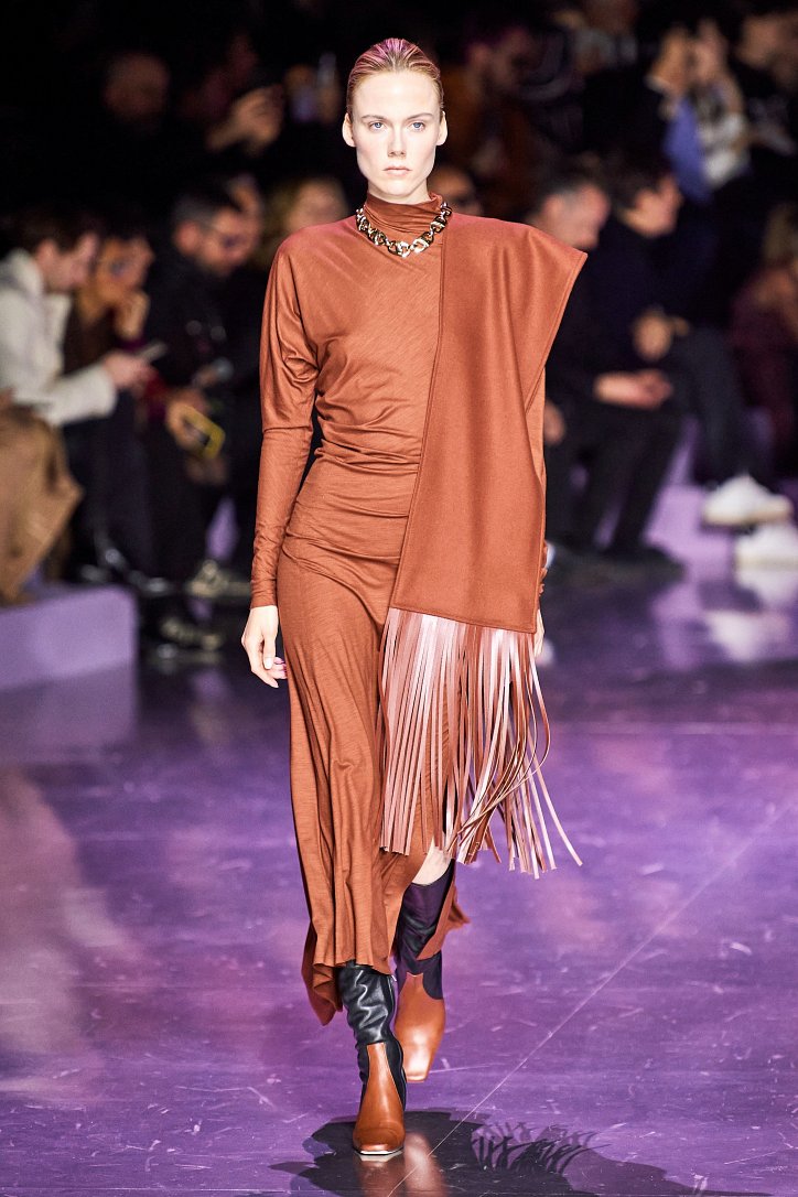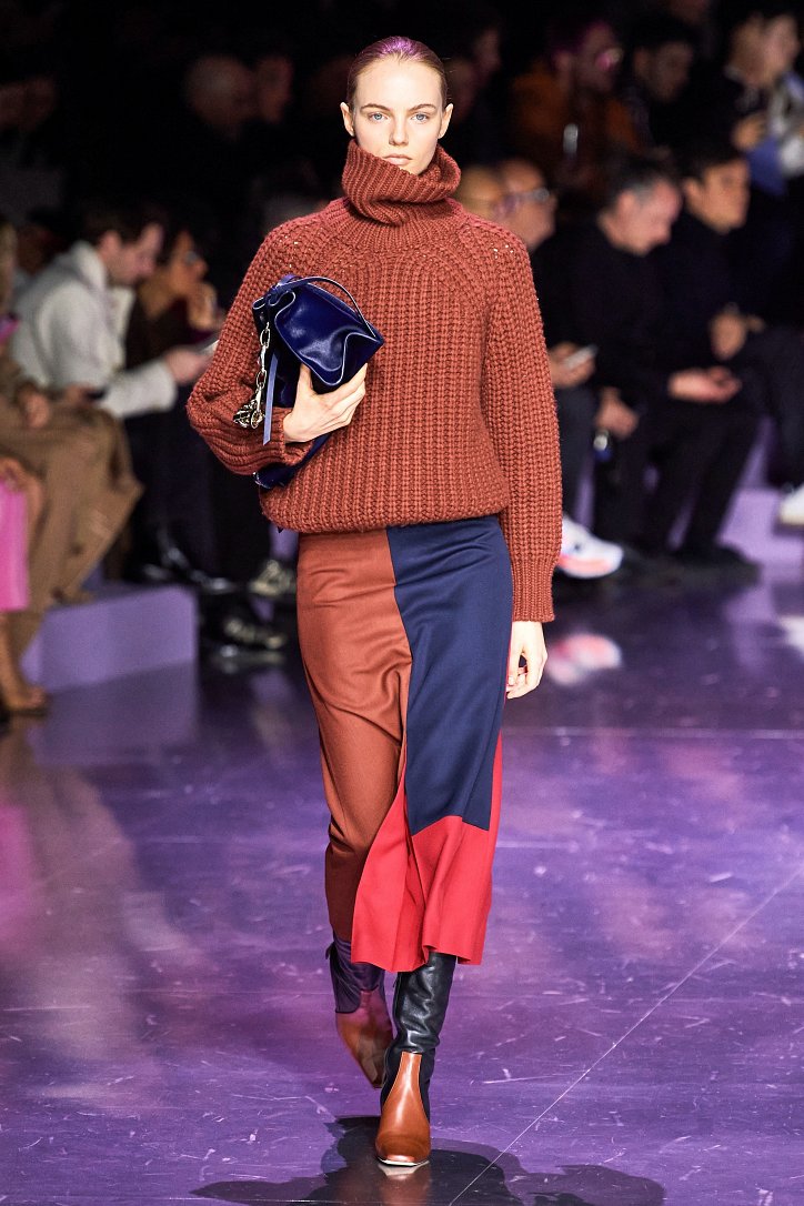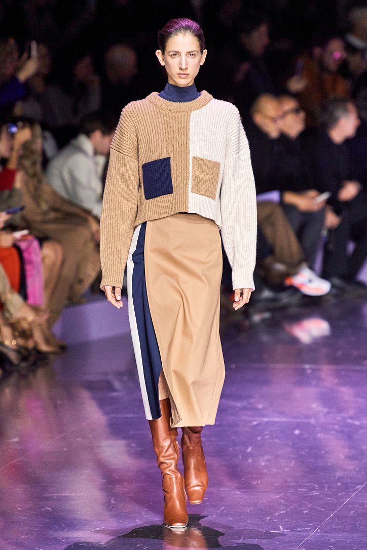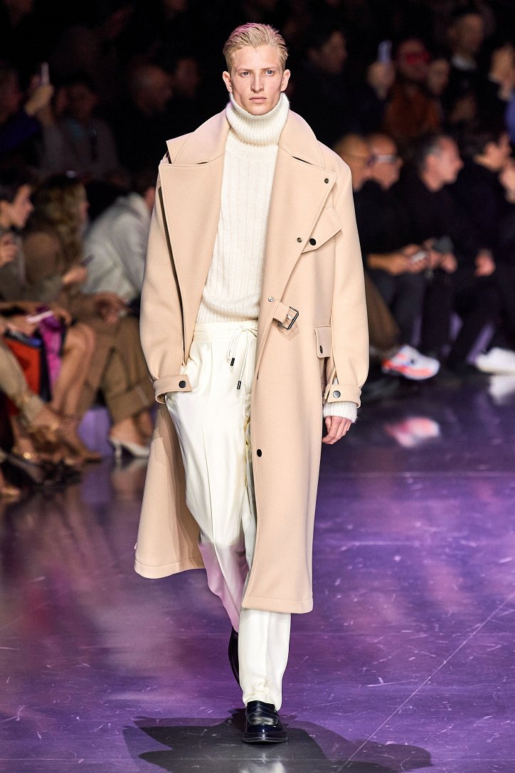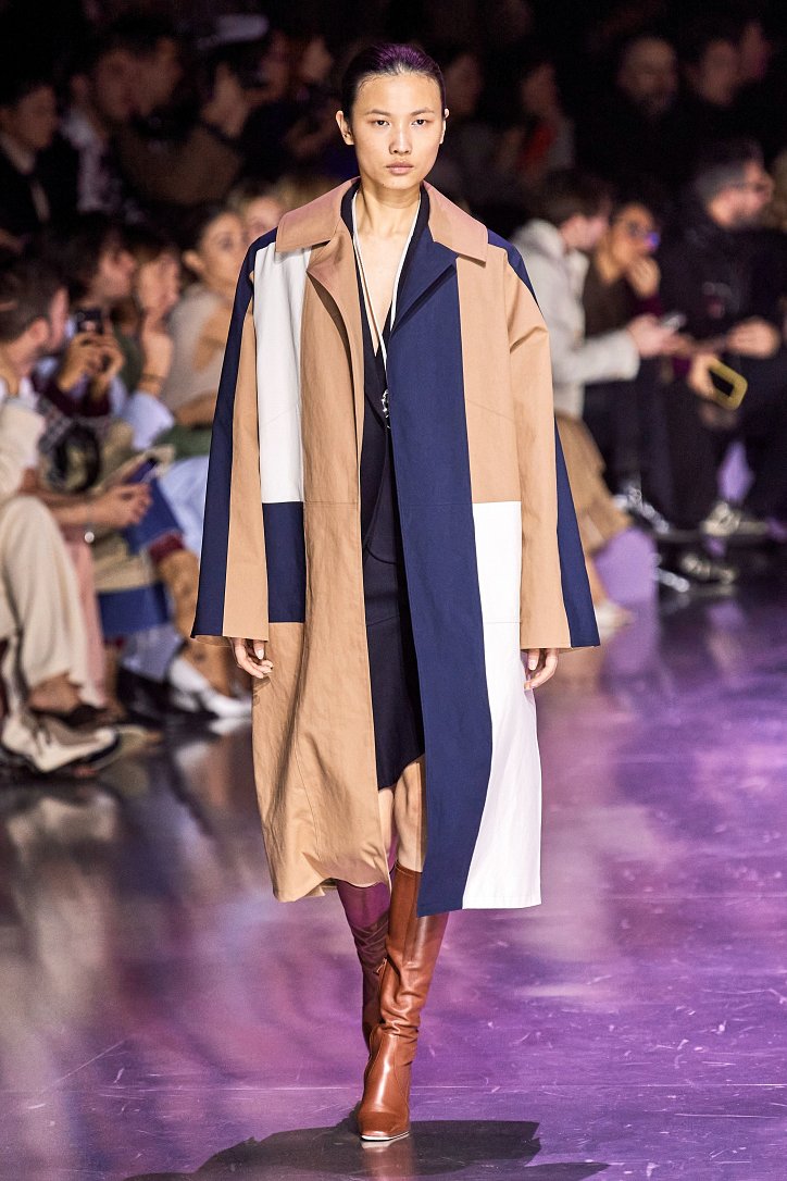 Тон был задан еще до начала дефиле: пол зала, где проходил показ, был застлан фиолетовым ковром, а гости в ожидании шоу потягивали лиловый смузи. Так что традиционные для бренда черный, серый, темно-синий (они, конечно, же тоже никуда не делись) стали фоном для моделей в бледно-фиолетовых тонах. Добавил дизайнер в коллекцию и теплых ноток – в виде оттенка ржавчины и вкраплений ярко-оранжевого, и текстуры – в виде изогнутых полос и необычного принта «под зебру».