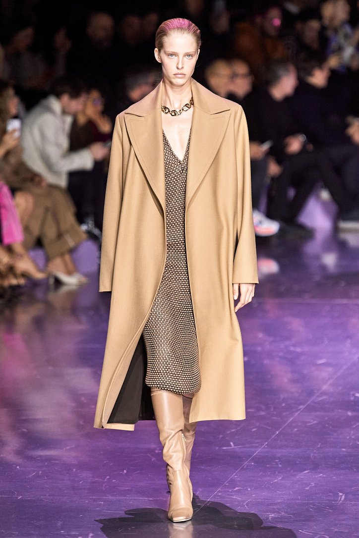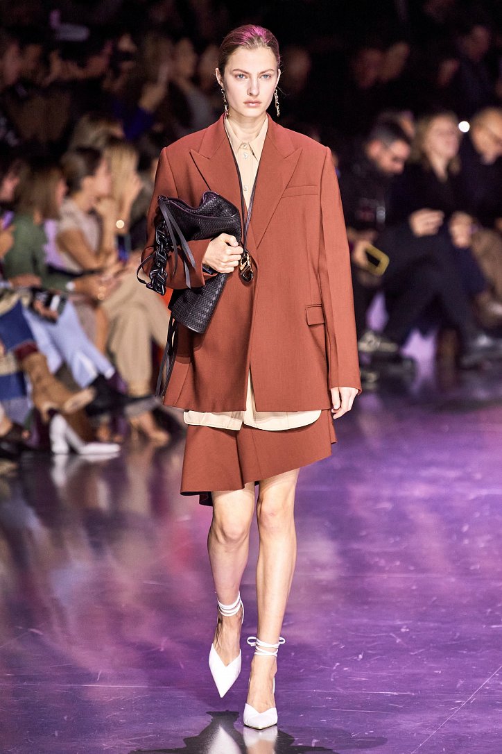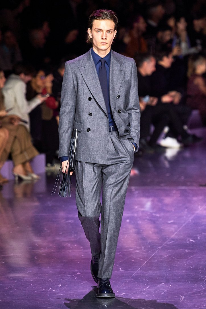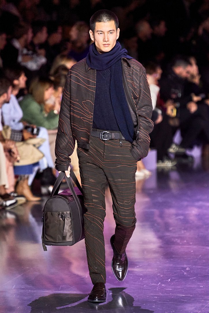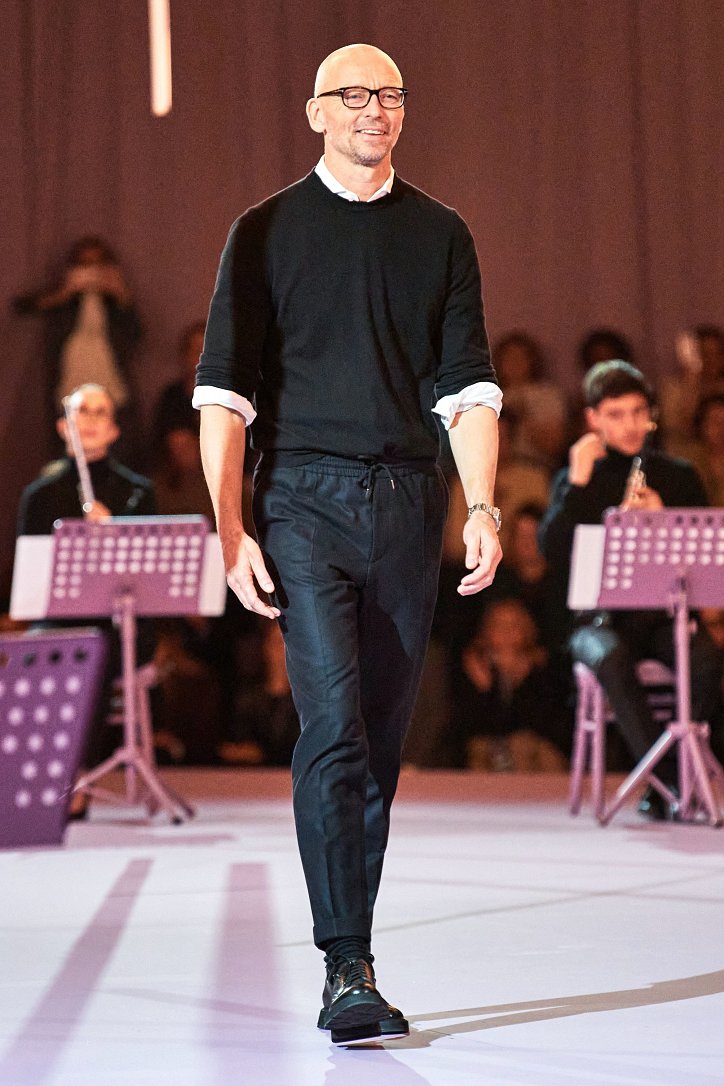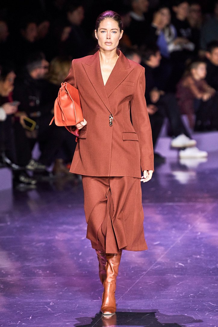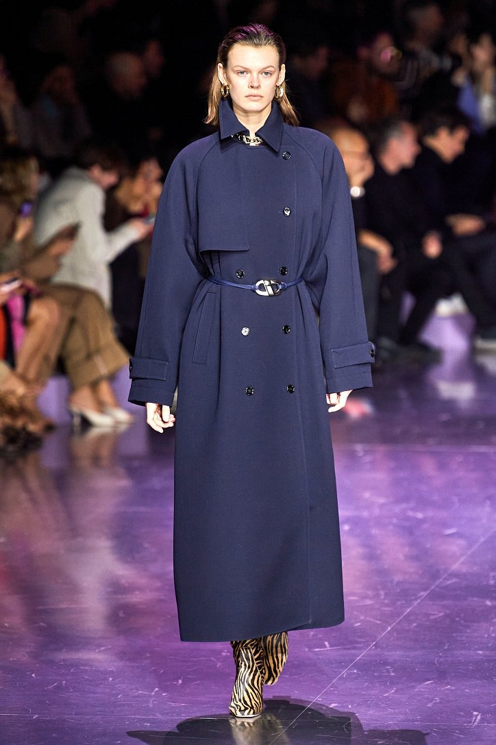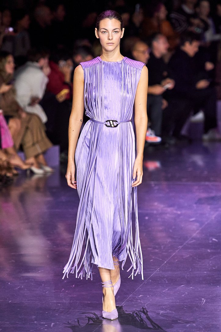 Тон был задан еще до начала дефиле: пол зала, где проходил показ, был застлан фиолетовым ковром, а гости в ожидании шоу потягивали лиловый смузи. Так что традиционные для бренда черный, серый, темно-синий (они, конечно, же тоже никуда не делись) стали фоном для моделей в бледно-фиолетовых тонах. Добавил дизайнер в коллекцию и теплых ноток – в виде оттенка ржавчины и вкраплений ярко-оранжевого, и текстуры – в виде изогнутых полос и необычного принта «под зебру».