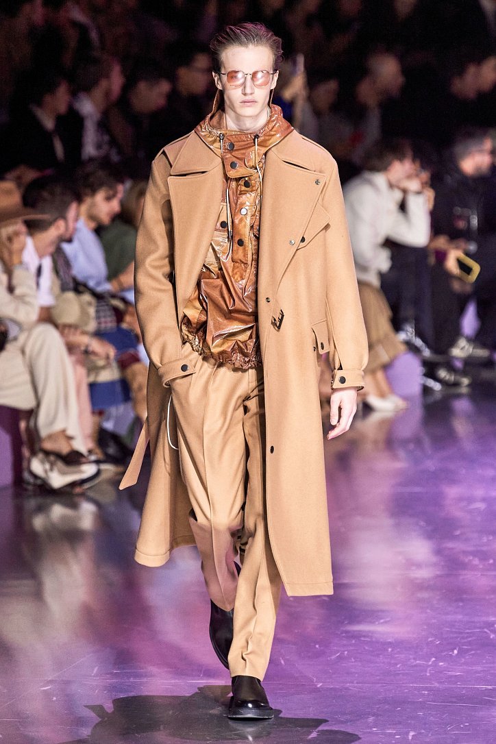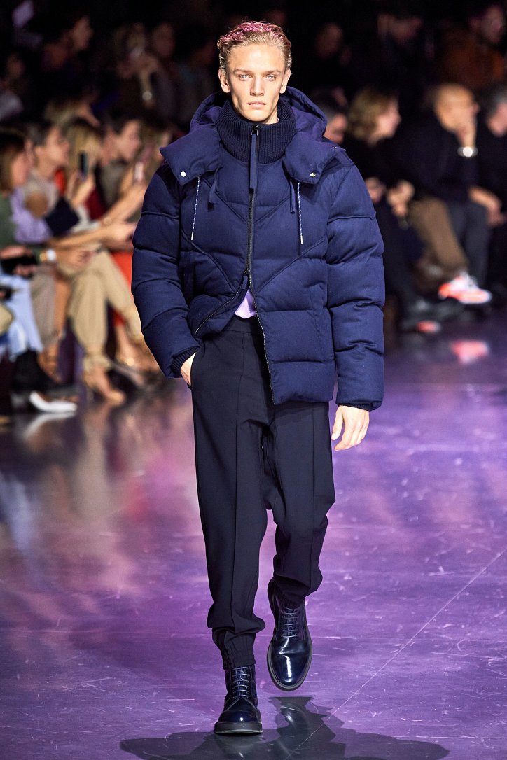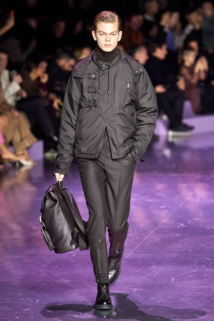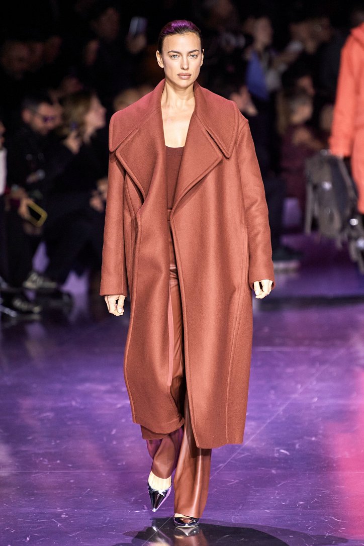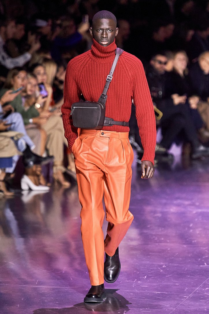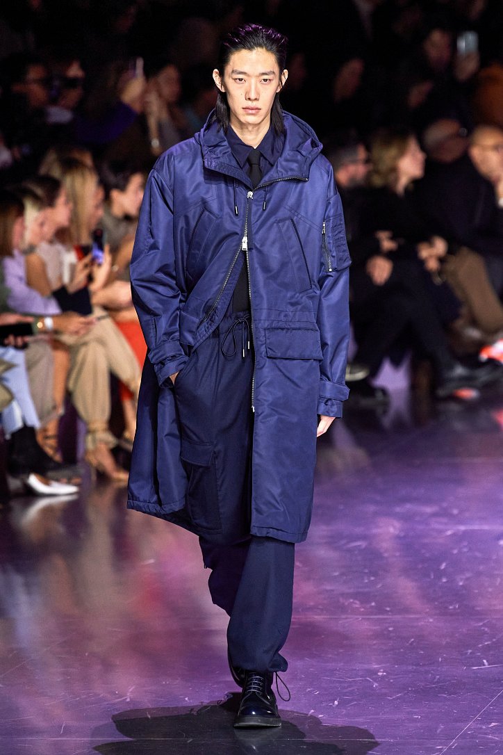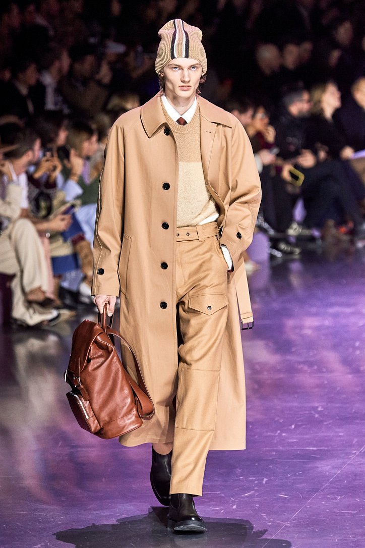 Тон был задан еще до начала дефиле: пол зала, где проходил показ, был застлан фиолетовым ковром, а гости в ожидании шоу потягивали лиловый смузи. Так что традиционные для бренда черный, серый, темно-синий (они, конечно, же тоже никуда не делись) стали фоном для моделей в бледно-фиолетовых тонах. Добавил дизайнер в коллекцию и теплых ноток – в виде оттенка ржавчины и вкраплений ярко-оранжевого, и текстуры – в виде изогнутых полос и необычного принта «под зебру».