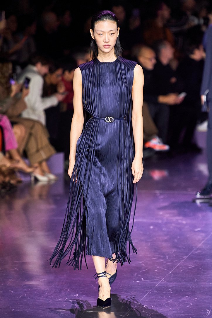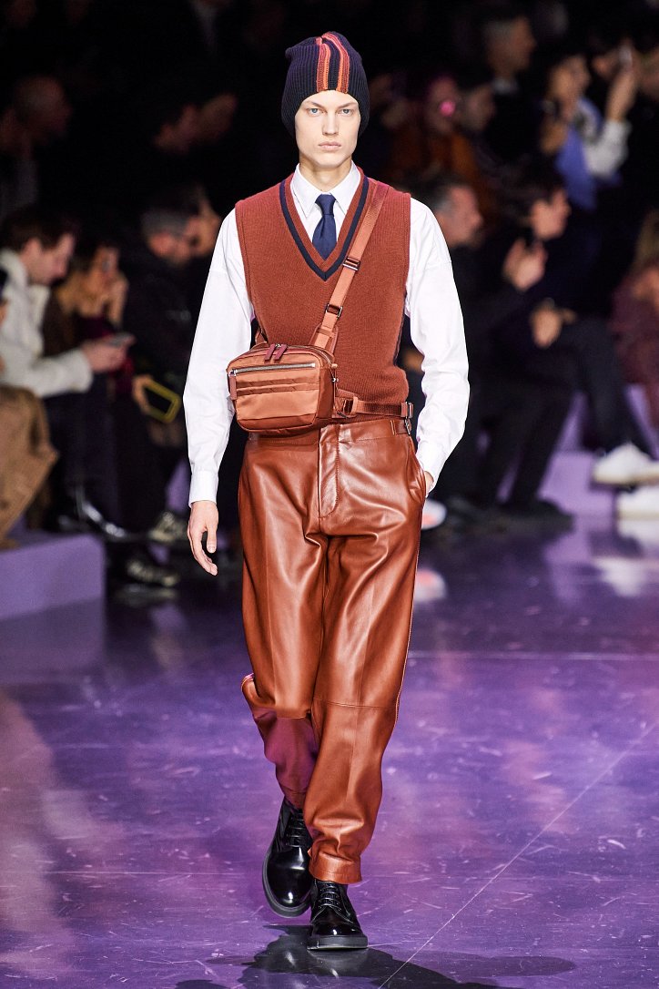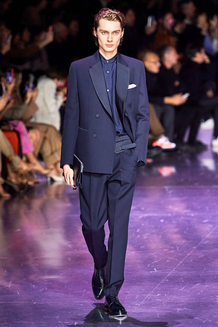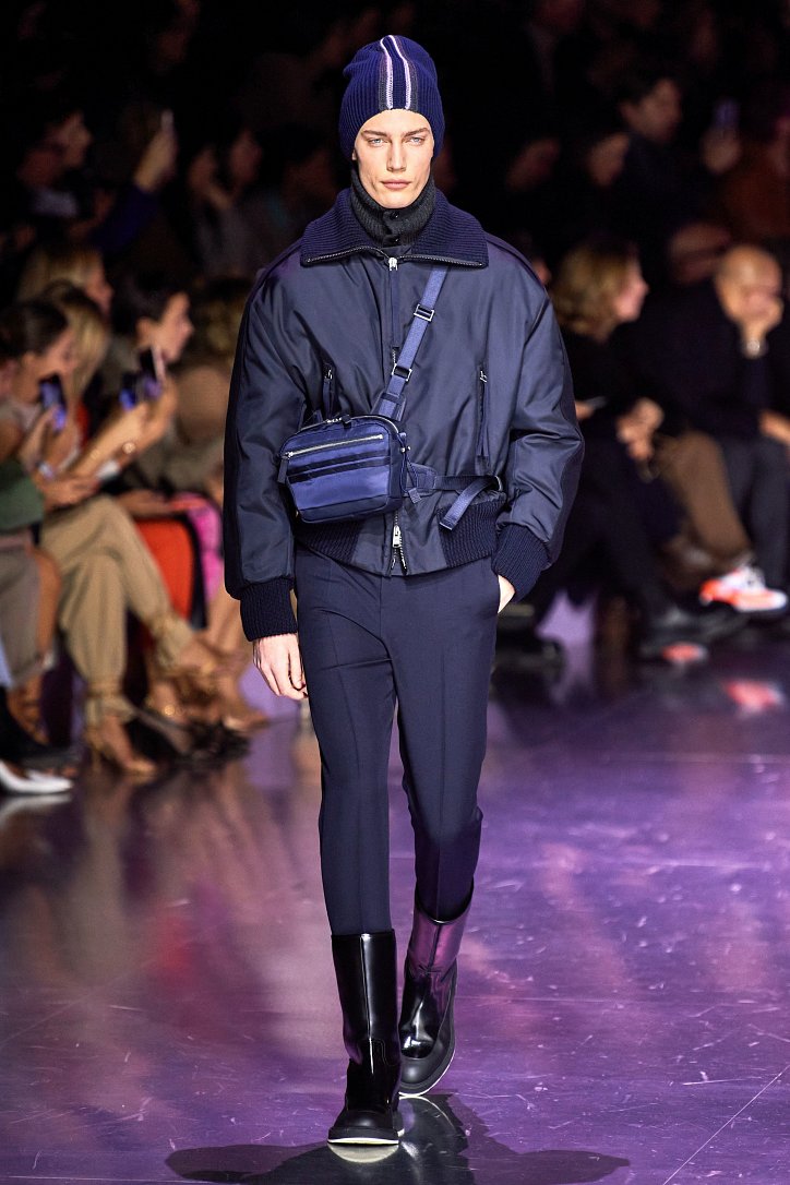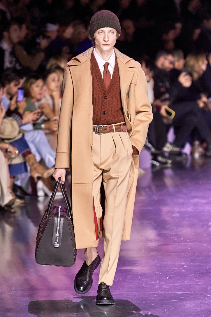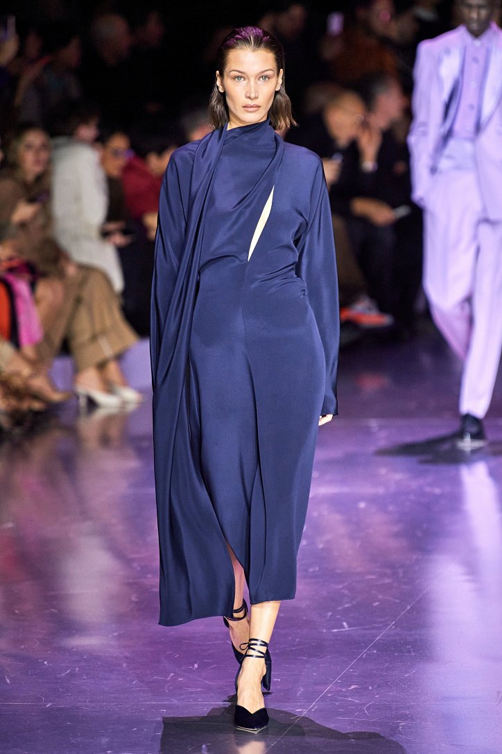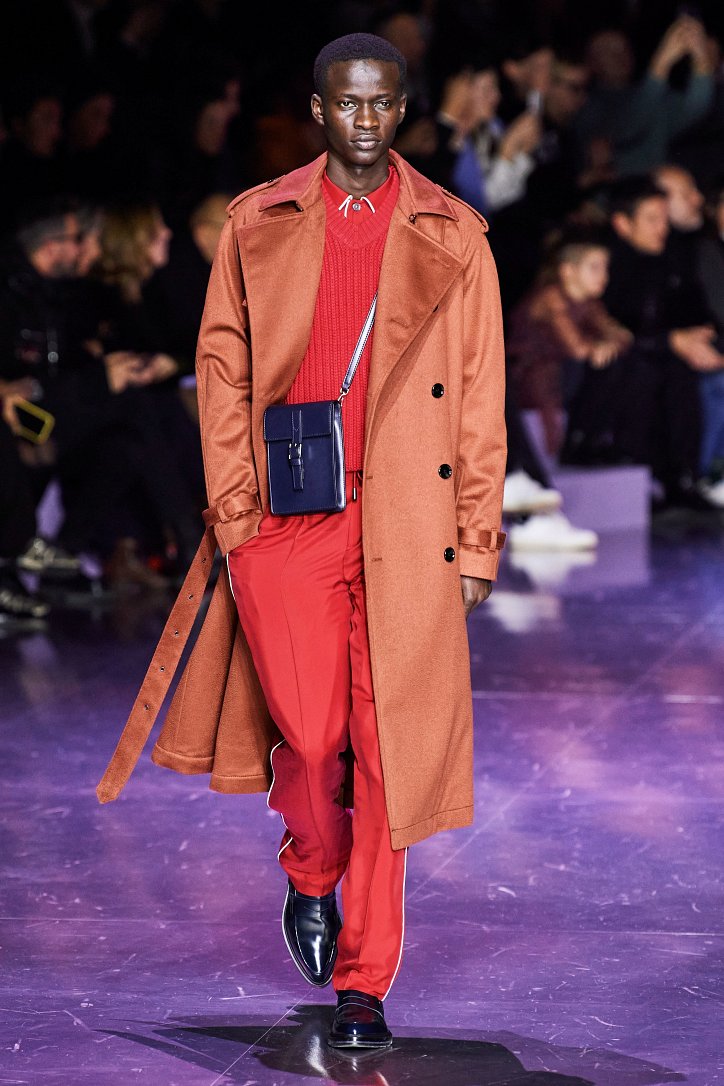 Тон был задан еще до начала дефиле: пол зала, где проходил показ, был застлан фиолетовым ковром, а гости в ожидании шоу потягивали лиловый смузи. Так что традиционные для бренда черный, серый, темно-синий (они, конечно, же тоже никуда не делись) стали фоном для моделей в бледно-фиолетовых тонах. Добавил дизайнер в коллекцию и теплых ноток – в виде оттенка ржавчины и вкраплений ярко-оранжевого, и текстуры – в виде изогнутых полос и необычного принта «под зебру».
