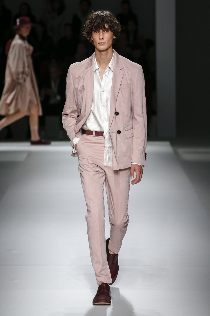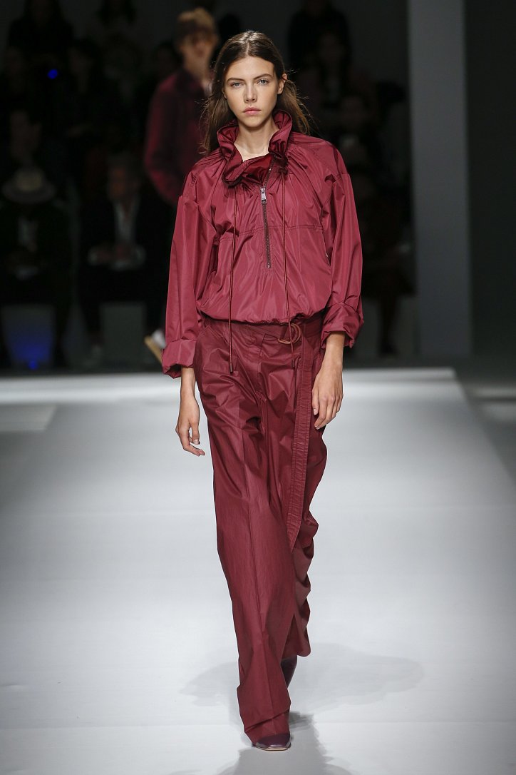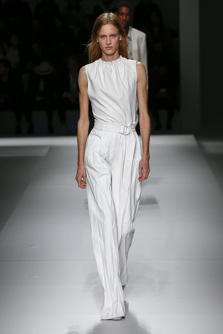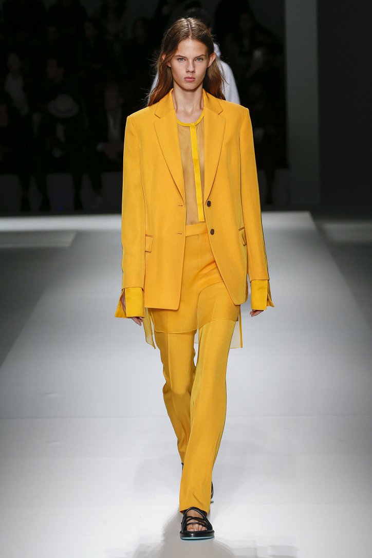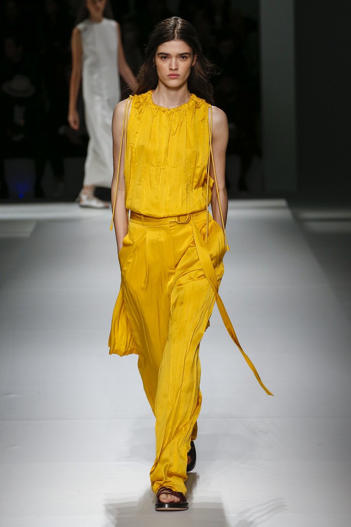 Ближе к концу показа появились, наконец-то, и брючные костюмы и немного ярких «мазков» желтого цвета (вся остальная часть коллекции выдержана в спокойной цветовой гамме с преобладанием белого, бежево-пудрового, красно-коричневого, серого и темно-синего цветов).