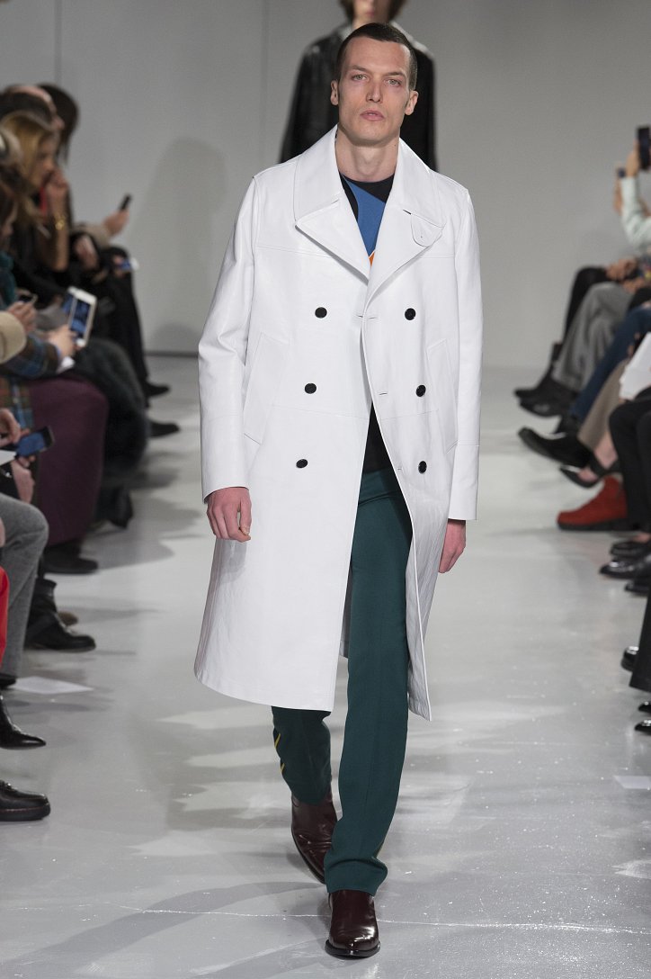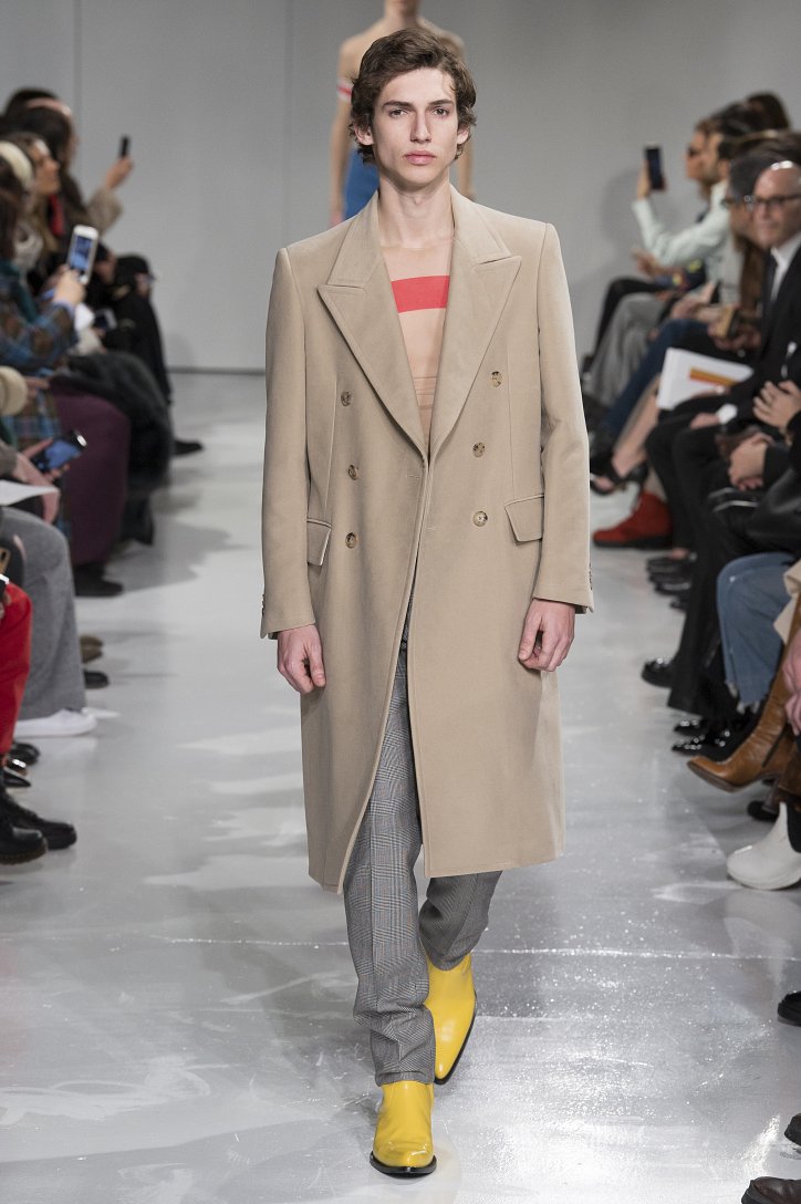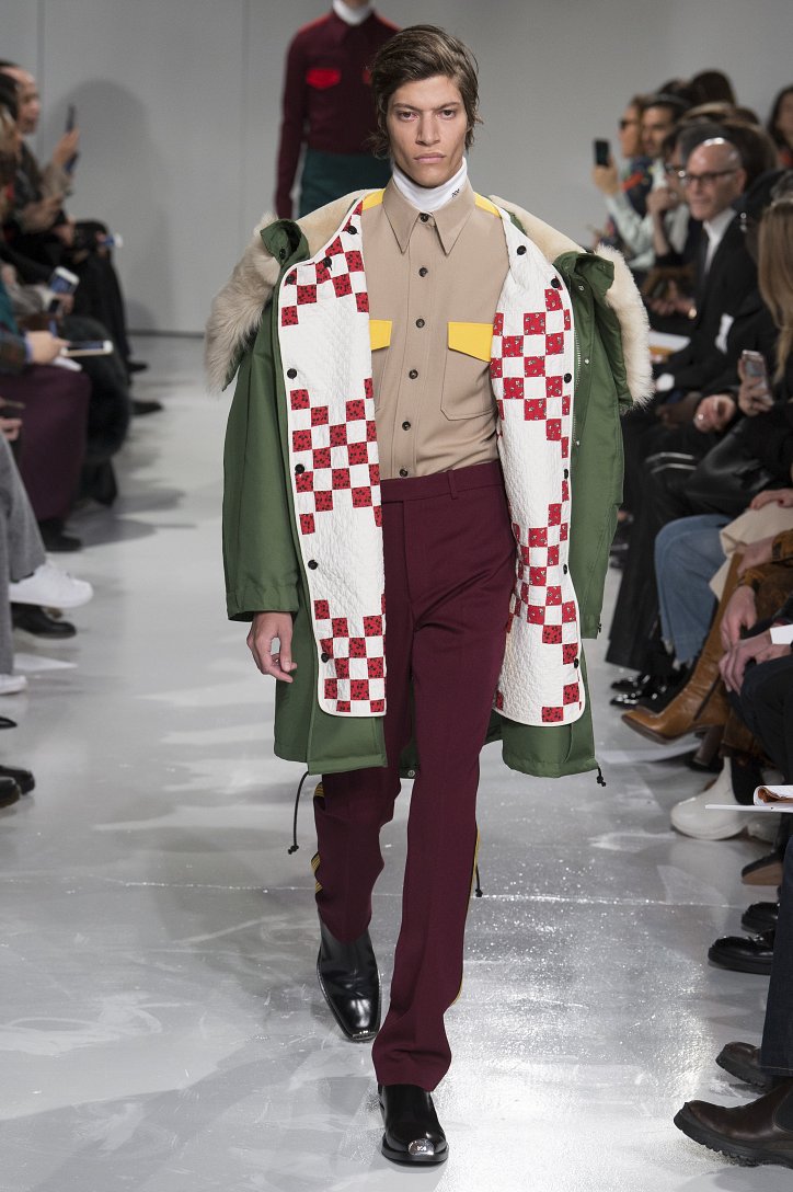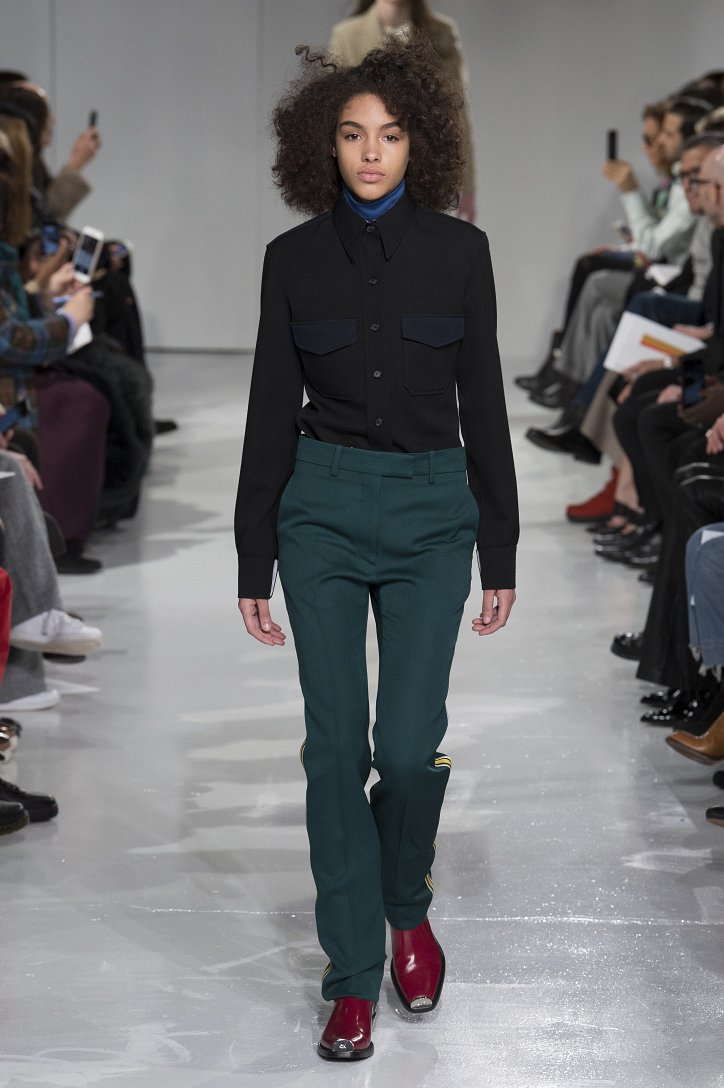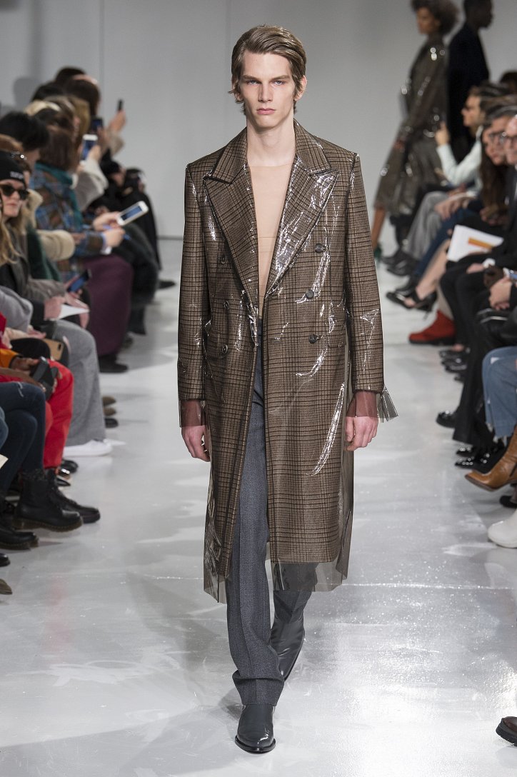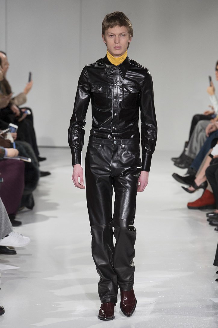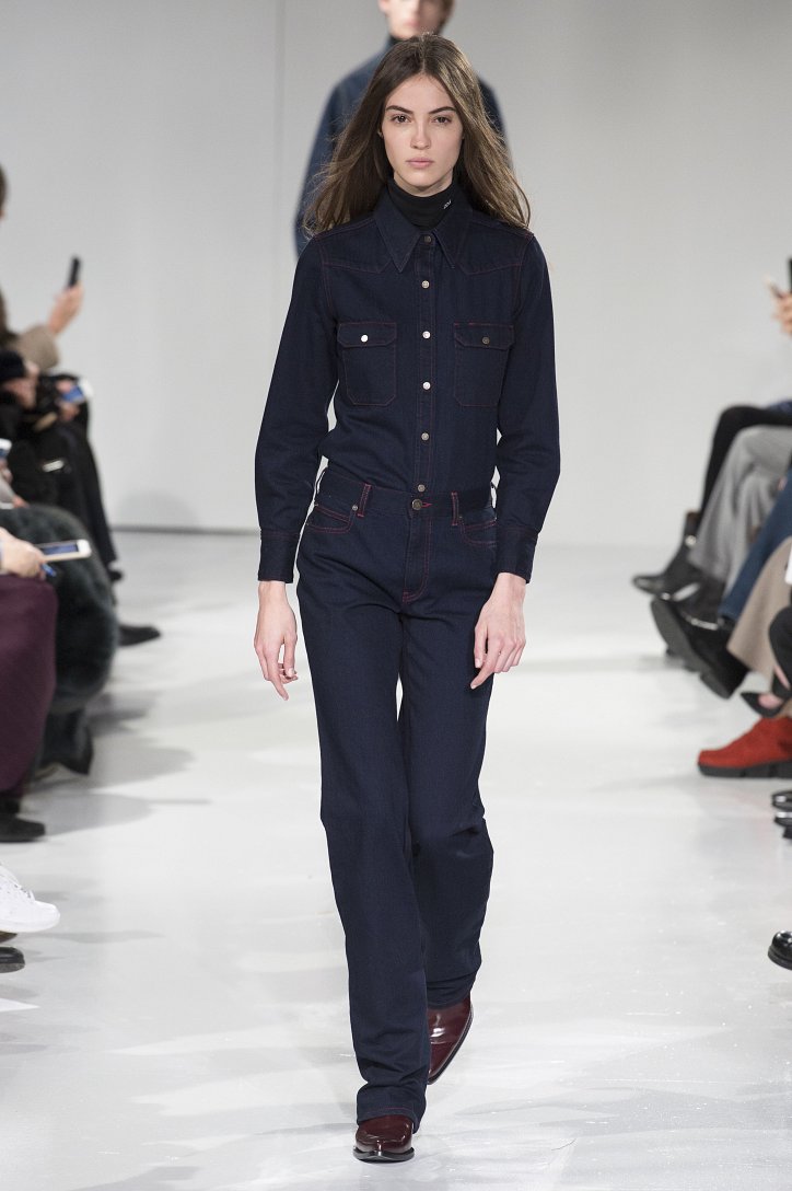 Шоу Calvin Klein осень-зима 2017-2018 вполне можно назвать «Одой Америке»: коллекция, словно мозаика, очень эклектична. Она, по словам дизайнера, отражает разные эпохи, разные стили и образы. Так, виниловые плащи и платья – это напоминание об поп-арте и Энди Уорхоле, джинсовые тотал-луки – реверанс в сторону традиций Calvin Klein, ковбойские сапоги и флаг США в виде принта – дань американской культуре. В целом же коллекция получилась «очень унисекс»: мужские образы чередовались с женскими, при этом одежда была практически идентичной – прозрачные топы, пальто прямого кроя, свободные брючные костюмы, комплекты из кожи и денима.