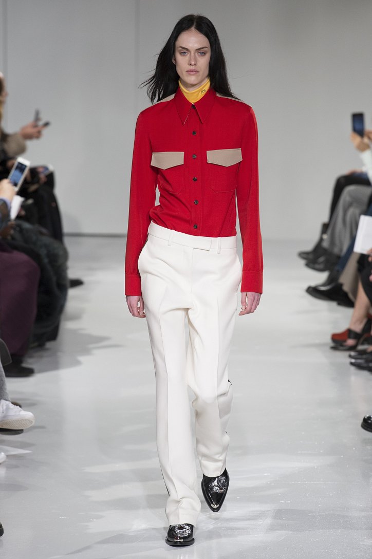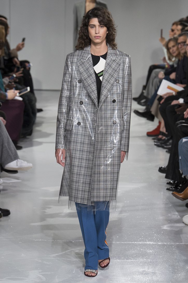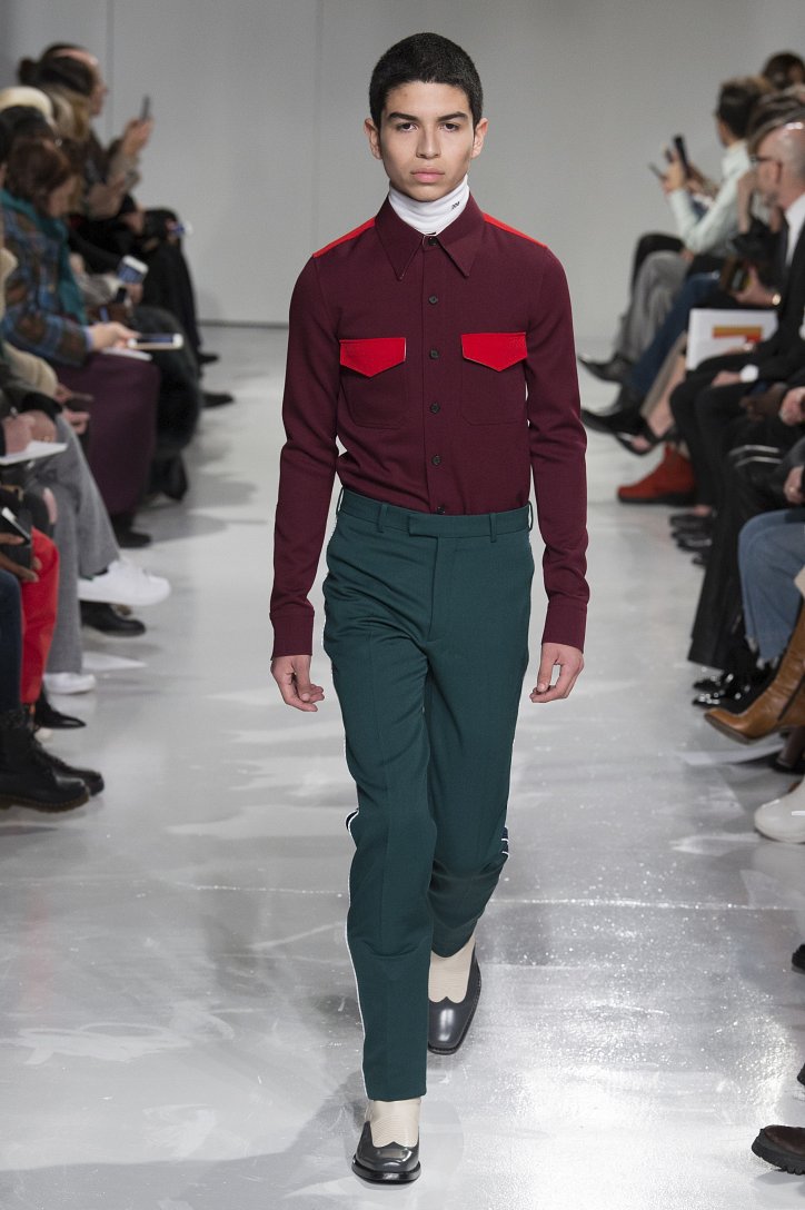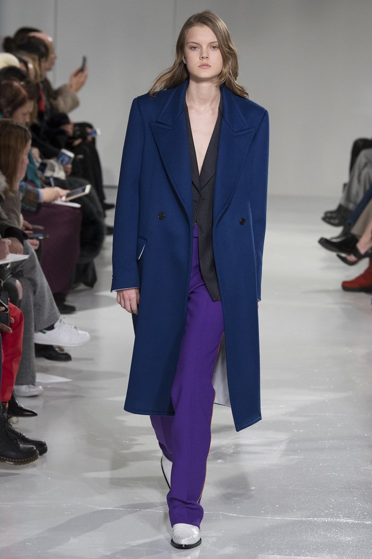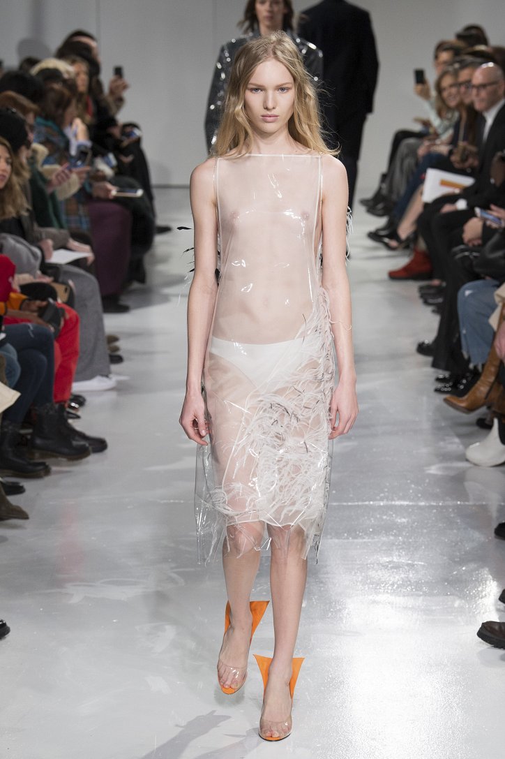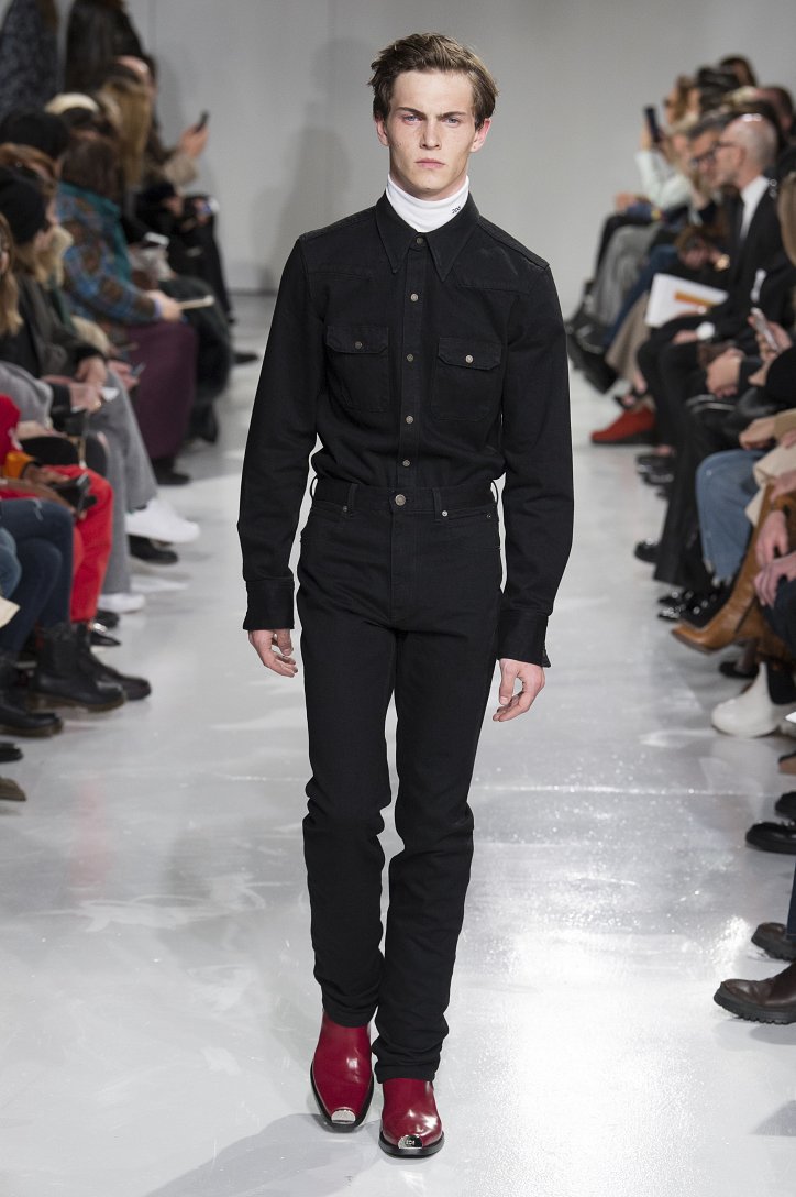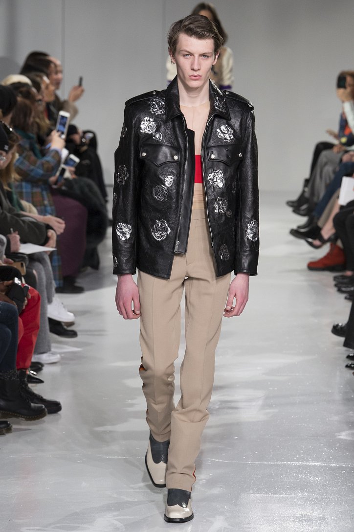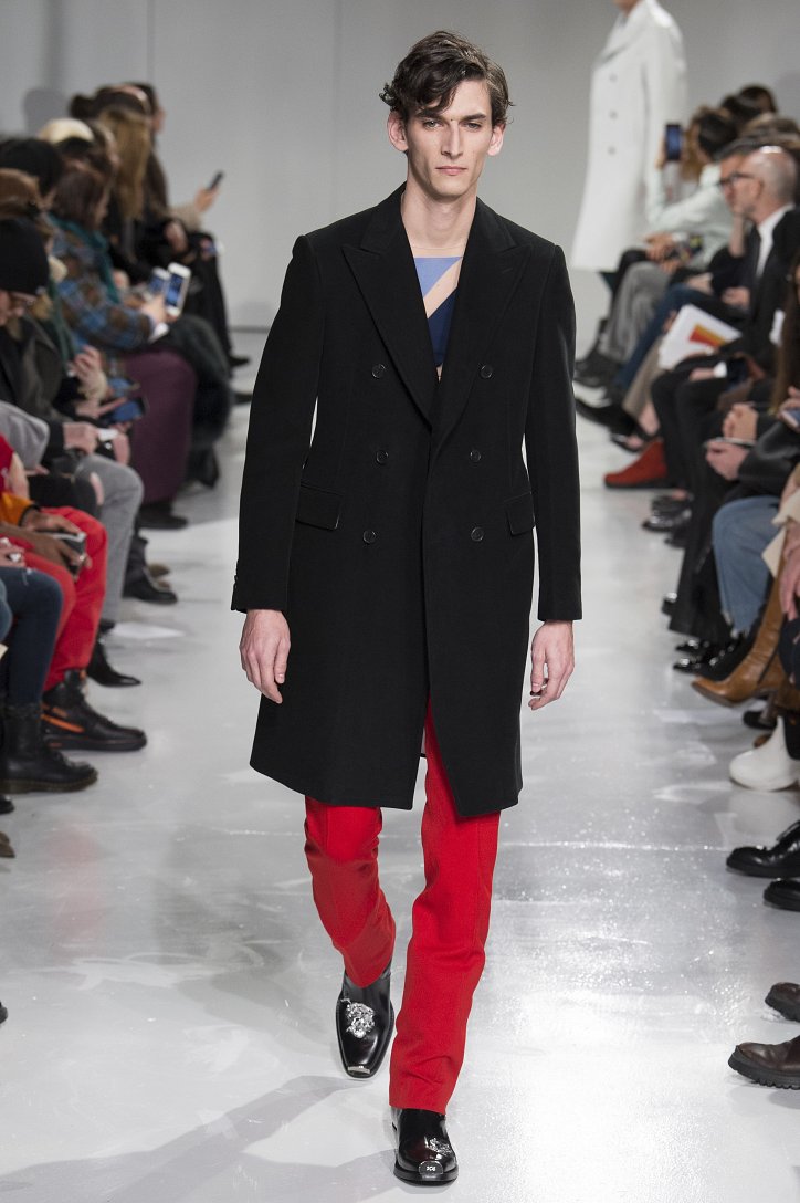 Шоу Calvin Klein осень-зима 2017-2018 вполне можно назвать «Одой Америке»: коллекция, словно мозаика, очень эклектична. Она, по словам дизайнера, отражает разные эпохи, разные стили и образы. Так, виниловые плащи и платья – это напоминание об поп-арте и Энди Уорхоле, джинсовые тотал-луки – реверанс в сторону традиций Calvin Klein, ковбойские сапоги и флаг США в виде принта – дань американской культуре. В целом же коллекция получилась «очень унисекс»: мужские образы чередовались с женскими, при этом одежда была практически идентичной – прозрачные топы, пальто прямого кроя, свободные брючные костюмы, комплекты из кожи и денима.