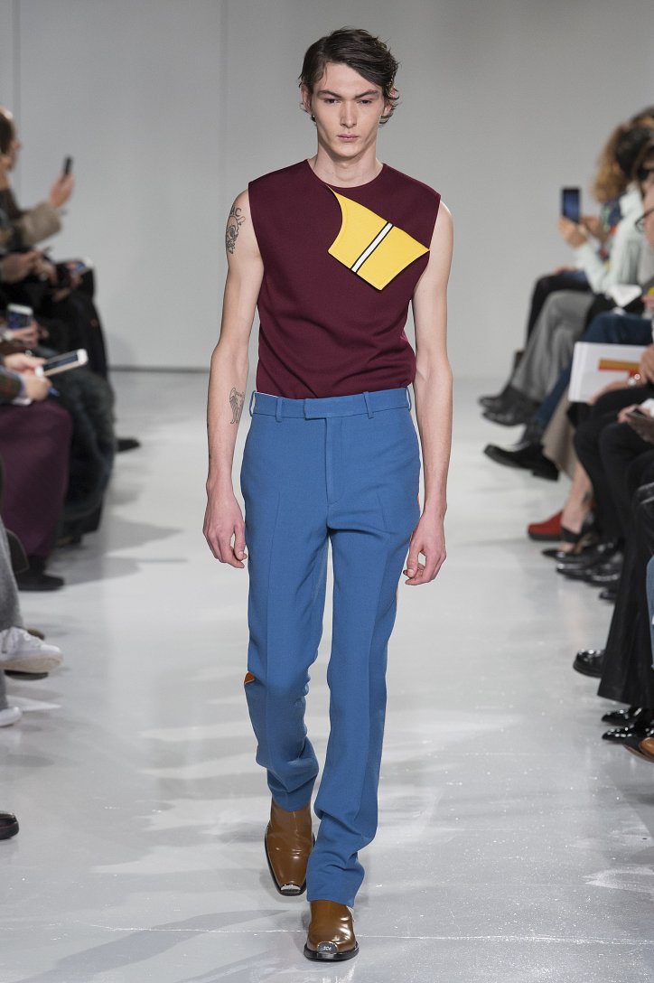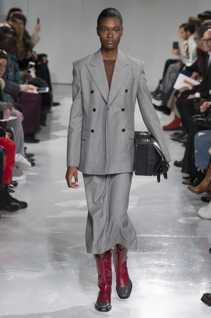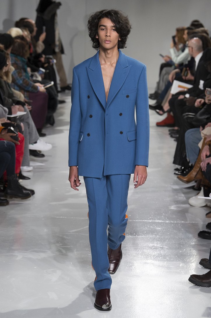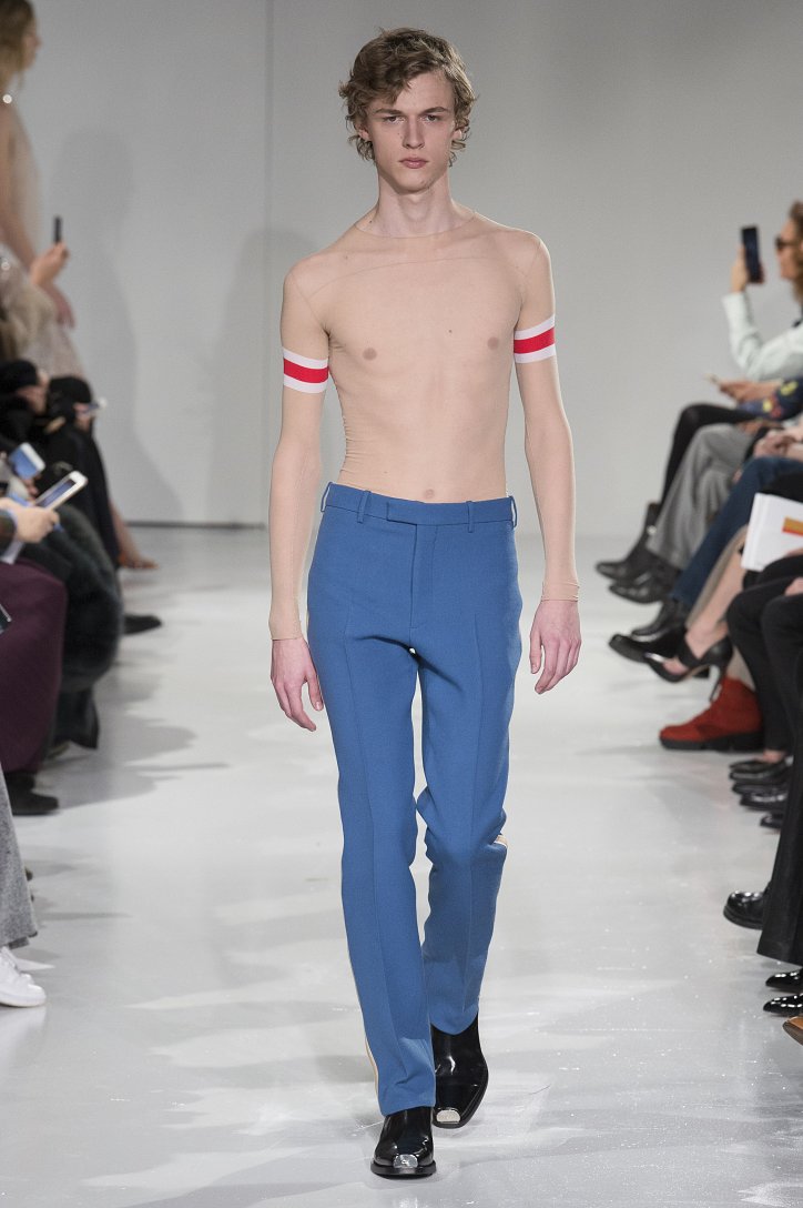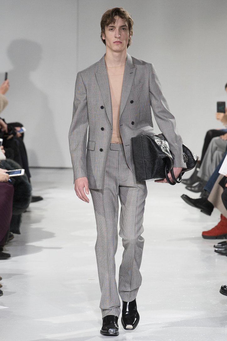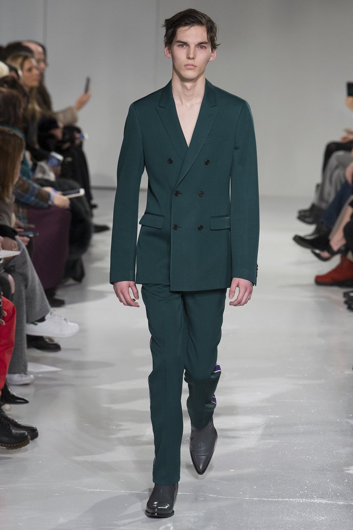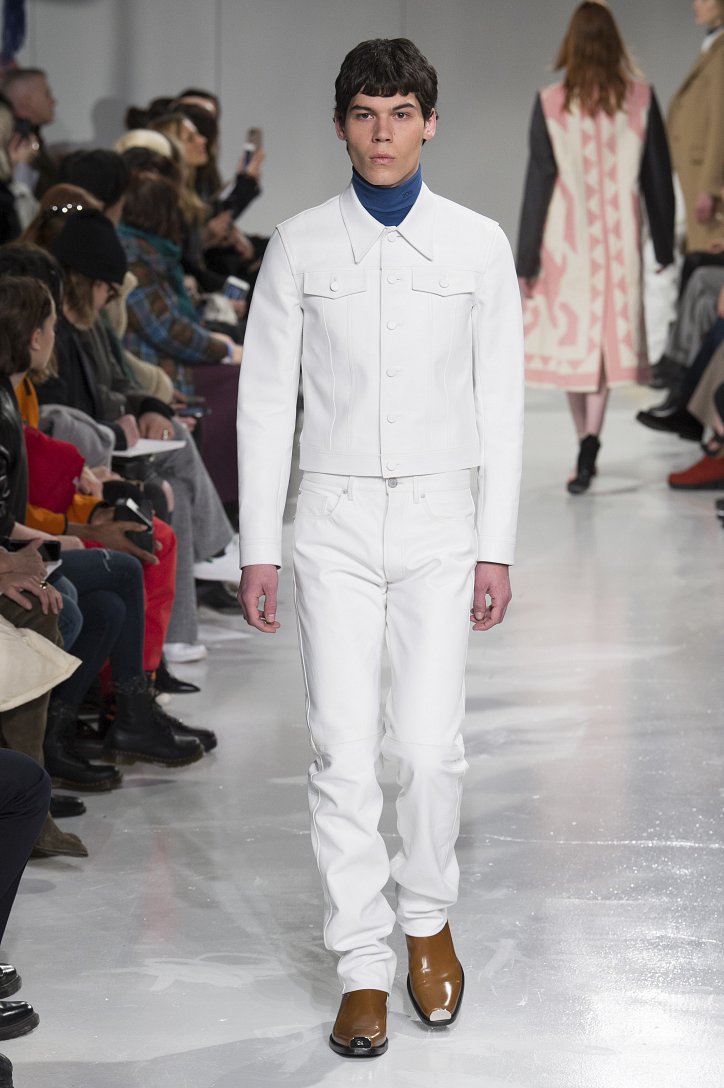 Шоу Calvin Klein осень-зима 2017-2018 вполне можно назвать «Одой Америке»: коллекция, словно мозаика, очень эклектична. Она, по словам дизайнера, отражает разные эпохи, разные стили и образы. Так, виниловые плащи и платья – это напоминание об поп-арте и Энди Уорхоле, джинсовые тотал-луки – реверанс в сторону традиций Calvin Klein, ковбойские сапоги и флаг США в виде принта – дань американской культуре. В целом же коллекция получилась «очень унисекс»: мужские образы чередовались с женскими, при этом одежда была практически идентичной – прозрачные топы, пальто прямого кроя, свободные брючные костюмы, комплекты из кожи и денима.