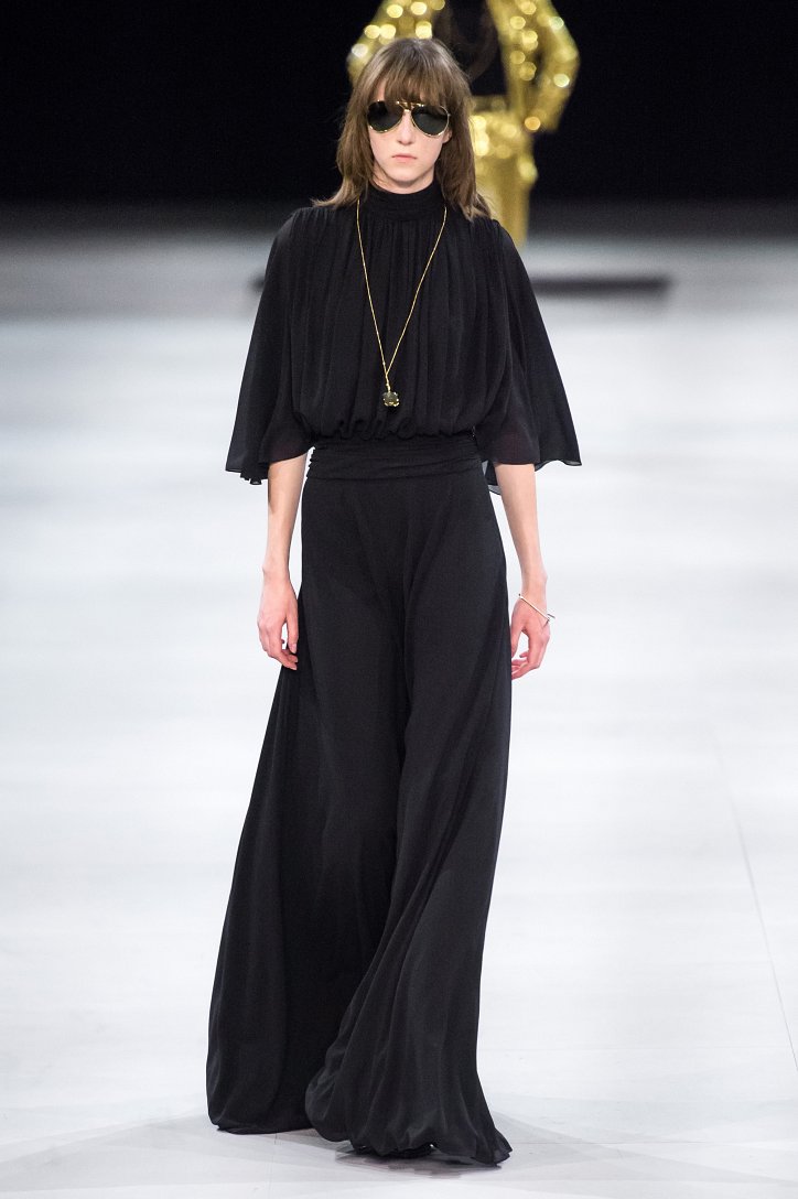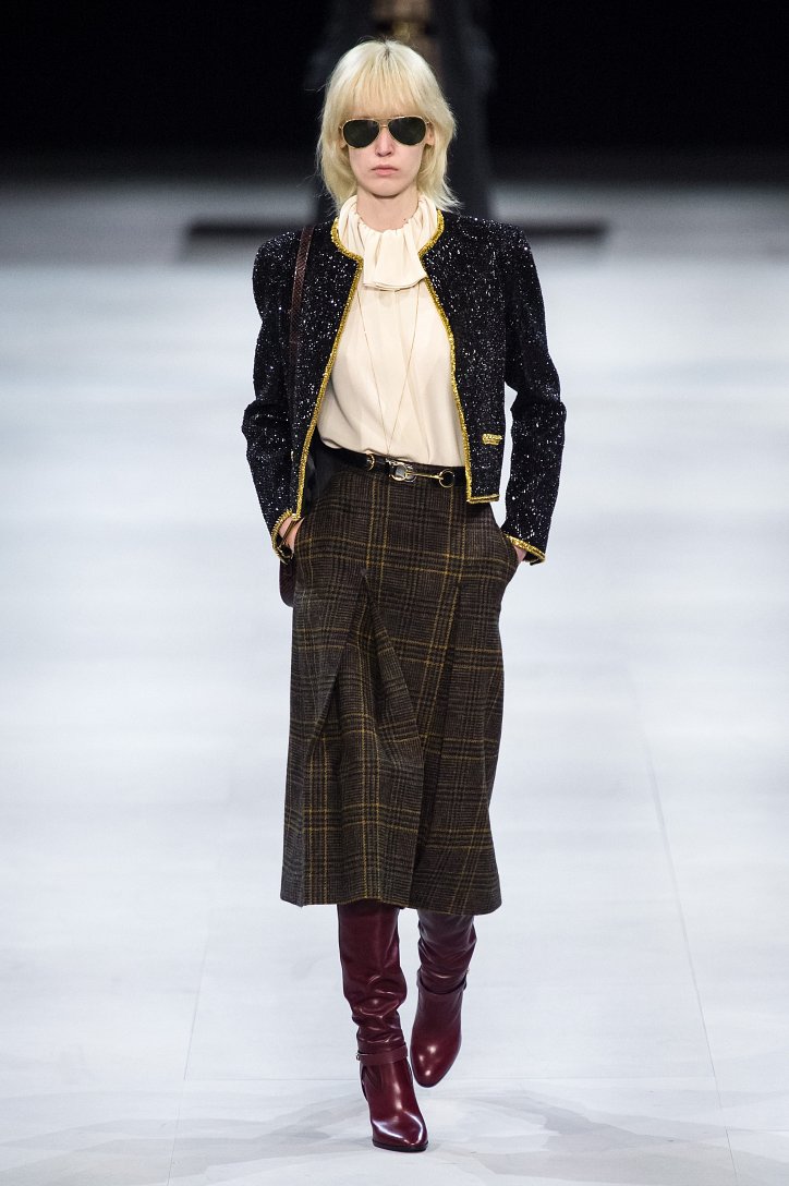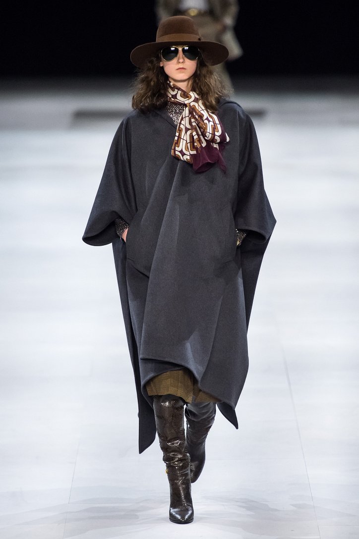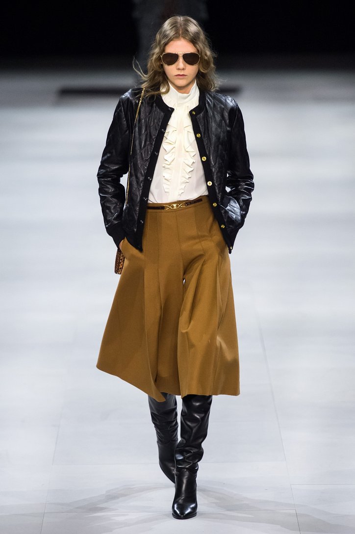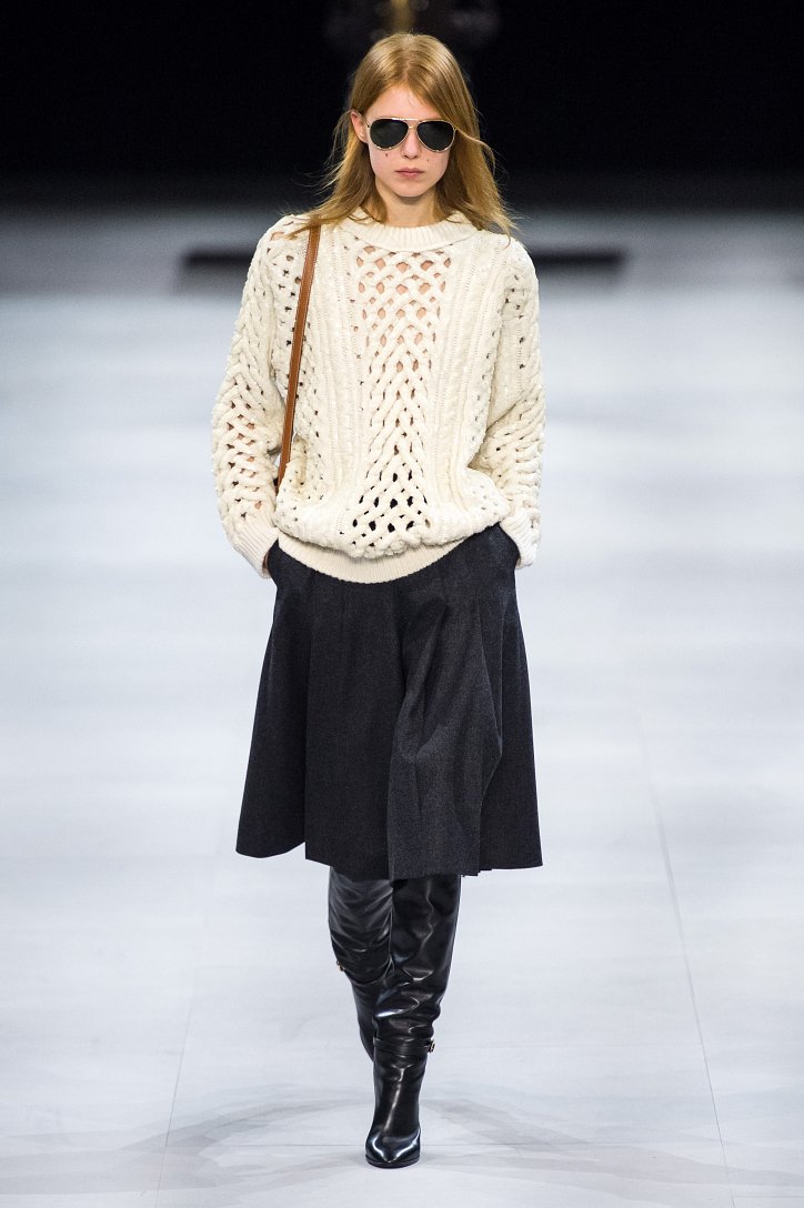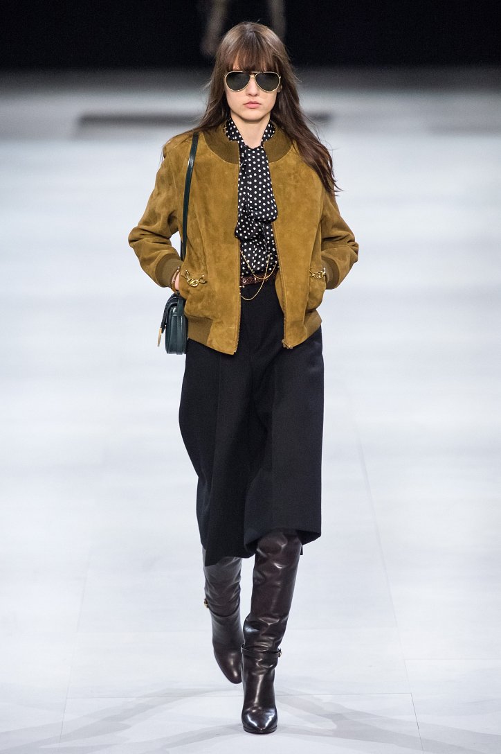 Коллекция Celine стала реинкарнацией буржуазной парижской моды, в которой «приняли участие» шелковые платья и кюлоты, джинсы skinny и строгие жакеты, классические пальто и брючные костюмы, пончо и кейпы, блузки с воротниками-бантами и юбки миди в складку.