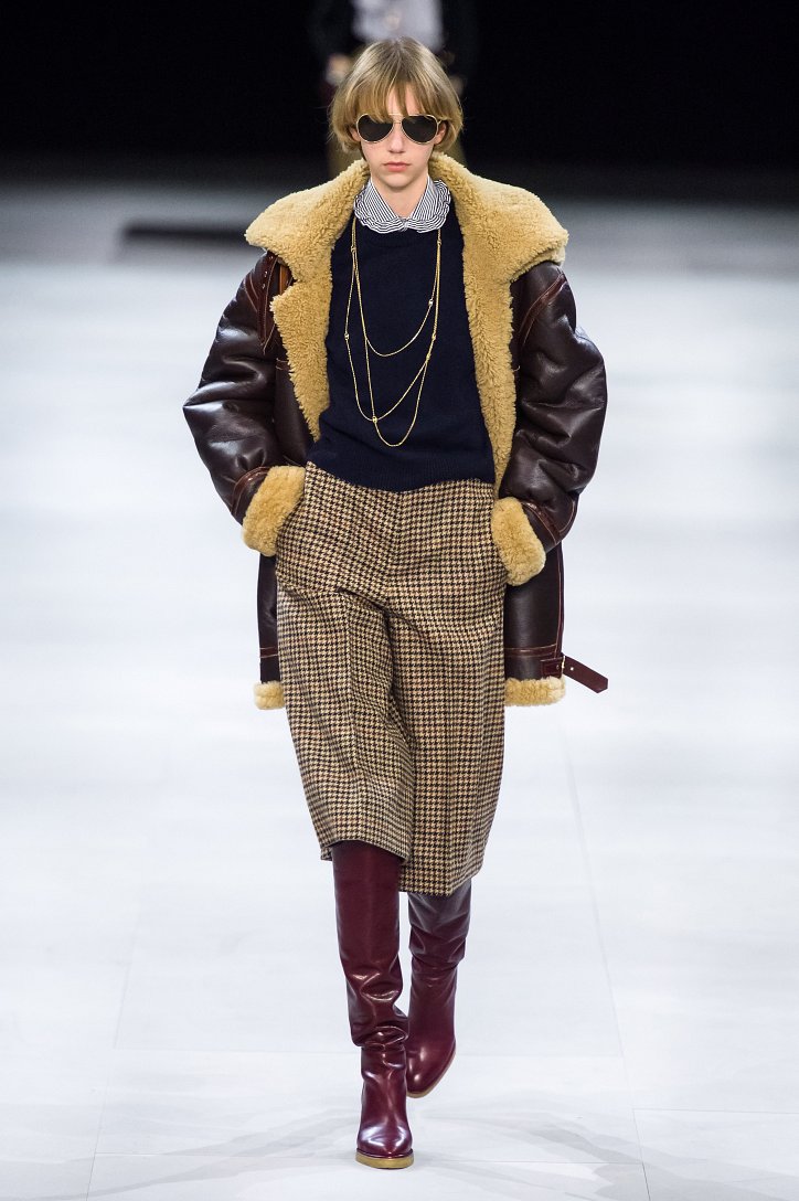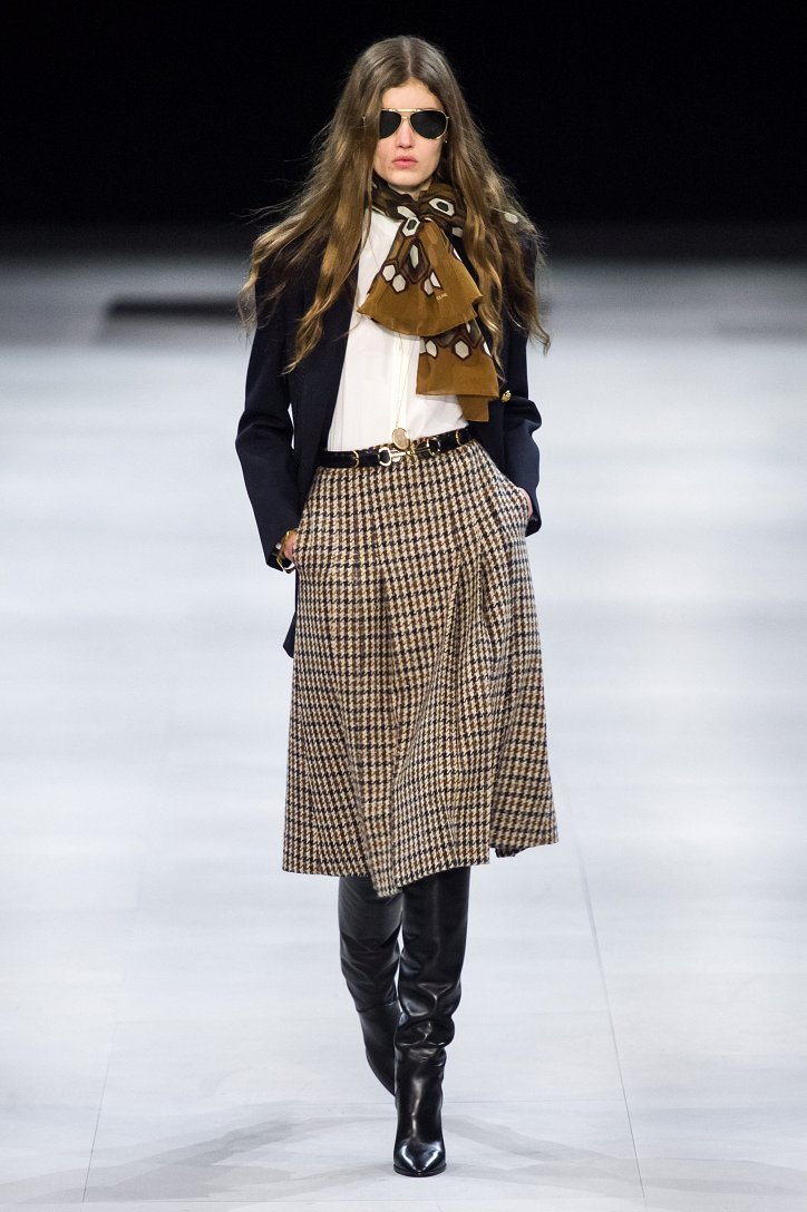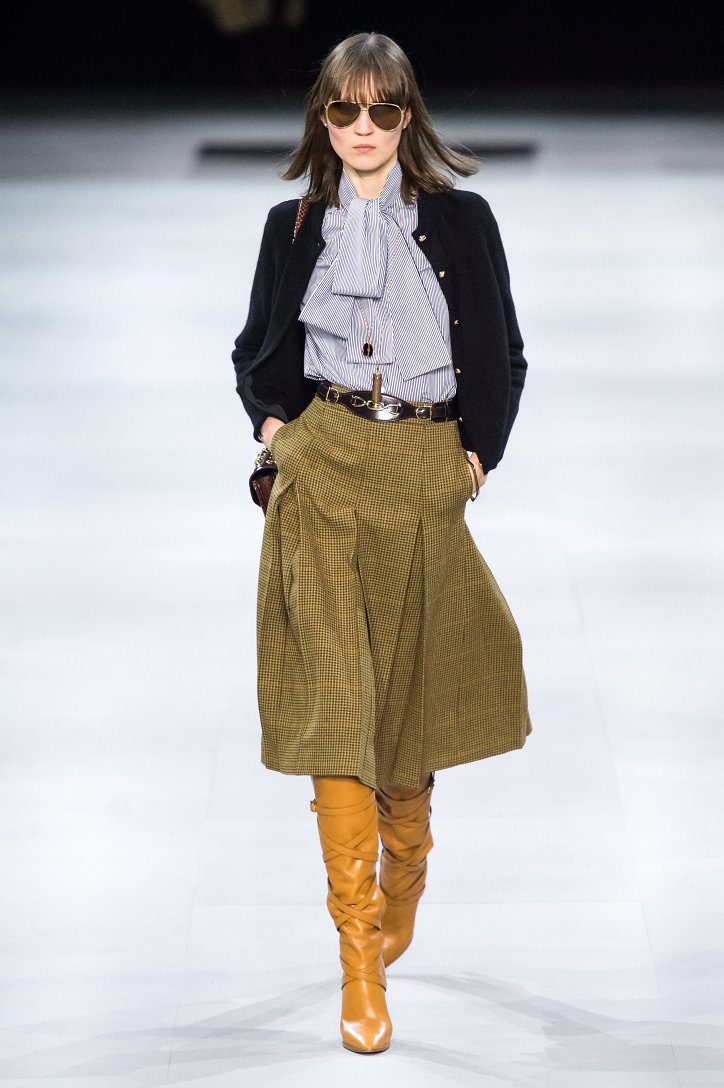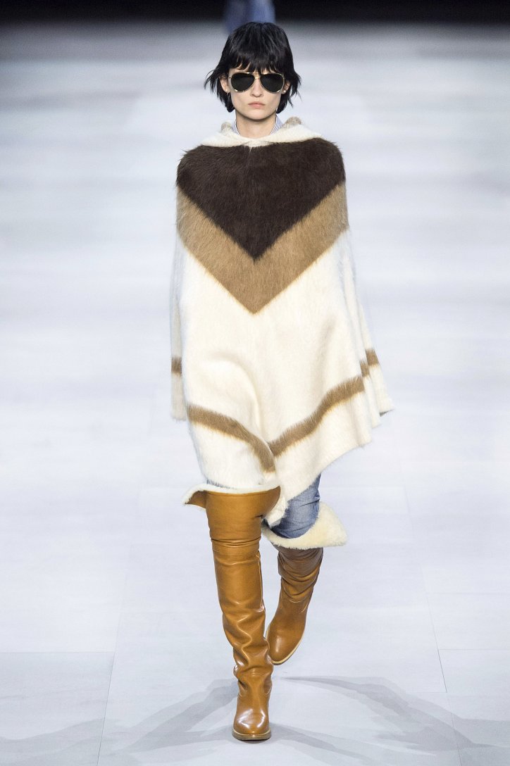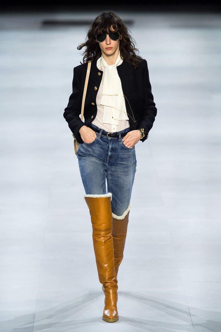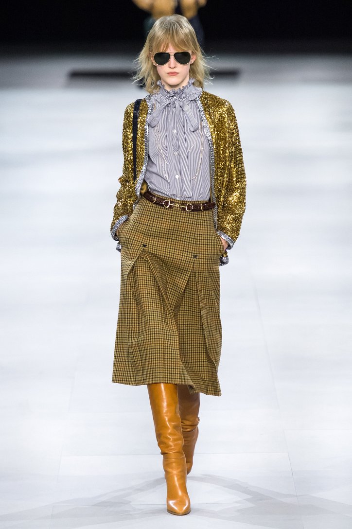 Коллекция Celine стала реинкарнацией буржуазной парижской моды, в которой «приняли участие» шелковые платья и кюлоты, джинсы skinny и строгие жакеты, классические пальто и брючные костюмы, пончо и кейпы, блузки с воротниками-бантами и юбки миди в складку.