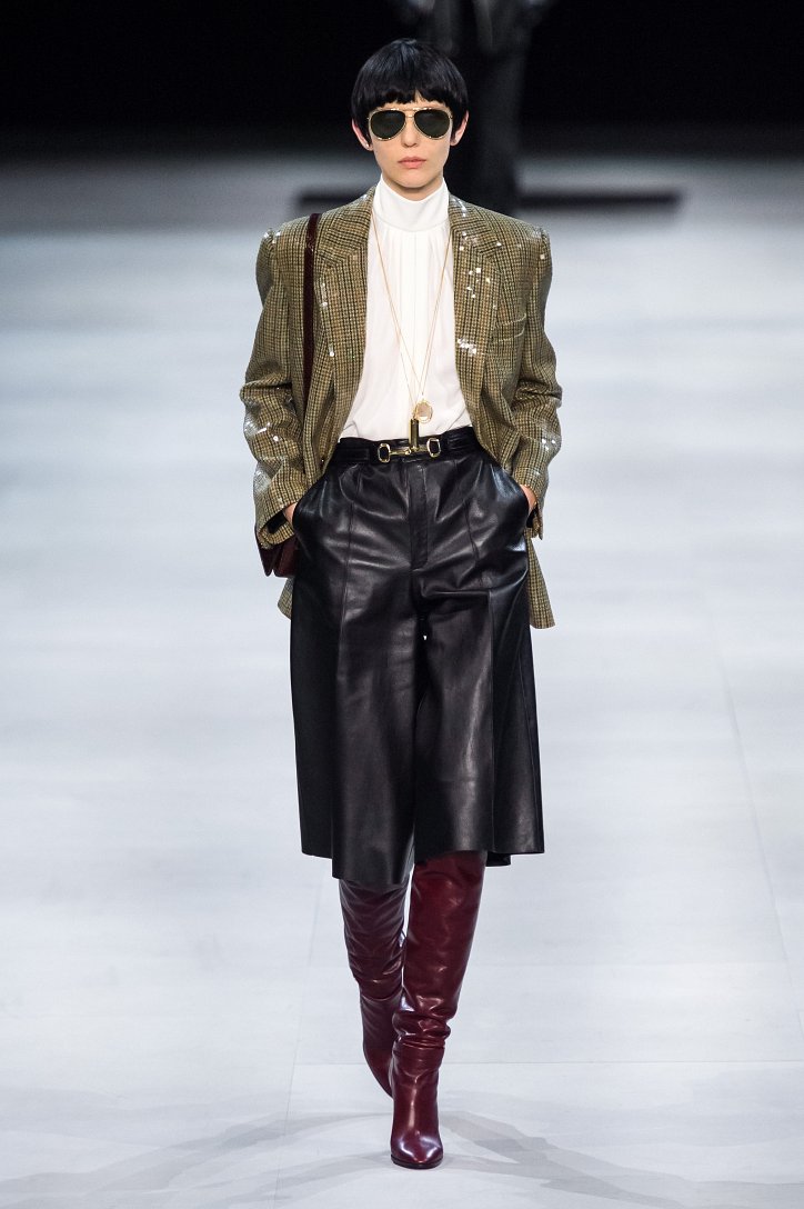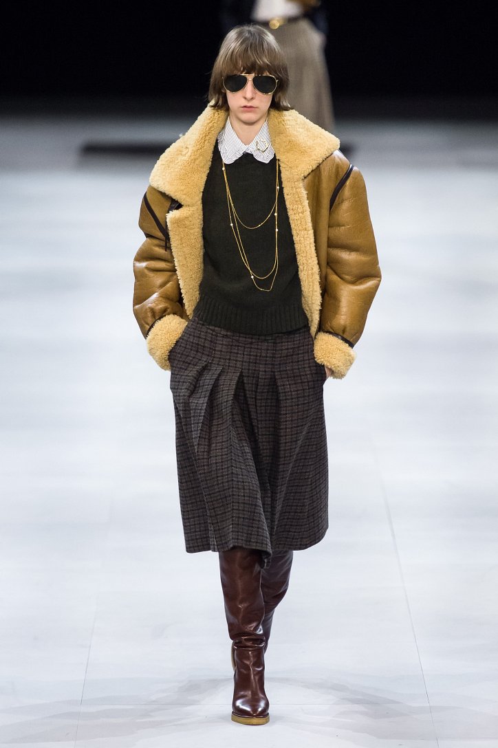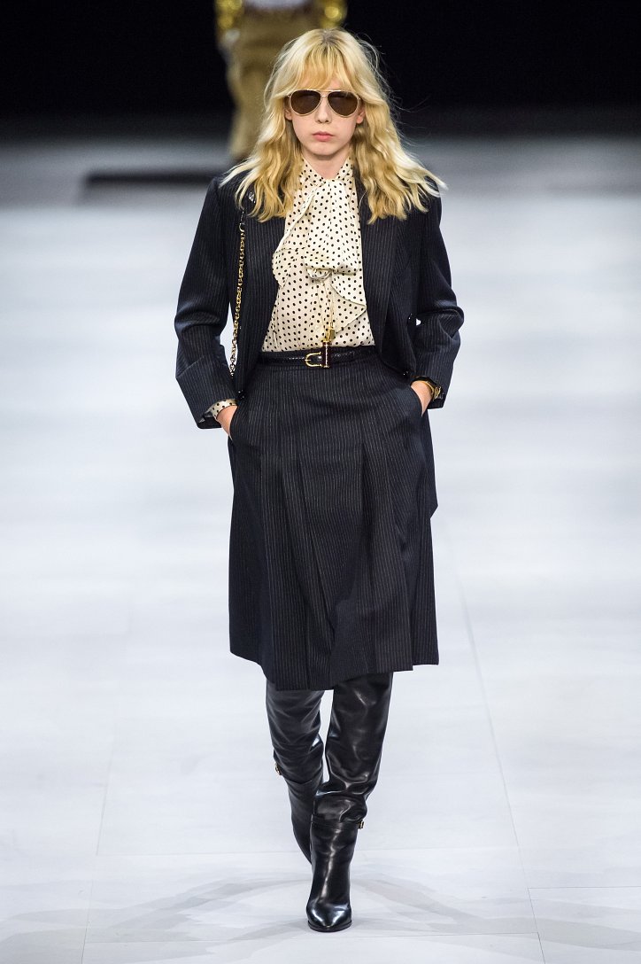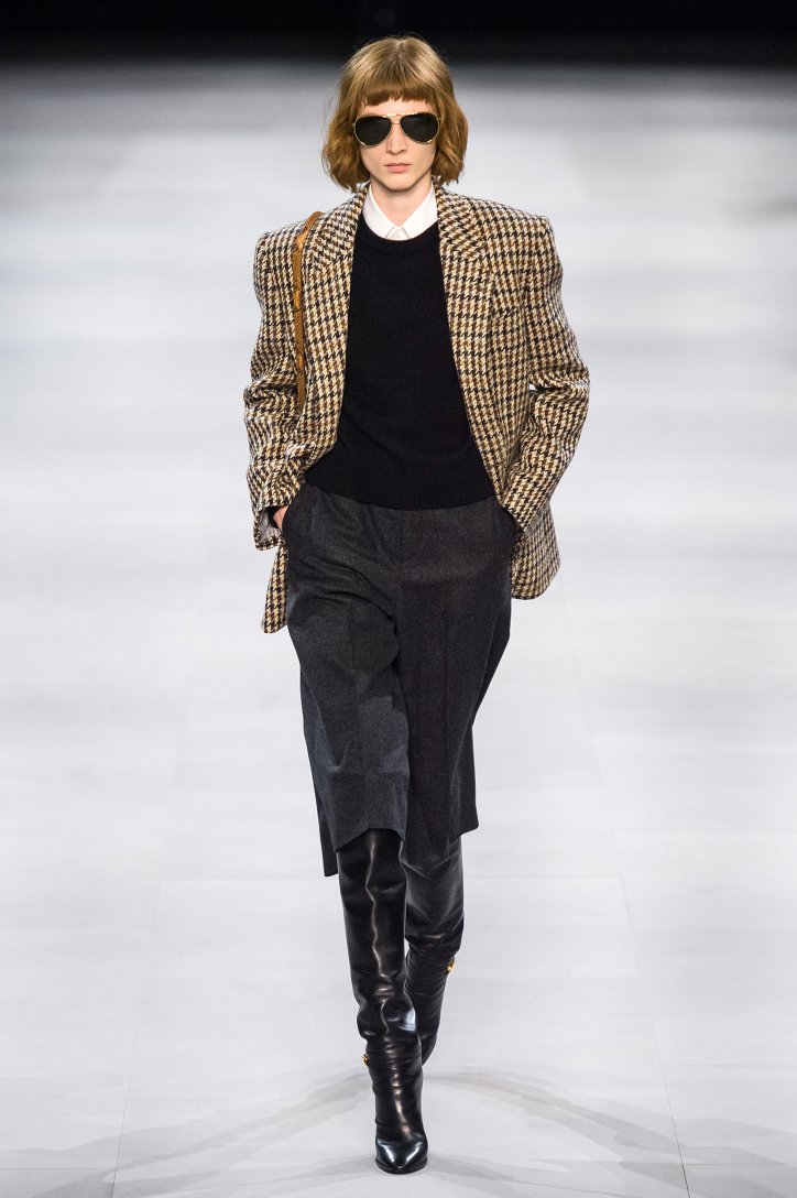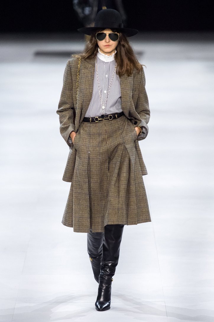Начало шоу Celine было неожиданным и эффектным: из-под «купола цирка» медленно опустился на подиум зеркальный куб – и к замершей публике вышла девушка, которая, казалось, перенеслась сюда из прошлого. Плиссированные клетчатые кюлоты, черный жакет, белая шелковая блузка, завязанный бантом шарфик с принтом-логотипом, классические «авиаторы» и высокие сапоги на каблуке – именно так выглядела француженка, выходя из примерочной Celine лет эдак 50 назад. Эди Слиман решил возродить «old, Old Celine» - тот, каким он был еще до того, как до него «добралась мода».