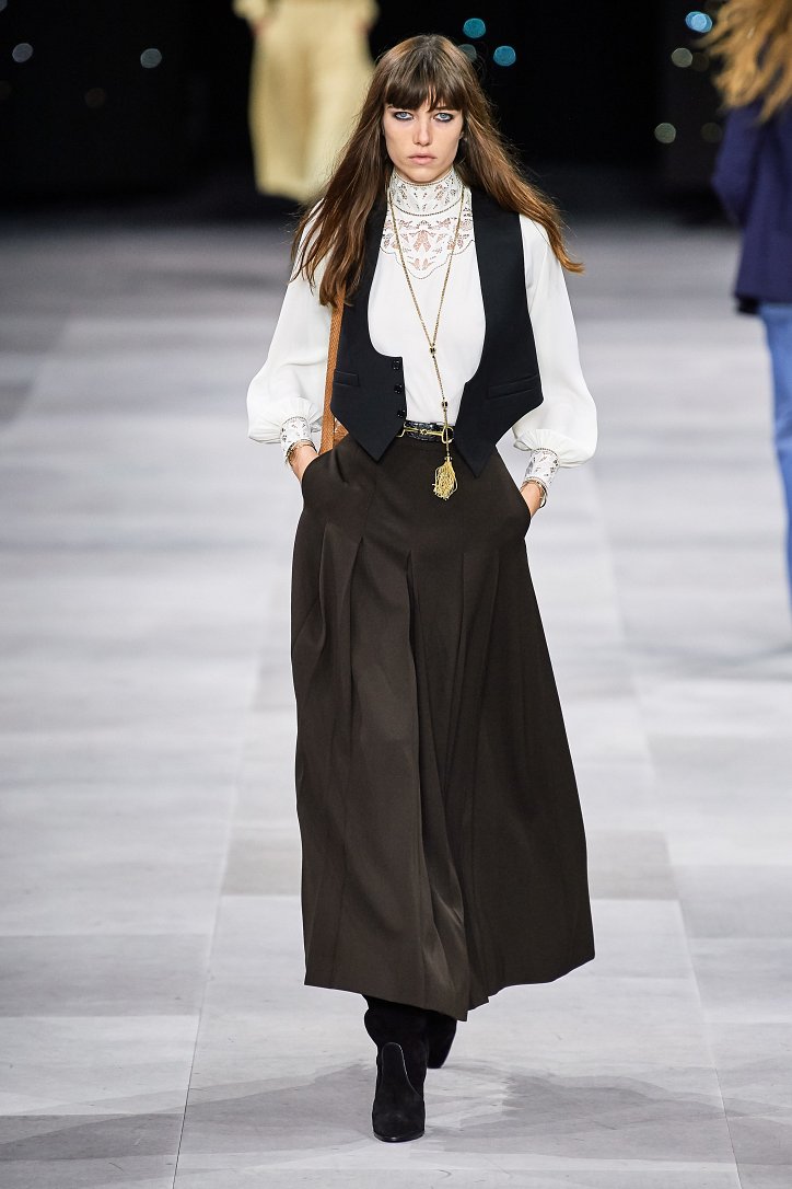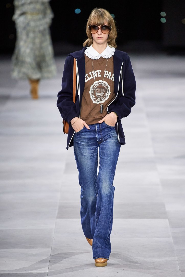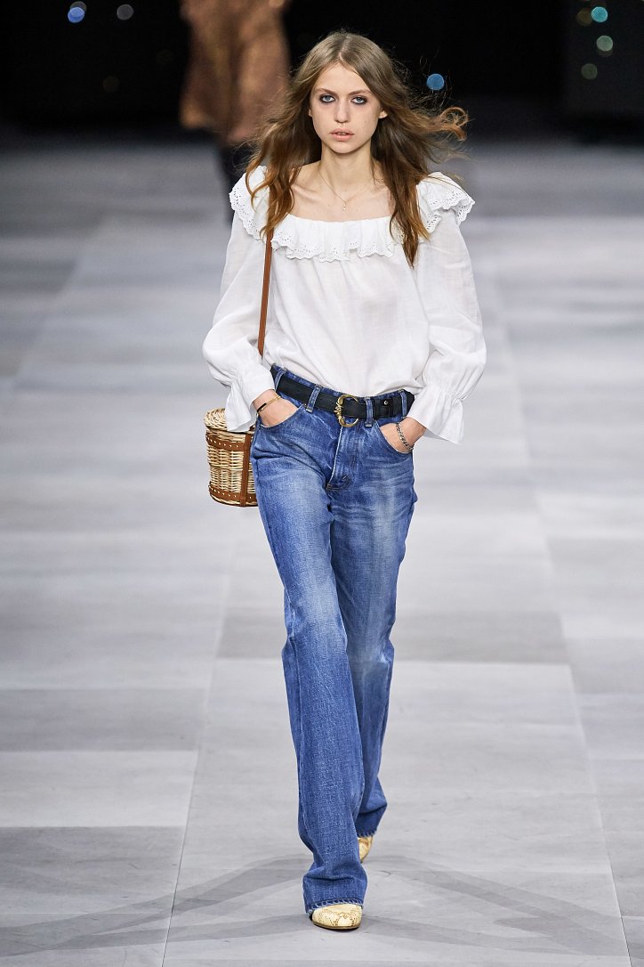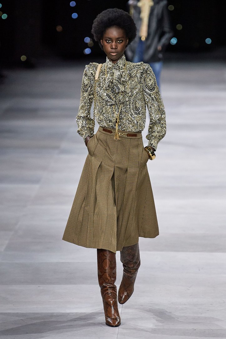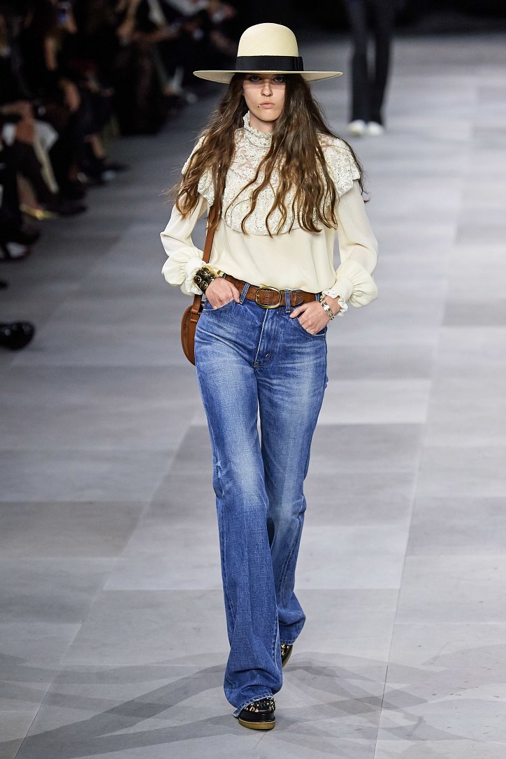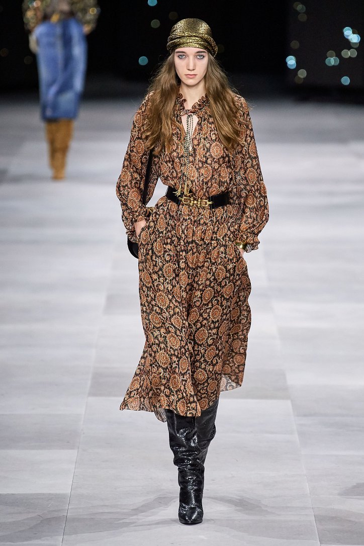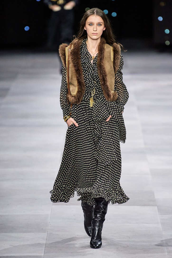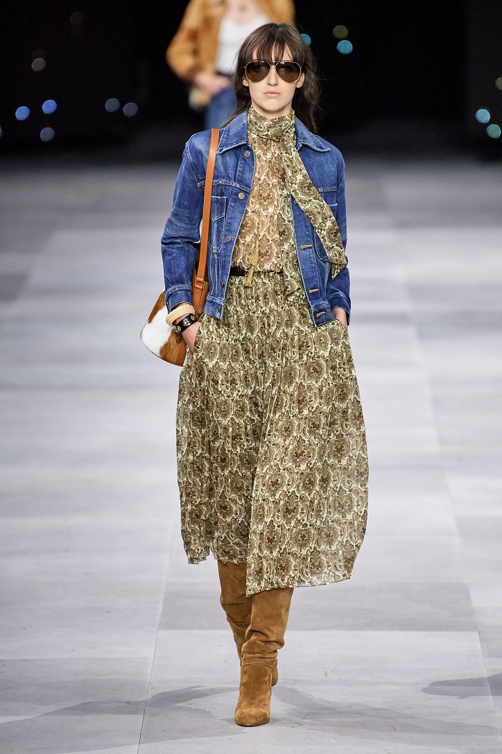 «Old, old Celine» - это джинсы клеш и юбки плиссе, платья миди и кейпы, джинсовые рубашки и двубортные пиджаки, романтические блузки с пышными рукавами и укороченные жакеты без воротника, высокие сапоги и белые кеды, кожаные ремни и очки-авиаторы. Из архивов бренда дизайнер «достал» фирменные принты, тюрбаны, укороченные шубки и блестящие материалы, добавил свойственные моде тех времен воротники-банты и элементы стиля хиппи – и вуаля! – получилась чудесная коллекция. Стильная, очень «французская» и абсолютно вся «носибельная».
