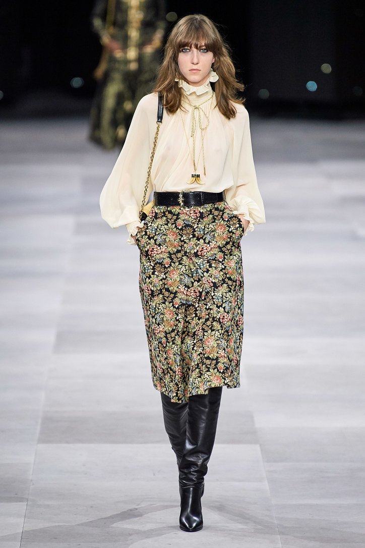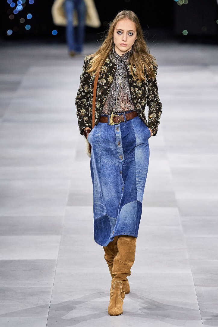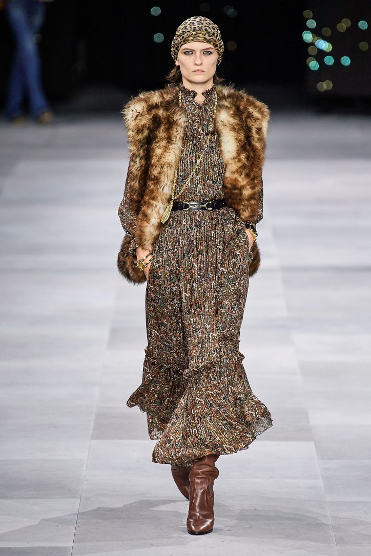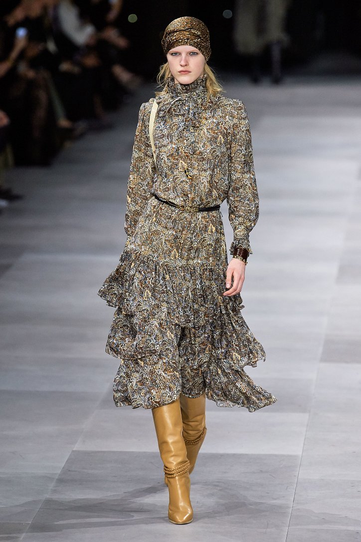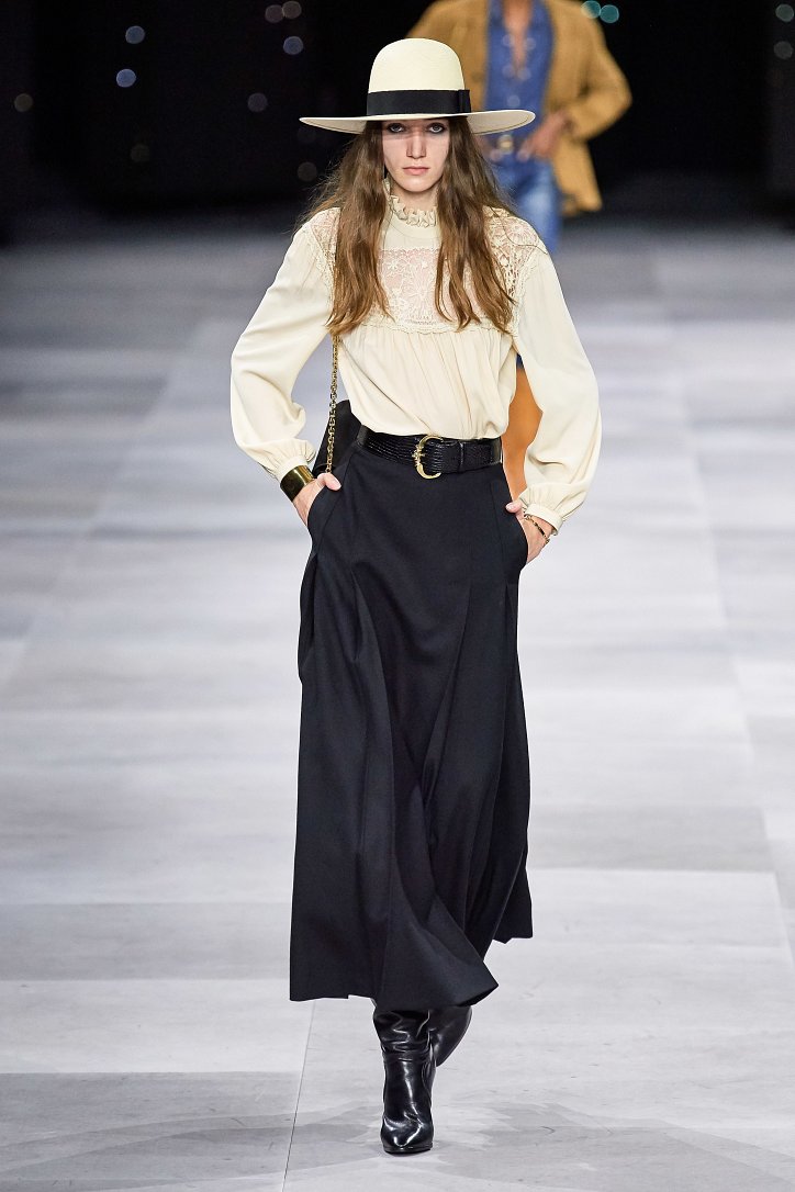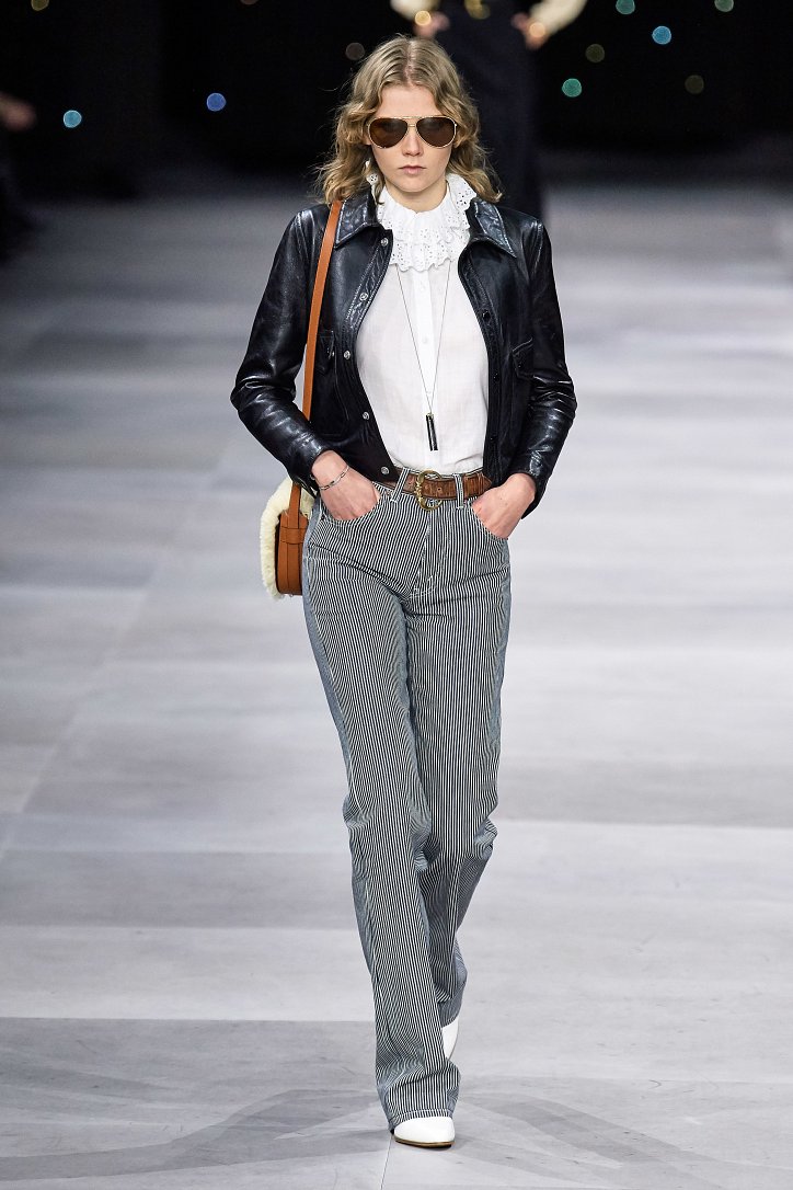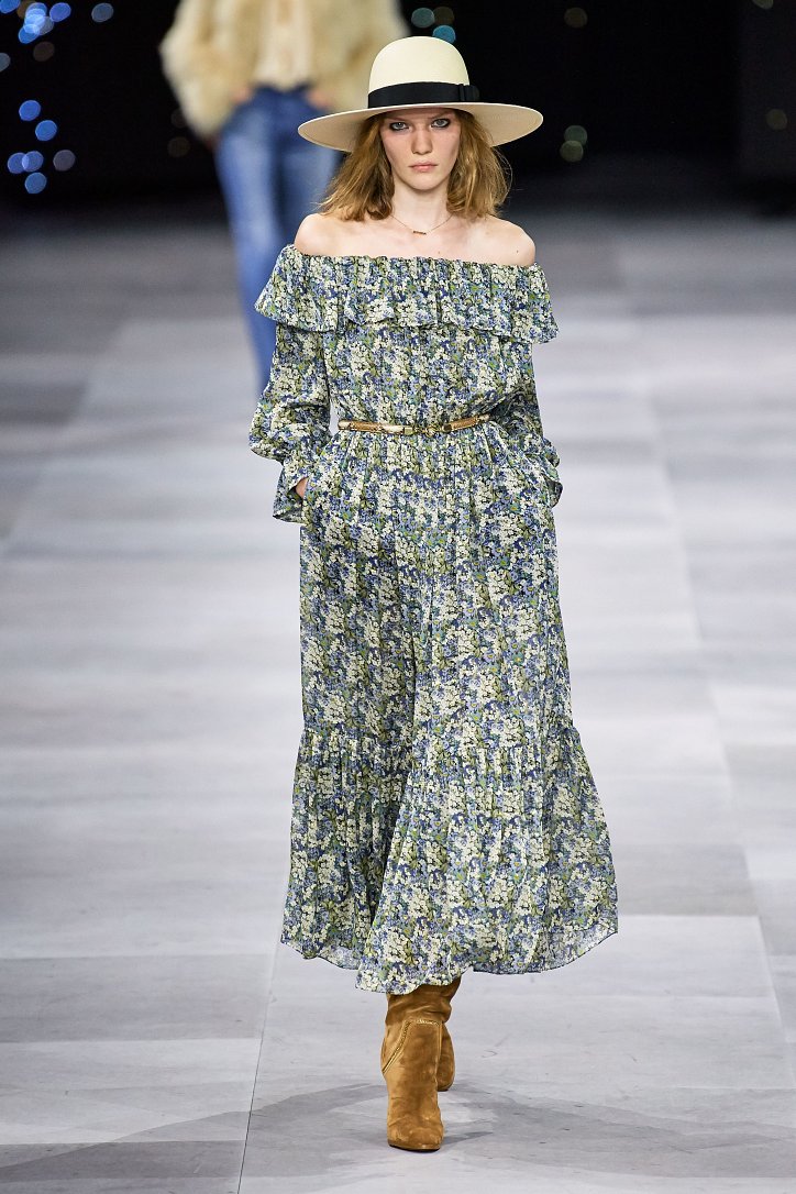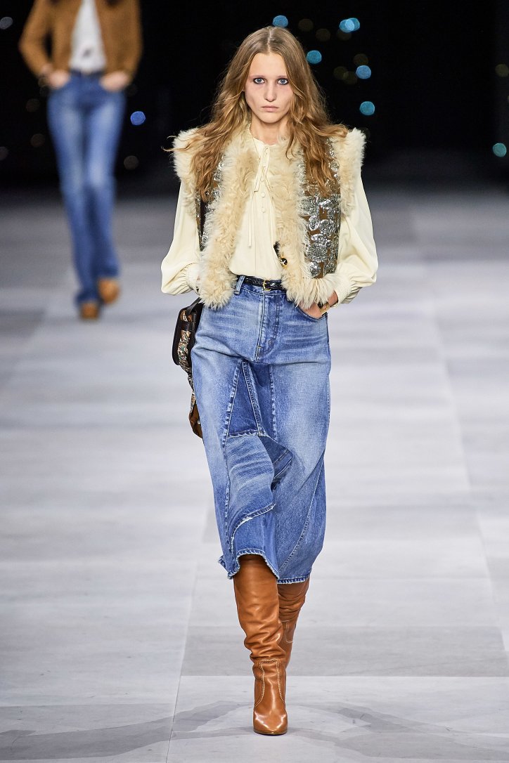 «Old, old Celine» - это джинсы клеш и юбки плиссе, платья миди и кейпы, джинсовые рубашки и двубортные пиджаки, романтические блузки с пышными рукавами и укороченные жакеты без воротника, высокие сапоги и белые кеды, кожаные ремни и очки-авиаторы. Из архивов бренда дизайнер «достал» фирменные принты, тюрбаны, укороченные шубки и блестящие материалы, добавил свойственные моде тех времен воротники-банты и элементы стиля хиппи – и вуаля! – получилась чудесная коллекция. Стильная, очень «французская» и абсолютно вся «носибельная».