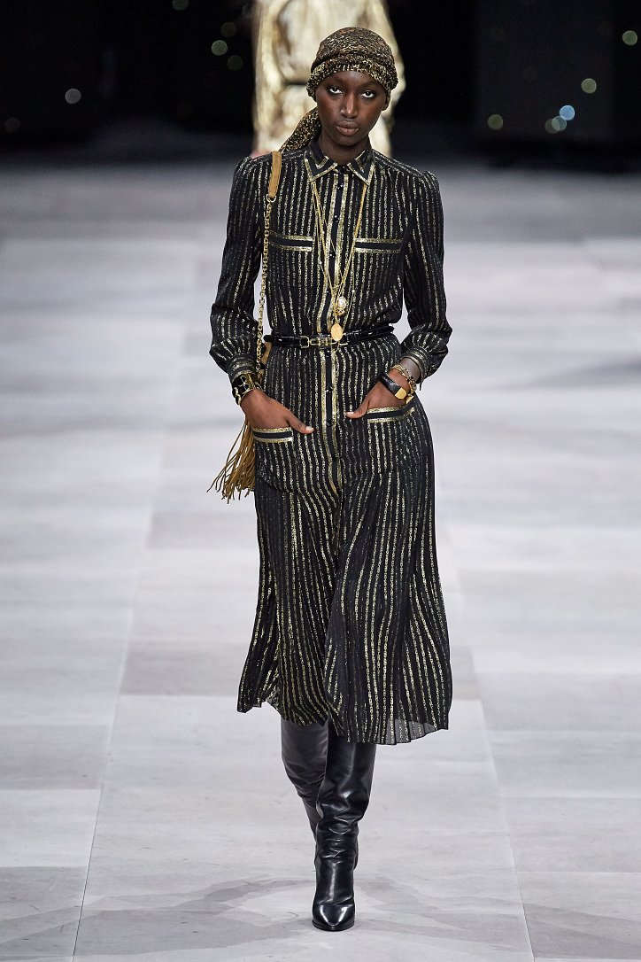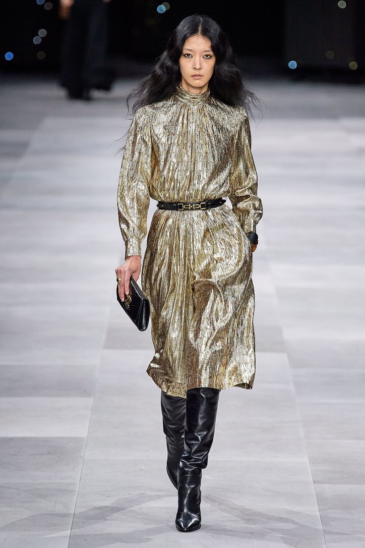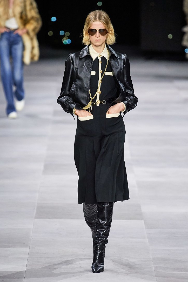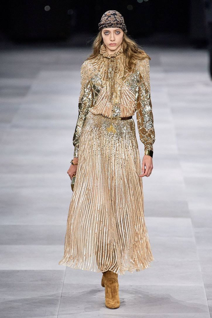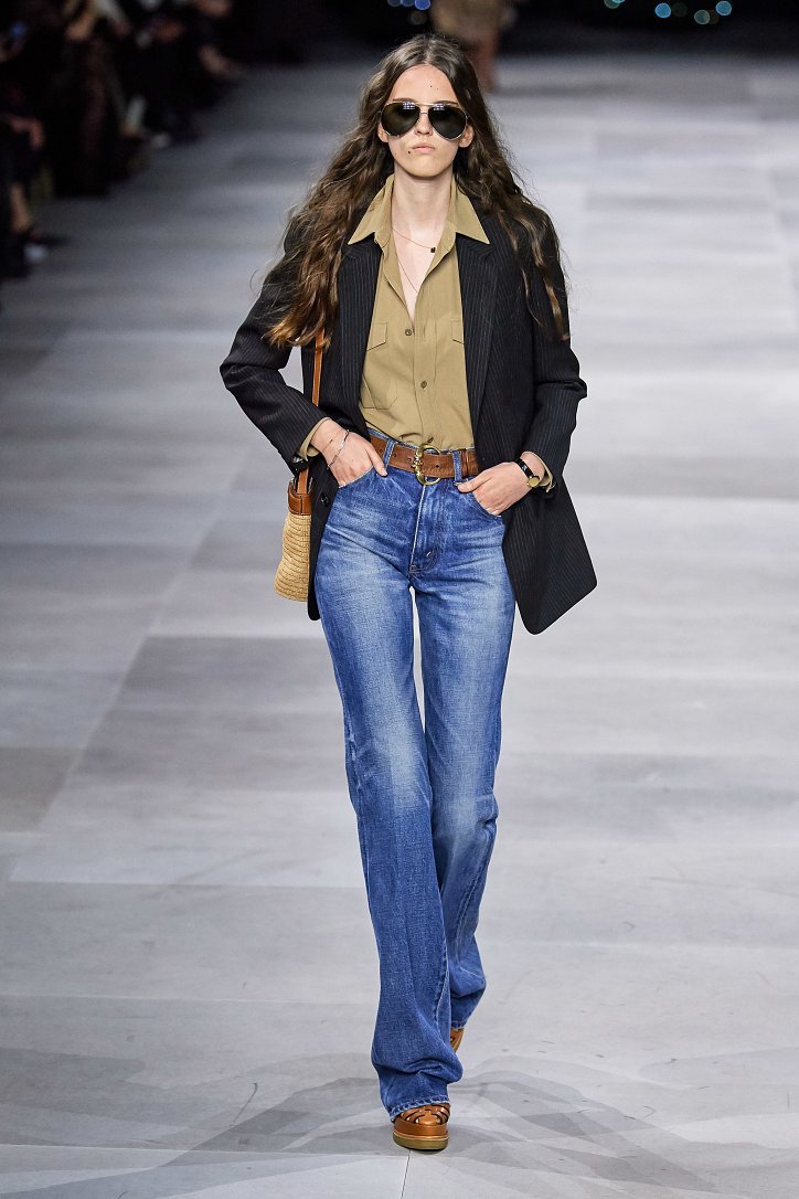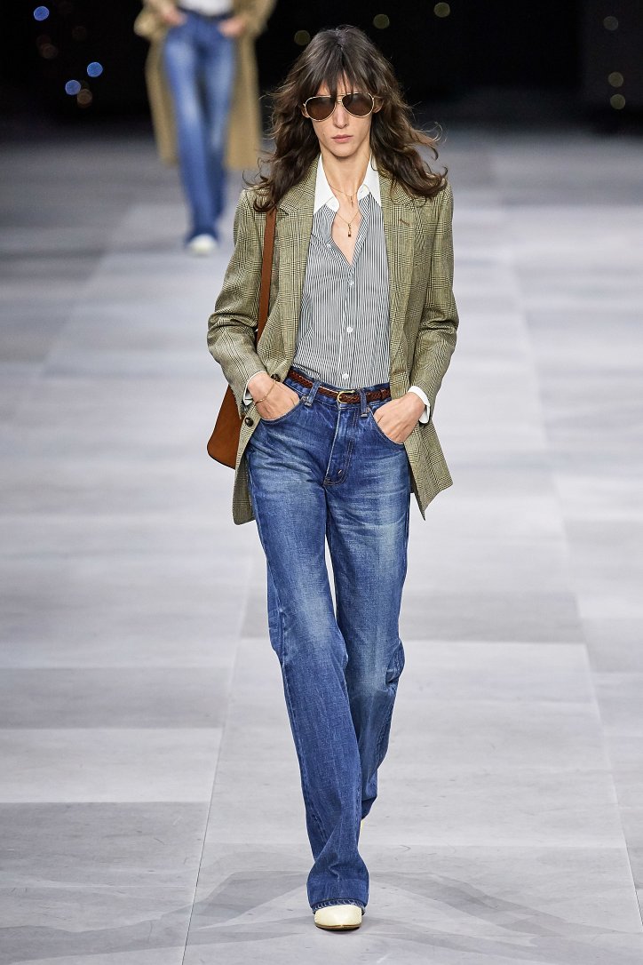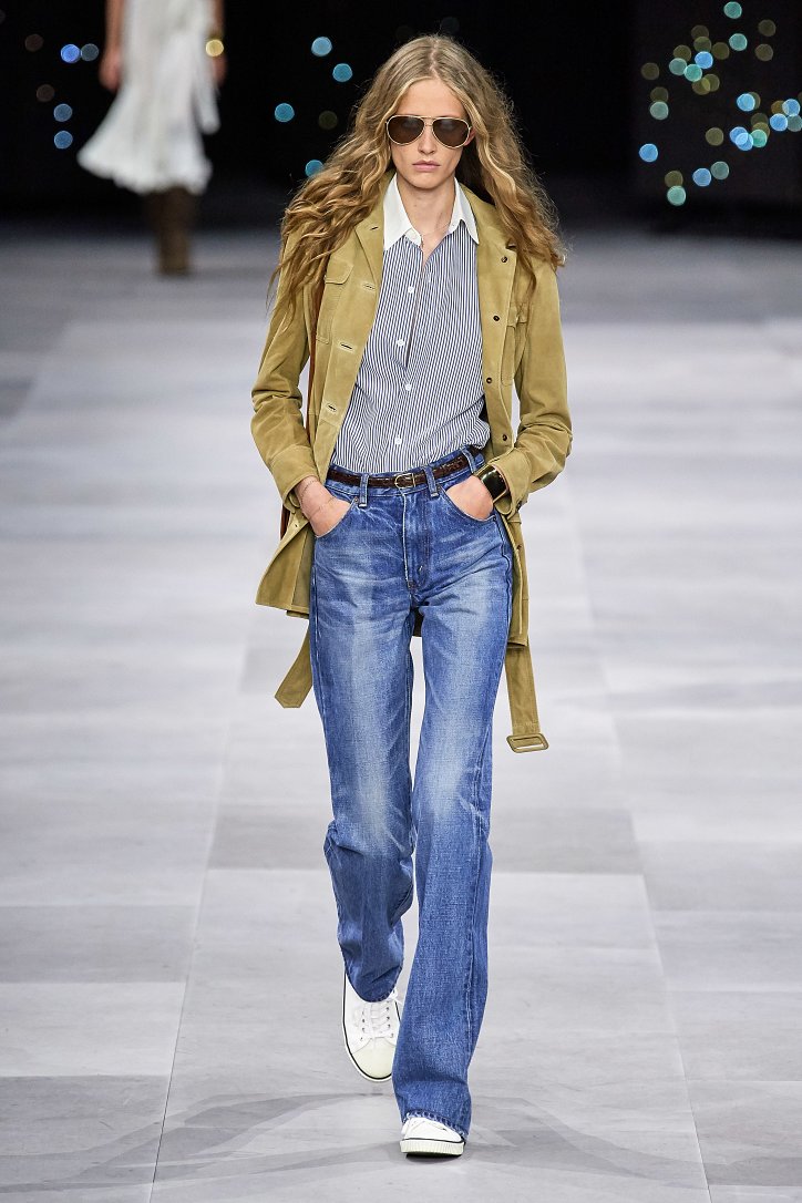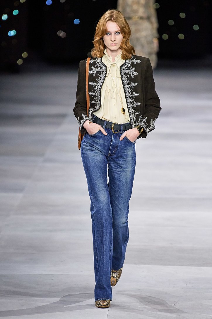 «Old, old Celine» - это джинсы клеш и юбки плиссе, платья миди и кейпы, джинсовые рубашки и двубортные пиджаки, романтические блузки с пышными рукавами и укороченные жакеты без воротника, высокие сапоги и белые кеды, кожаные ремни и очки-авиаторы. Из архивов бренда дизайнер «достал» фирменные принты, тюрбаны, укороченные шубки и блестящие материалы, добавил свойственные моде тех времен воротники-банты и элементы стиля хиппи – и вуаля! – получилась чудесная коллекция. Стильная, очень «французская» и абсолютно вся «носибельная».