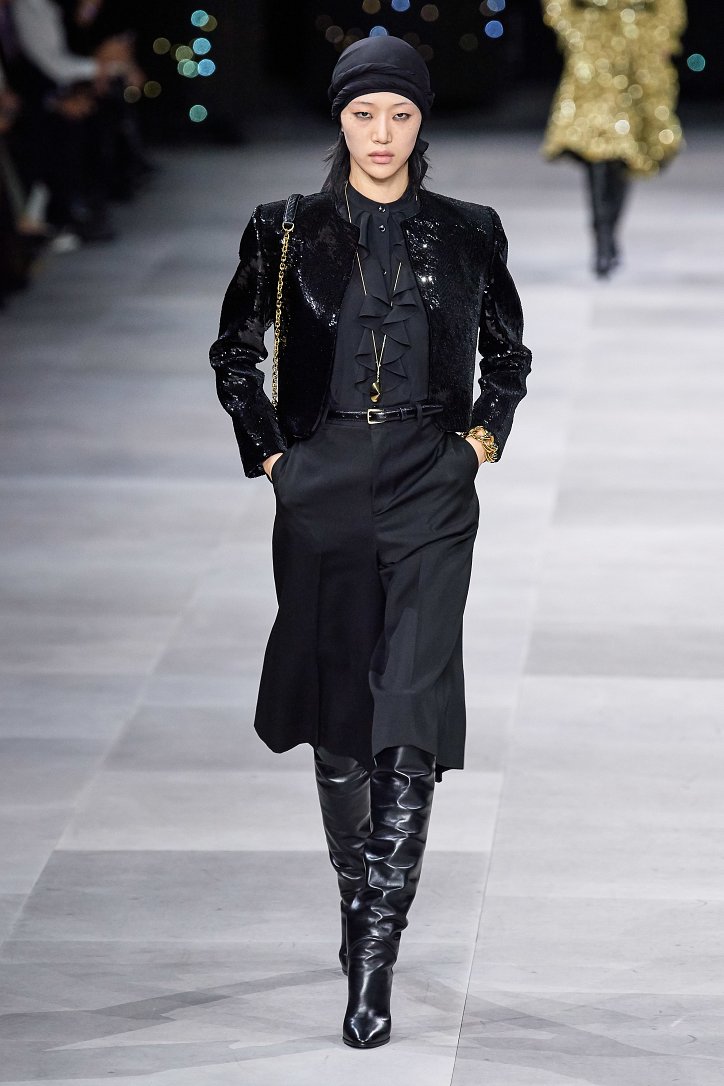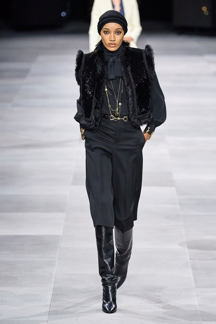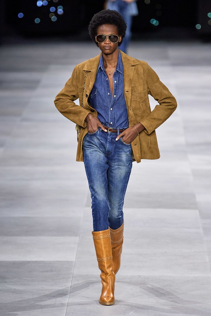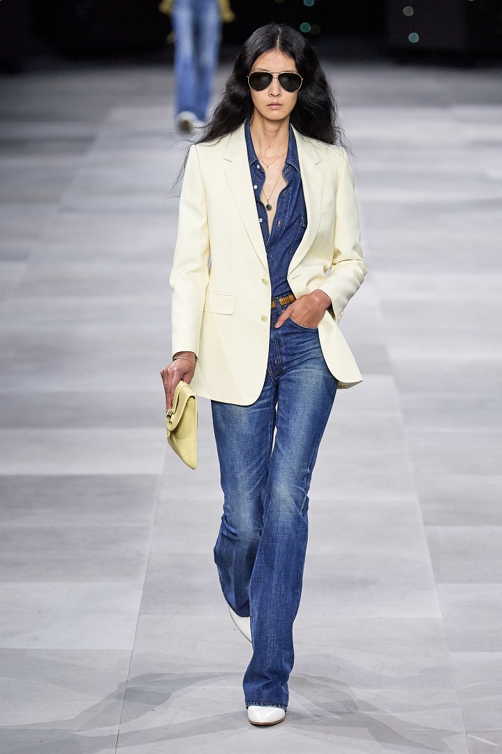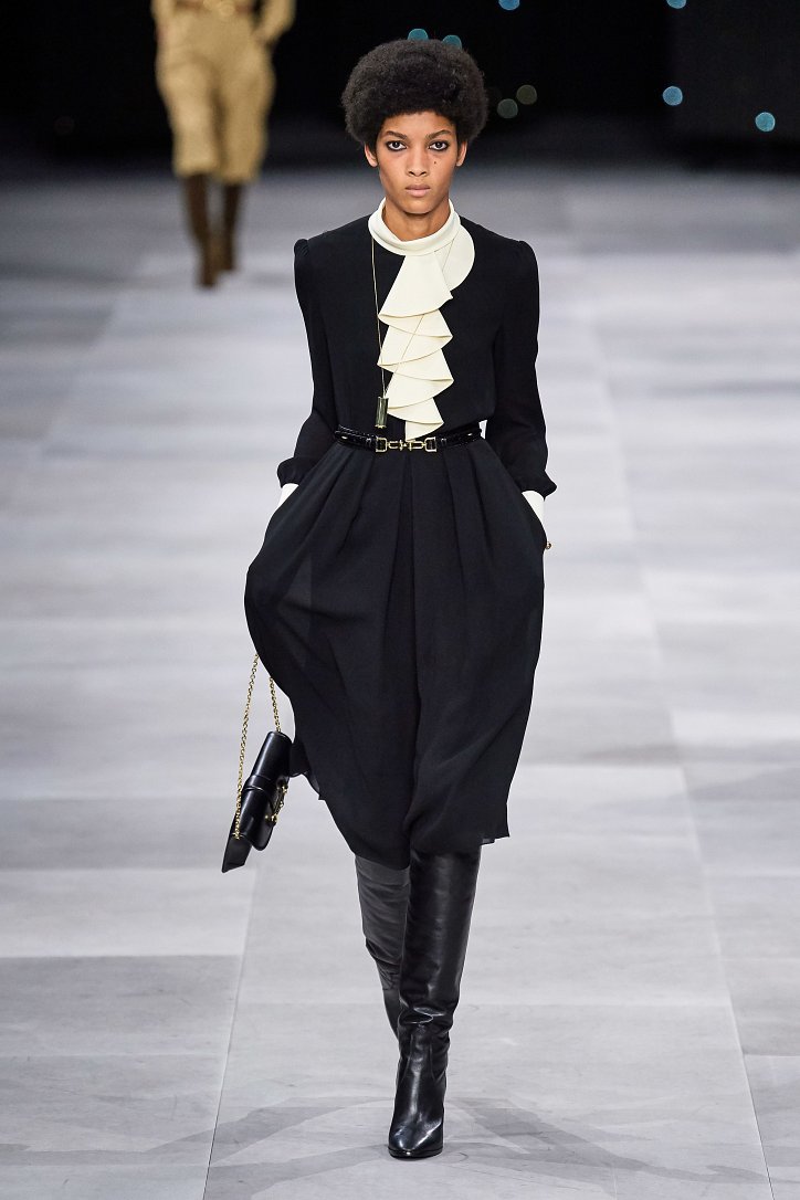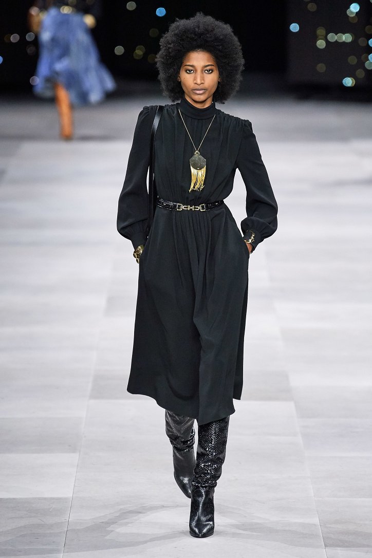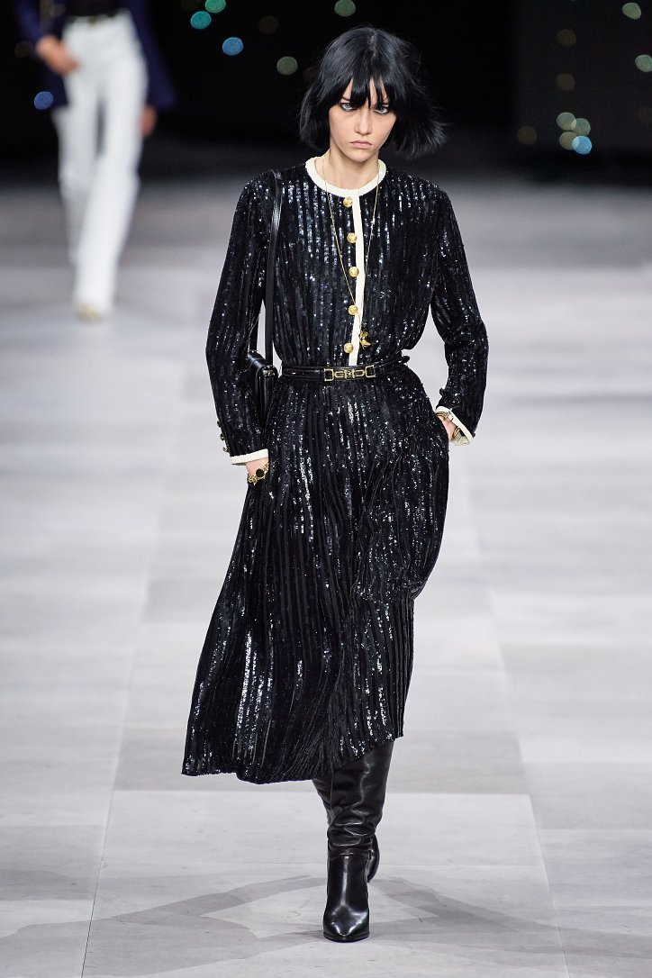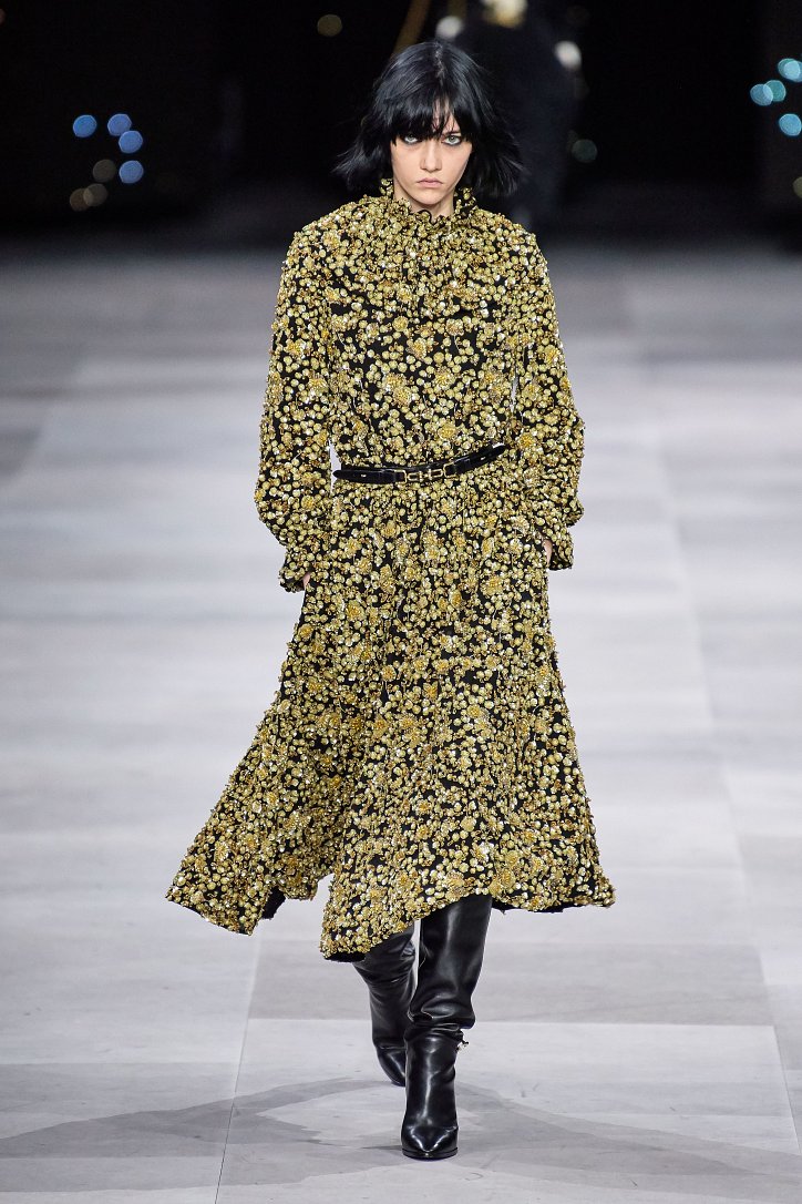 «Old, old Celine» - это джинсы клеш и юбки плиссе, платья миди и кейпы, джинсовые рубашки и двубортные пиджаки, романтические блузки с пышными рукавами и укороченные жакеты без воротника, высокие сапоги и белые кеды, кожаные ремни и очки-авиаторы. Из архивов бренда дизайнер «достал» фирменные принты, тюрбаны, укороченные шубки и блестящие материалы, добавил свойственные моде тех времен воротники-банты и элементы стиля хиппи – и вуаля! – получилась чудесная коллекция. Стильная, очень «французская» и абсолютно вся «носибельная».