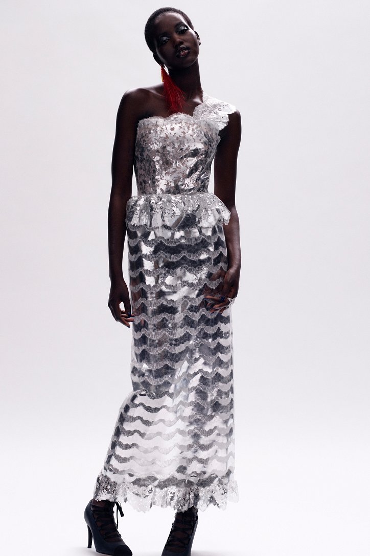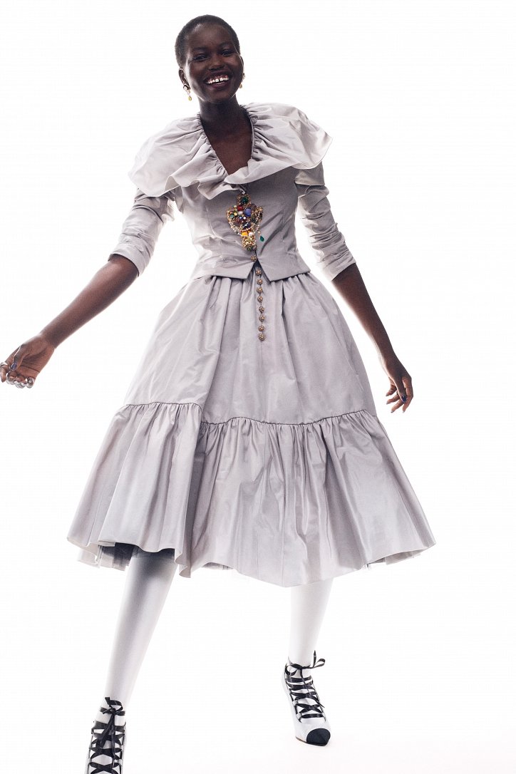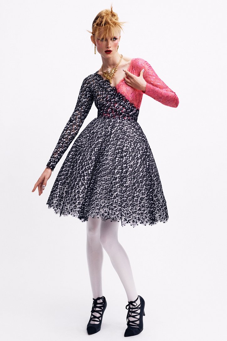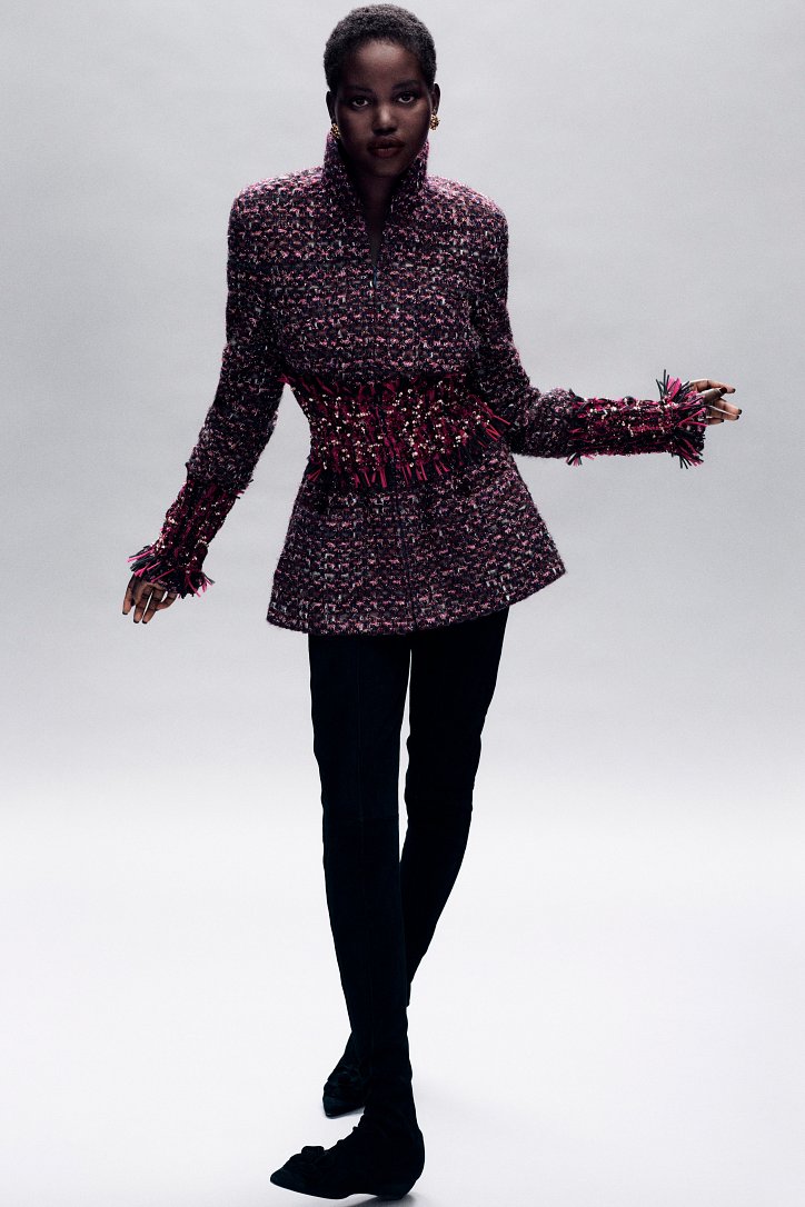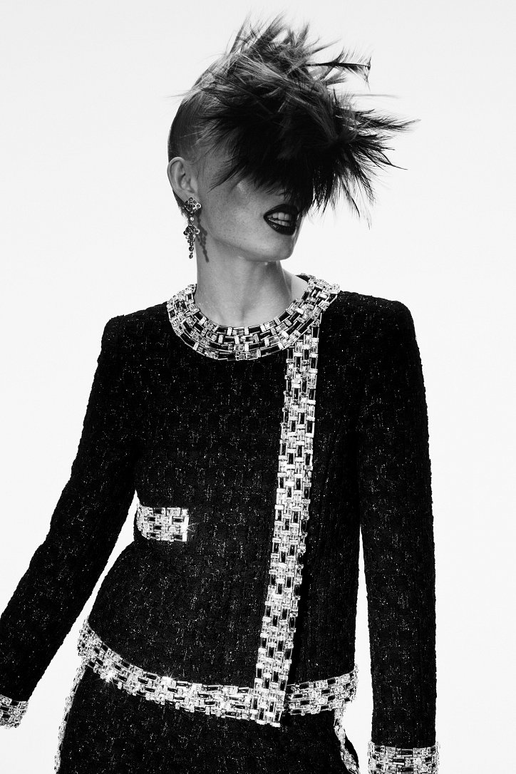 Цветочные аппликации и черное с серебром кружево, яркие вспышки цвета и украшения Chanel haute bijoux – все 3 десятка образов демонстрируют стремление к богатству и утонченности, а прически в стиле панк и перья в волосах придают коллекции бунтарских ноток и романтизма ультра-рока – словом, явный «не формат» Шанель!