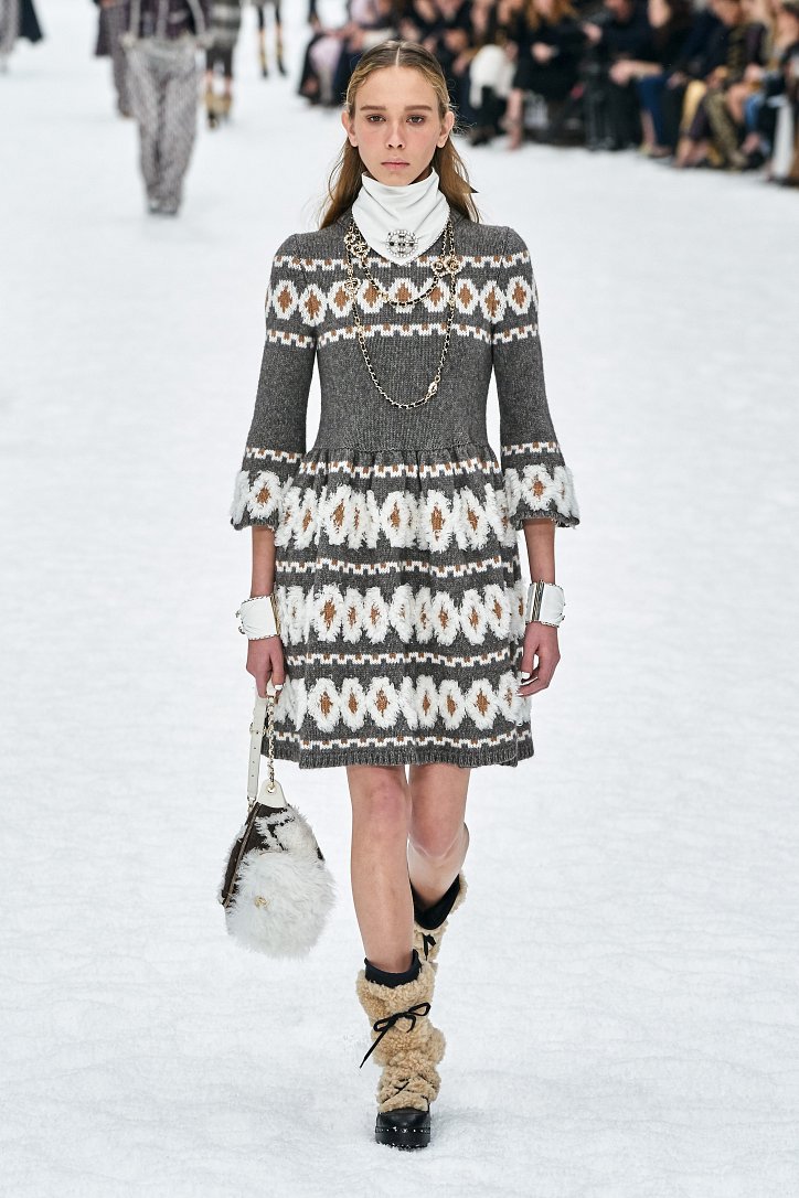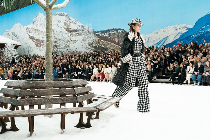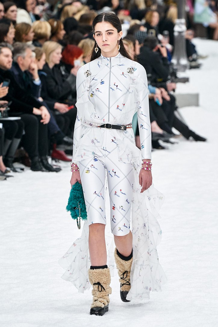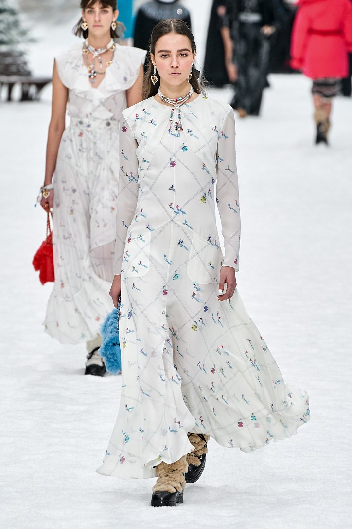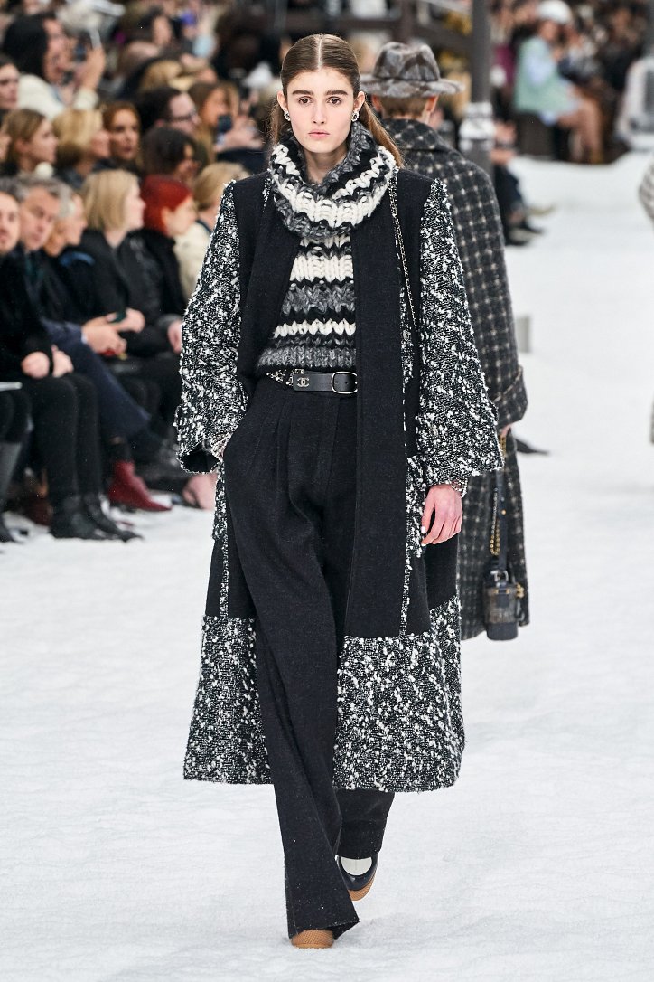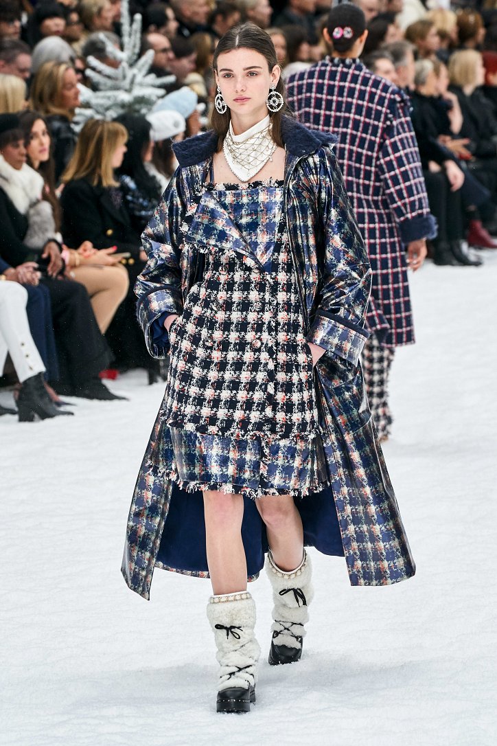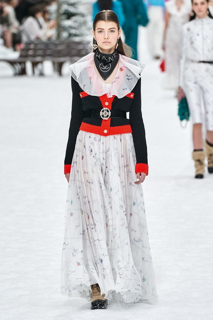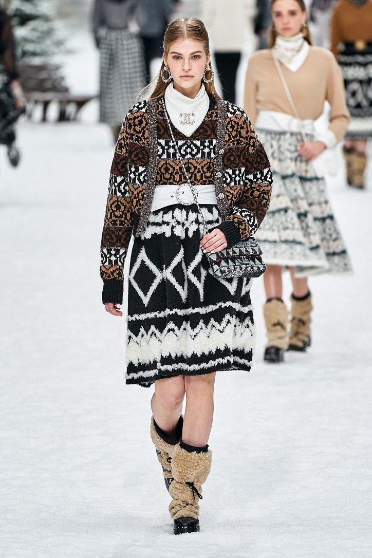 В последний раз гости шоу могли полюбоваться творениями, к созданию которых был причастен Лагерфельд. Своеобразное «прощание» состоялось на горнолыжном курорте: на фоне заснеженной альпийской деревни, деревянных шале и покрытых снегом елок модели демонстрировали анонсированную в прошлом году коллекцию Coco Neige. В ней есть все, что нужно для того, чтобы покататься на лыжах или отправиться на прогулку, а вечером посидеть у камина: вязаные кардиганы, шерстяные брюки и зимние юбки, яркие пуховики и пальто макси, обилие твида и всевозможной клетки, длинные кейпы и роскошные белые платья-мини – прекрасный наряд для встречи Нового года в горах.