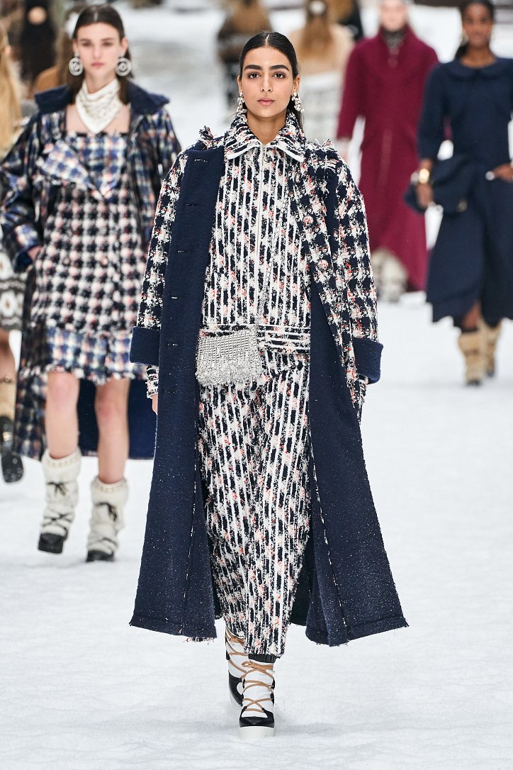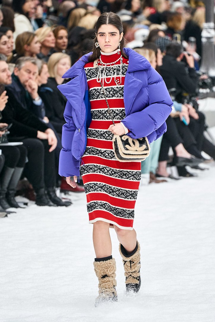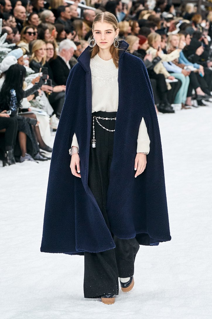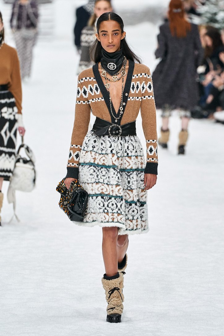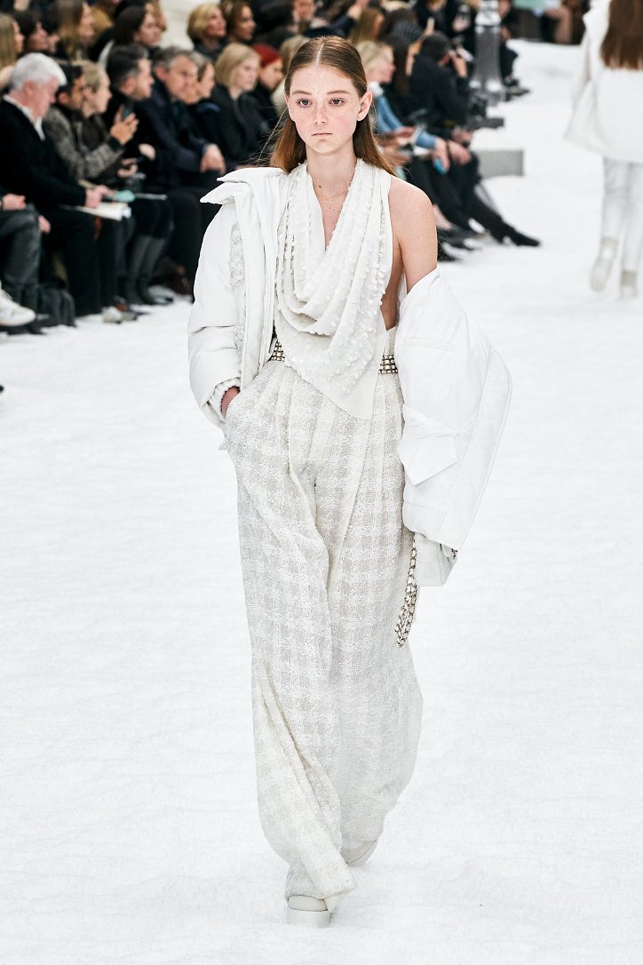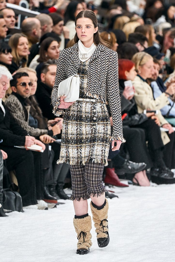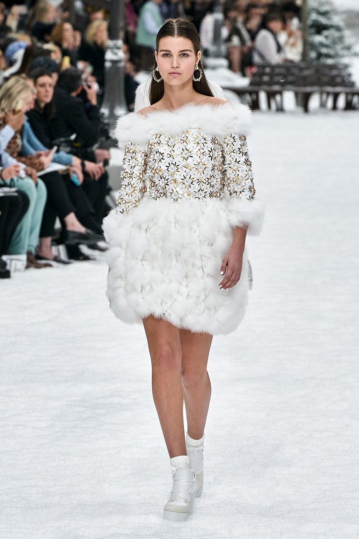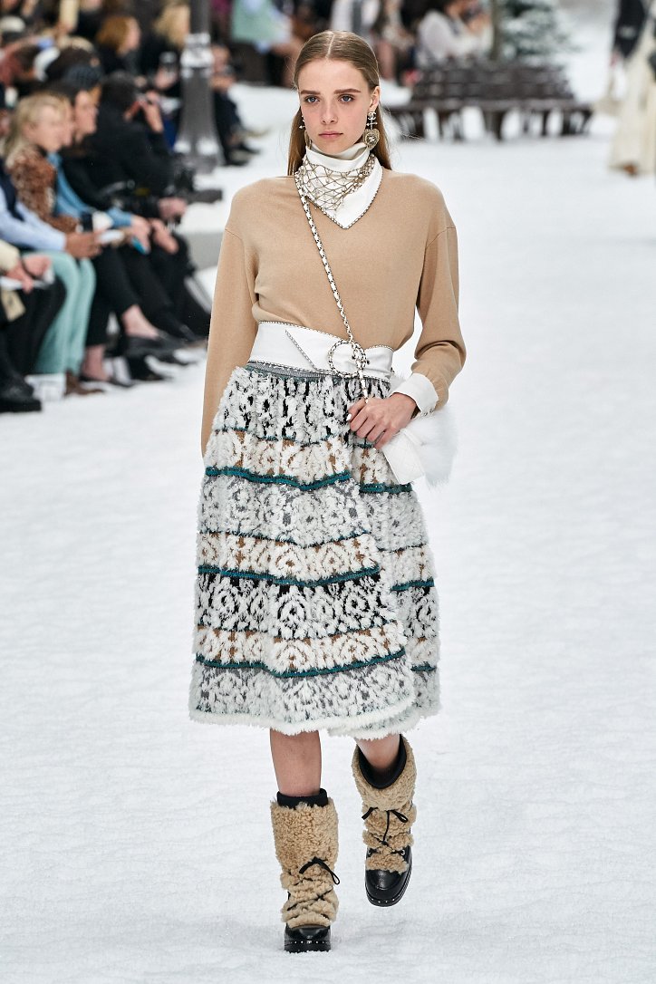 В последний раз гости шоу могли полюбоваться творениями, к созданию которых был причастен Лагерфельд. Своеобразное «прощание» состоялось на горнолыжном курорте: на фоне заснеженной альпийской деревни, деревянных шале и покрытых снегом елок модели демонстрировали анонсированную в прошлом году коллекцию Coco Neige. В ней есть все, что нужно для того, чтобы покататься на лыжах или отправиться на прогулку, а вечером посидеть у камина: вязаные кардиганы, шерстяные брюки и зимние юбки, яркие пуховики и пальто макси, обилие твида и всевозможной клетки, длинные кейпы и роскошные белые платья-мини – прекрасный наряд для встречи Нового года в горах.