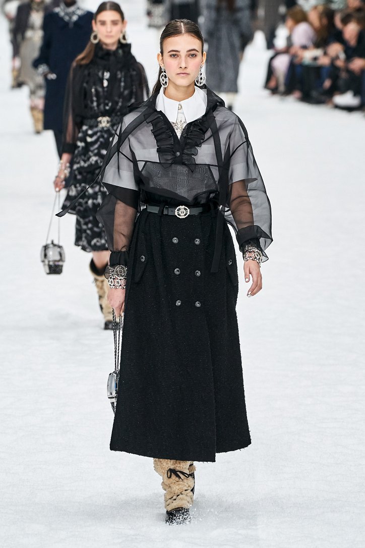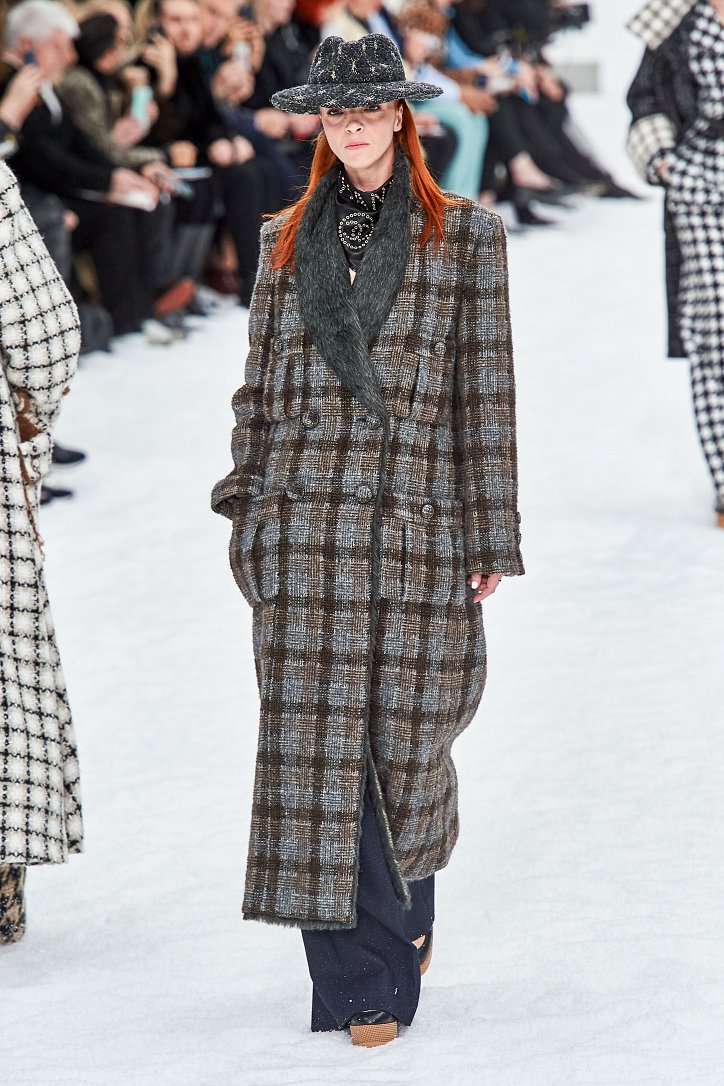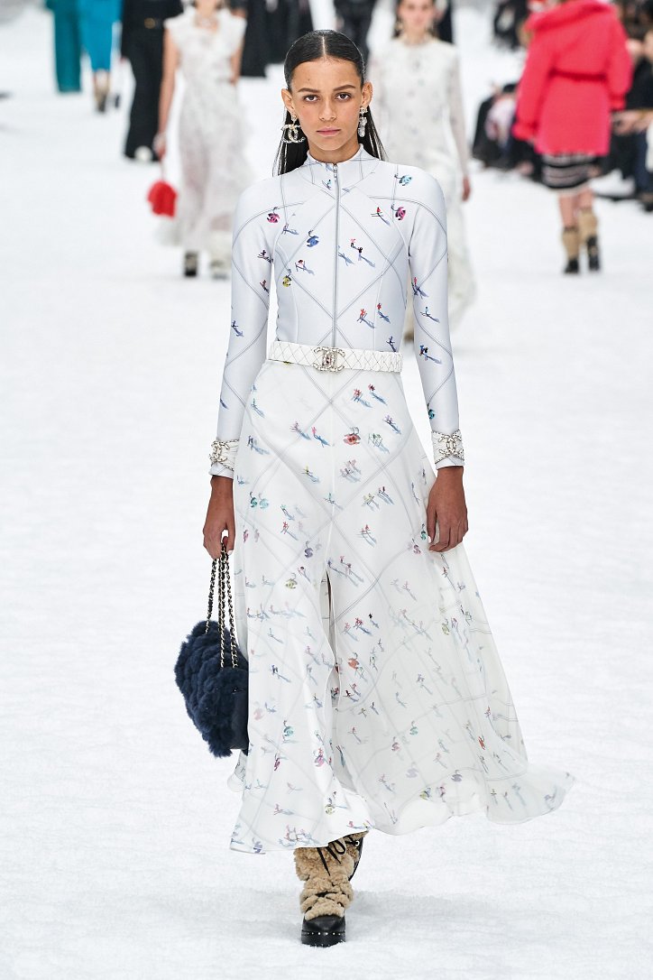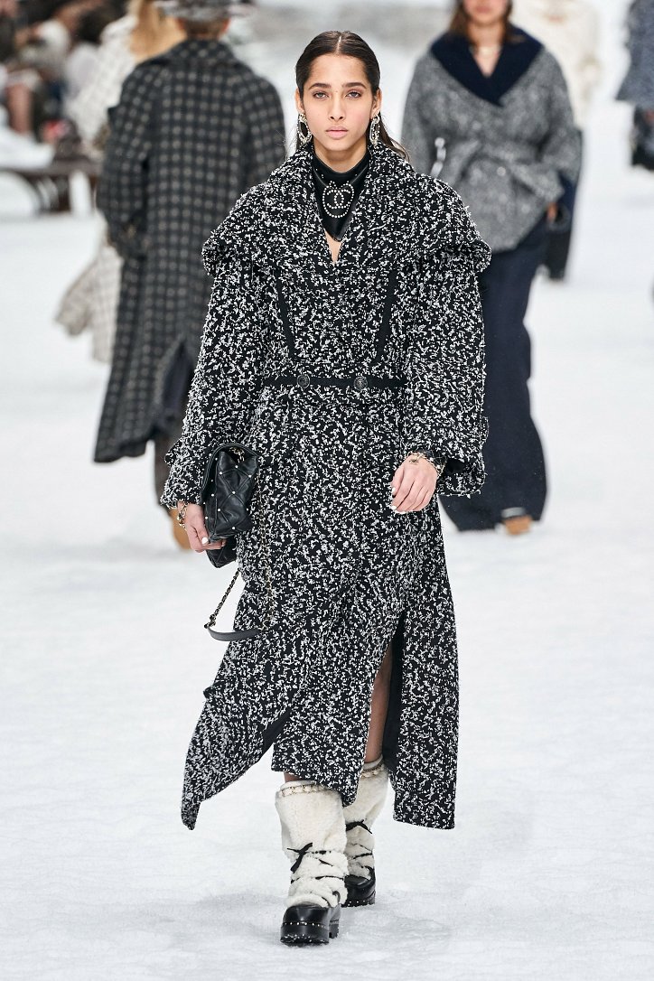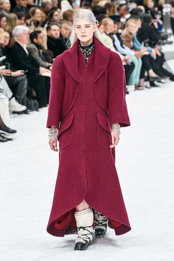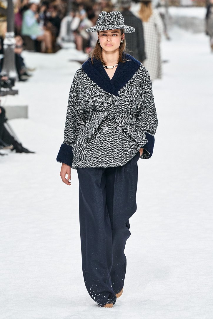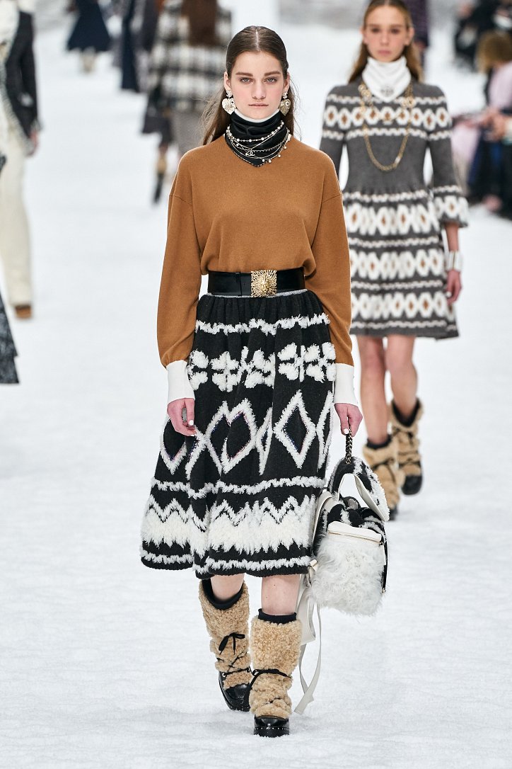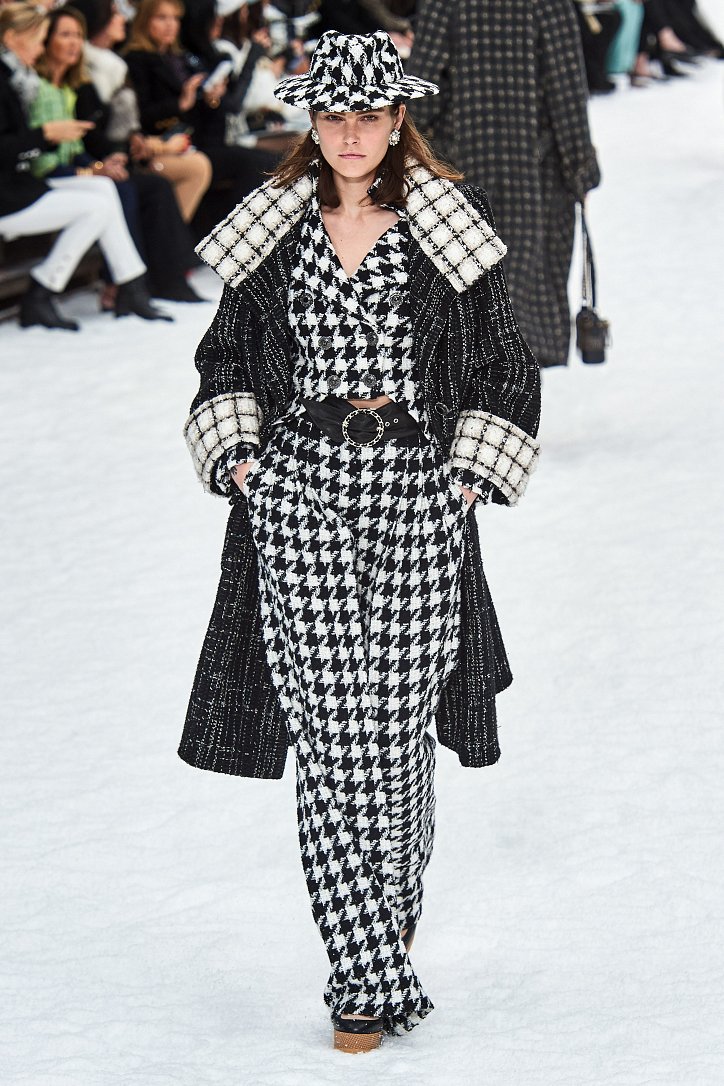 В последний раз гости шоу могли полюбоваться творениями, к созданию которых был причастен Лагерфельд. Своеобразное «прощание» состоялось на горнолыжном курорте: на фоне заснеженной альпийской деревни, деревянных шале и покрытых снегом елок модели демонстрировали анонсированную в прошлом году коллекцию Coco Neige. В ней есть все, что нужно для того, чтобы покататься на лыжах или отправиться на прогулку, а вечером посидеть у камина: вязаные кардиганы, шерстяные брюки и зимние юбки, яркие пуховики и пальто макси, обилие твида и всевозможной клетки, длинные кейпы и роскошные белые платья-мини – прекрасный наряд для встречи Нового года в горах.