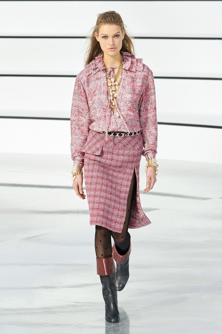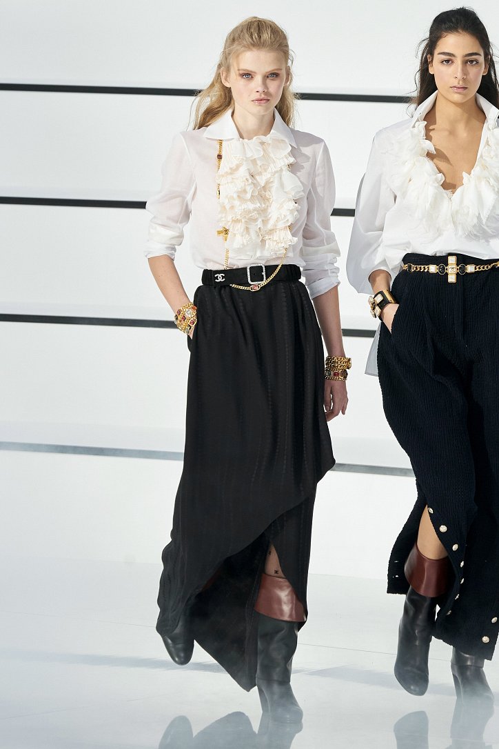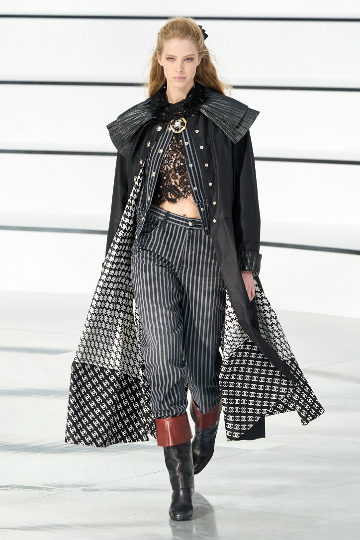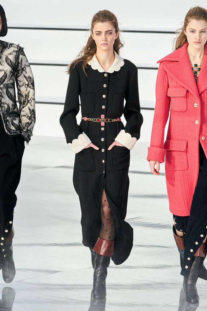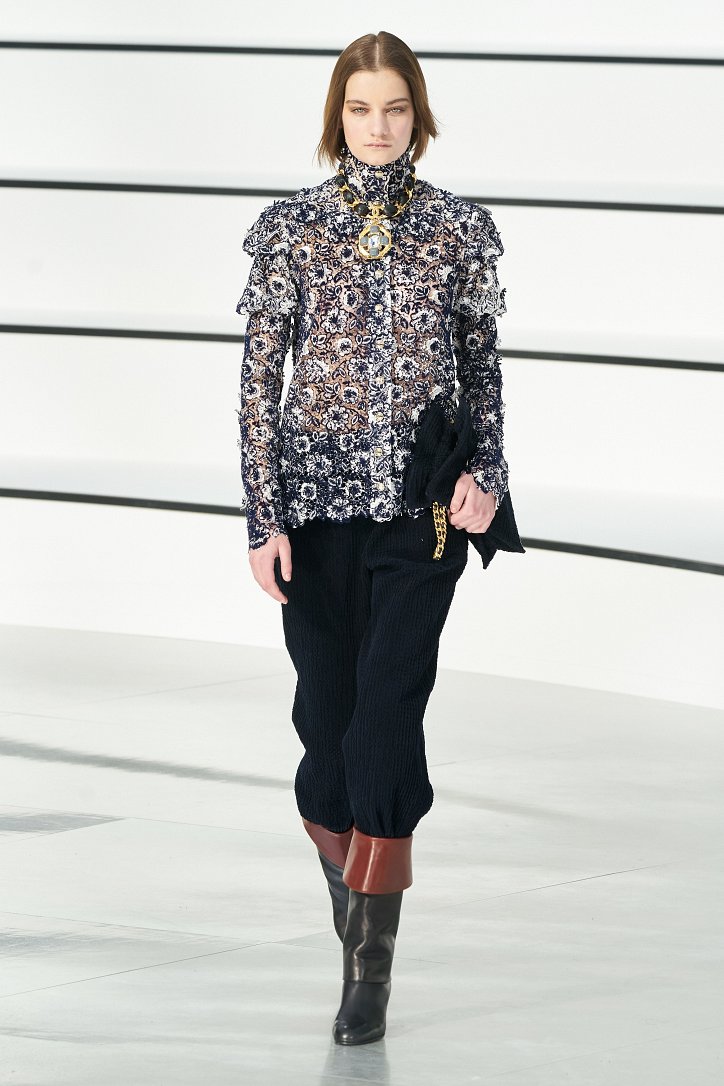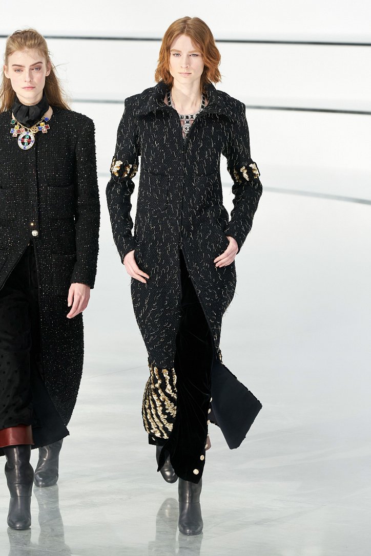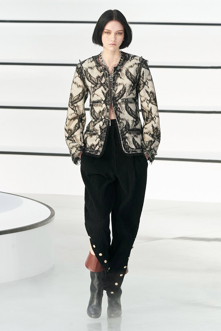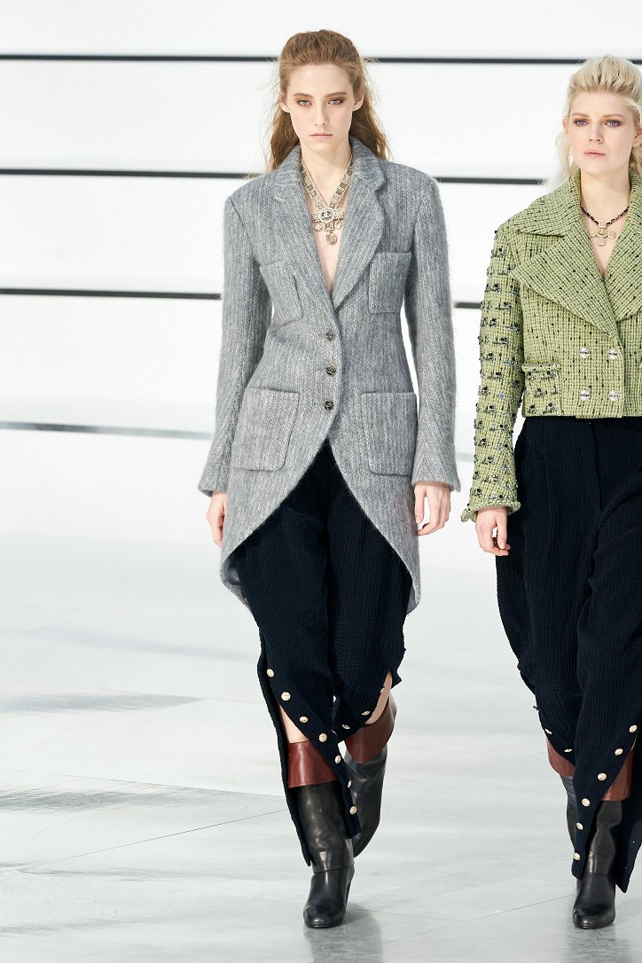 Благодаря страсти мадемуазель Коко к скачкам и образу Карла Лагерфельда, который запечатлен в сапогах для верховой езды и «утреннем» пиджаке с жилетом, в коллекции появилась череда легких и непринужденных образов. Юбки с высокими разрезами чередовались с брюками, которые расстегивались по боковым швам, длинные пальто с пуговицами только до пояса соседствовали с белыми свободными блузками, а твидовые жакеты – с кружевными топами.