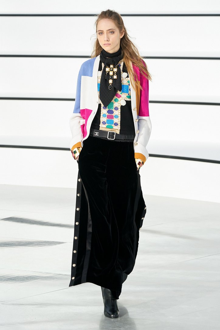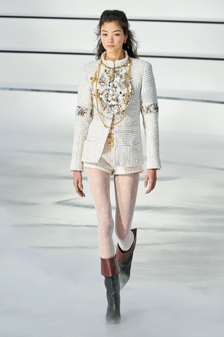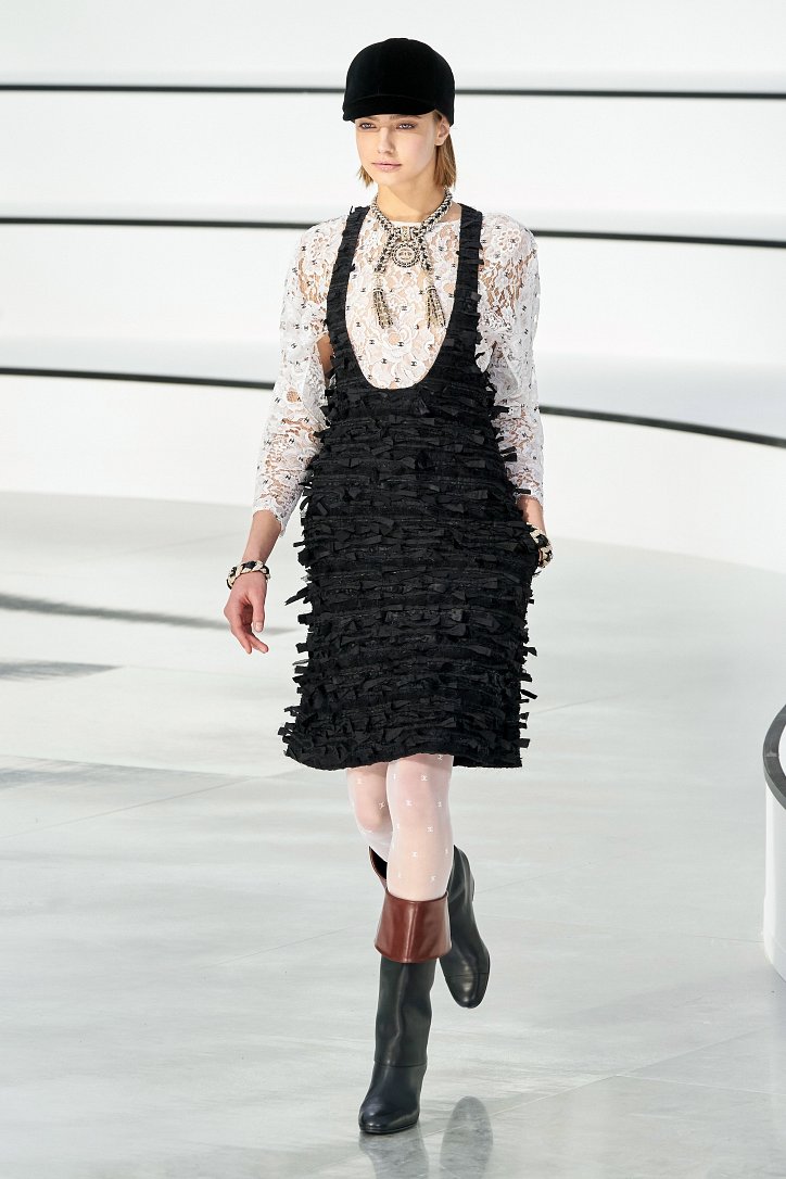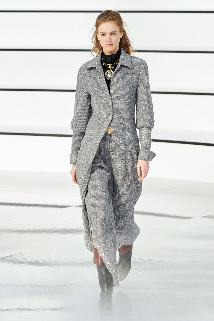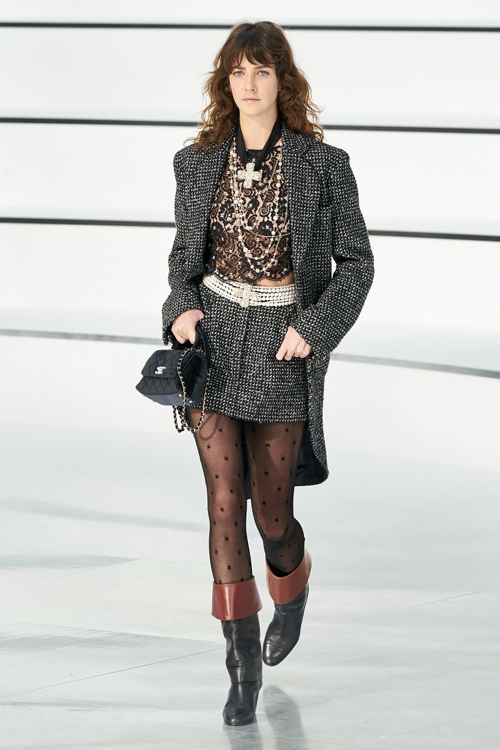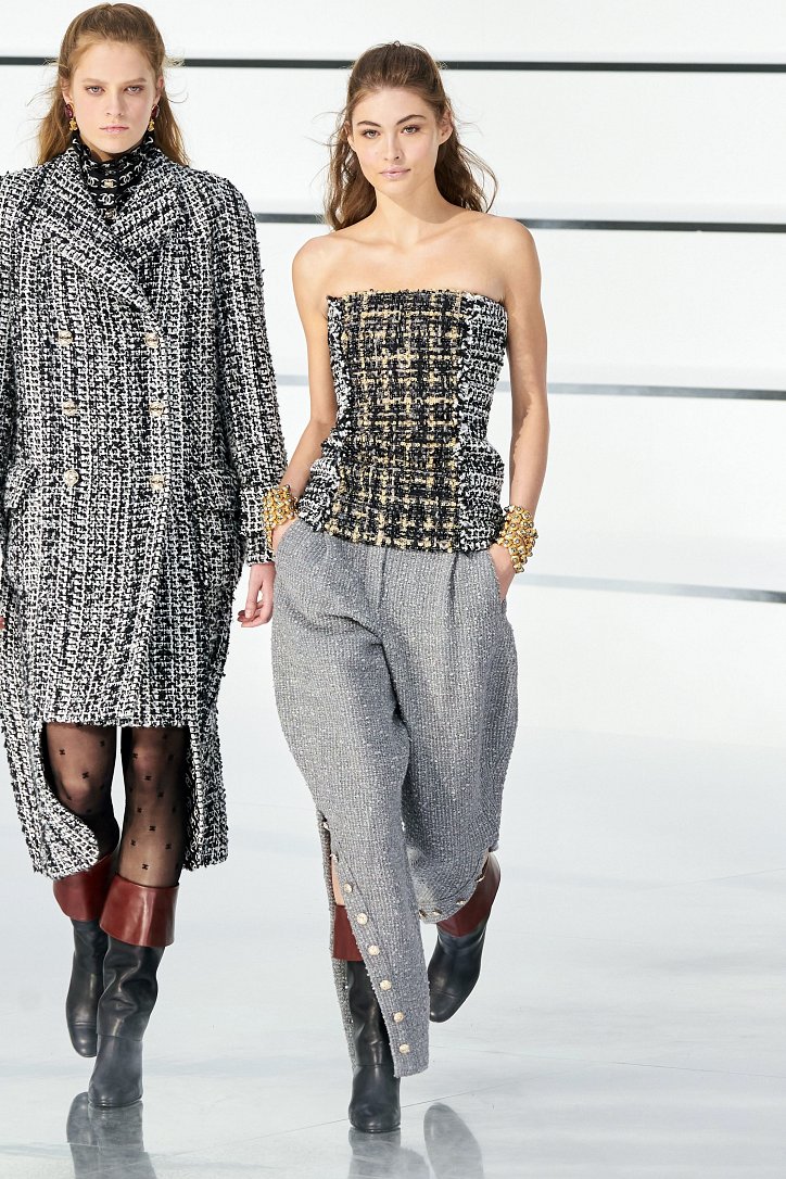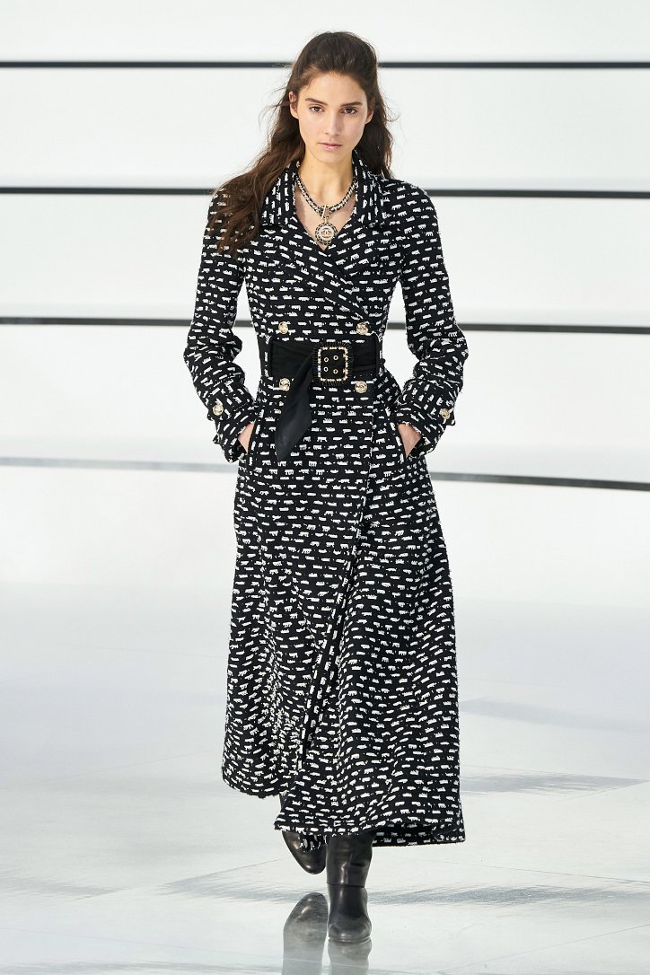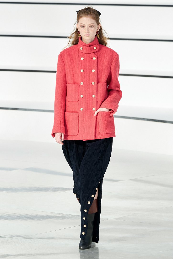 Благодаря страсти мадемуазель Коко к скачкам и образу Карла Лагерфельда, который запечатлен в сапогах для верховой езды и «утреннем» пиджаке с жилетом, в коллекции появилась череда легких и непринужденных образов. Юбки с высокими разрезами чередовались с брюками, которые расстегивались по боковым швам, длинные пальто с пуговицами только до пояса соседствовали с белыми свободными блузками, а твидовые жакеты – с кружевными топами.