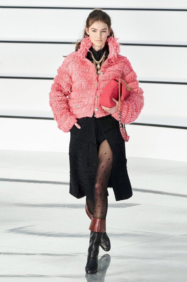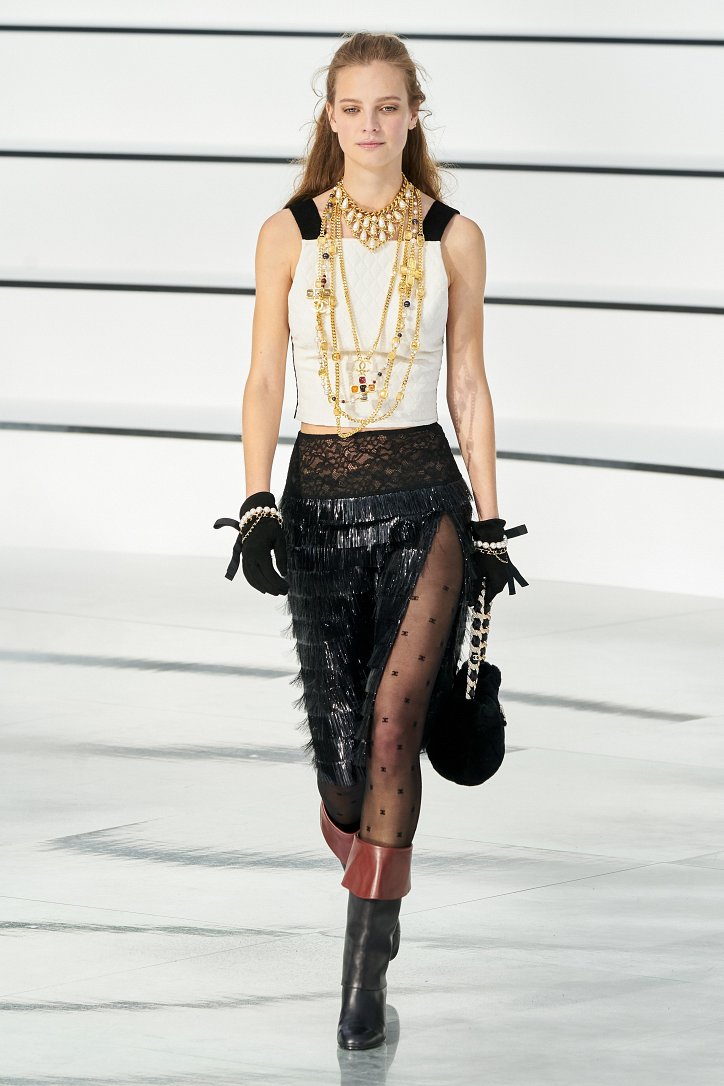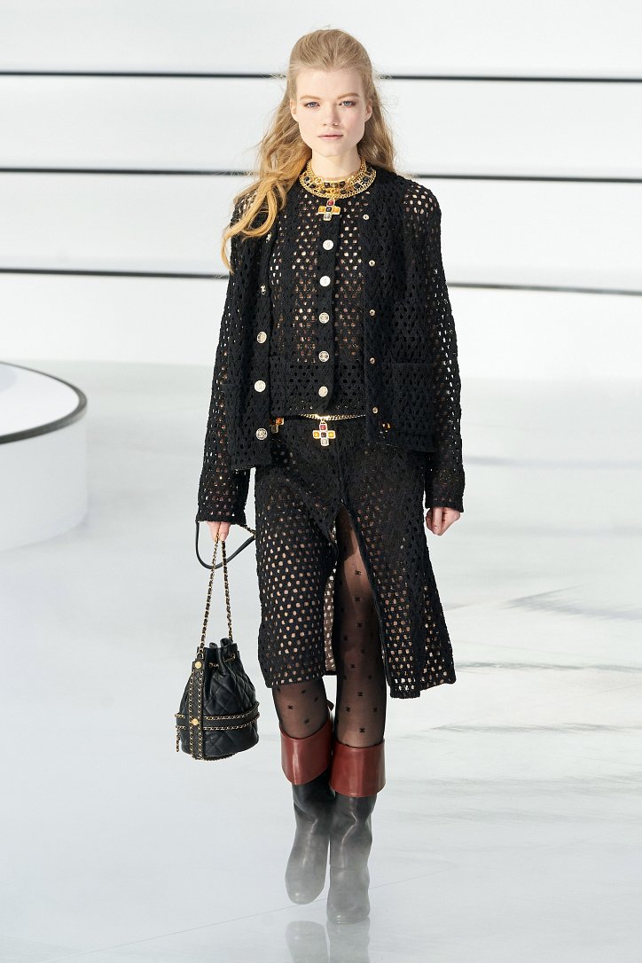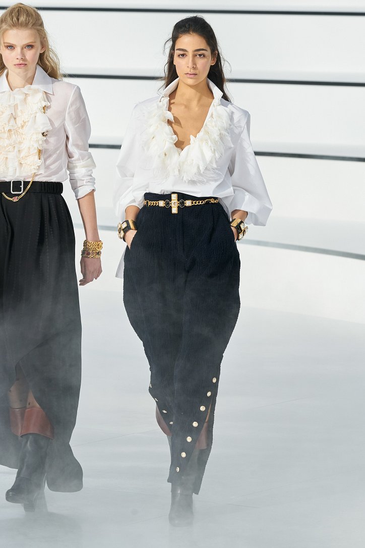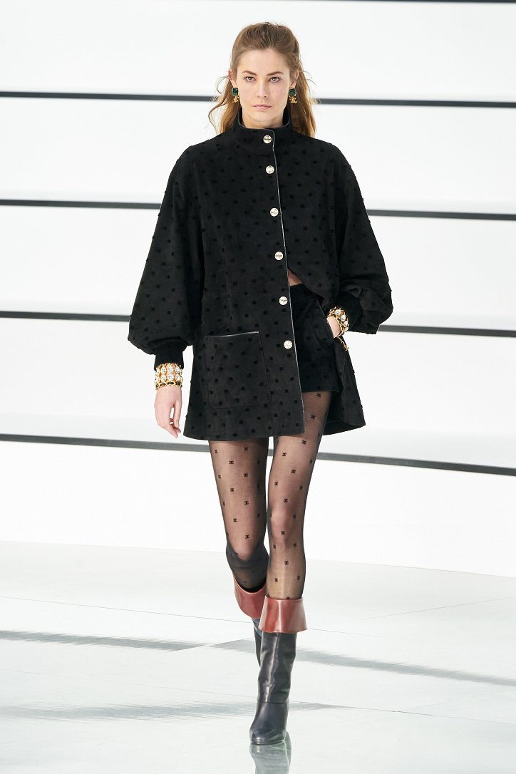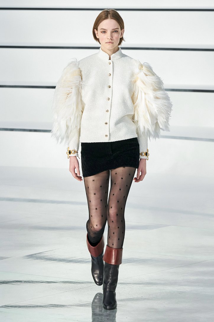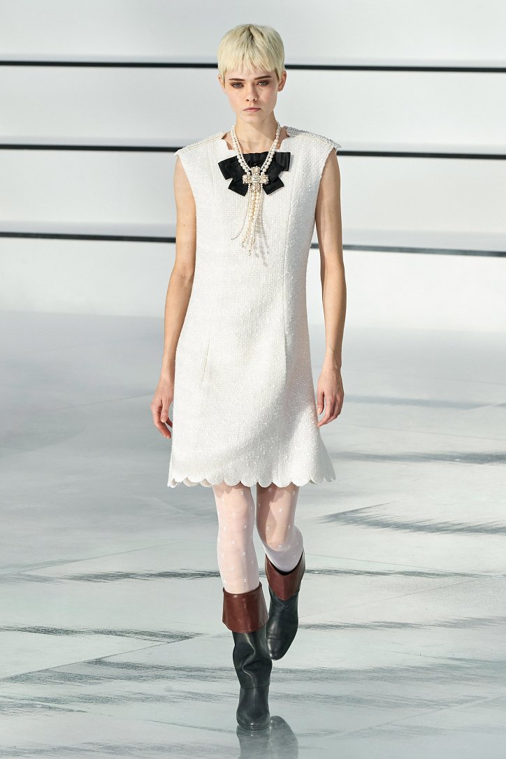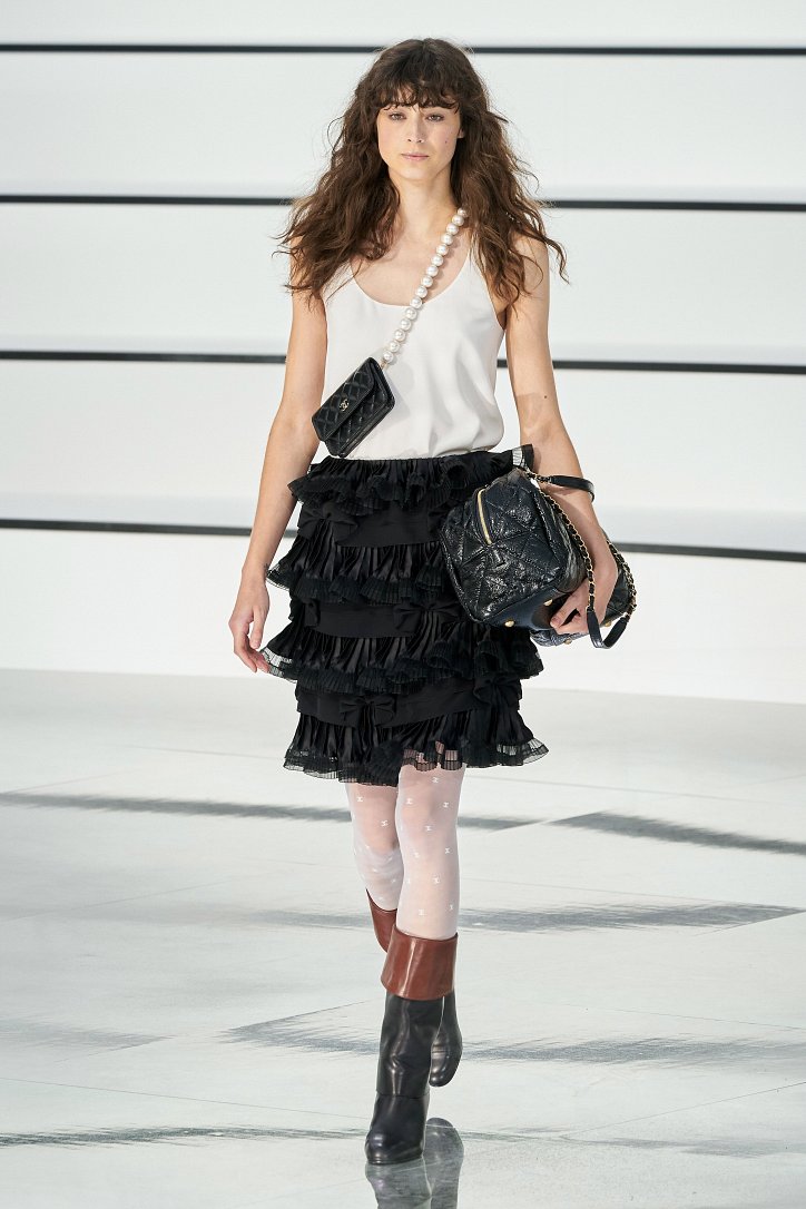 Благодаря страсти мадемуазель Коко к скачкам и образу Карла Лагерфельда, который запечатлен в сапогах для верховой езды и «утреннем» пиджаке с жилетом, в коллекции появилась череда легких и непринужденных образов. Юбки с высокими разрезами чередовались с брюками, которые расстегивались по боковым швам, длинные пальто с пуговицами только до пояса соседствовали с белыми свободными блузками, а твидовые жакеты – с кружевными топами.
