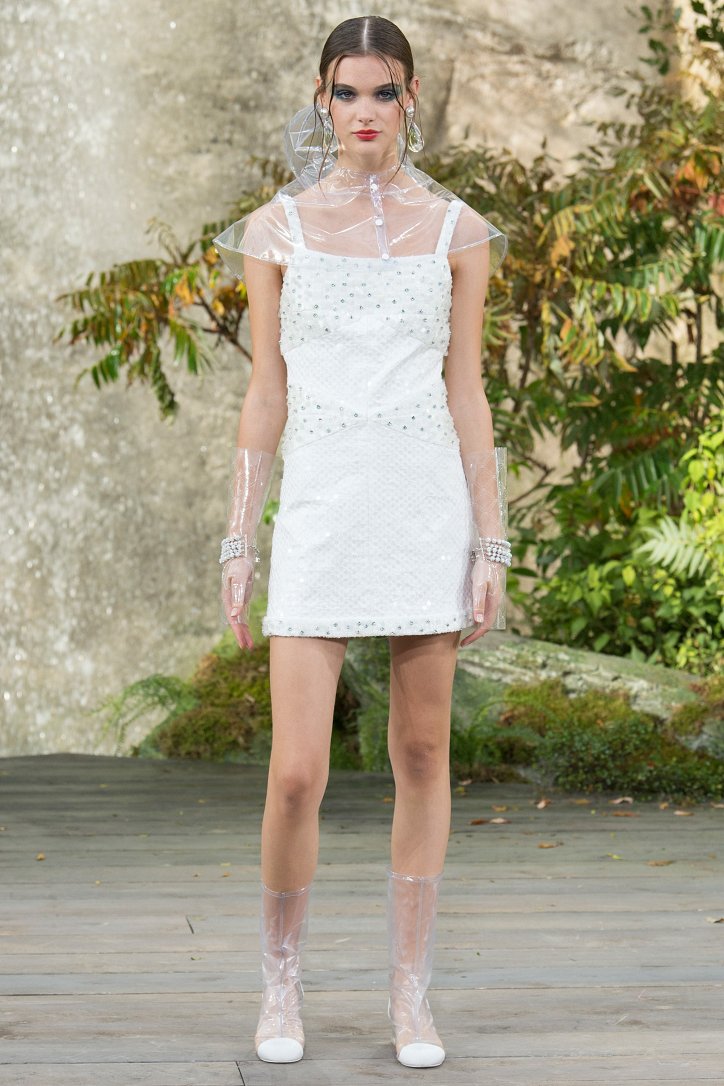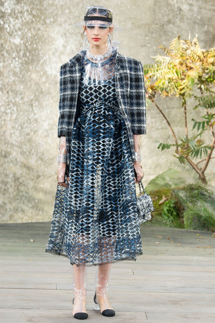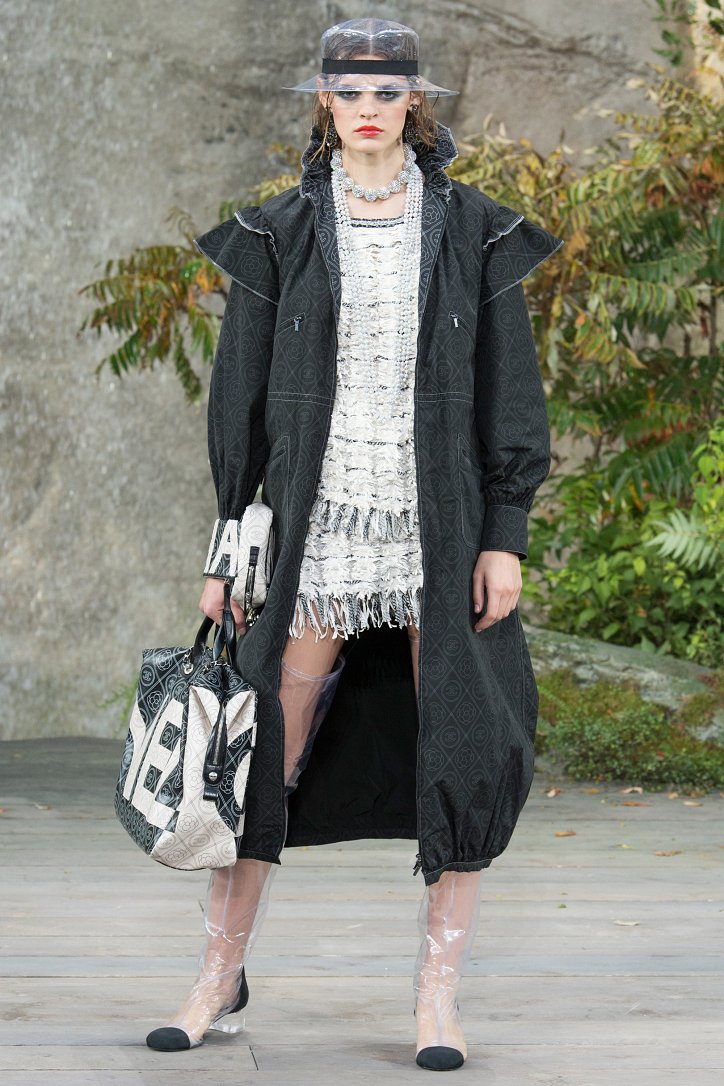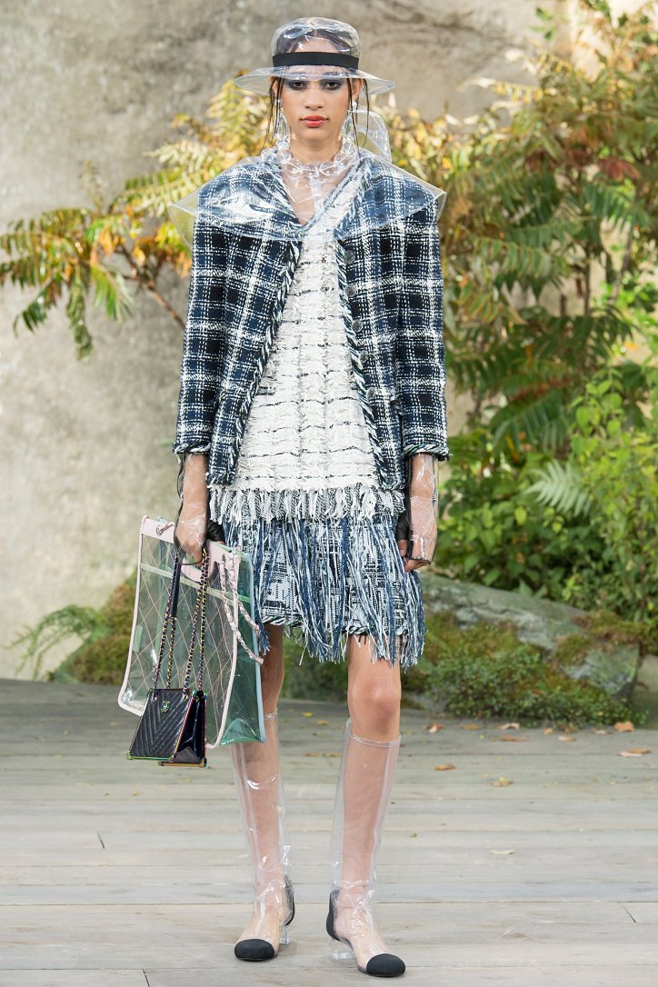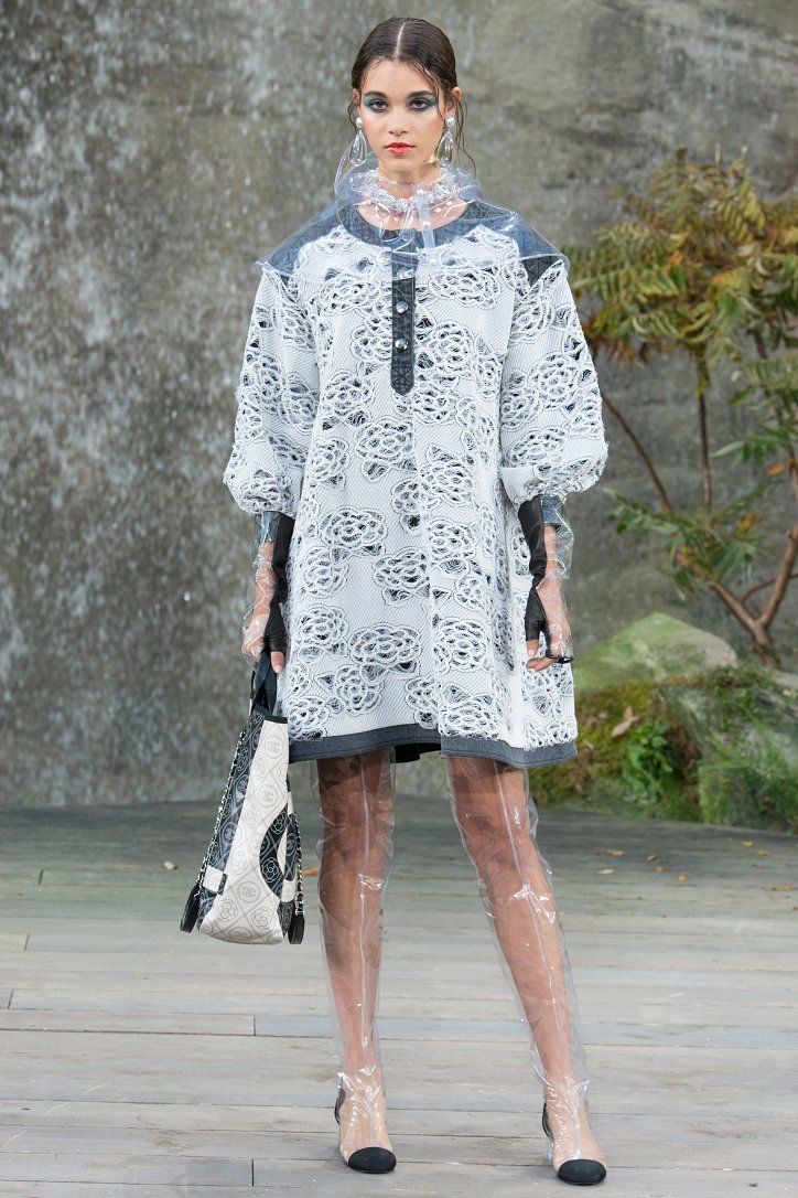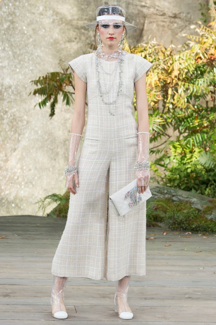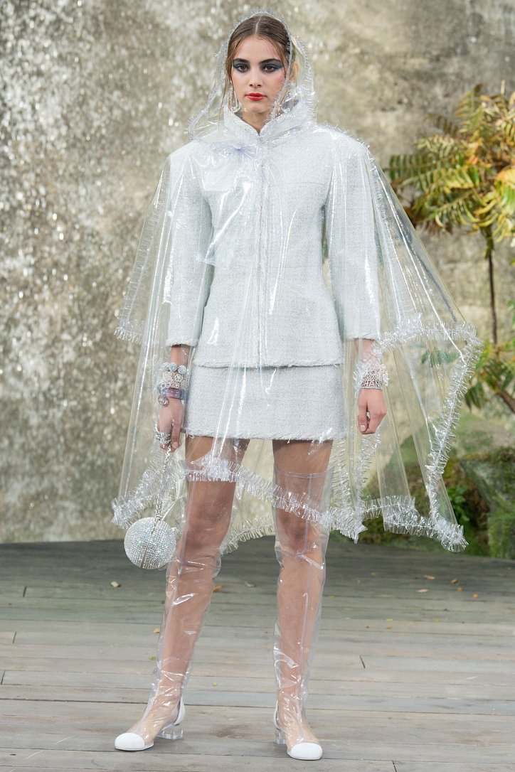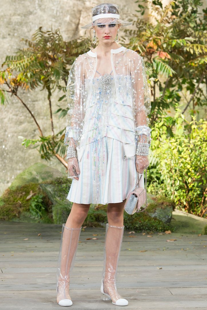 Вслед за Elie Saab в тропики позвал гостей и Карл Лагерфельд. Показ коллекции Chanel весна-лето 2018 прошел в настоящем тропическом лесу, в окружении 8-метровых скал и водопадов. Вероятно, чтобы брызги воды не намочили одежду, дизайнер и сделал акцент на прозрачные плащи-кейпы, шляпки-канотье и воротники-пелерины. Прозрачными были и сапоги-ботфорты, и объемные сумки-тоуты, и перчатки, а для защиты дамских сумочек дизайнер предложил оригинальные накидки-зонтики.
