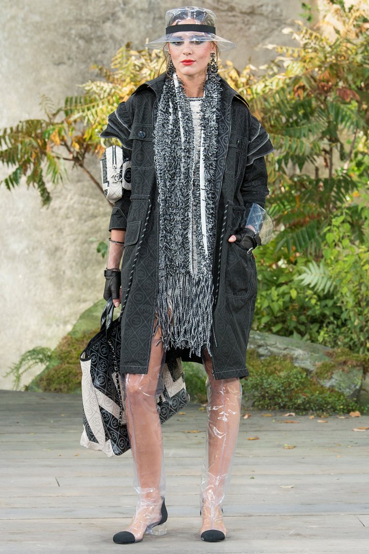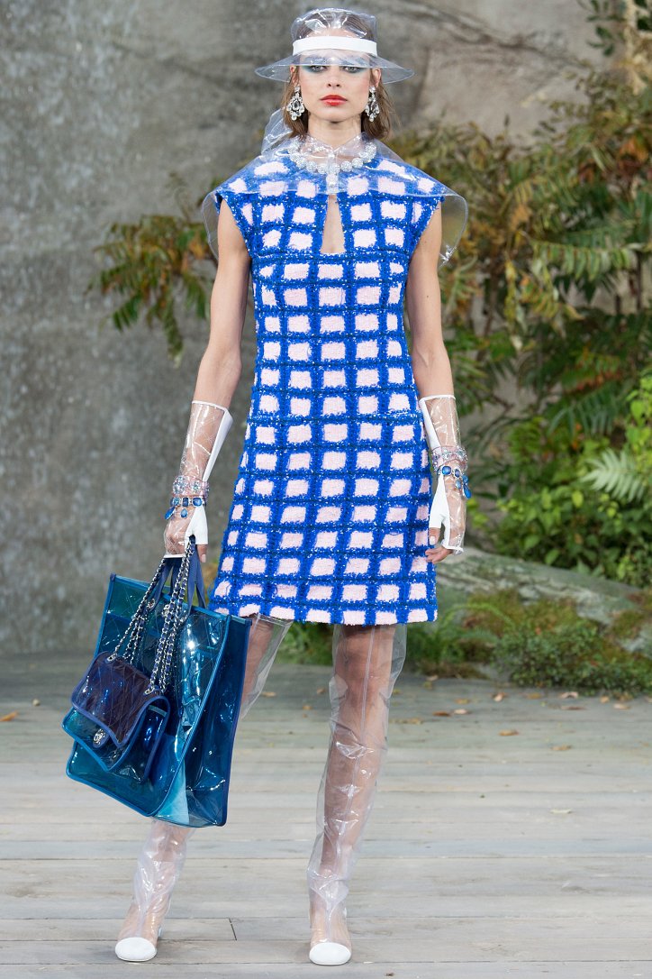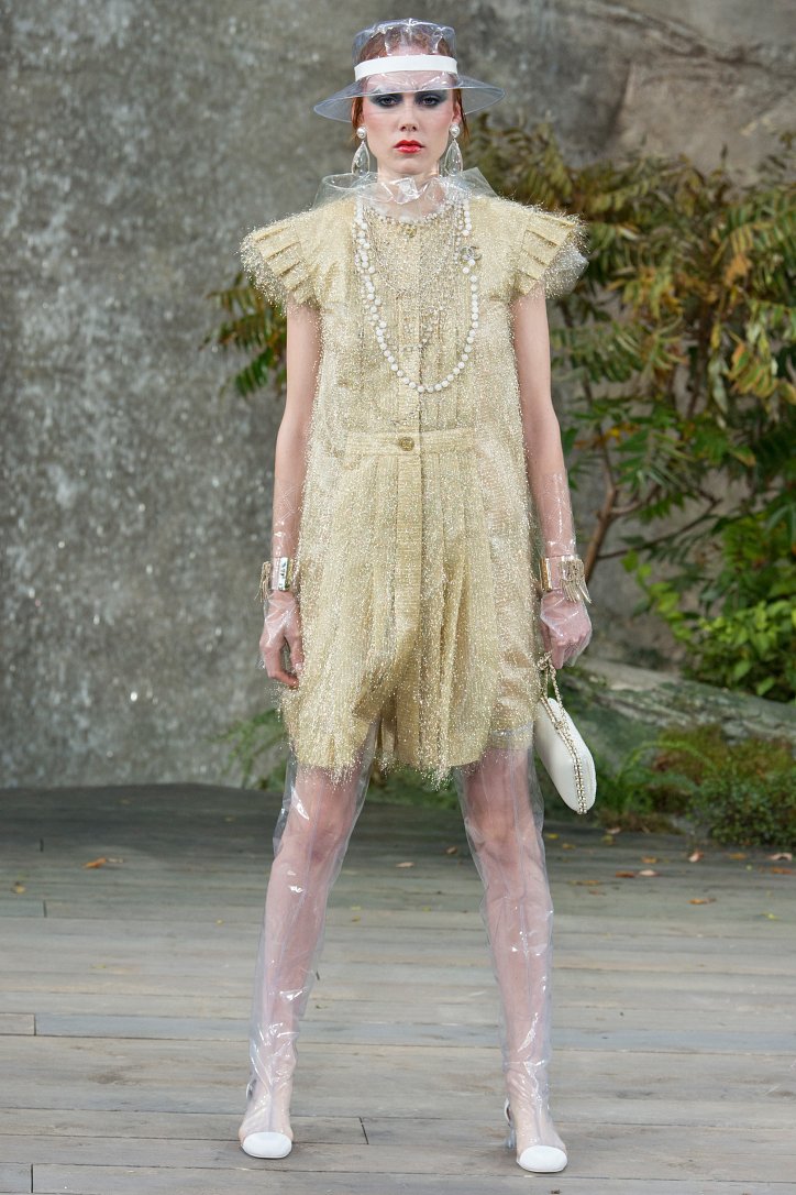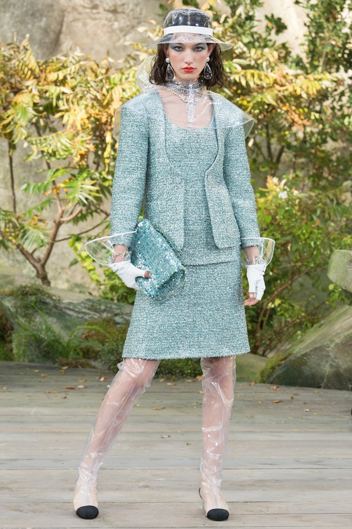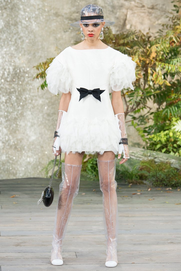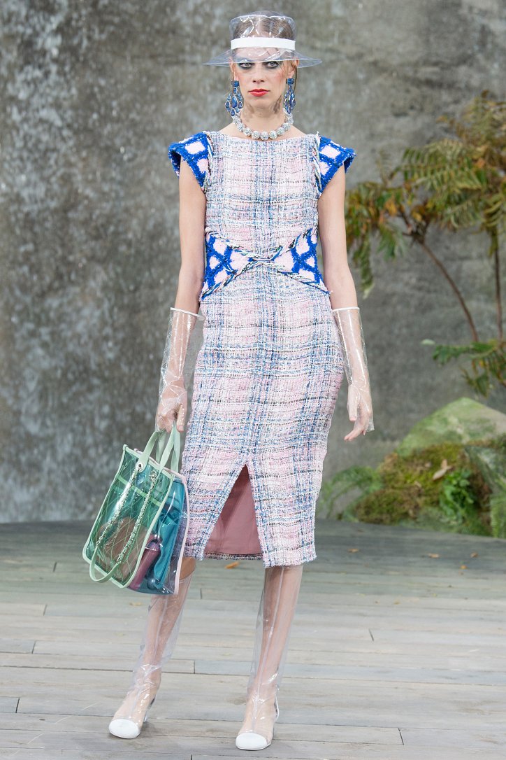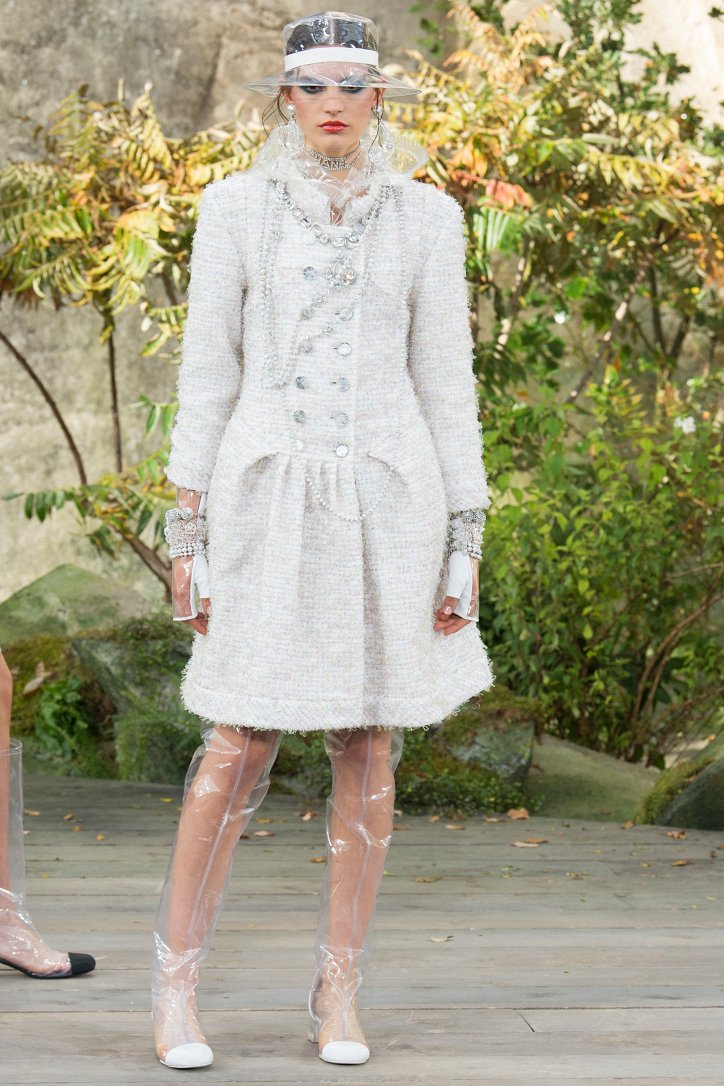 Вслед за Elie Saab в тропики позвал гостей и Карл Лагерфельд. Показ коллекции Chanel весна-лето 2018 прошел в настоящем тропическом лесу, в окружении 8-метровых скал и водопадов. Вероятно, чтобы брызги воды не намочили одежду, дизайнер и сделал акцент на прозрачные плащи-кейпы, шляпки-канотье и воротники-пелерины. Прозрачными были и сапоги-ботфорты, и объемные сумки-тоуты, и перчатки, а для защиты дамских сумочек дизайнер предложил оригинальные накидки-зонтики.