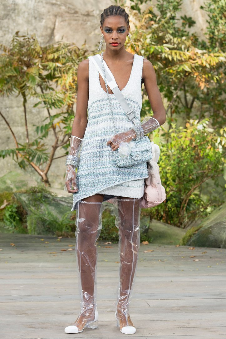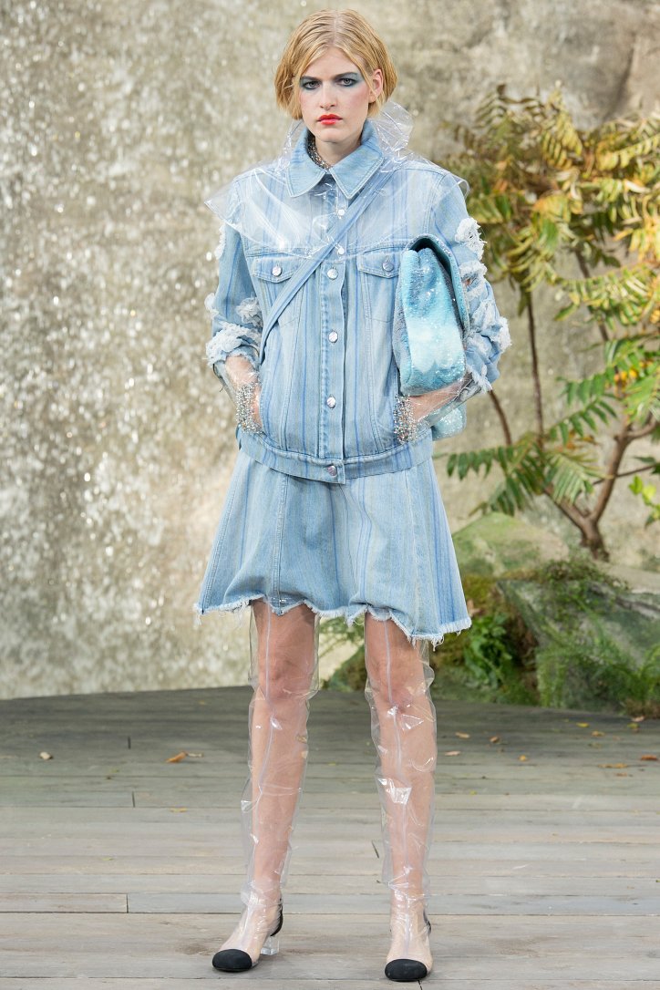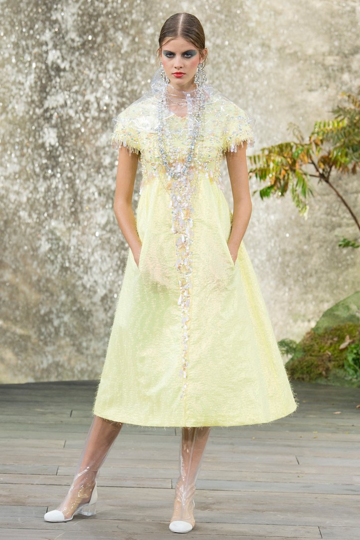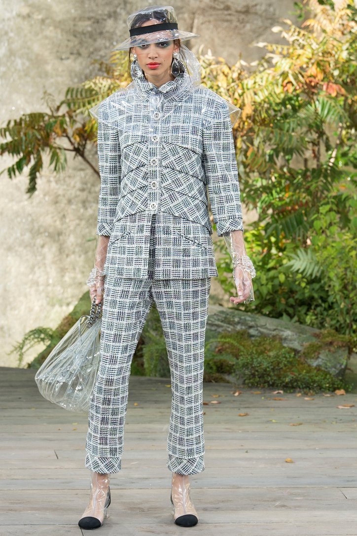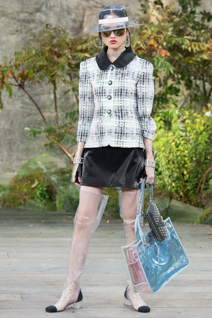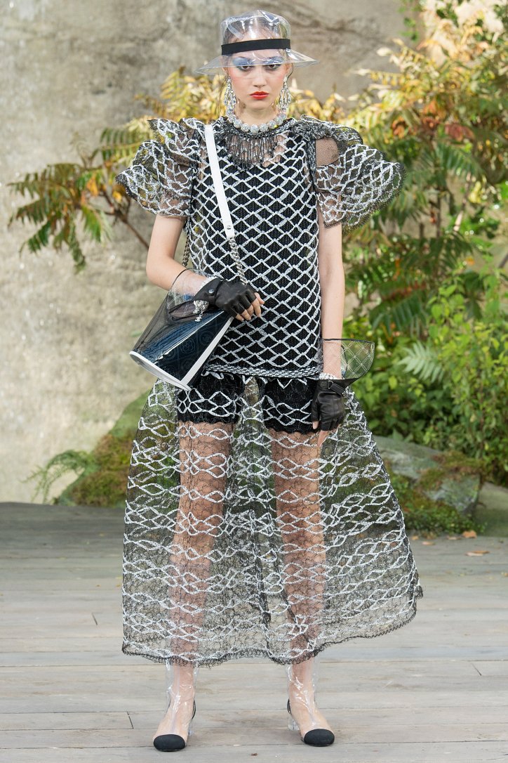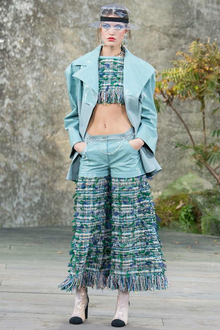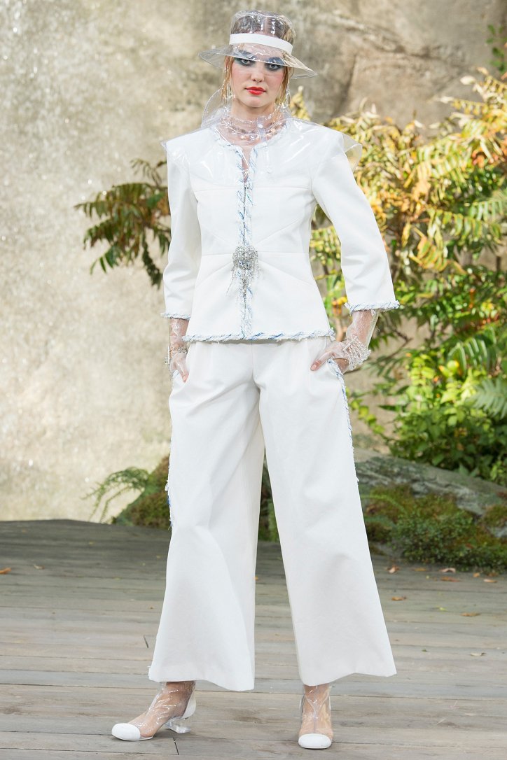 Вслед за Elie Saab в тропики позвал гостей и Карл Лагерфельд. Показ коллекции Chanel весна-лето 2018 прошел в настоящем тропическом лесу, в окружении 8-метровых скал и водопадов. Вероятно, чтобы брызги воды не намочили одежду, дизайнер и сделал акцент на прозрачные плащи-кейпы, шляпки-канотье и воротники-пелерины. Прозрачными были и сапоги-ботфорты, и объемные сумки-тоуты, и перчатки, а для защиты дамских сумочек дизайнер предложил оригинальные накидки-зонтики.