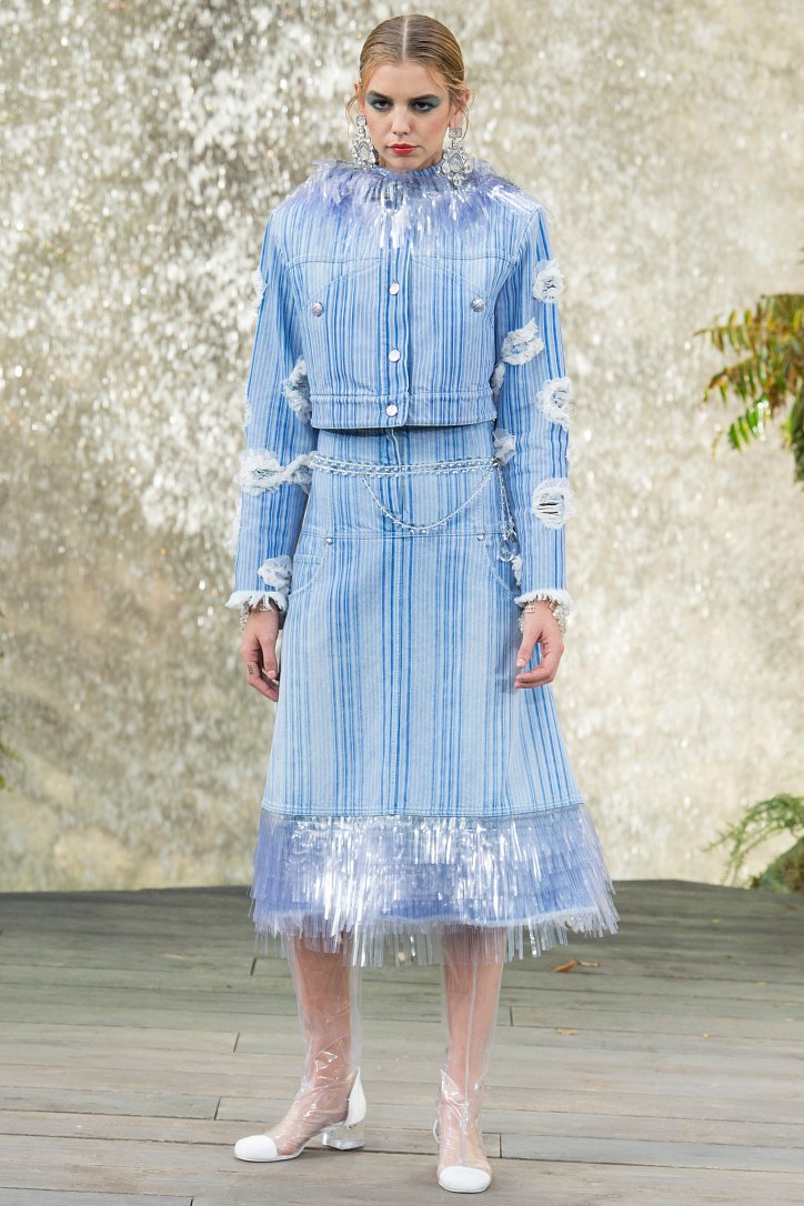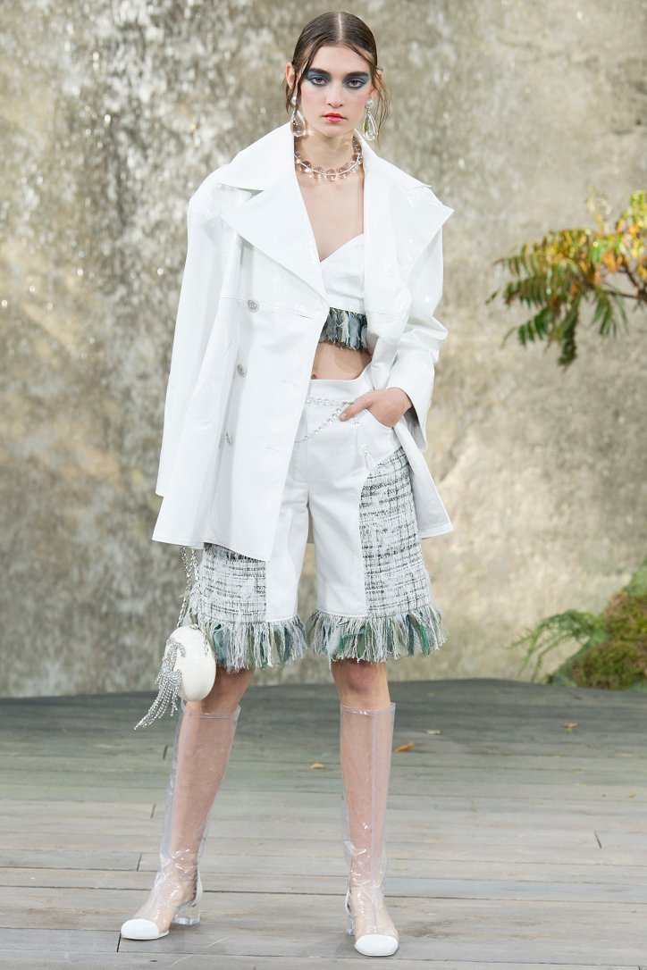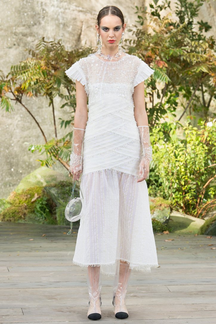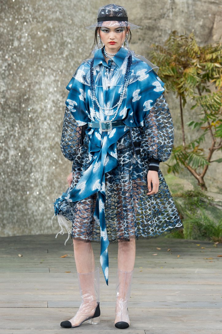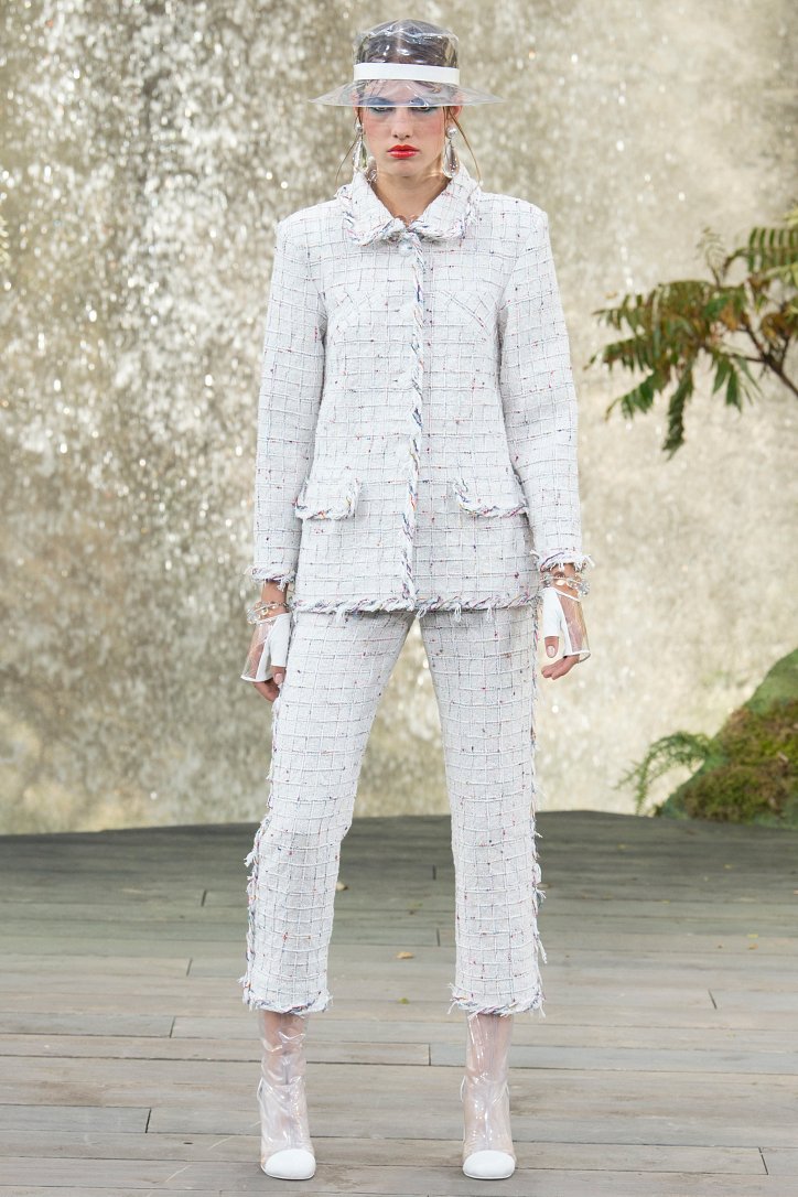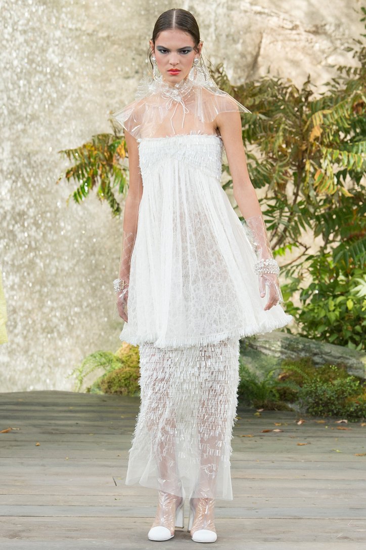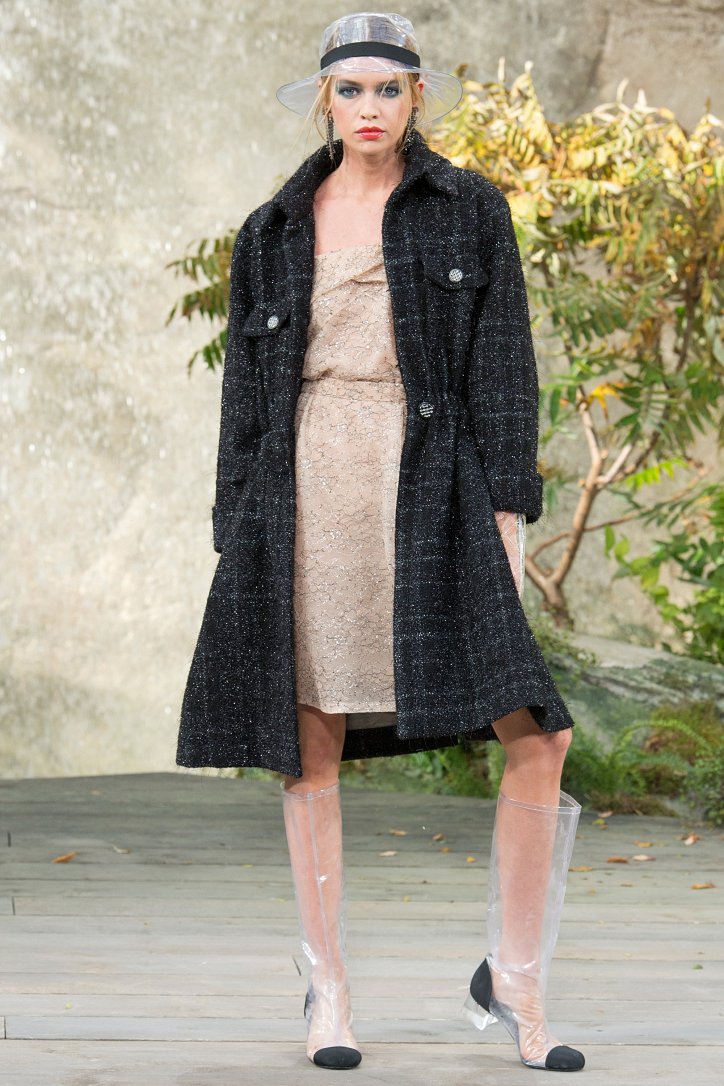 Вслед за Elie Saab в тропики позвал гостей и Карл Лагерфельд. Показ коллекции Chanel весна-лето 2018 прошел в настоящем тропическом лесу, в окружении 8-метровых скал и водопадов. Вероятно, чтобы брызги воды не намочили одежду, дизайнер и сделал акцент на прозрачные плащи-кейпы, шляпки-канотье и воротники-пелерины. Прозрачными были и сапоги-ботфорты, и объемные сумки-тоуты, и перчатки, а для защиты дамских сумочек дизайнер предложил оригинальные накидки-зонтики.