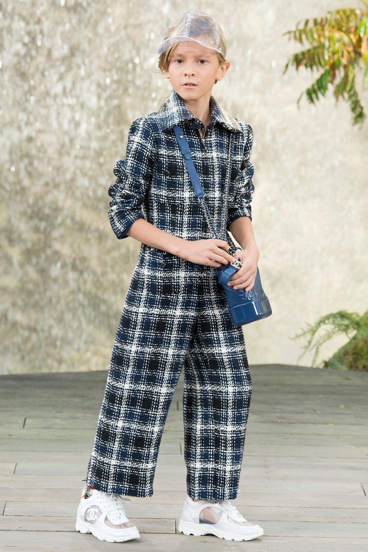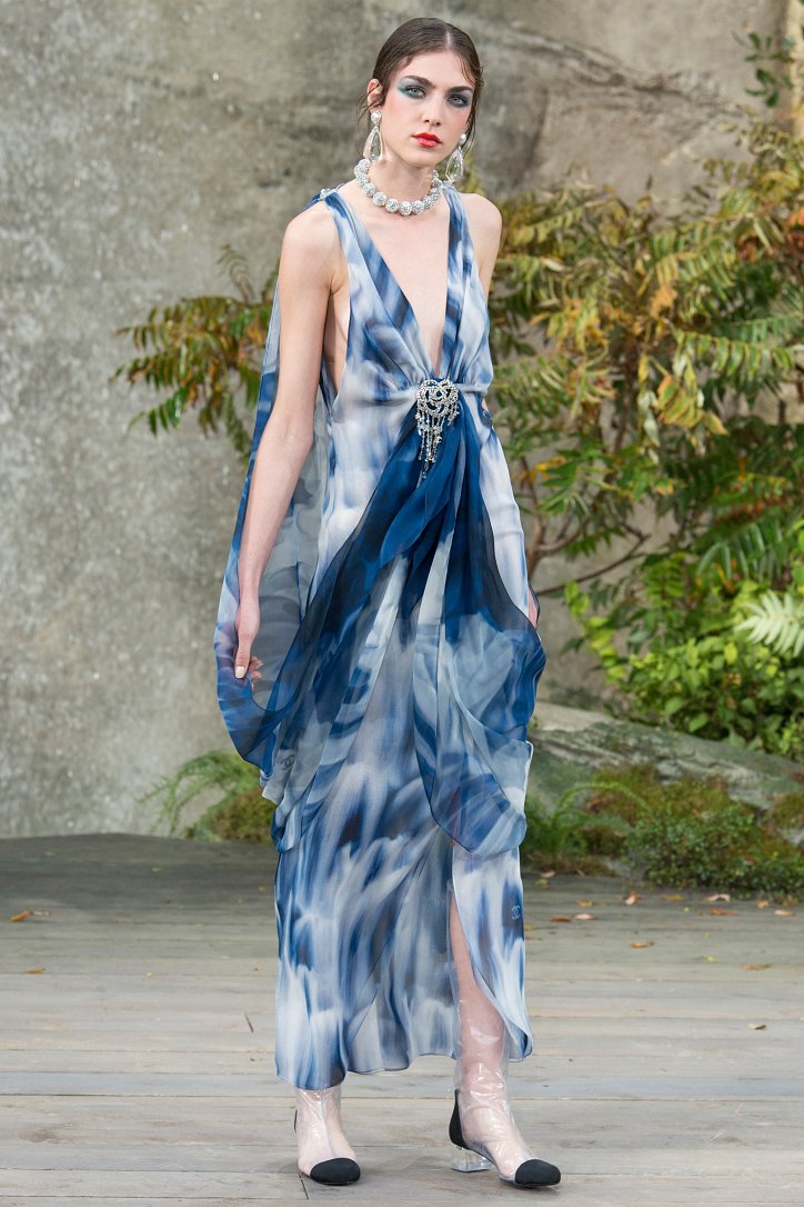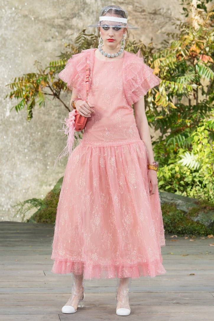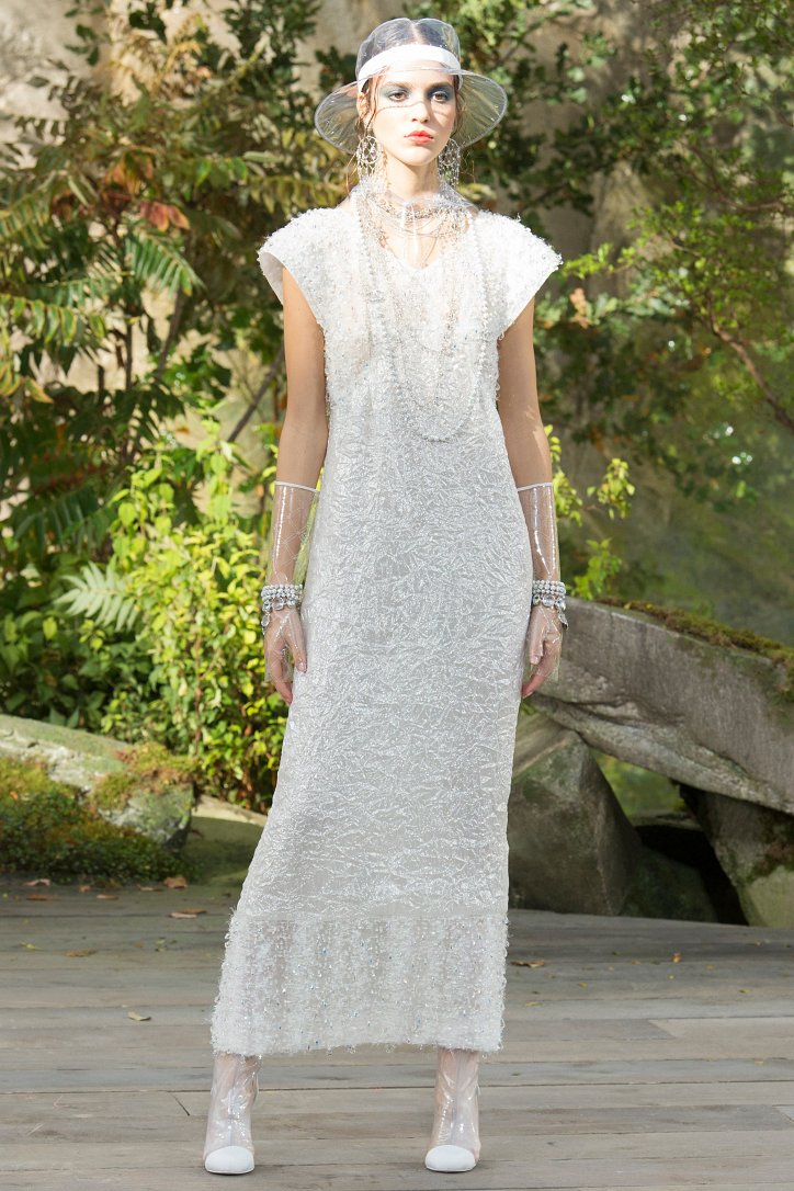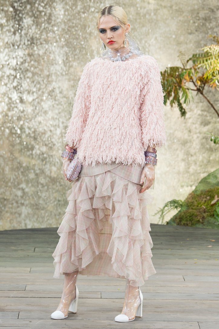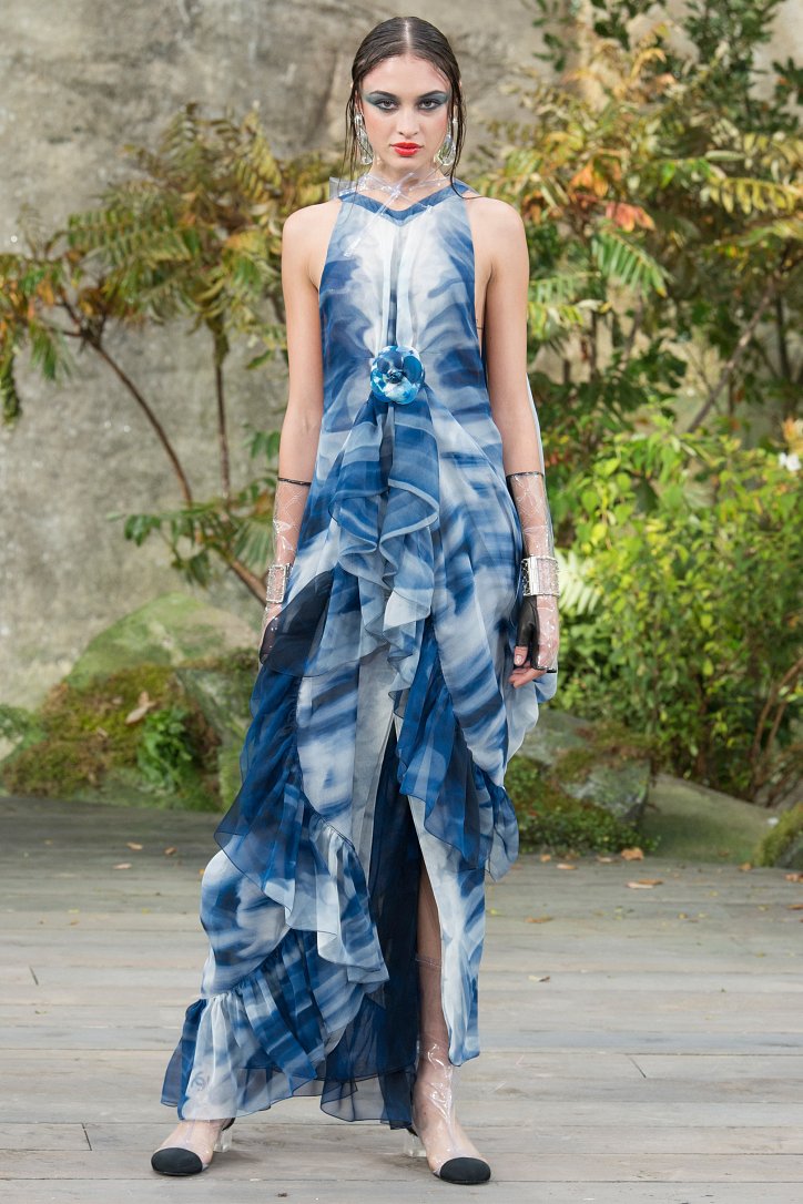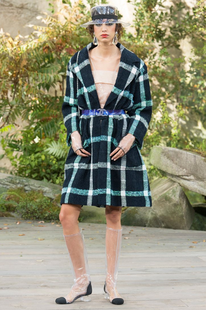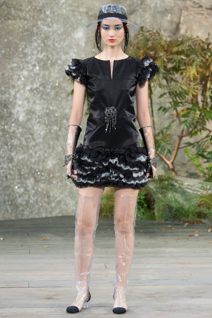 Вслед за Elie Saab в тропики позвал гостей и Карл Лагерфельд. Показ коллекции Chanel весна-лето 2018 прошел в настоящем тропическом лесу, в окружении 8-метровых скал и водопадов. Вероятно, чтобы брызги воды не намочили одежду, дизайнер и сделал акцент на прозрачные плащи-кейпы, шляпки-канотье и воротники-пелерины. Прозрачными были и сапоги-ботфорты, и объемные сумки-тоуты, и перчатки, а для защиты дамских сумочек дизайнер предложил оригинальные накидки-зонтики.