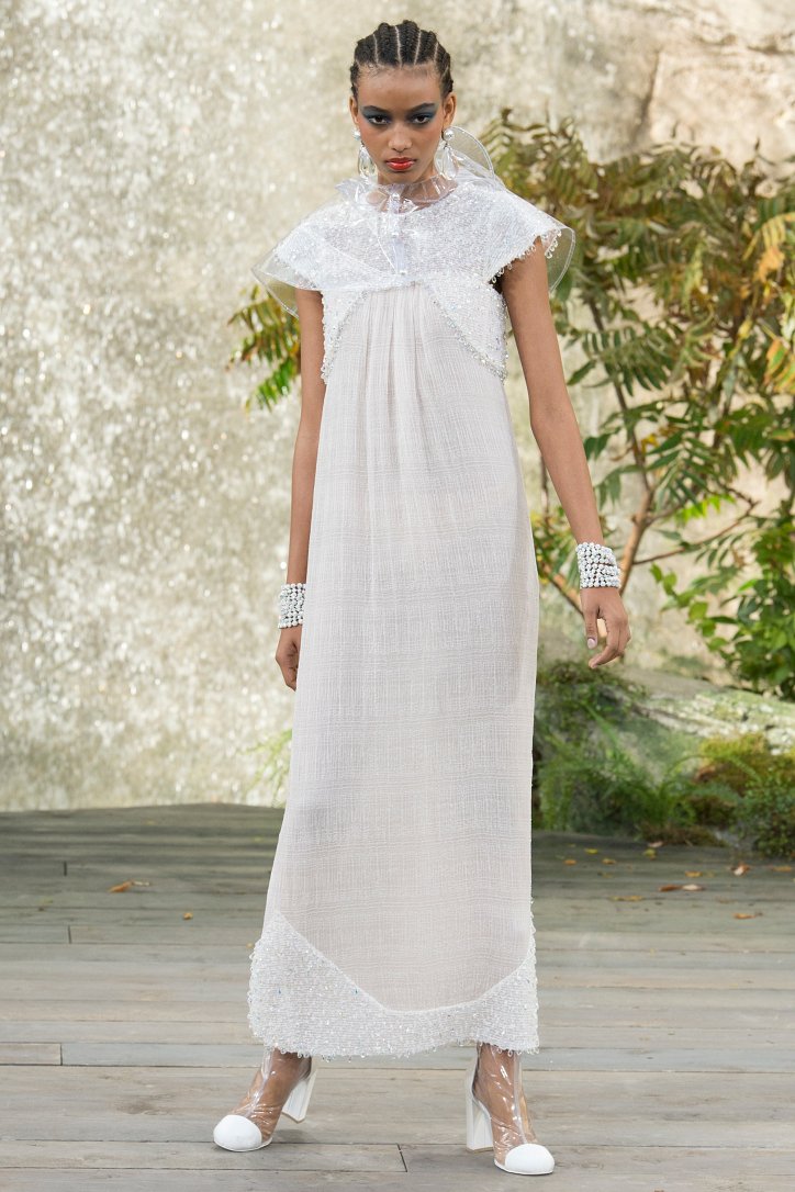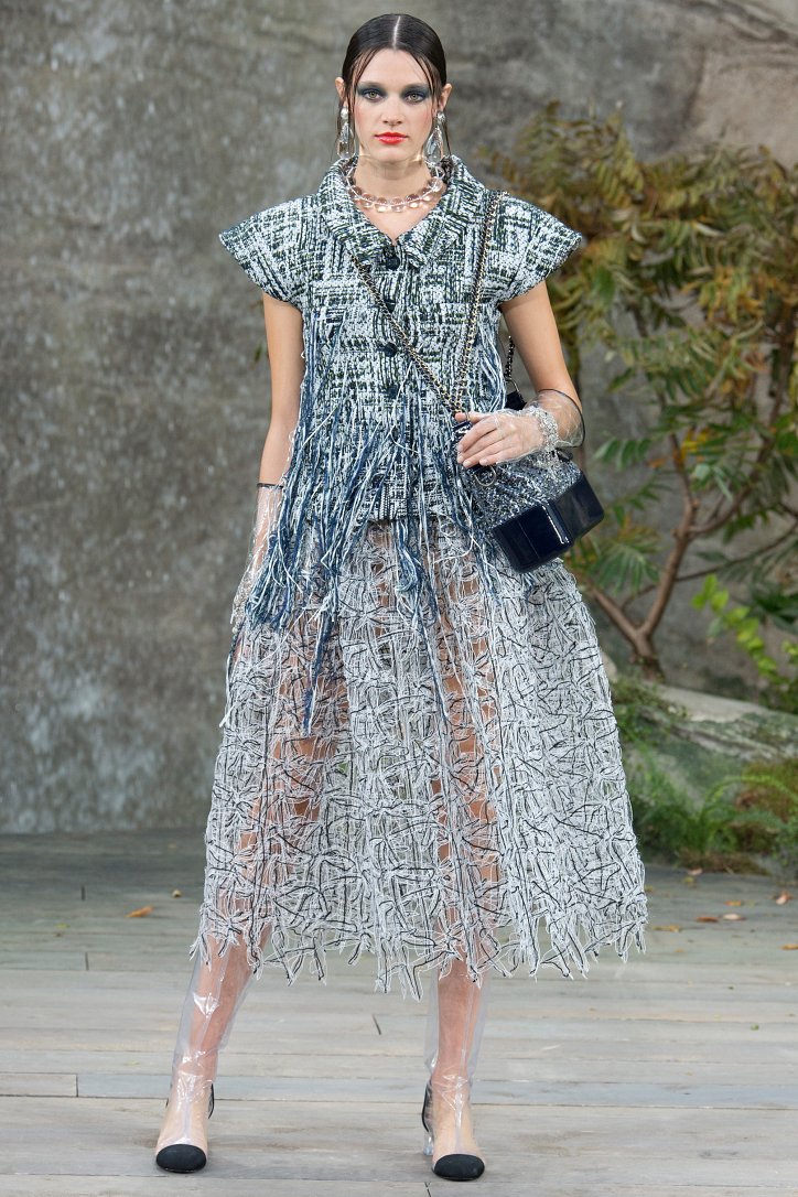 На обошлось и без традиционных «шанелевских» твидовых костюмов, целой линейки белых мини и макси-платьев, широких брюк и платьев с прозрачными колоколообразными юбками. Дополняли образы массивные колье, серьги и браслеты.
