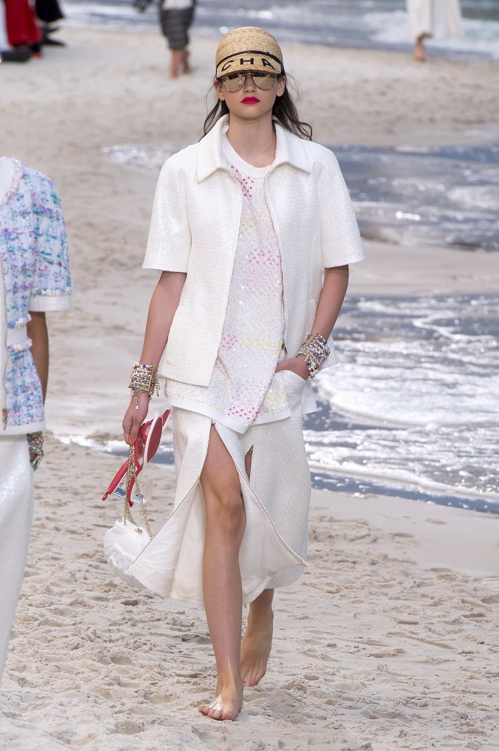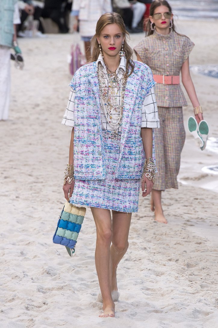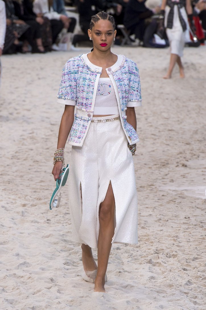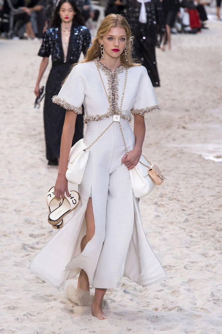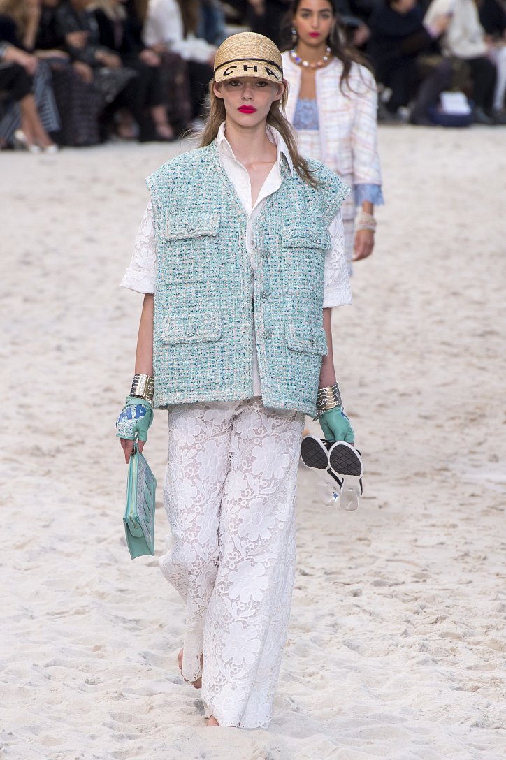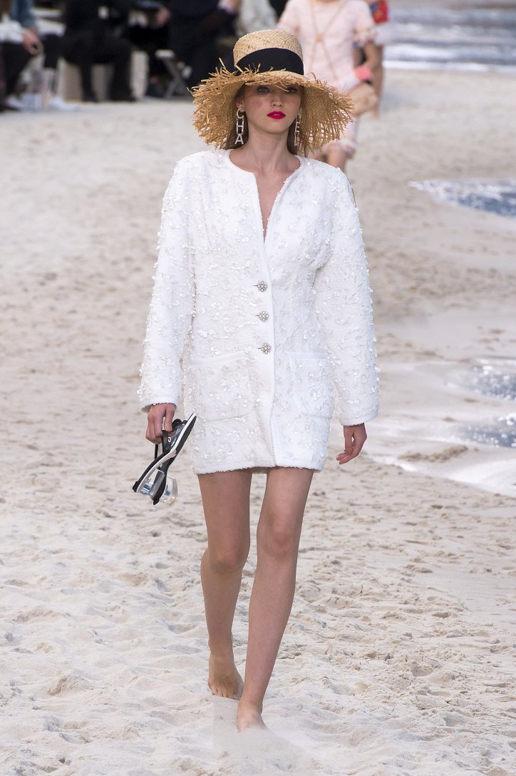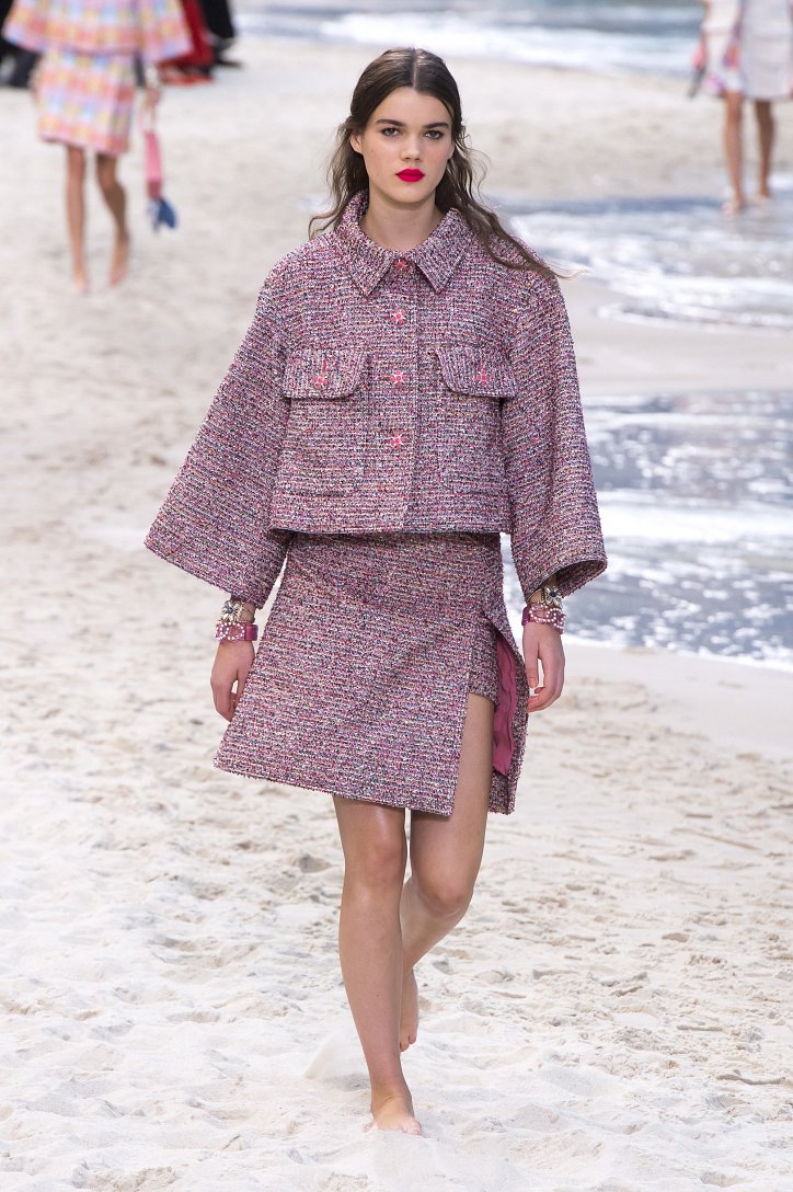 Показы Chanel – это всегда интрига. Карл Лагерфельд не устает удивлять публику выбором локаций для дефиле. Вот и новую коллекцию Chanel он решил показать… на пляже, который соорудили прямо в Grand Palais! Модели, взяв в руки мюли с прозрачными каблуками, с наслаждением дефилировали босиком по белоснежному песку, на который набегали волны пусть даже и ненастоящего океана.
