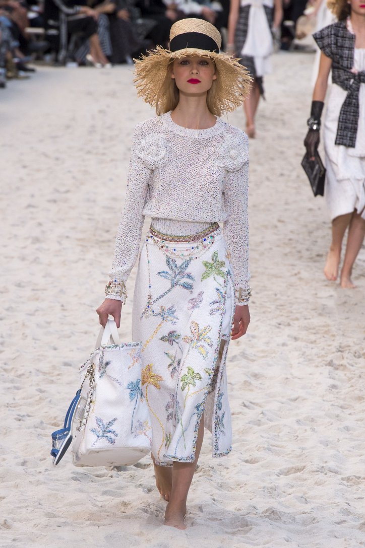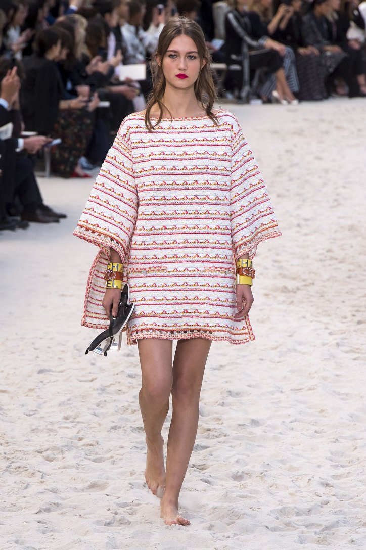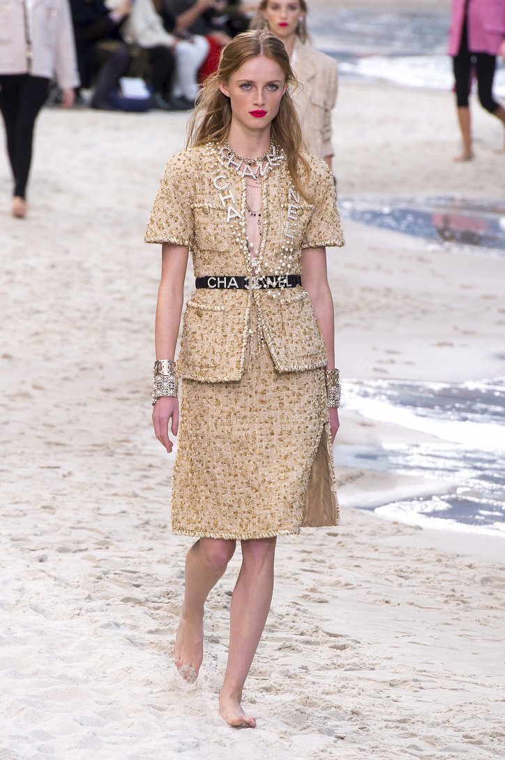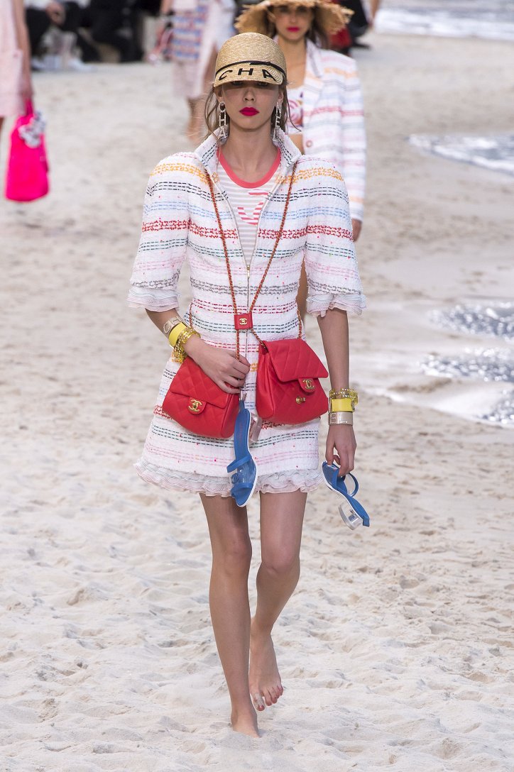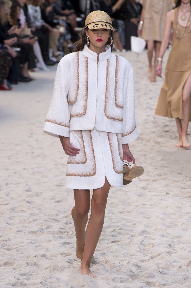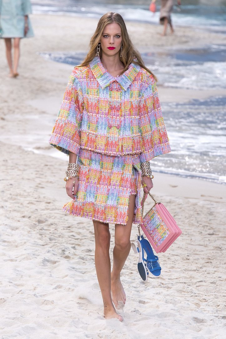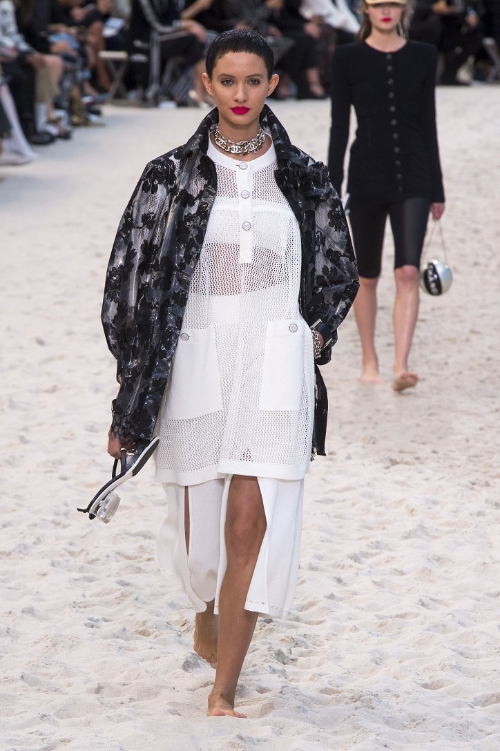 Показы Chanel – это всегда интрига. Карл Лагерфельд не устает удивлять публику выбором локаций для дефиле. Вот и новую коллекцию Chanel он решил показать… на пляже, который соорудили прямо в Grand Palais! Модели, взяв в руки мюли с прозрачными каблуками, с наслаждением дефилировали босиком по белоснежному песку, на который набегали волны пусть даже и ненастоящего океана.