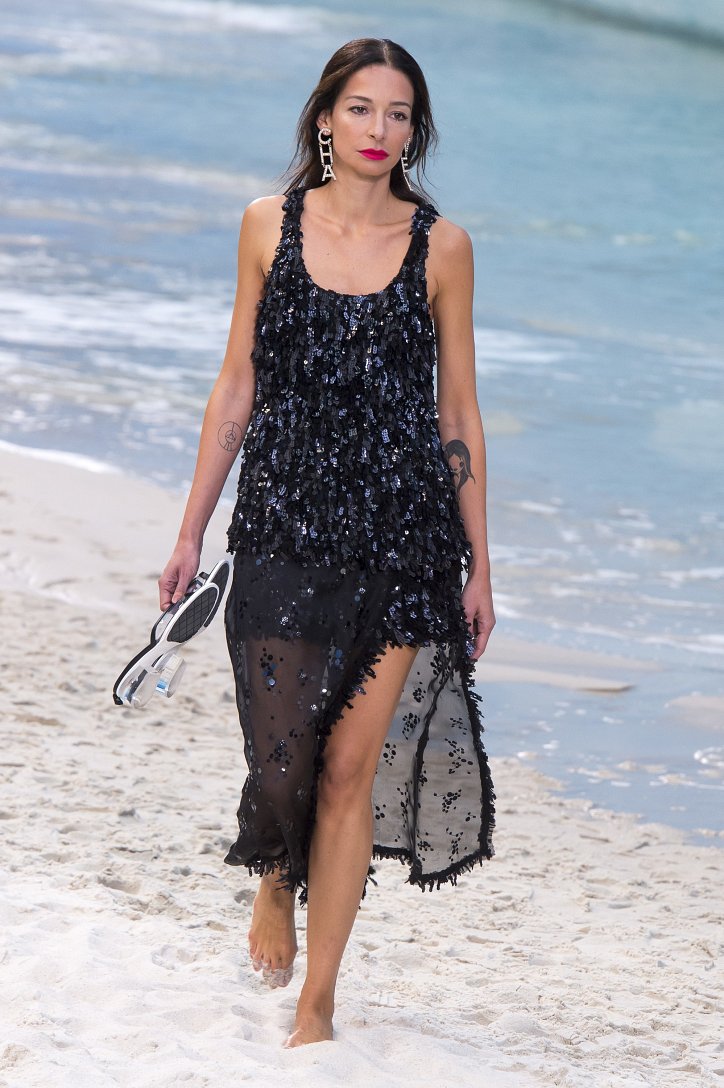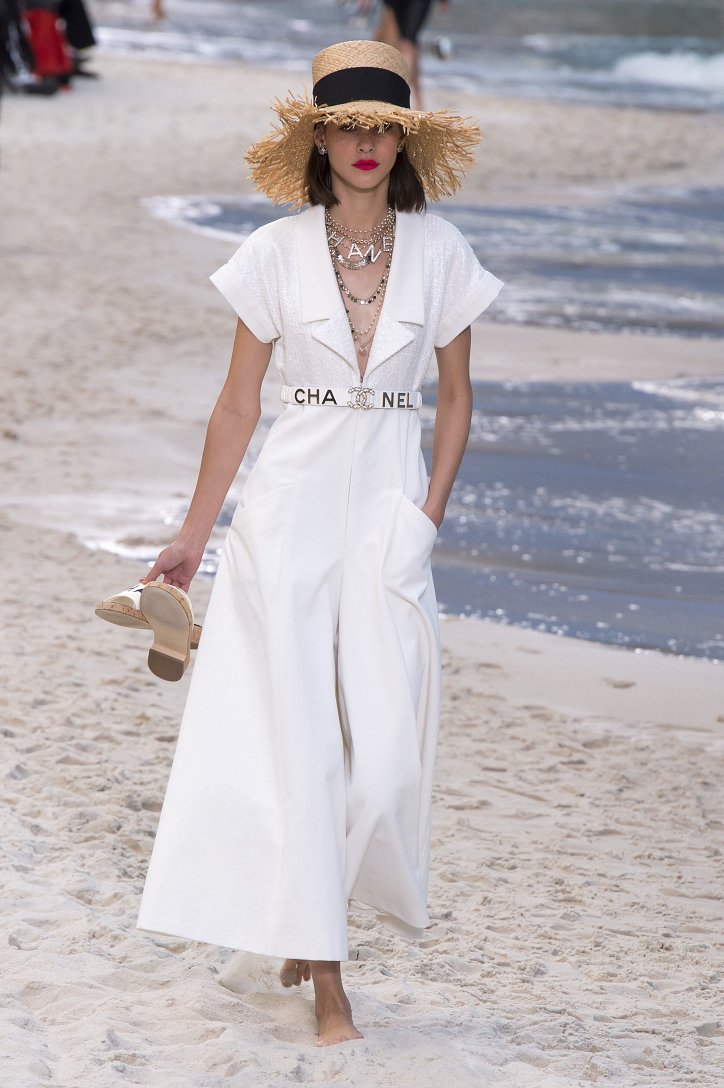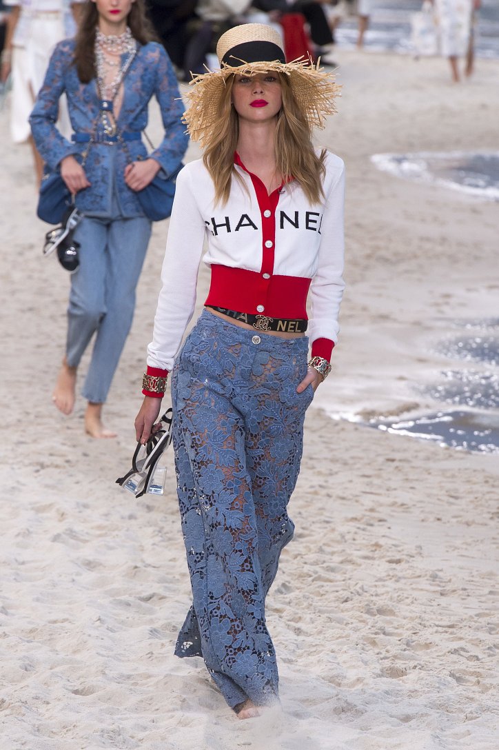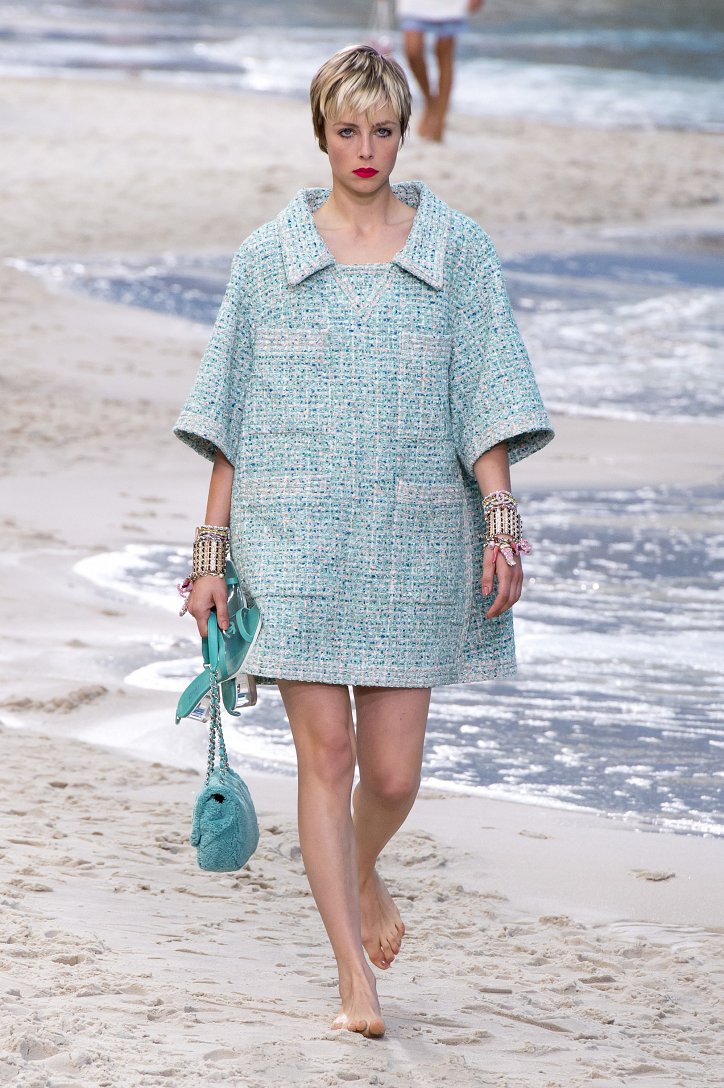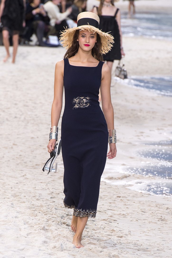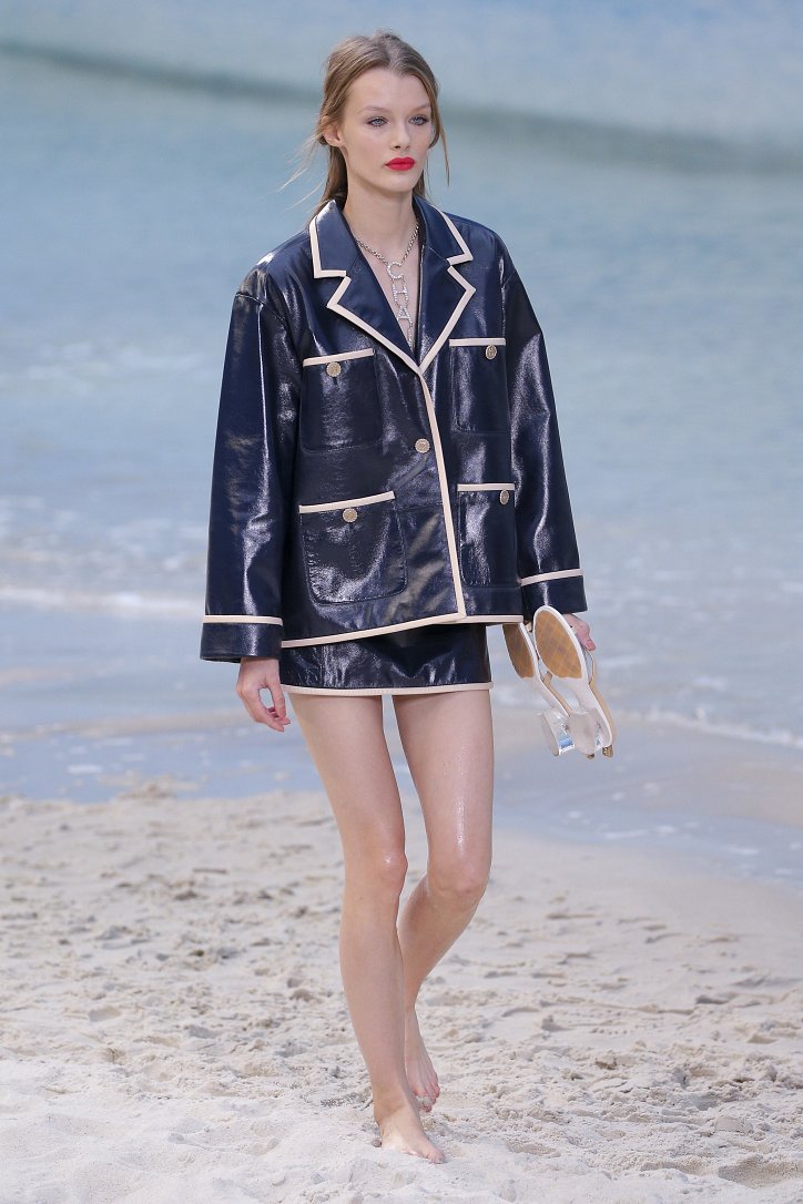 Показы Chanel – это всегда интрига. Карл Лагерфельд не устает удивлять публику выбором локаций для дефиле. Вот и новую коллекцию Chanel он решил показать… на пляже, который соорудили прямо в Grand Palais! Модели, взяв в руки мюли с прозрачными каблуками, с наслаждением дефилировали босиком по белоснежному песку, на который набегали волны пусть даже и ненастоящего океана.