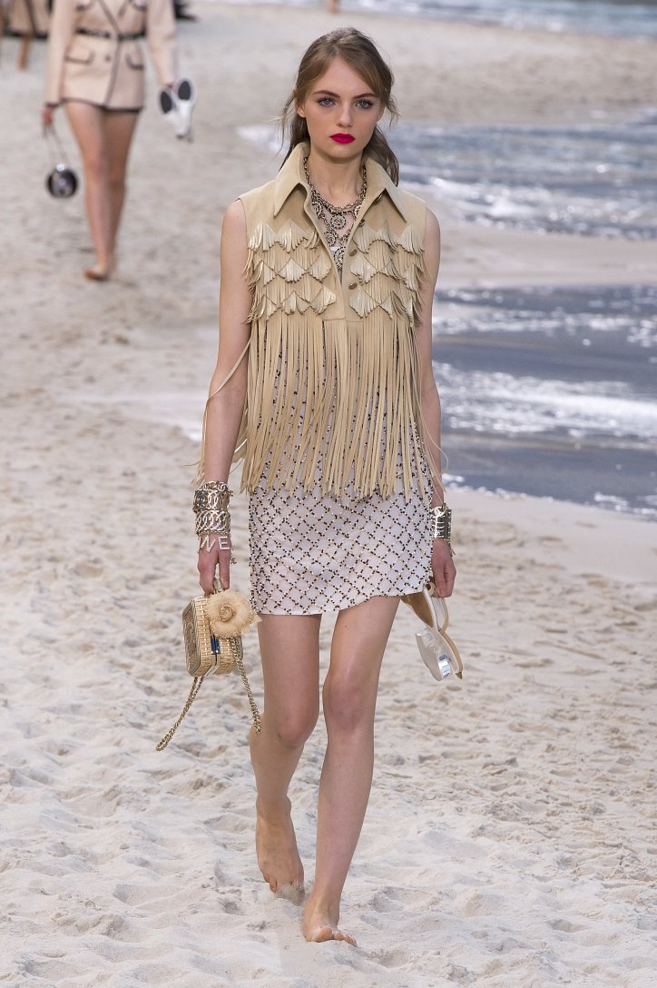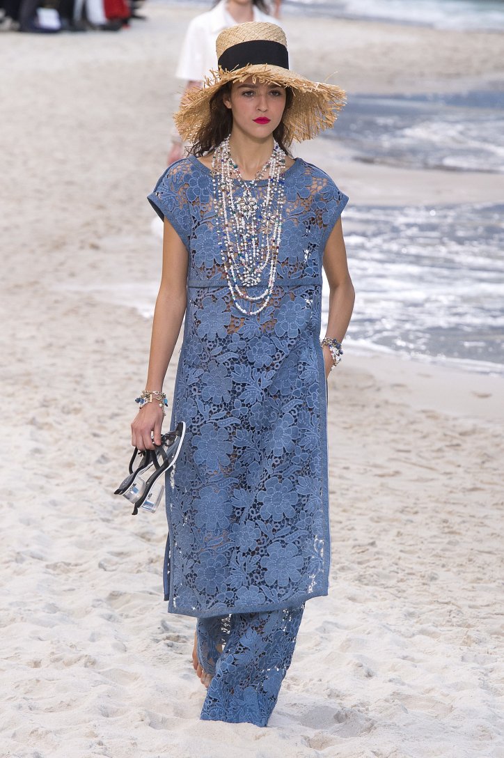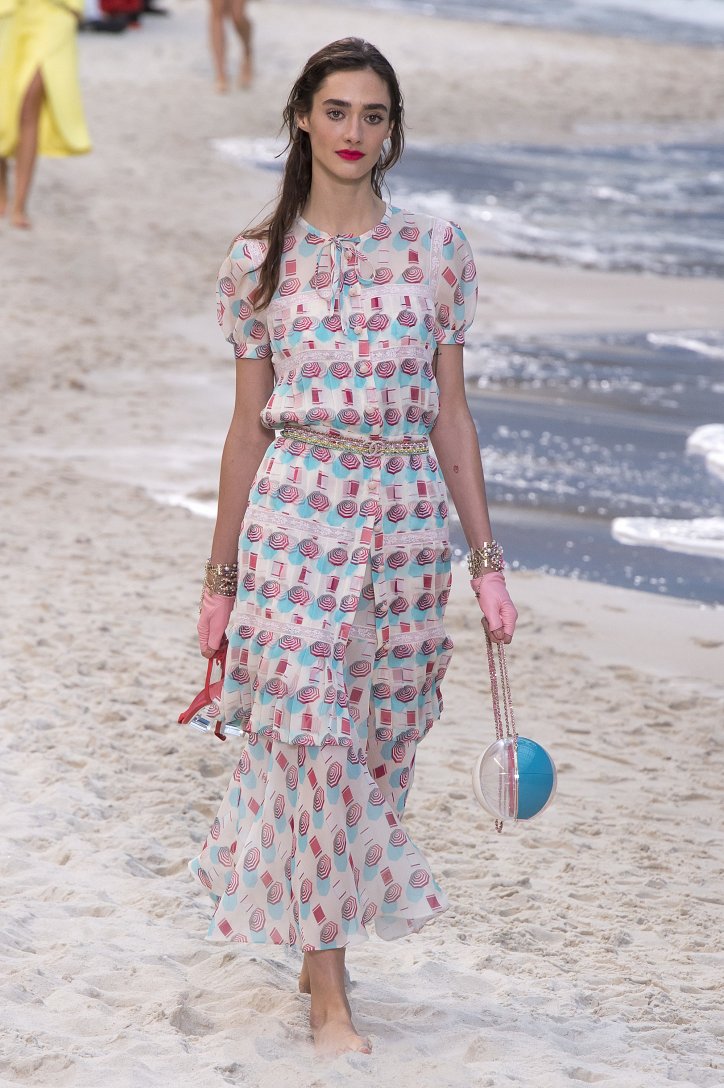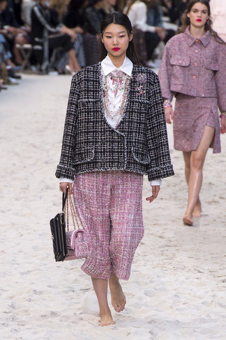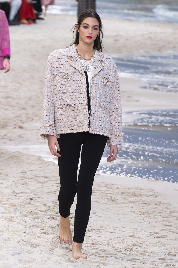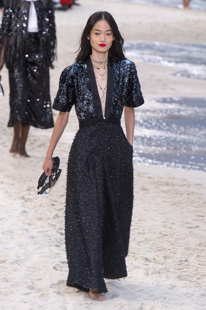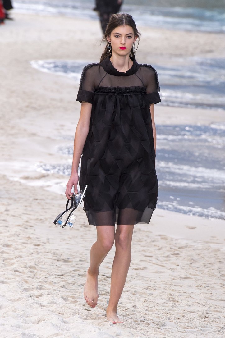 Показы Chanel – это всегда интрига. Карл Лагерфельд не устает удивлять публику выбором локаций для дефиле. Вот и новую коллекцию Chanel он решил показать… на пляже, который соорудили прямо в Grand Palais! Модели, взяв в руки мюли с прозрачными каблуками, с наслаждением дефилировали босиком по белоснежному песку, на который набегали волны пусть даже и ненастоящего океана.