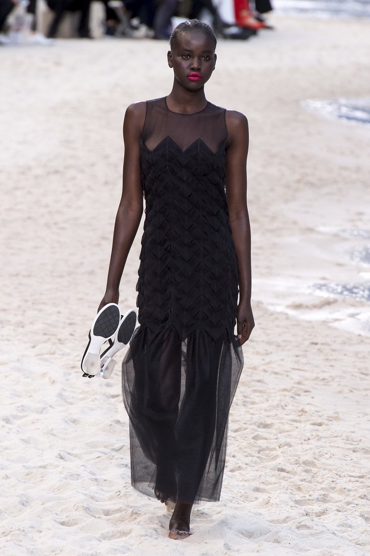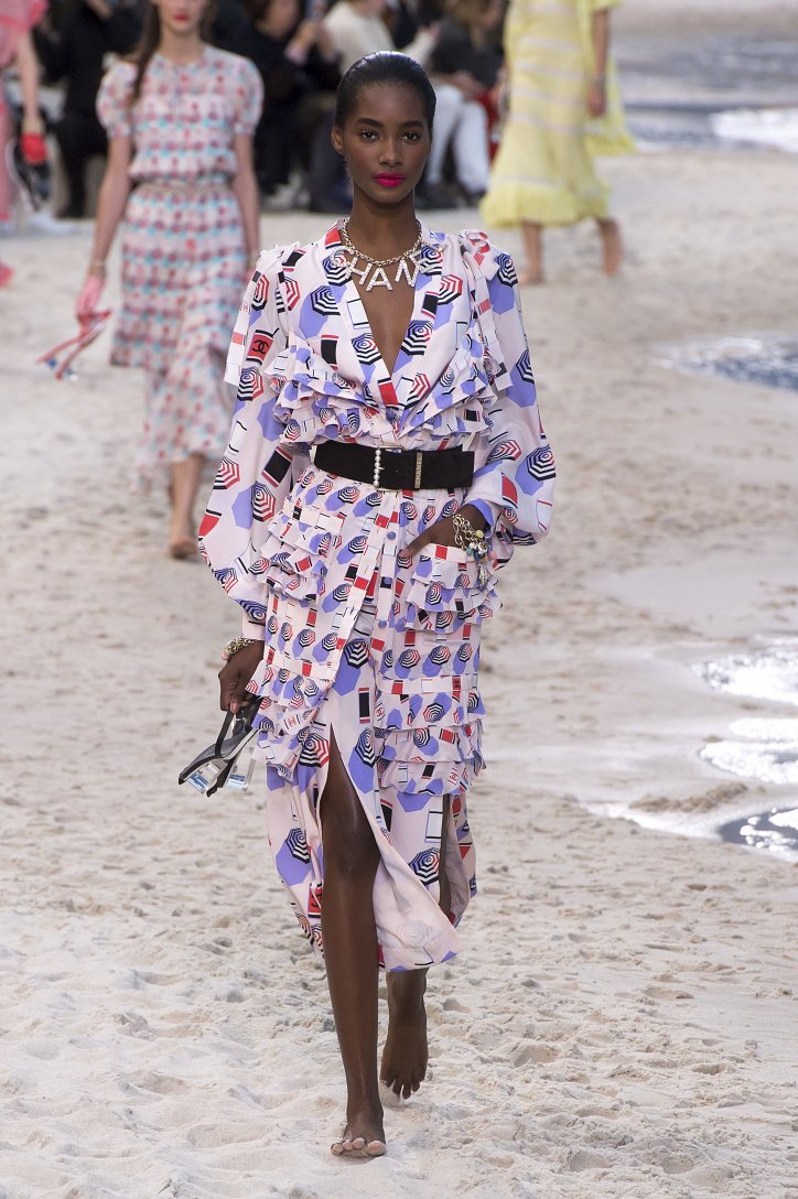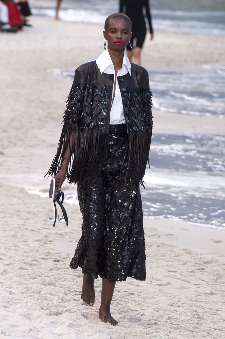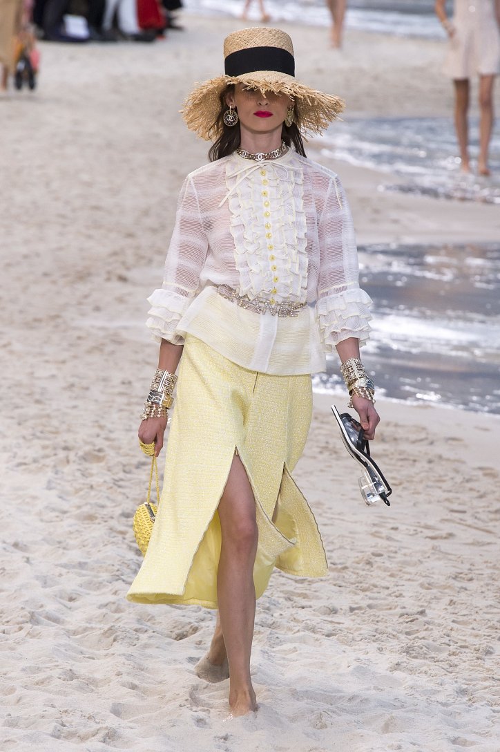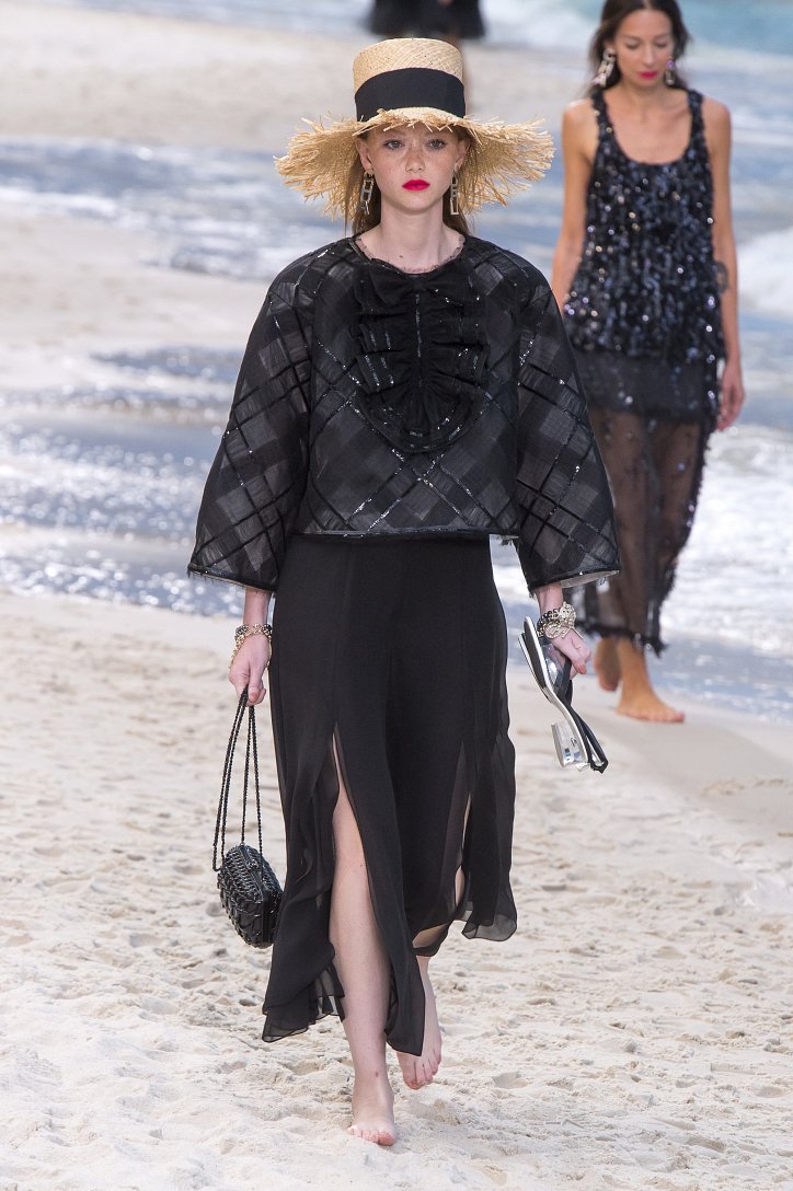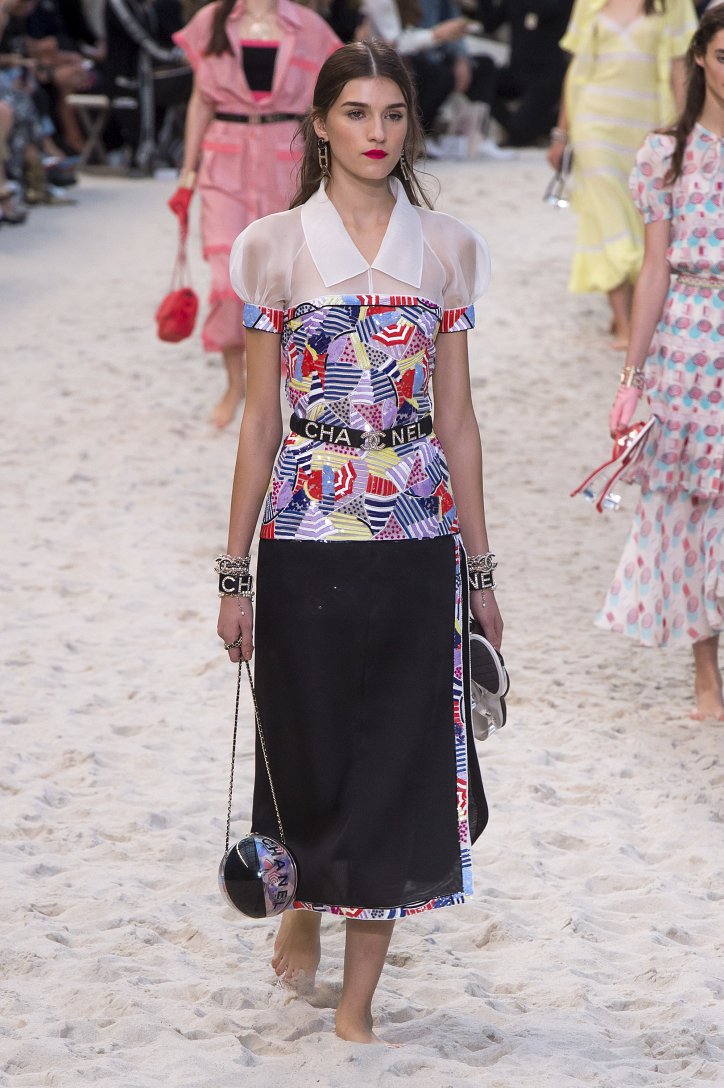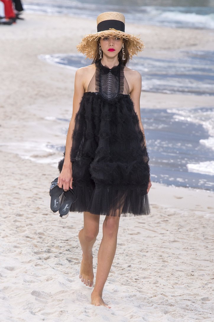 Показы Chanel – это всегда интрига. Карл Лагерфельд не устает удивлять публику выбором локаций для дефиле. Вот и новую коллекцию Chanel он решил показать… на пляже, который соорудили прямо в Grand Palais! Модели, взяв в руки мюли с прозрачными каблуками, с наслаждением дефилировали босиком по белоснежному песку, на который набегали волны пусть даже и ненастоящего океана.