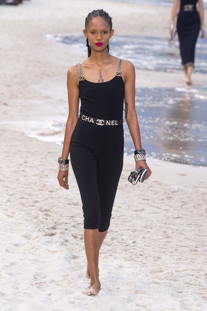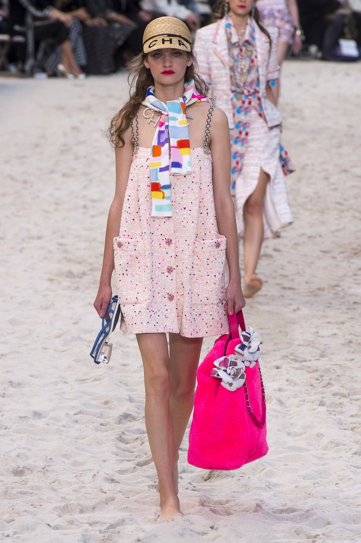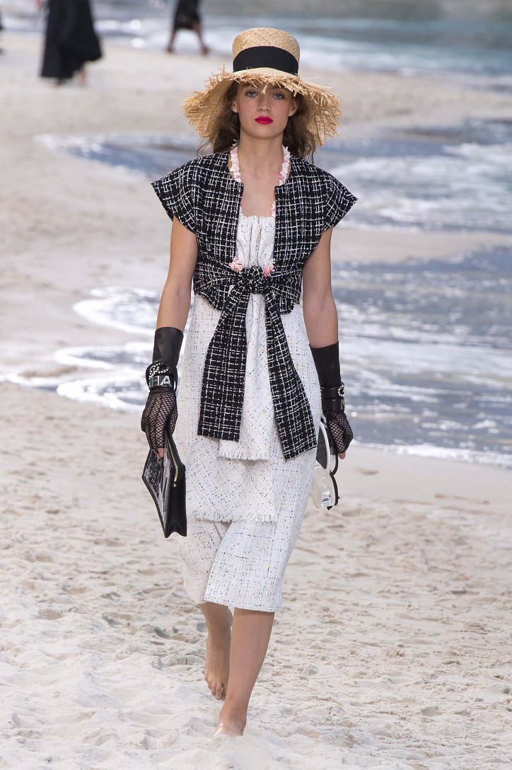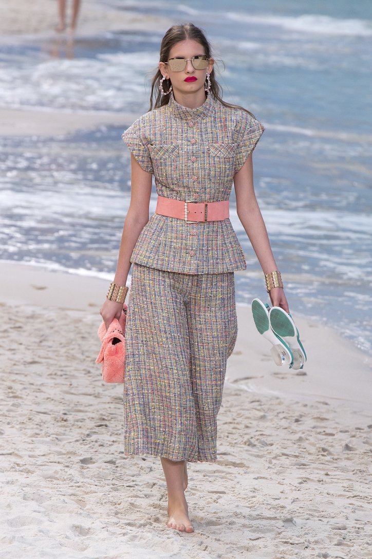 «Отпуск» начинался постепенно: первые луки демонстрировали фирменные твидовые костюмы, затем в двойках произошла замена: вместо юбок модели надели леггинсы, добавили к образу соломенные шляпы, а затем и вовсе стали выходить «на пляж» в купальниках (которые они все равно носили вместе с твидовыми жакетами), джинсах и трикотажных комплектах.