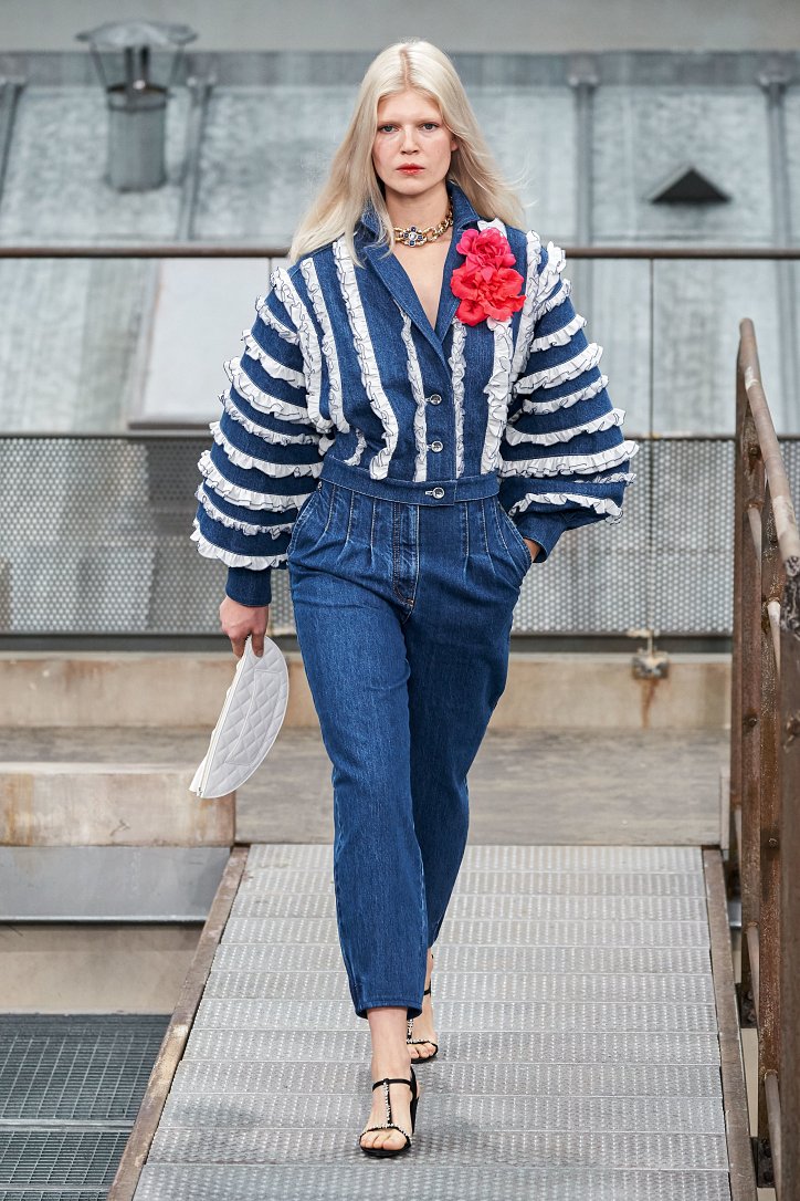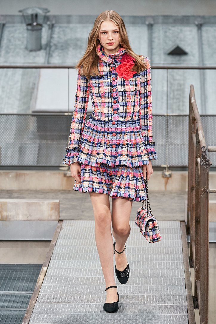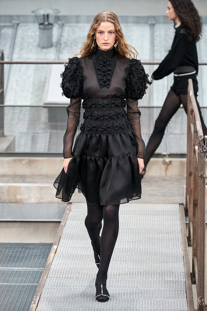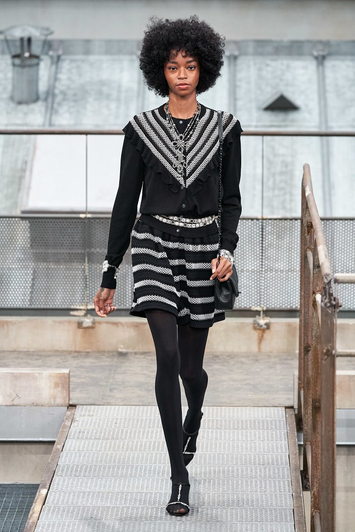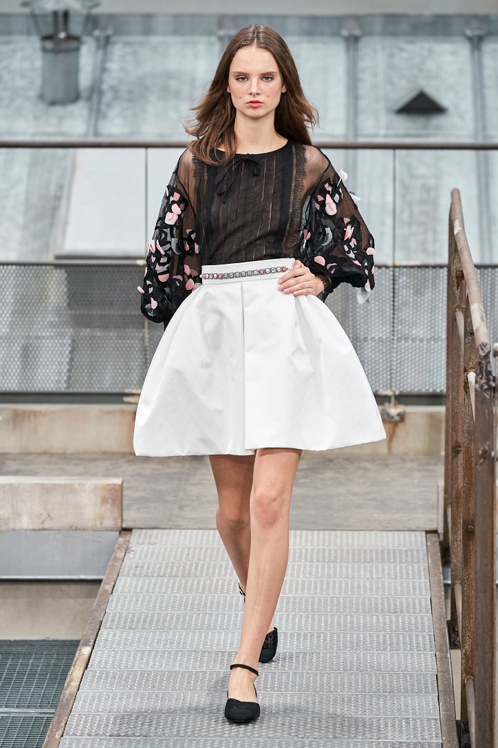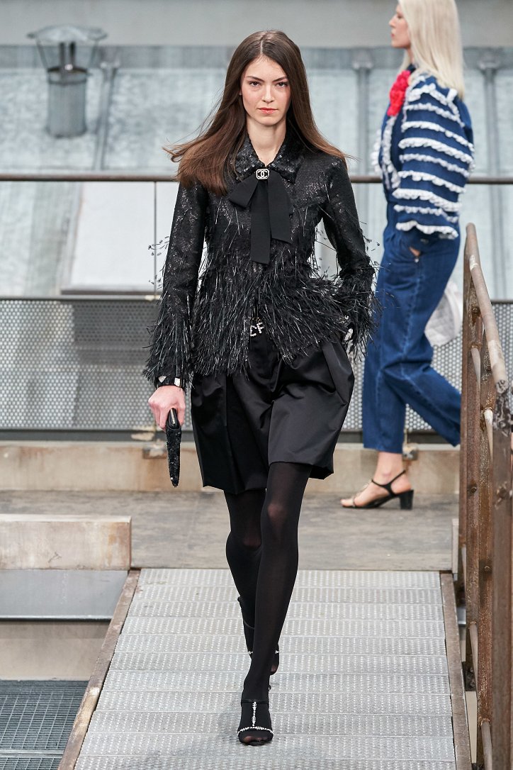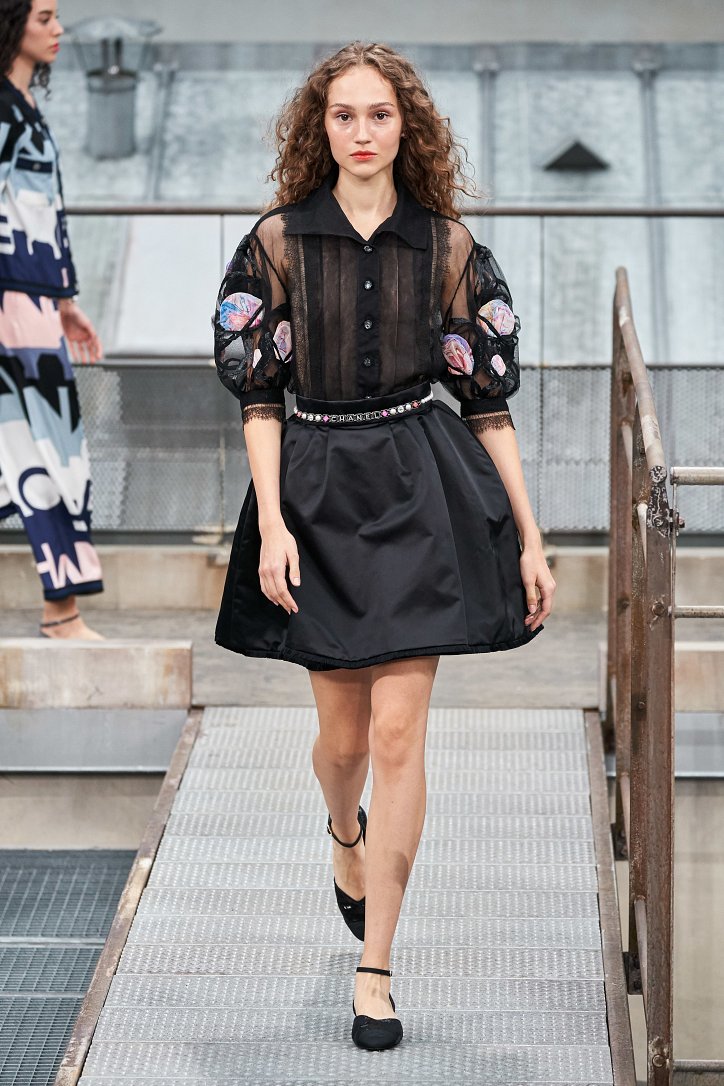 Во главе угла – мини: твидовые платья в стиле 60-ых, шорты, юбки и комбинезоны. Дополнили картину игривые оборки и деним, «рассыпавшийся» по крышам логотип Chanel, акцент на талию и пышные рукава потрясающих черных блуз из шифона.