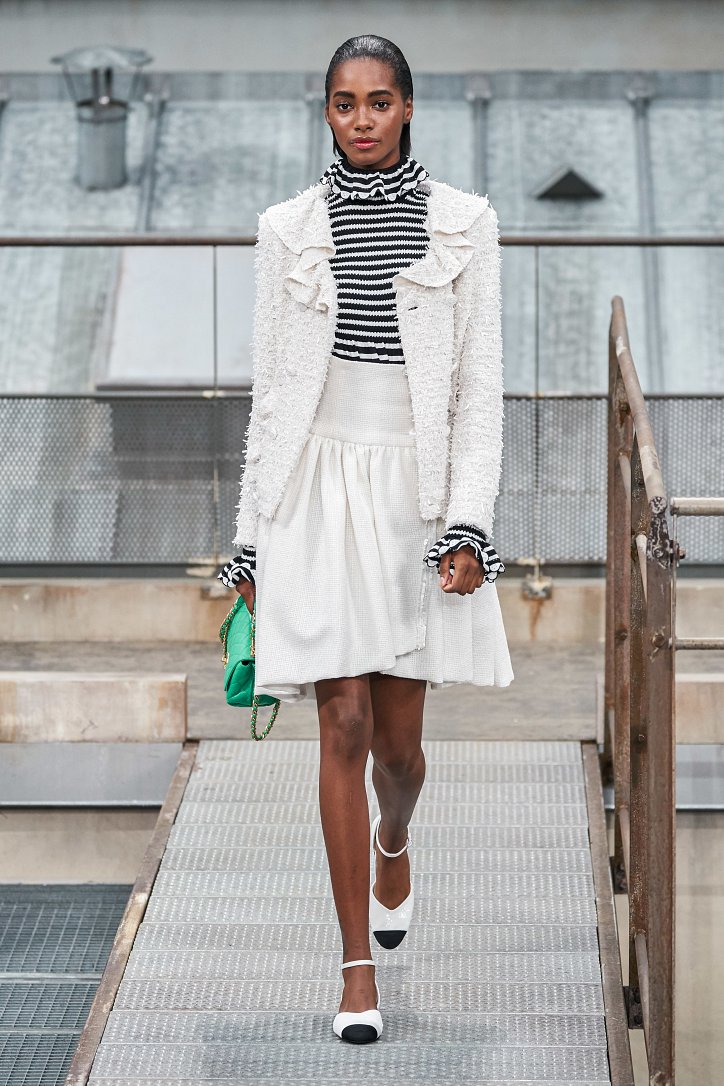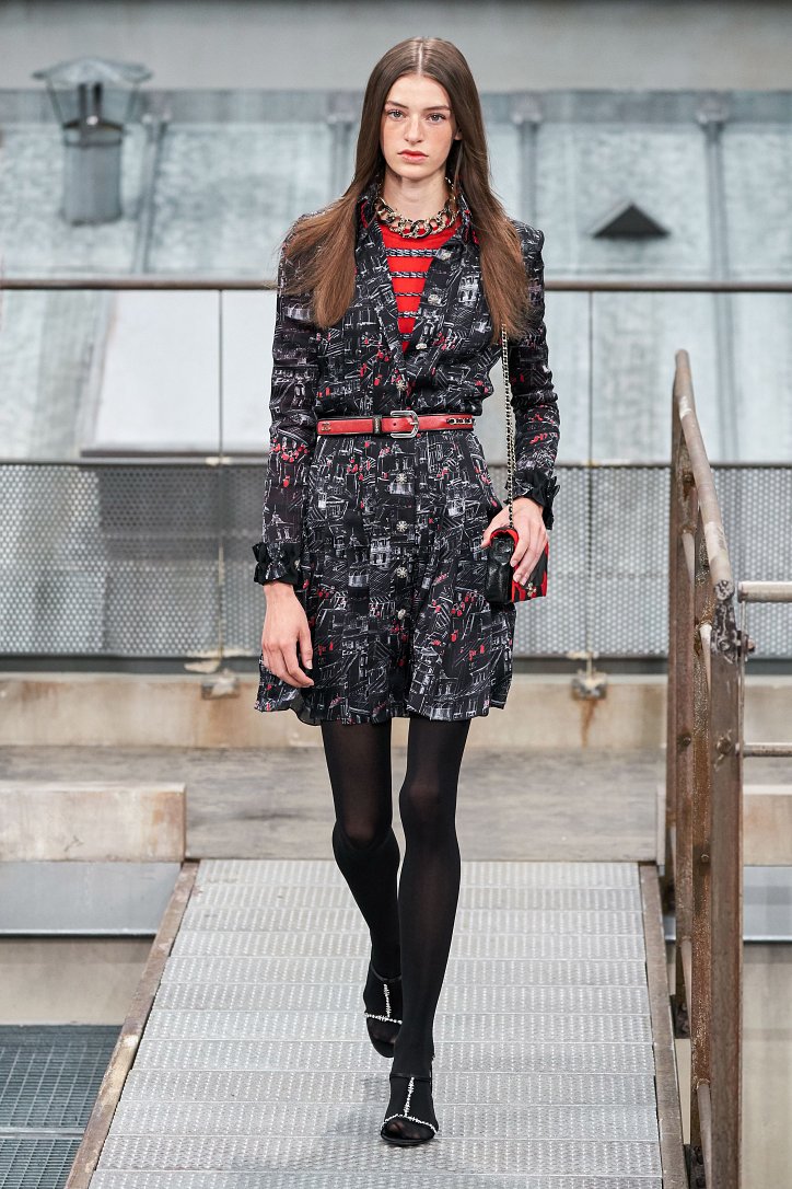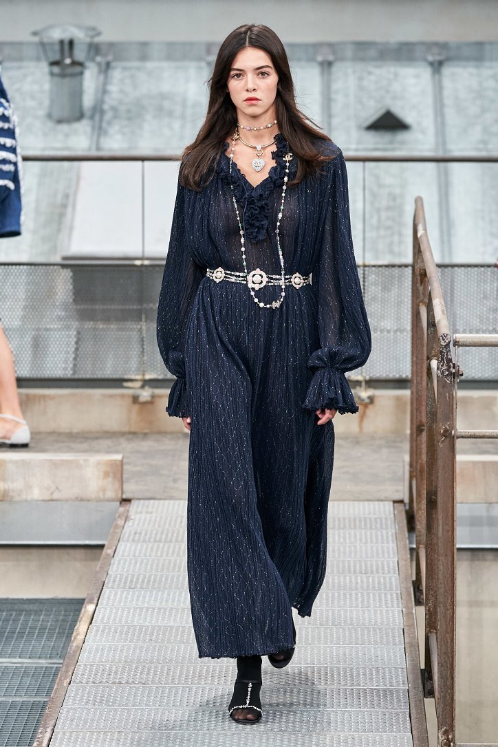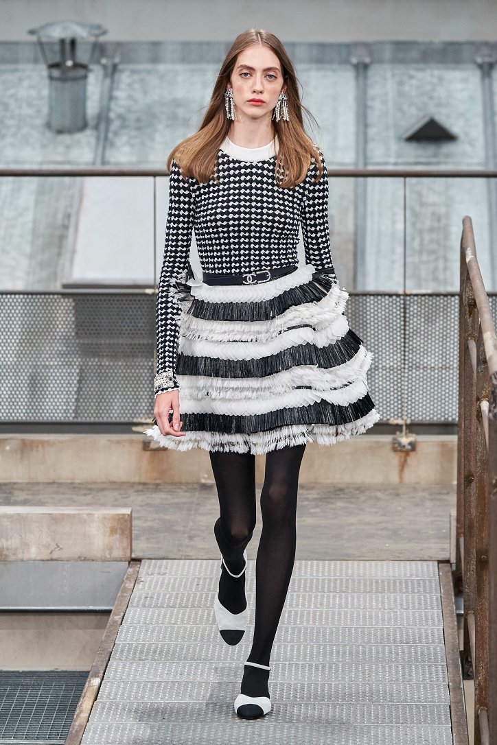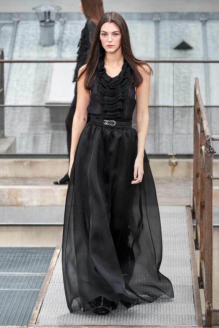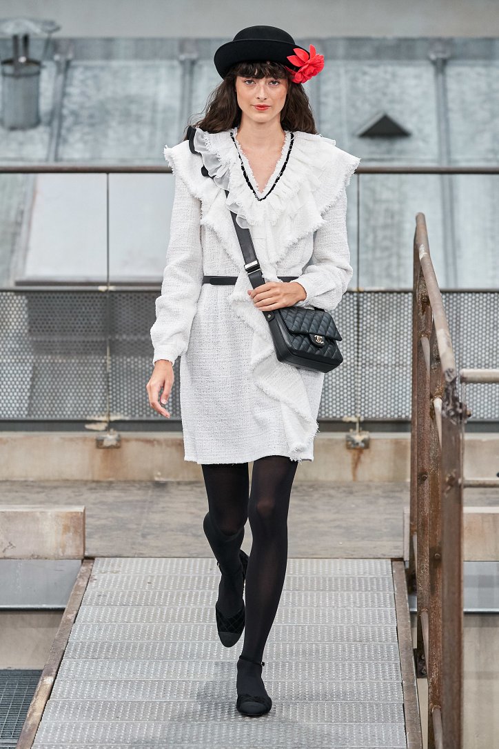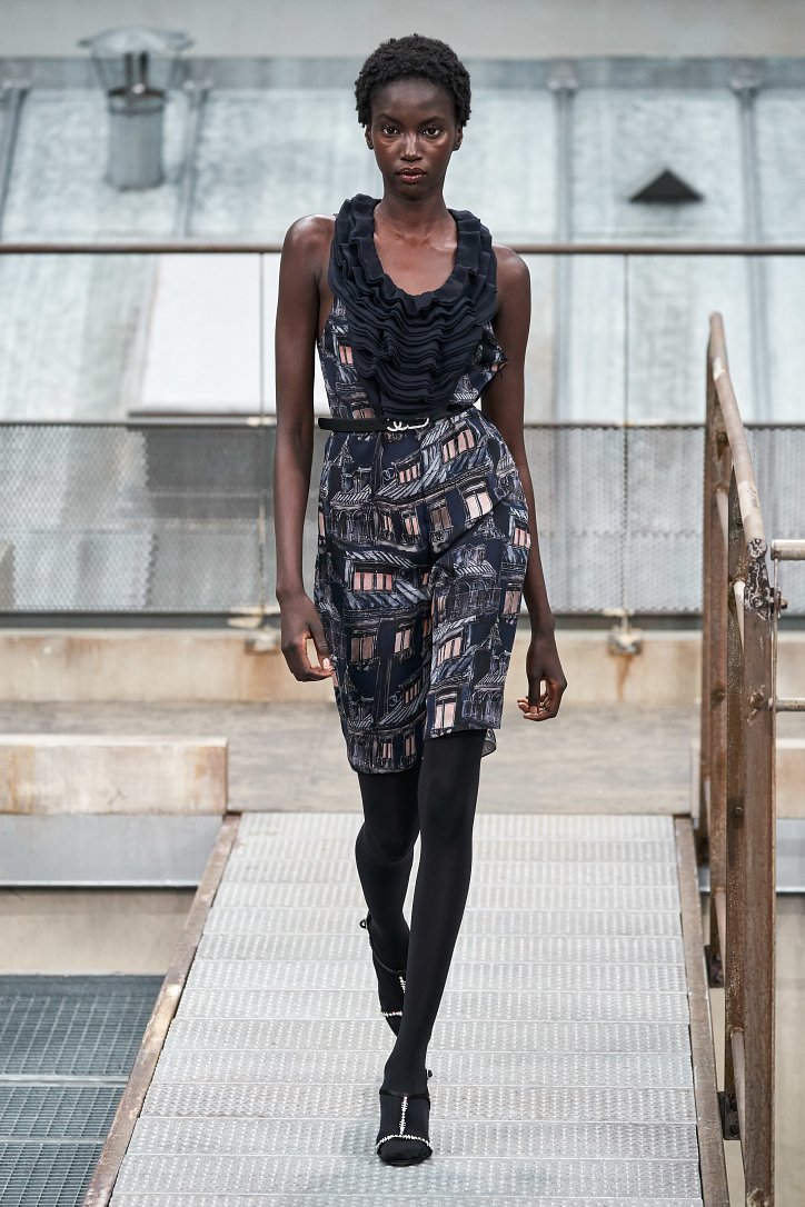 Во главе угла – мини: твидовые платья в стиле 60-ых, шорты, юбки и комбинезоны. Дополнили картину игривые оборки и деним, «рассыпавшийся» по крышам логотип Chanel, акцент на талию и пышные рукава потрясающих черных блуз из шифона.