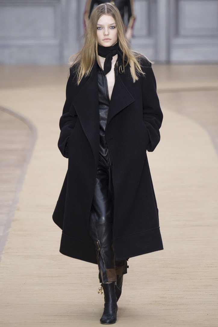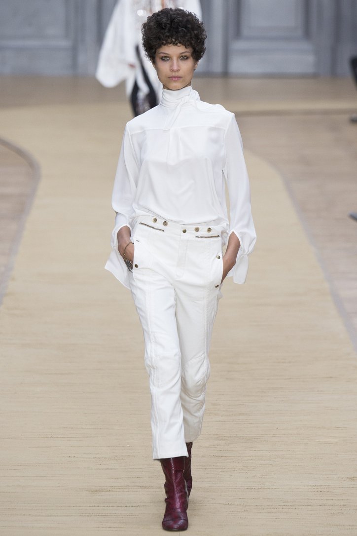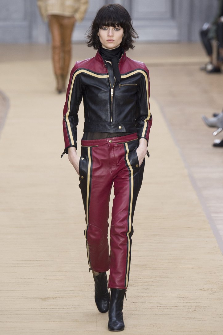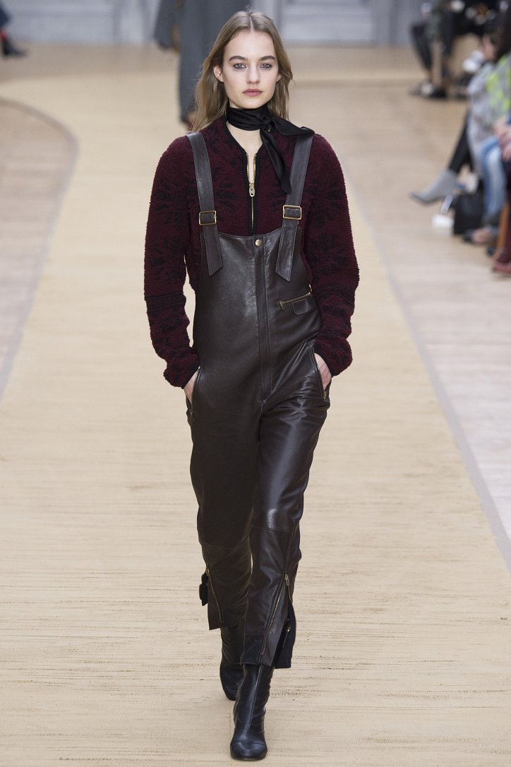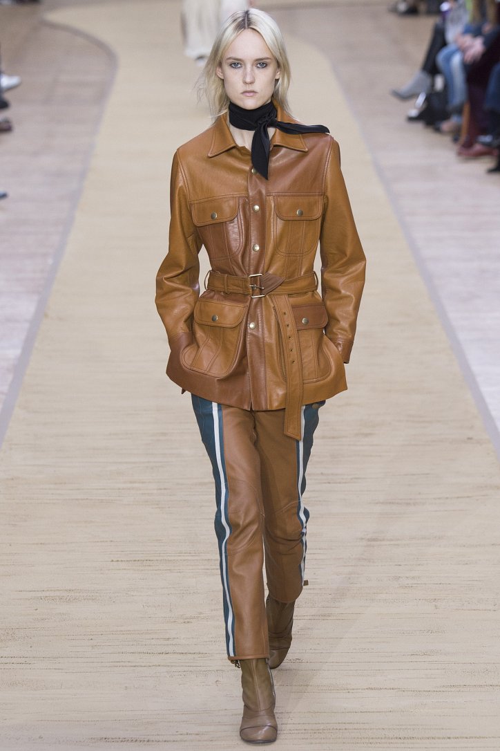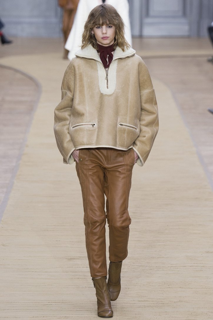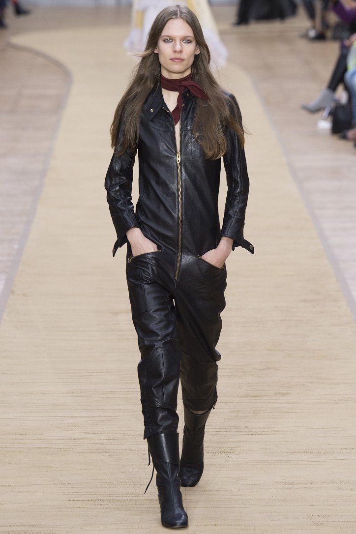 Укороченные кожаные брюки, костюмы и комбинезон, полусапожки на невысоком каблуке, объемные куртки-дубленки и неизменный шейный платок – этим образам коллекция Chloé осень-зима 2016-2017 «обязана» знаменитой французской путешественнице Anne-France Dautheville, которая в 70-ых годах на мотоцикле объехала практически всю Европу и Ближний Восток.