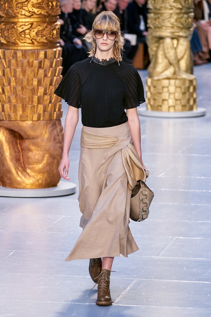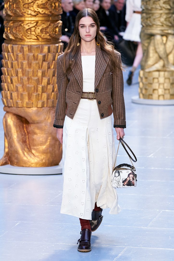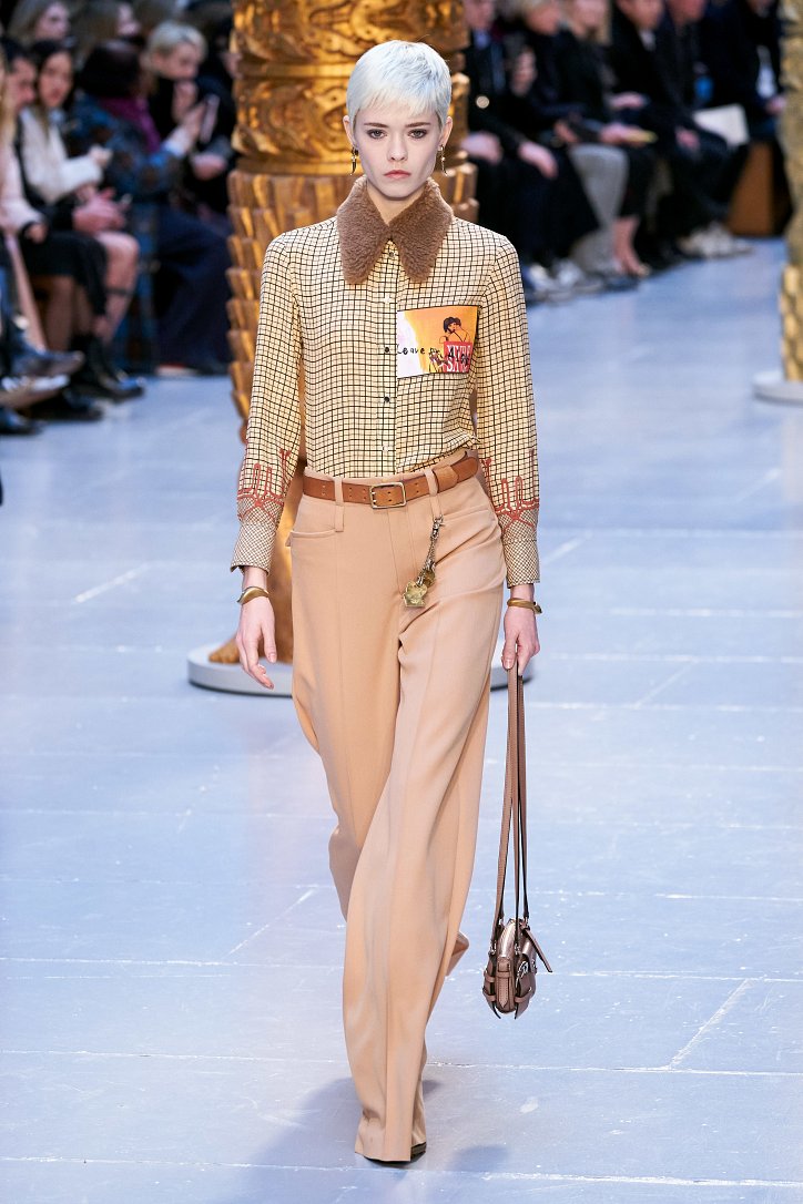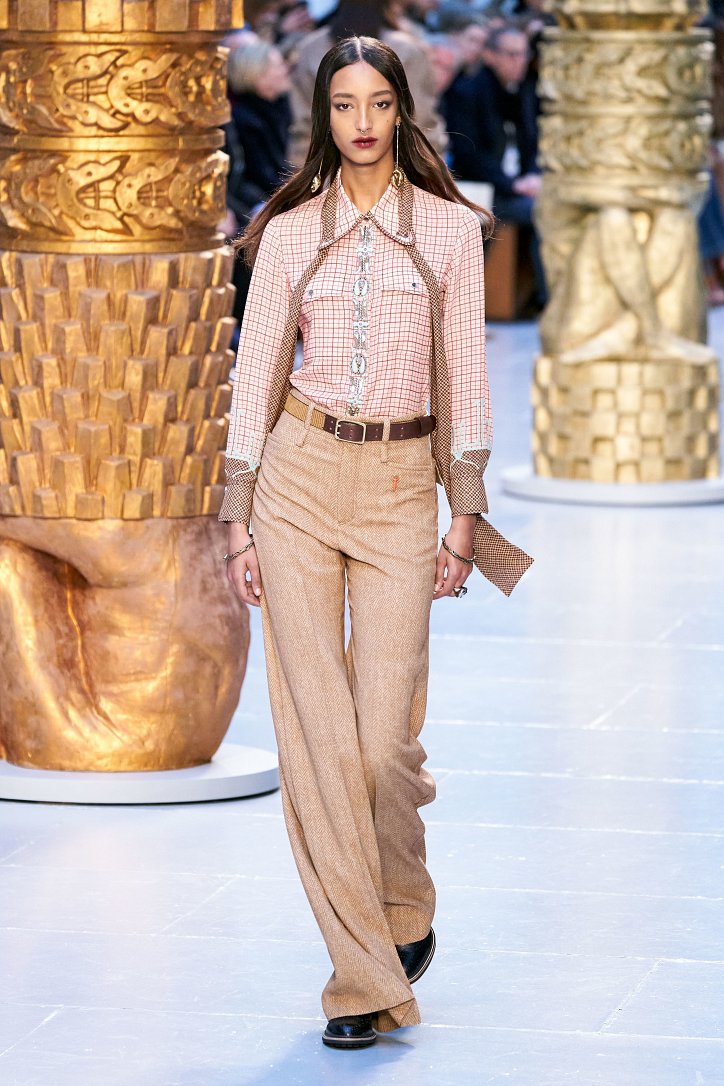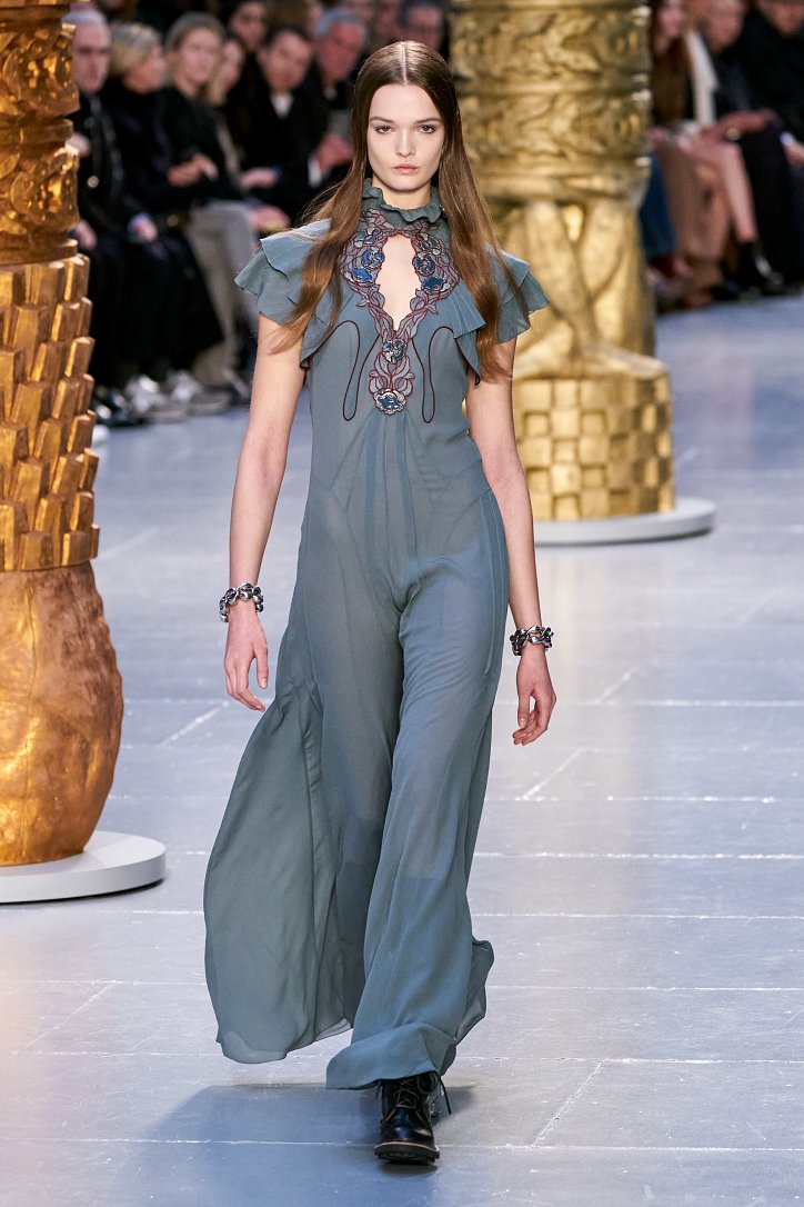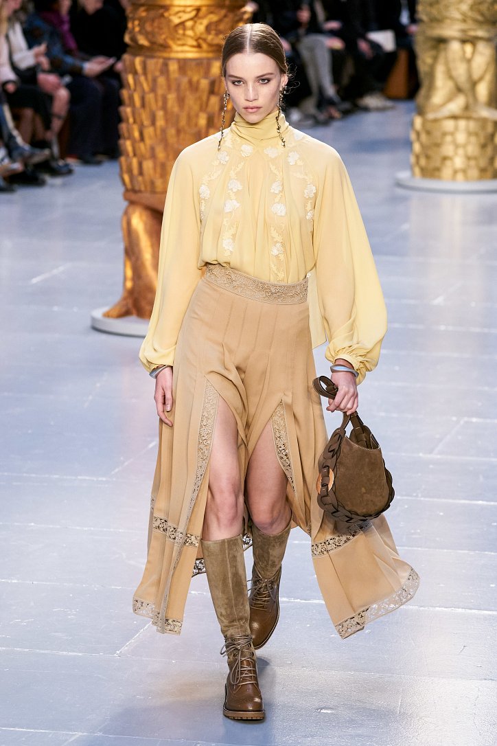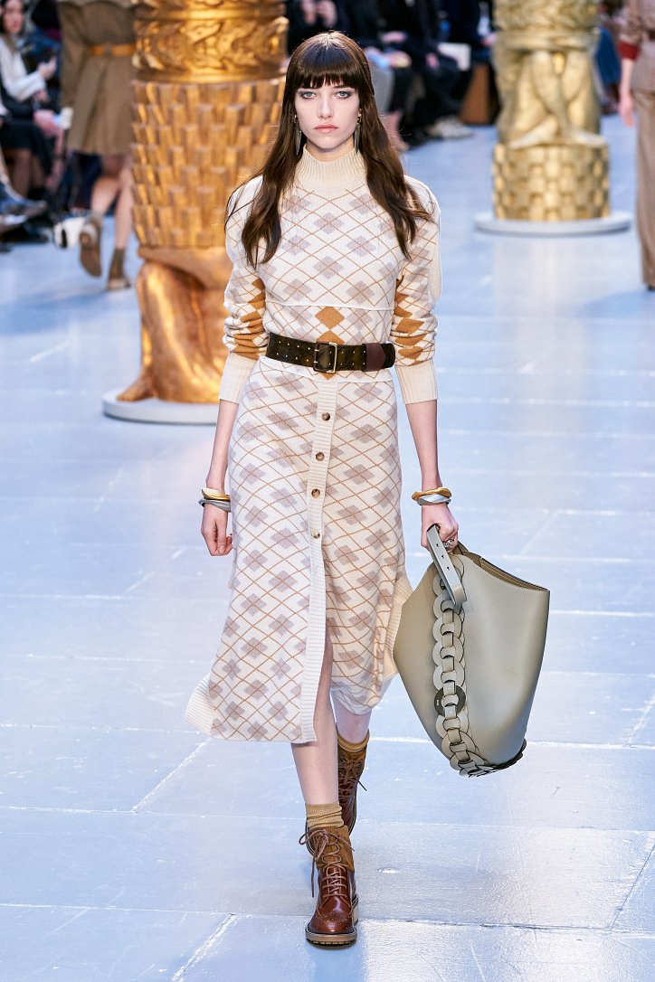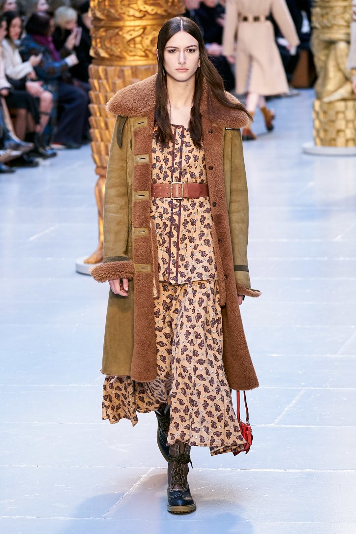 Пропитанная духом 70-ых и атмосферой творчества, новая коллекция Chloé была удивительно теплой и практичной. К будущему сезону Наташа Рамсей-Леви предложила стеганые пальто и дубленки, легкие блузы и клетчатые платья-рубашки, джинсы клеш и юбки из денима, уютный трикотаж и платья свободного силуэта, кожаные брюки и брючные костюмы с легким клешем штанин и закатанными рукавами жакетов.